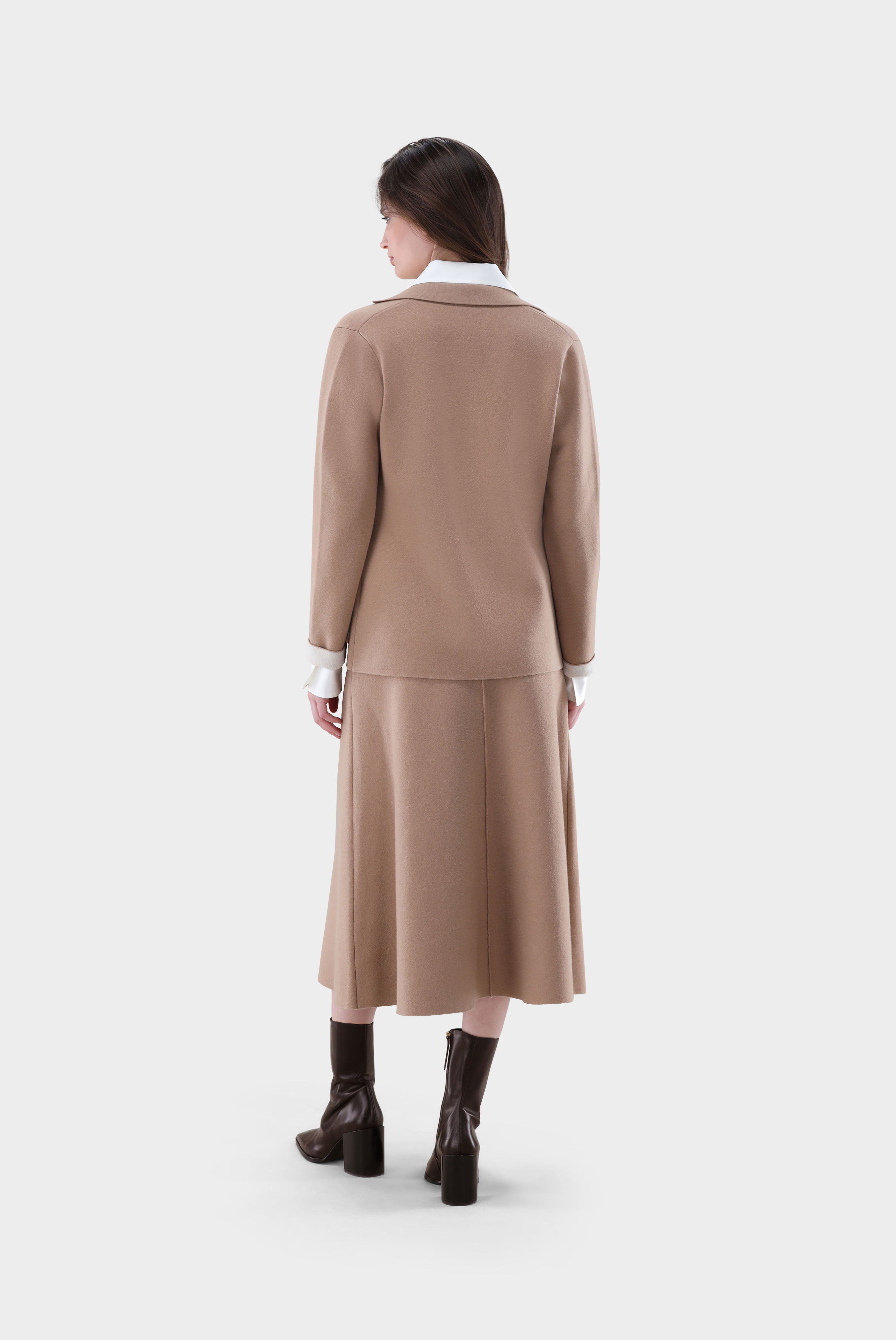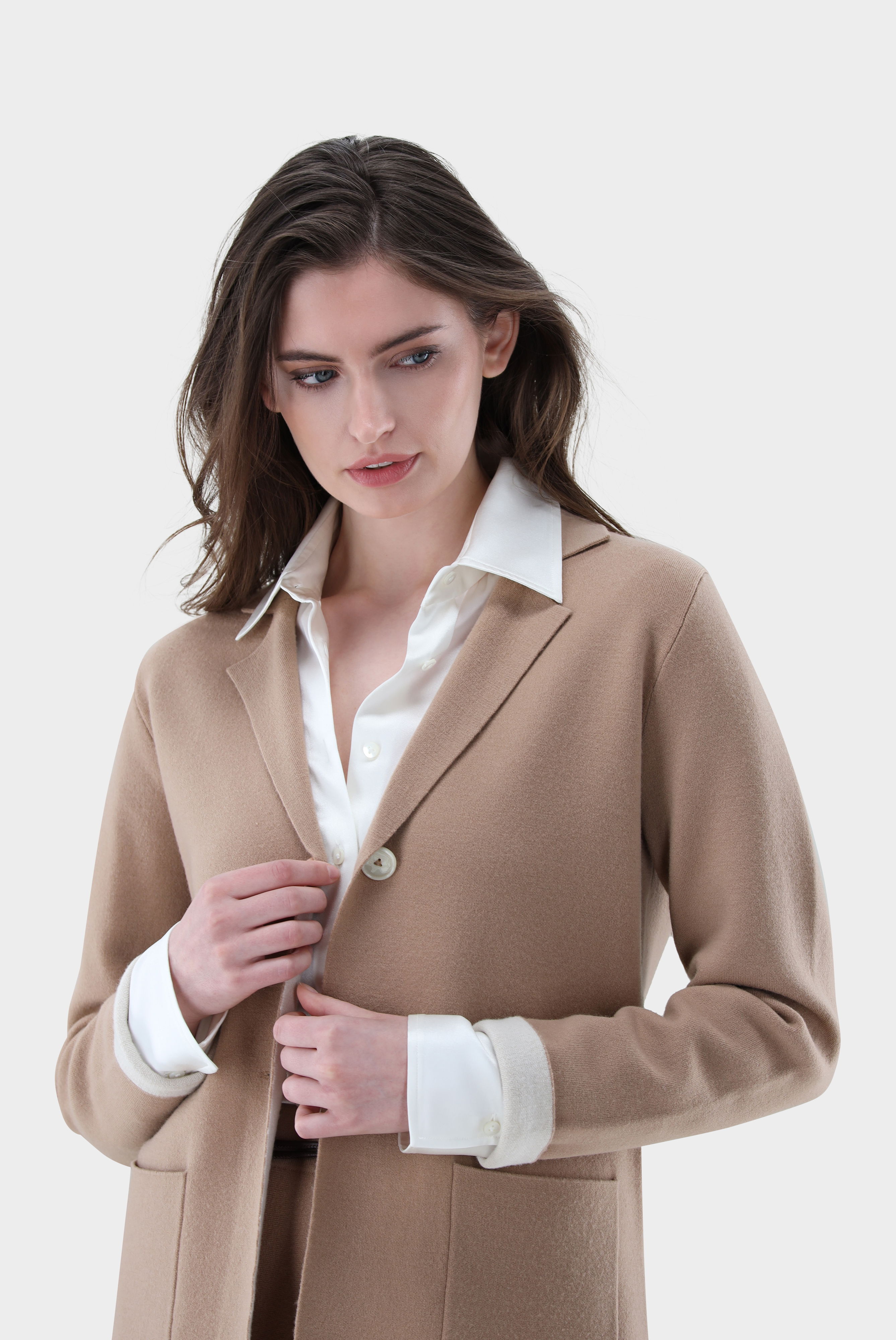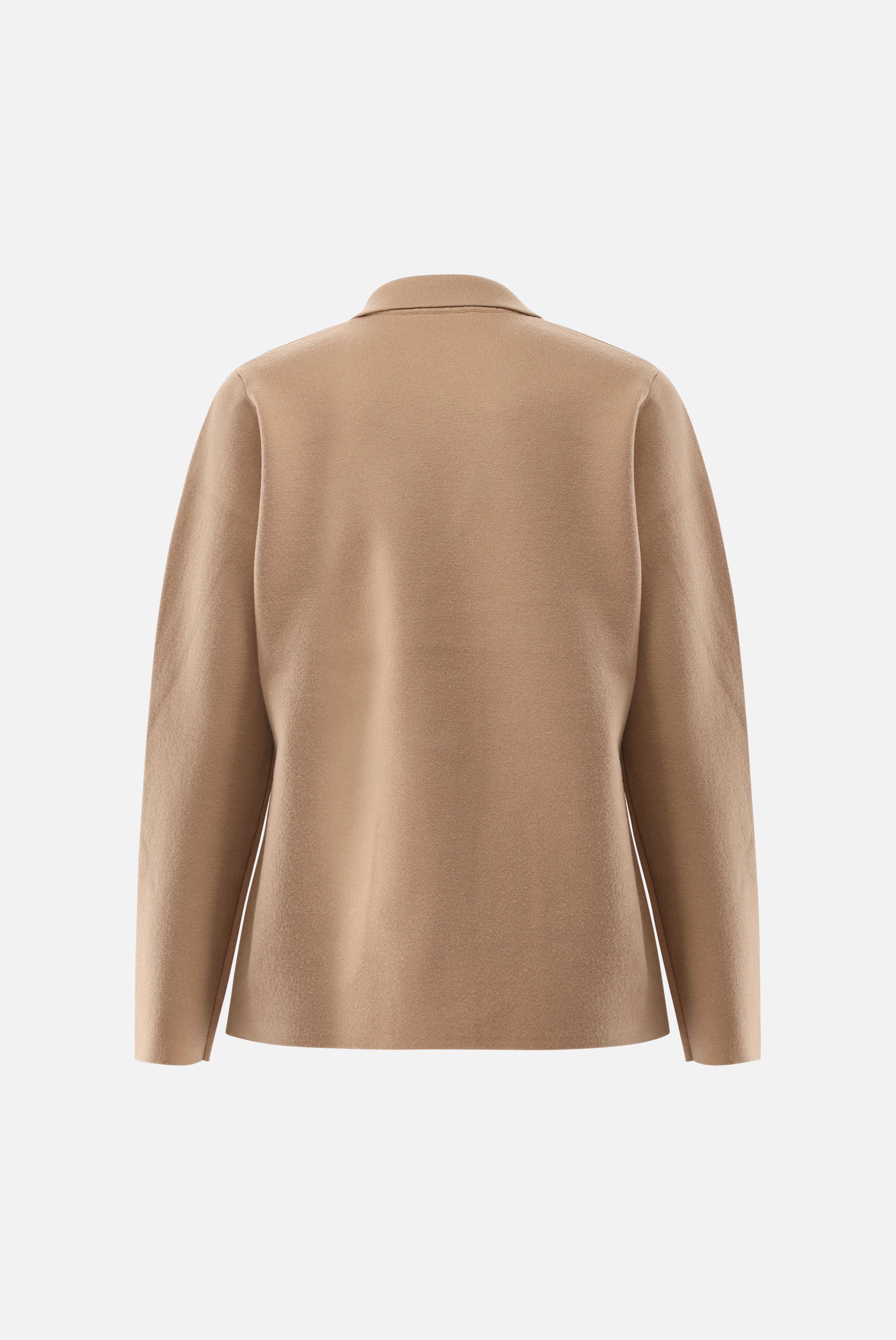 Dieser taillierte Strick-Blazer besticht durch elegante Linienführung und hochwertige Verarbeitung. Fallendes Revers und lange Ärmel unterstreichen die klassische Silhouette, während zwei aufgesetzte Taschen praktische Akzente setzen. Gefertigt aus einem edlen Mischgewebe mit Wolle bietet der Blazer hohen Tragekomfort. Der doppelseitige, zweifarbige Strick verleiht ihm moderne Raffinesse, besonders stilvoll kombiniert im Total Look mit dem Rock Sabara – ideal für anspruchsvolle Business- und Freizeit-Outfits.