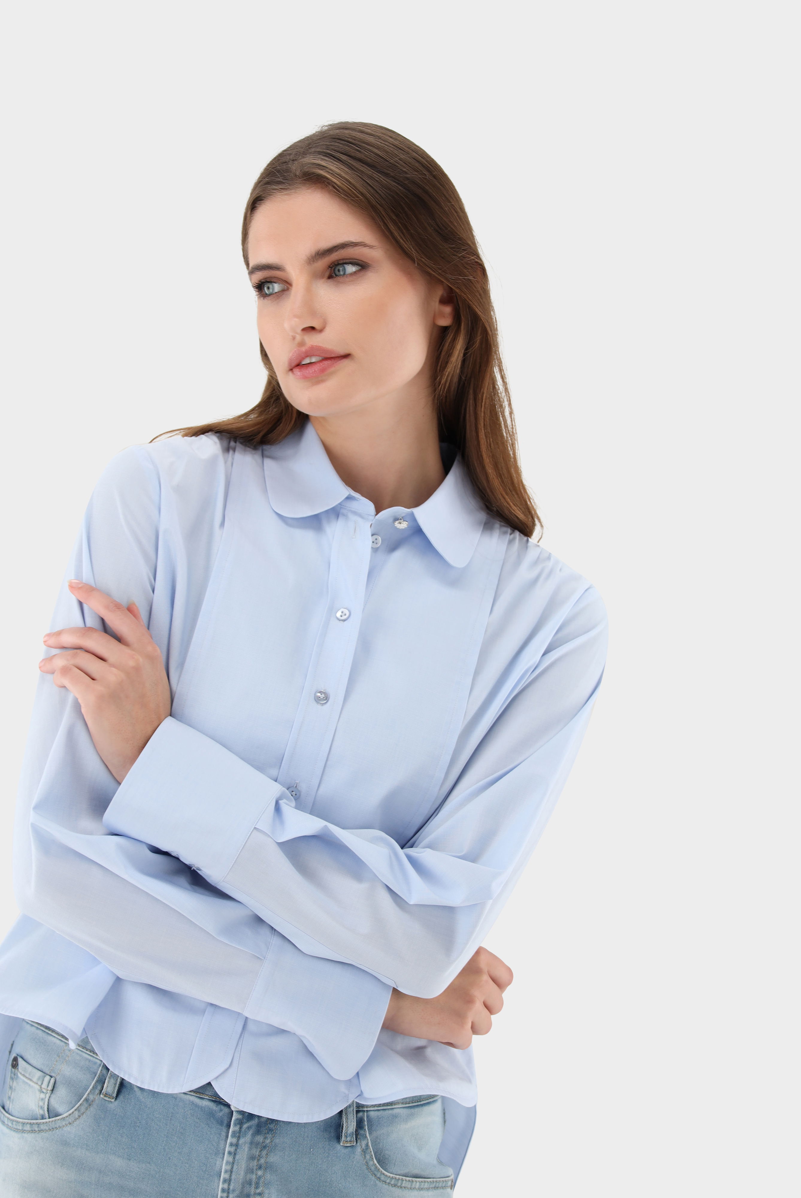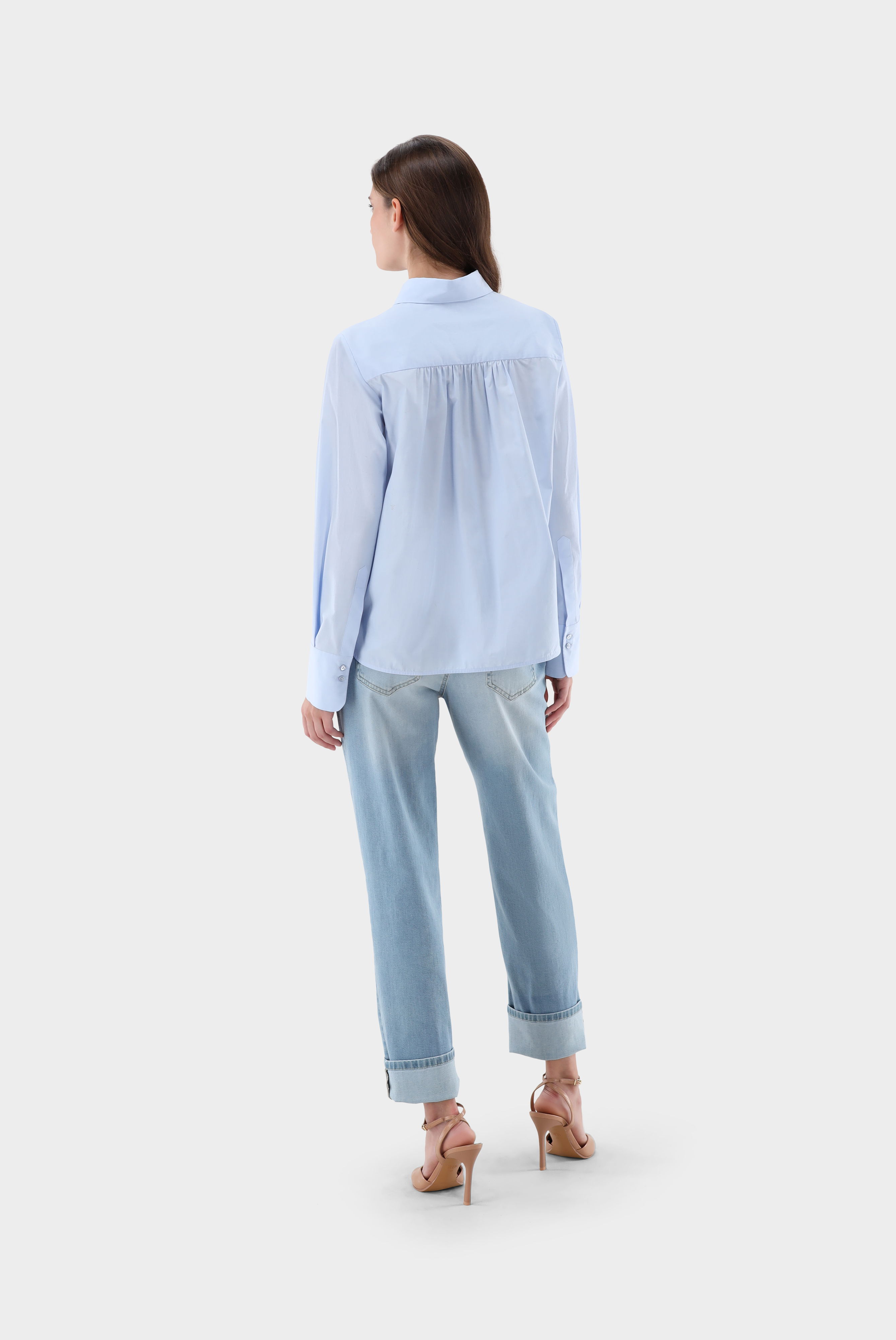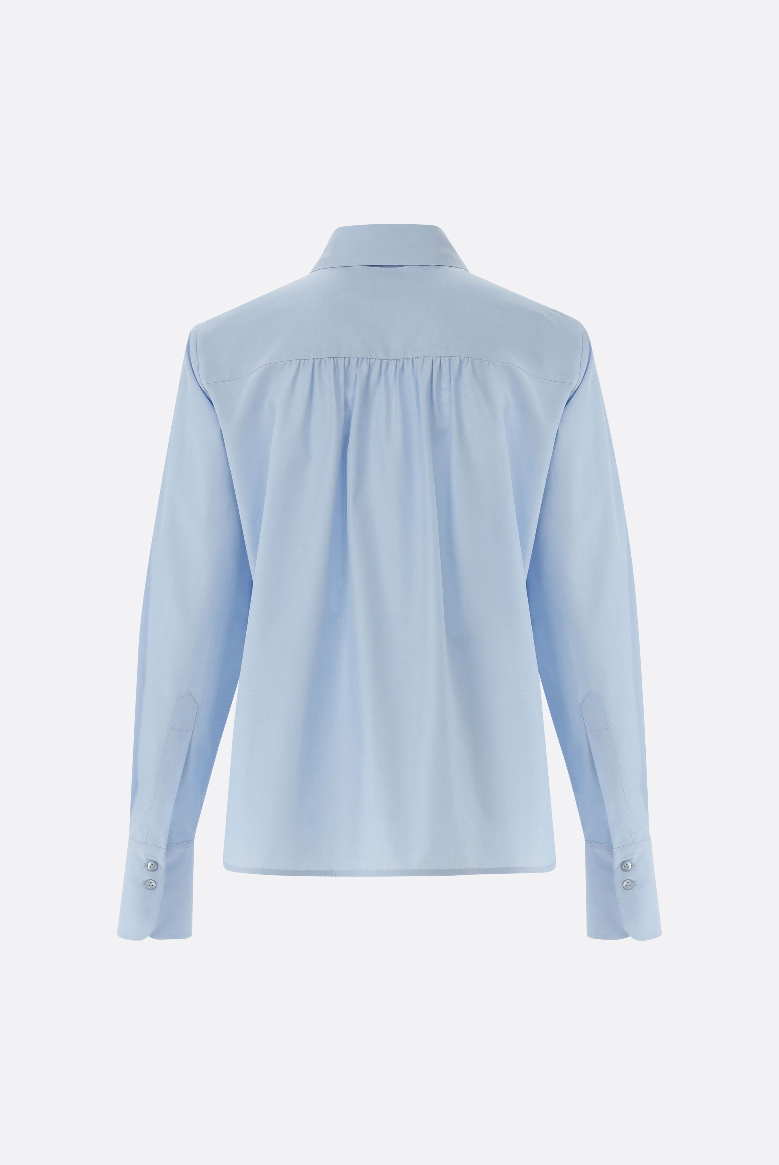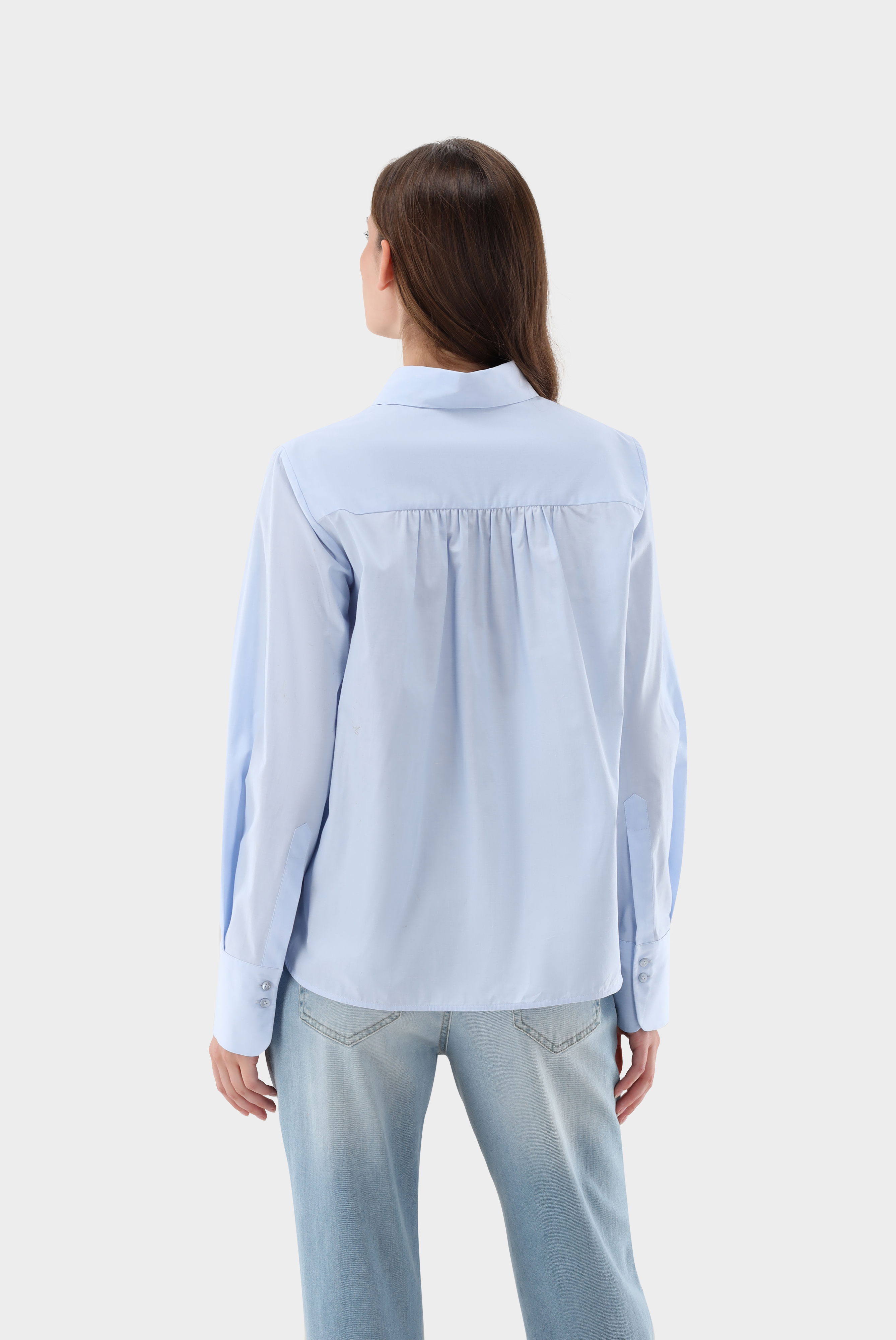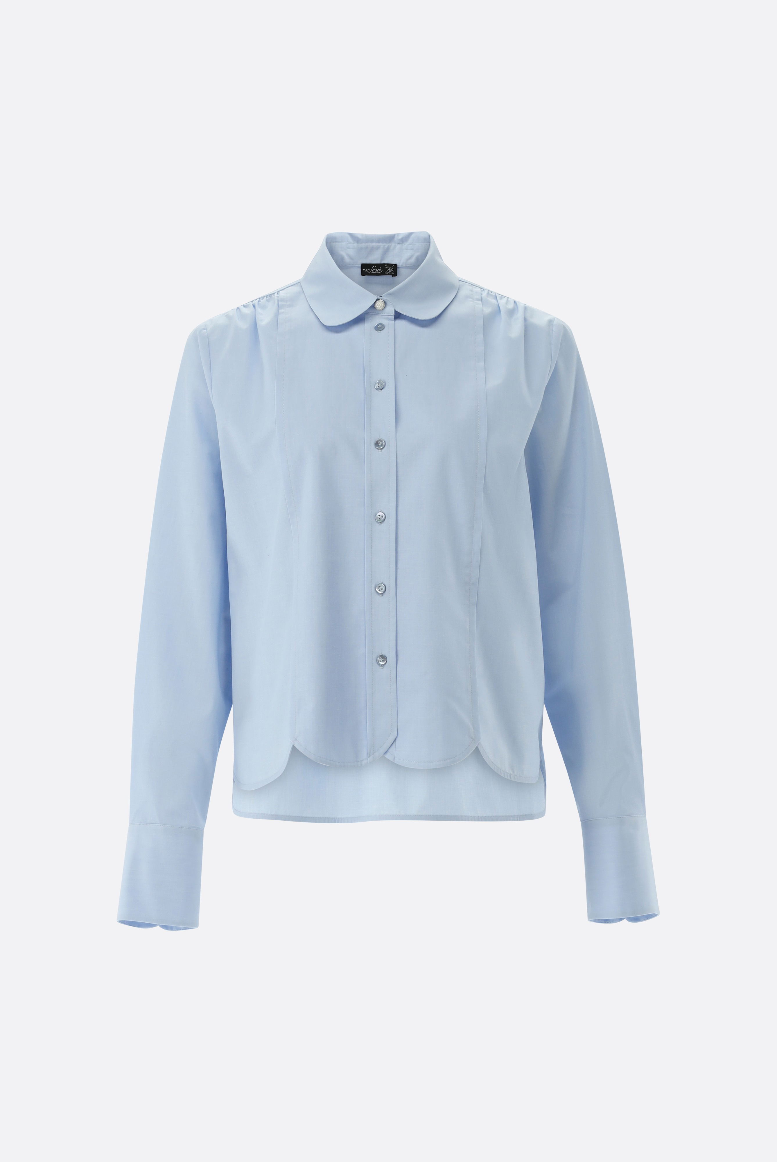 Die lockere, verkürzte Bluse im Loose Fit überzeugt mit langen, gerafften Ärmeln und einem Bubikragen. Der vordere Saum hat eine Bogenkante, während der Saum hinten länger ist. Aus Baumwoll-Fil-à-Fil gefertigt, eignet sich die Bluse für Business- und Casual-Looks.