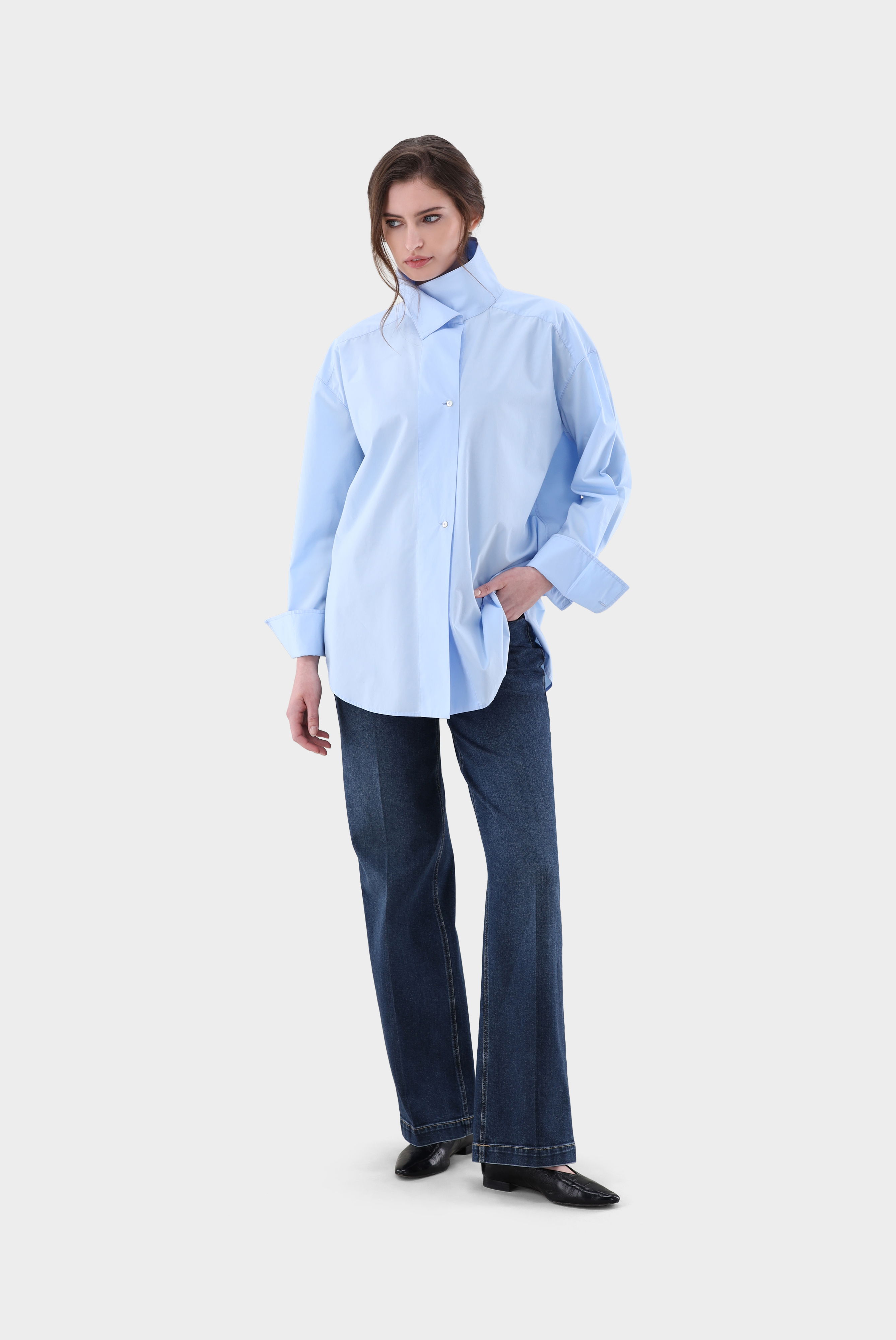 Look aus Bluse locker geschnitten mit hohem Stehkragen