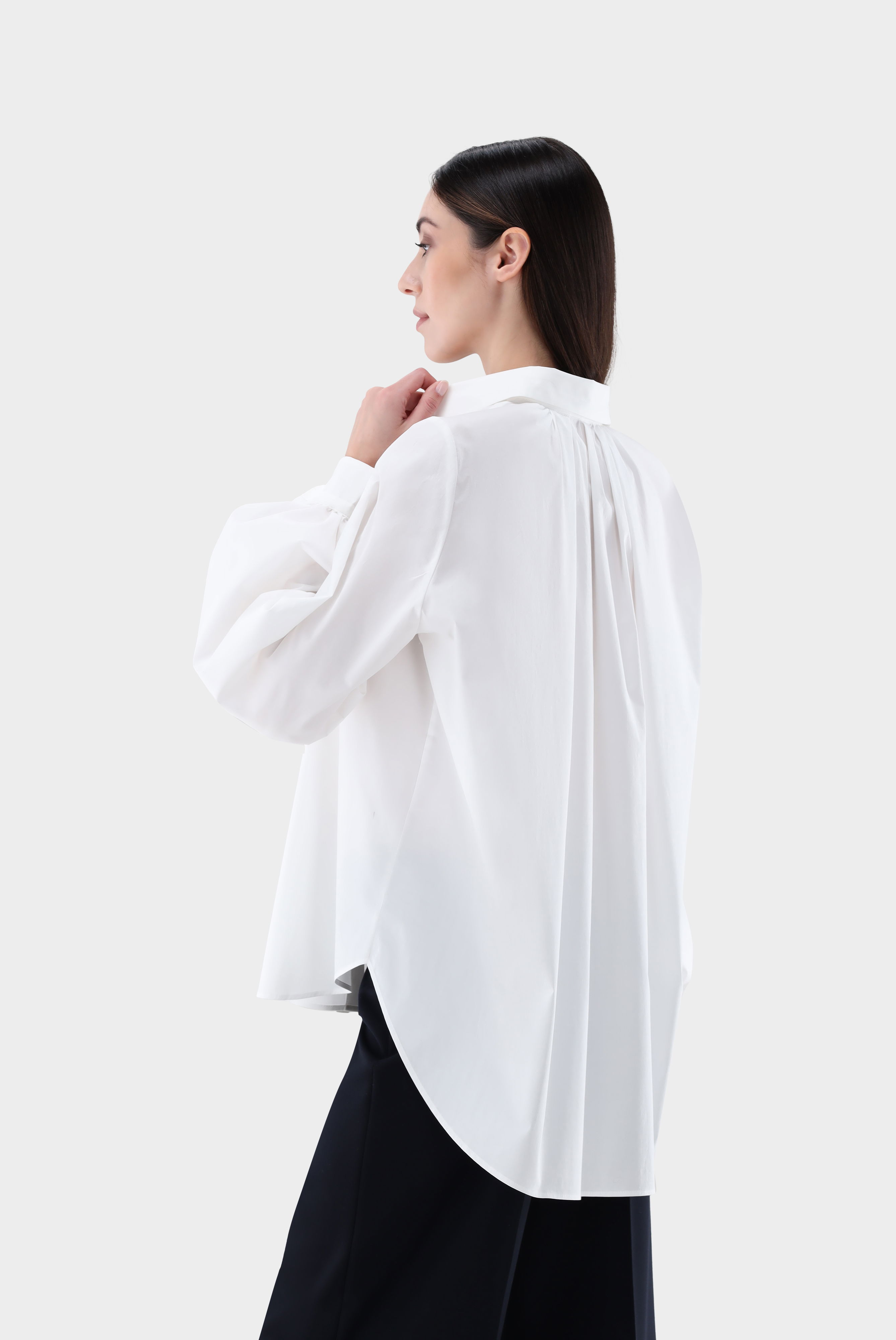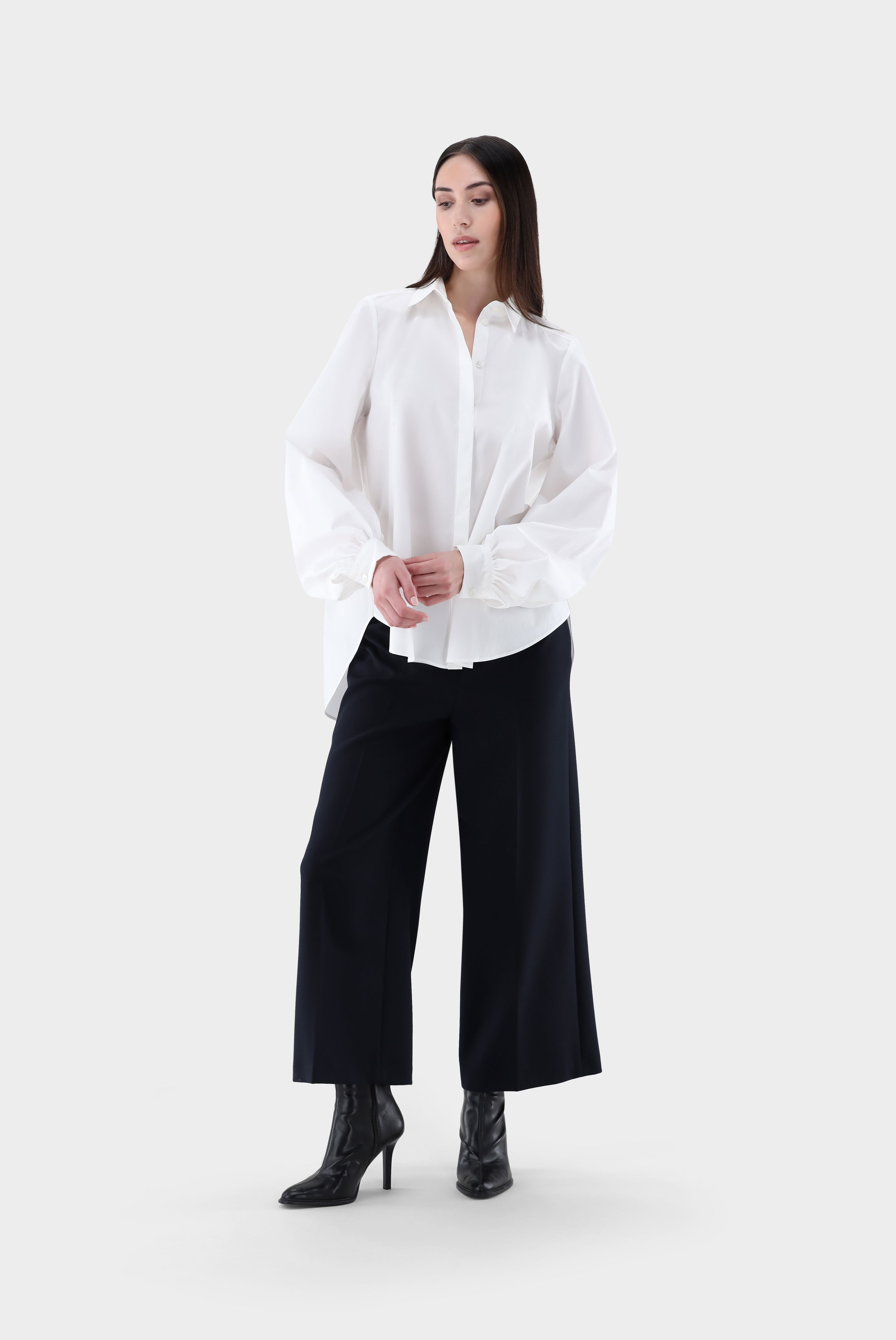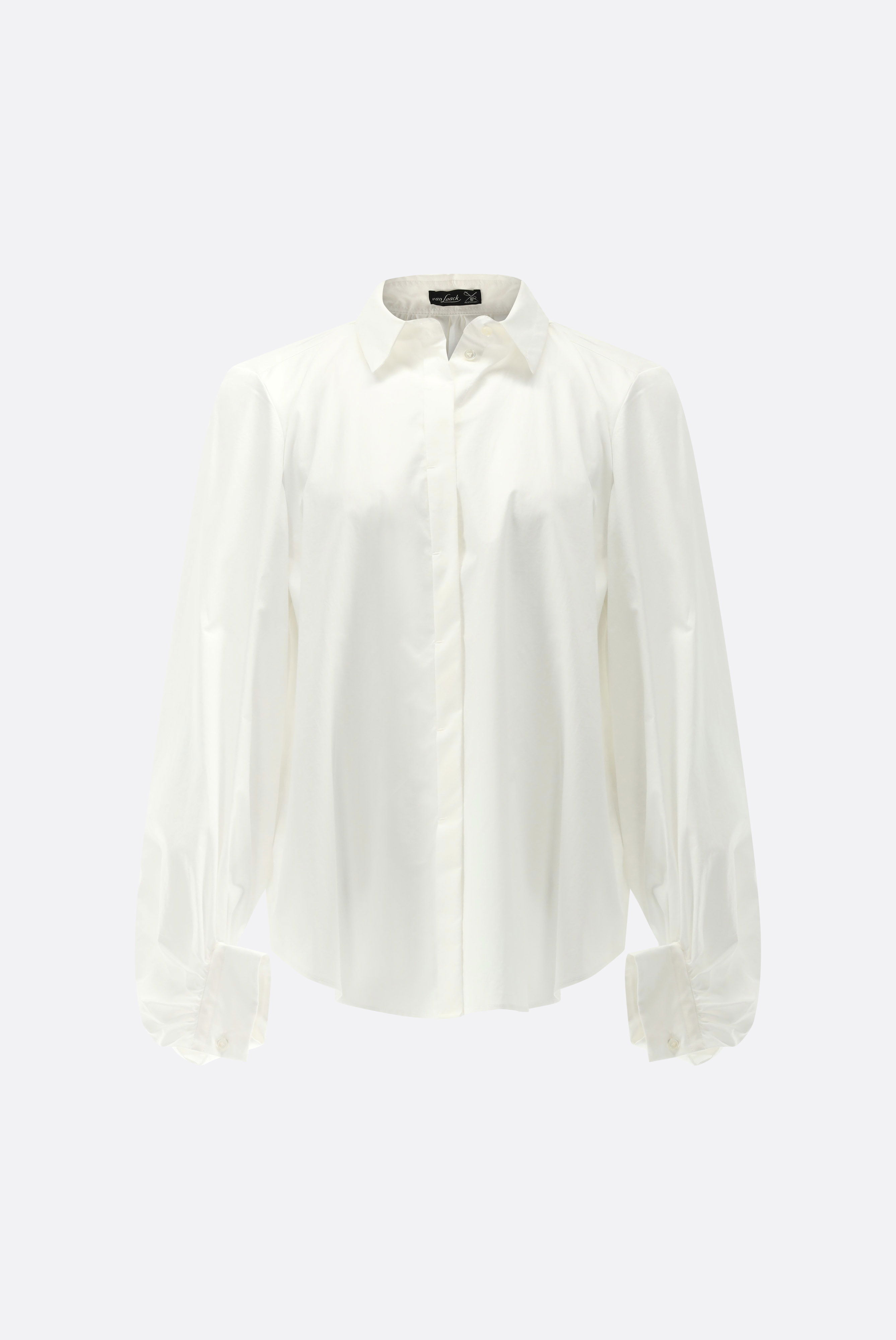 Weit geschnittenes Shirt mit langen Ballonärmeln, Rückenfalten, verdeckter Knopfleiste, hergestellt aus Baumwoll-Stretch mit Papertoucheffekt. Dieses vielseitige Shirt bietet eine lockere Passform mit voluminösen Ballonärmeln, verdeckter Knopfleiste mit Riegeldetails, extra breit abgestepptem Kragen und Manschette sowie Falten am Kragenansatz hinten. Geeignet für lässige, geschäftliche und festliche Anlässe.