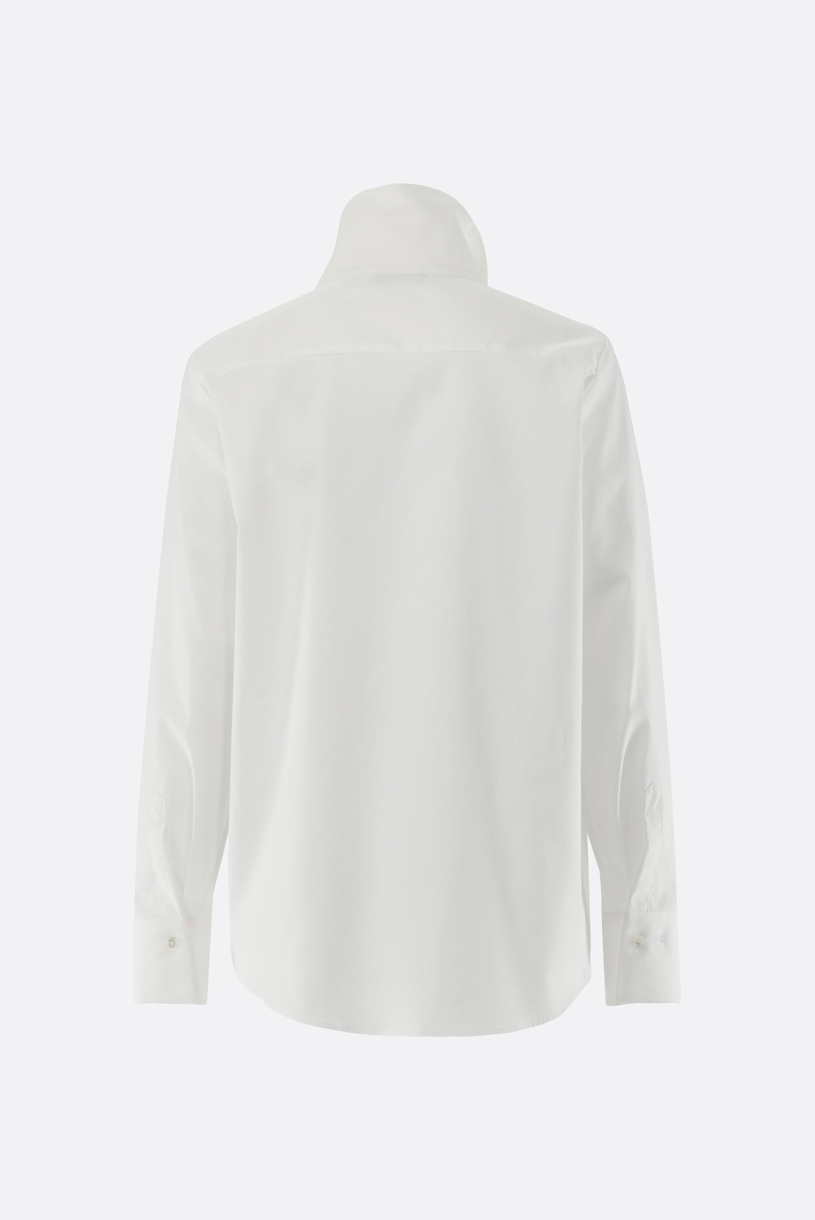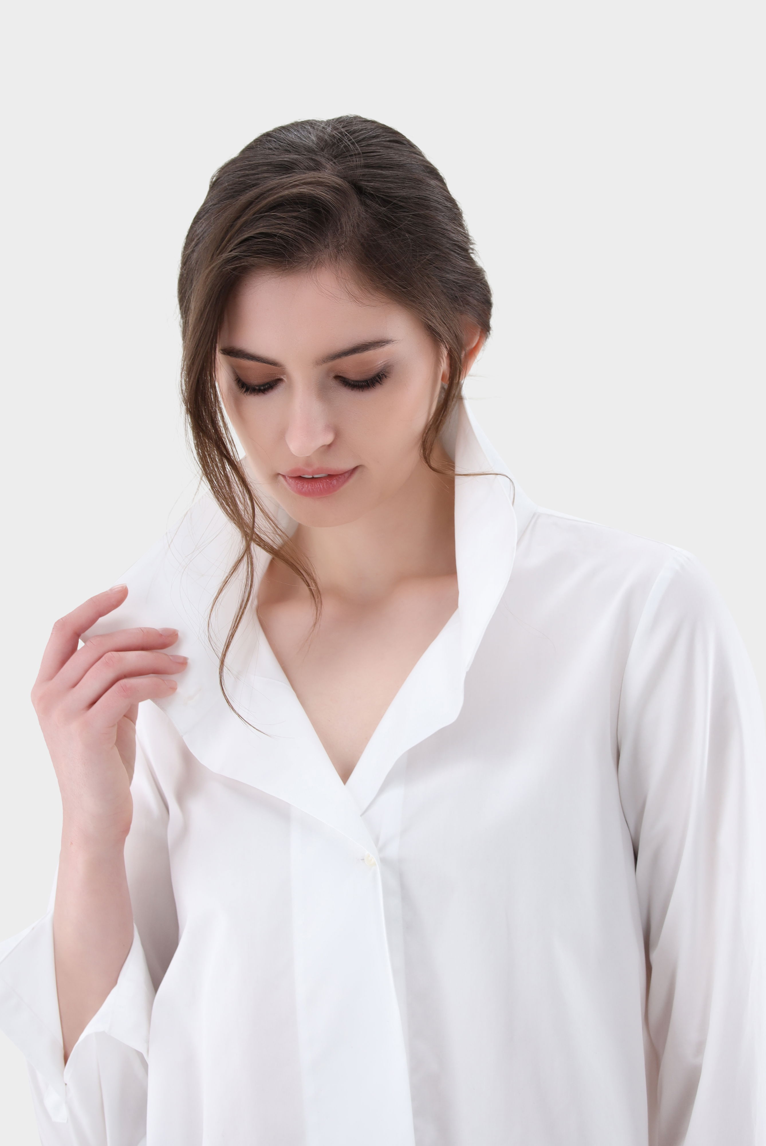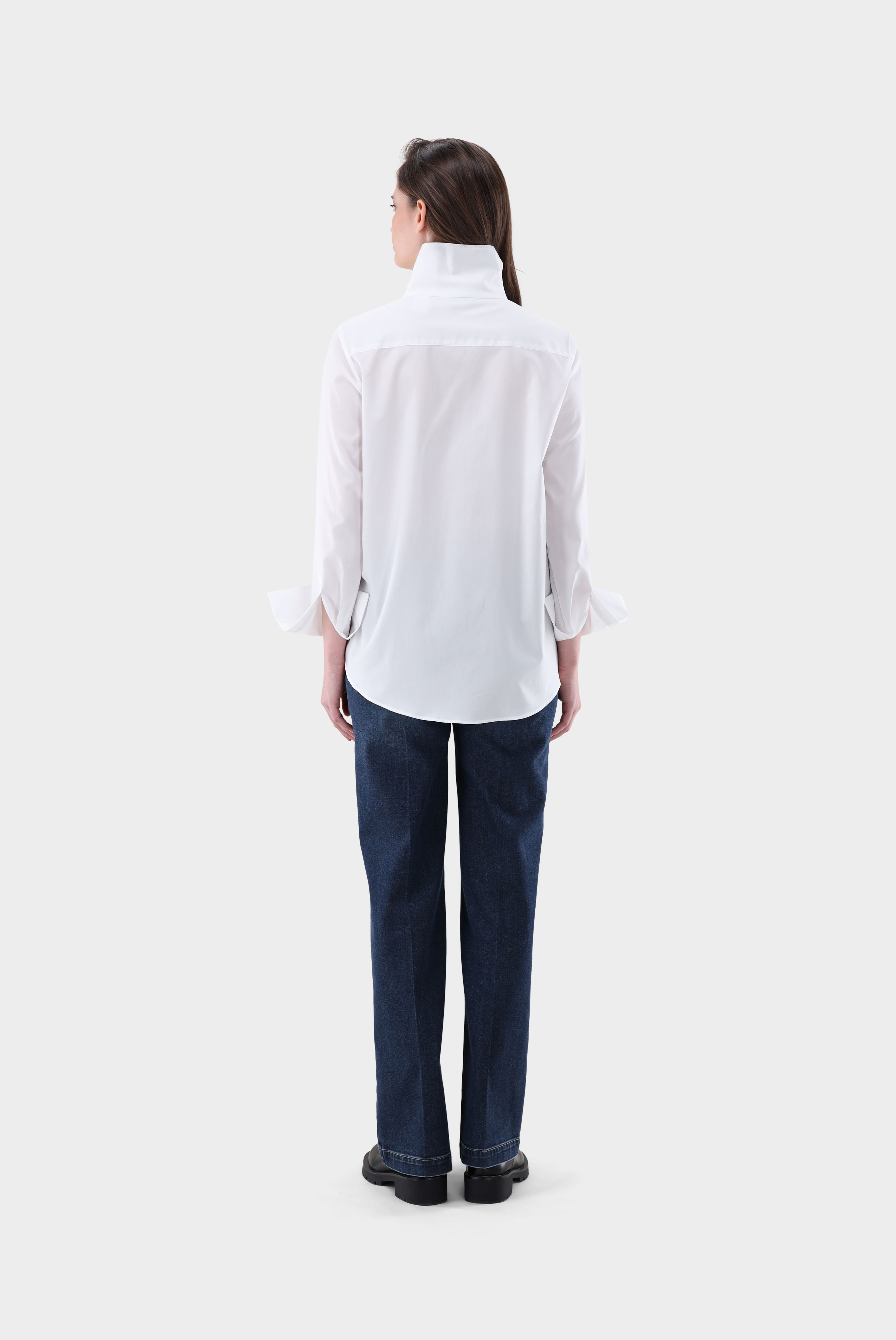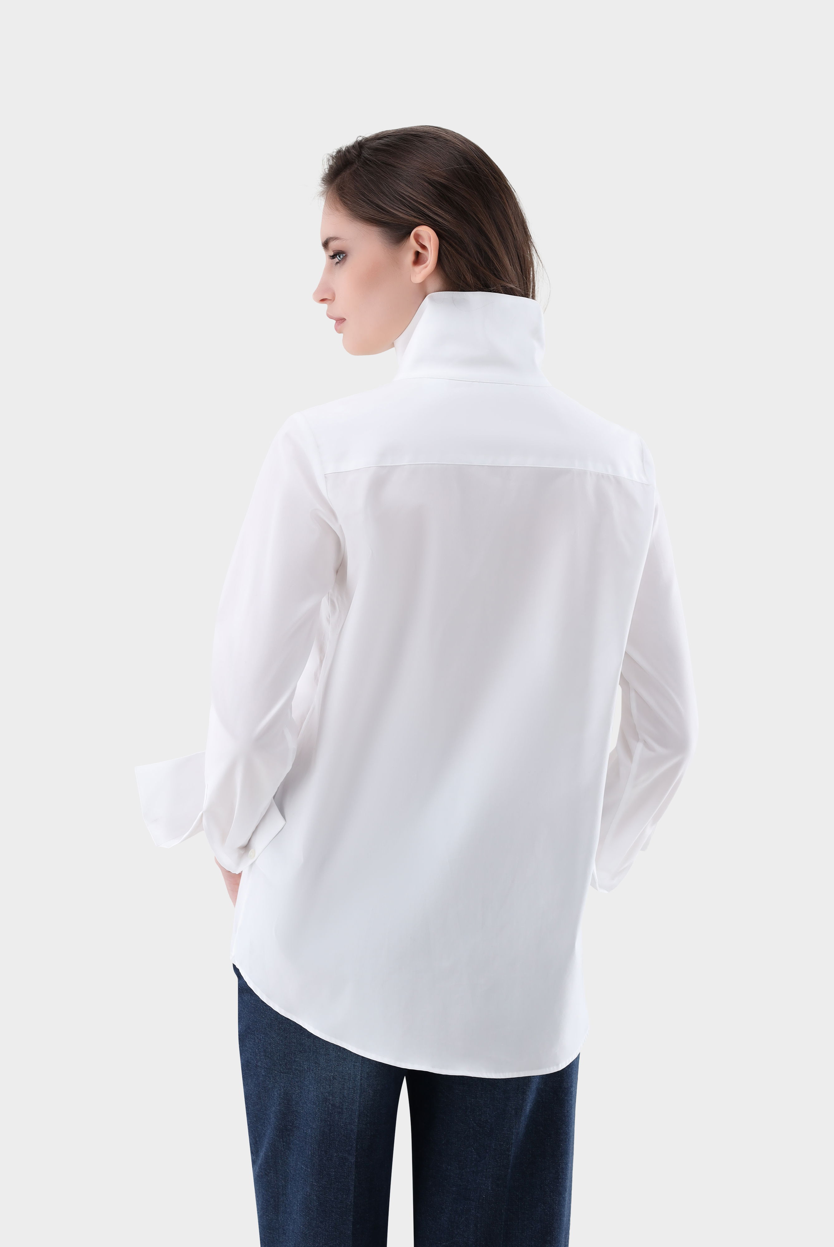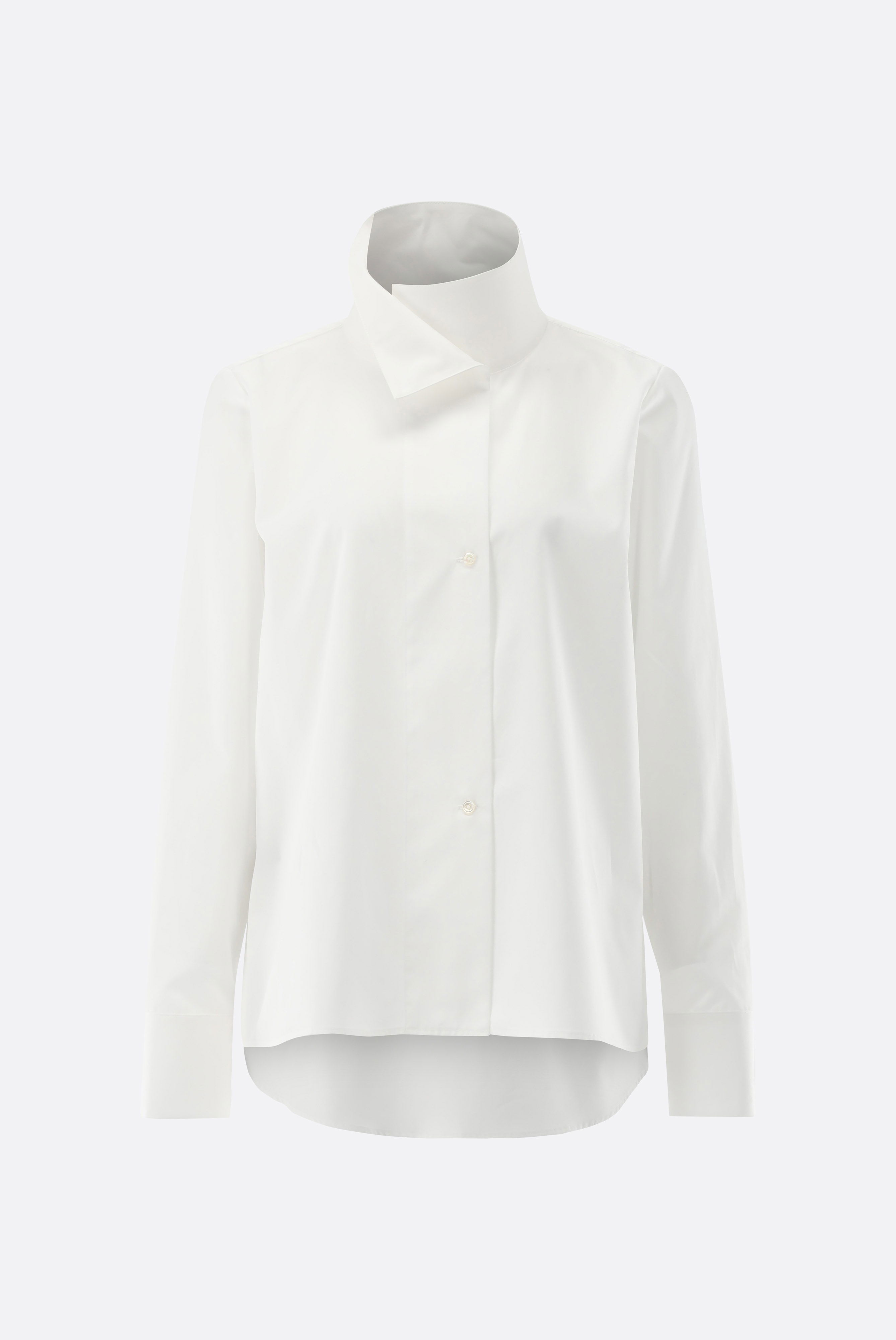 Die leicht taillierte Bluse verfügt über einen leciht ausgestellten Saum, sowie einen tieferen Rücken und erhält so einen verlängerten Look. Sie besticht durch einen ausgefallenen hohen Stehkragen und eine Rückenpasse. Die Knopfleiste wird verdeckt und verleiht der Bluse so eine besonders elegante Silhouette. Aus Baumwoll Popeline gefertigt, eignet sich die Bluse für Business- und Casual-Looks.