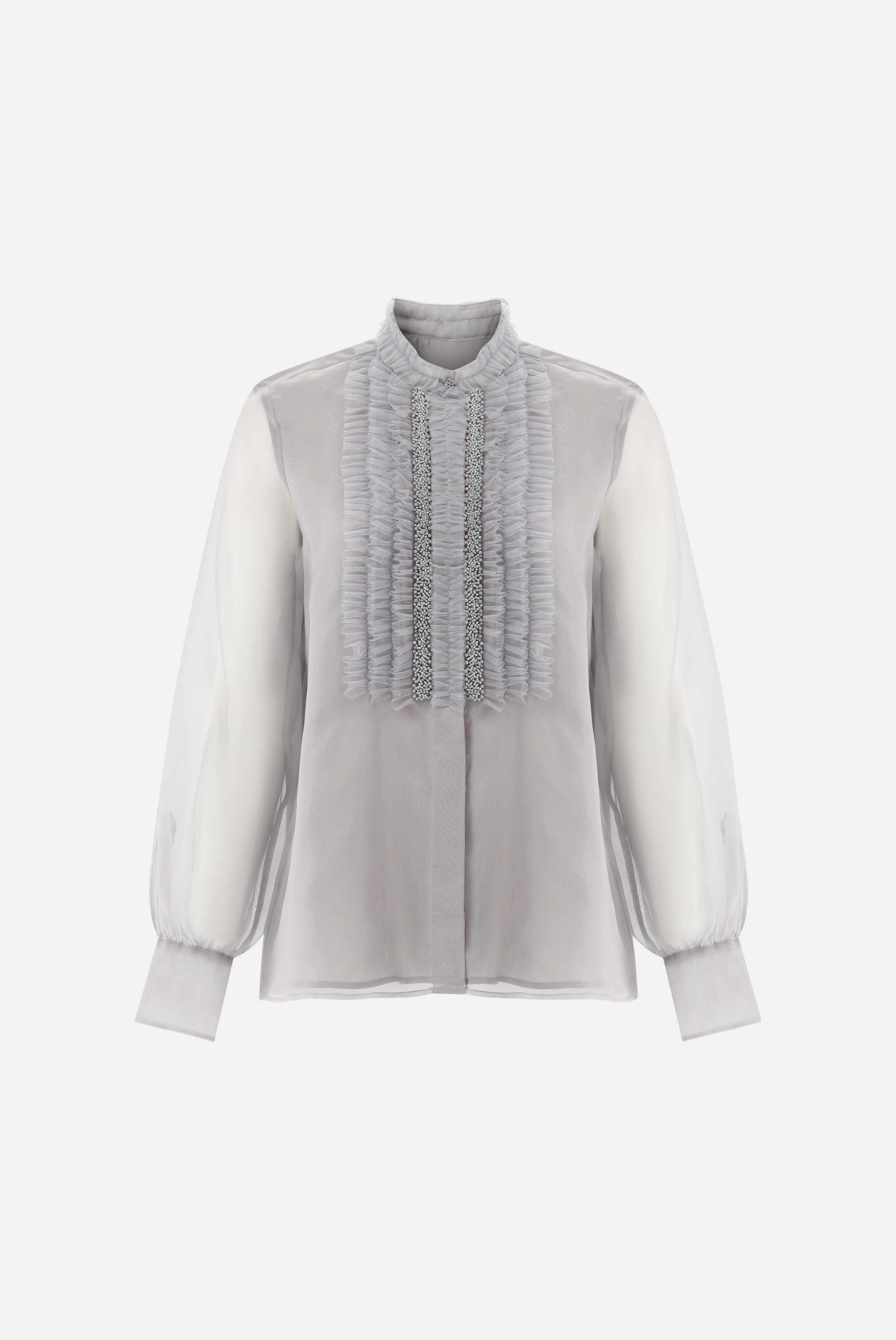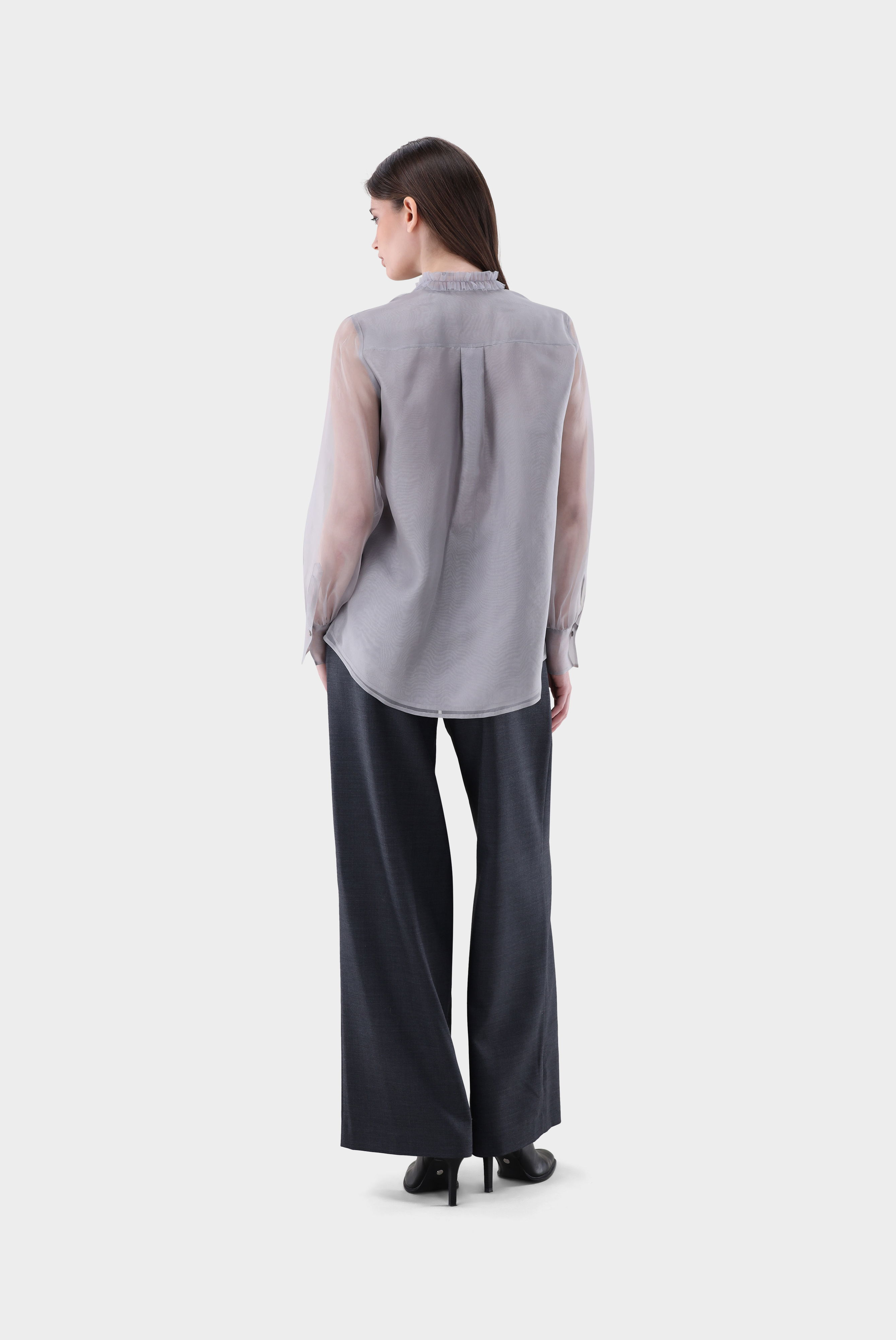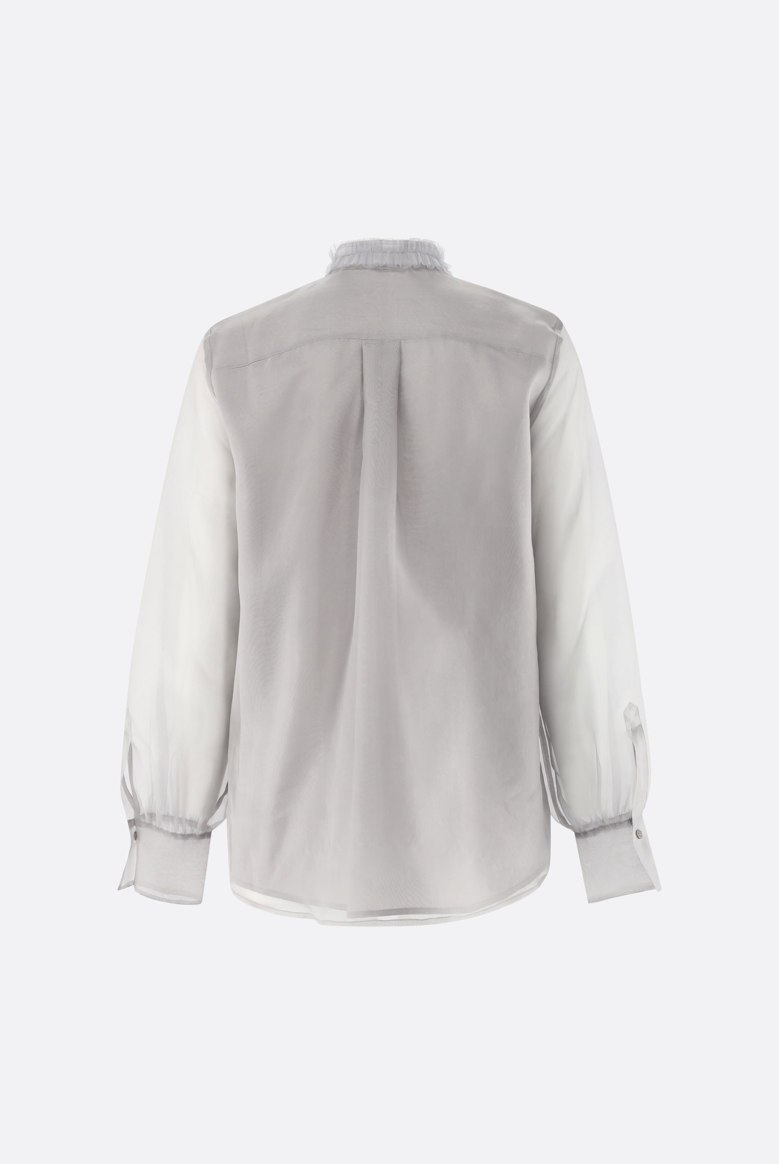 Bluse mit lockerer Passform aus edlem Seidenorganza und Futter aus Habotai-Seide für ein leichtes Tragegefühl. Sie verfügt über lange Ärmel, die an den Manschetten gerafft sind, sowie einen leicht ausgestellten Saum für eine moderne Silhouette. Die Rückenpasse mit Kellerfalte sorgt für zusätzlichen Komfort und Bewegungsfreiheit. Verdeckte Knopfleiste, Stehkragen und dezente Rüschen an Kragen, Knopfleiste und Vorderseite setzen feine Akzente, ergänzt durch ein elegantes Perlenband neben der Knopfleiste. Eine hochwertige Bluse, die sich ideal für anspruchsvolle und stilvolle Outfits eignet.