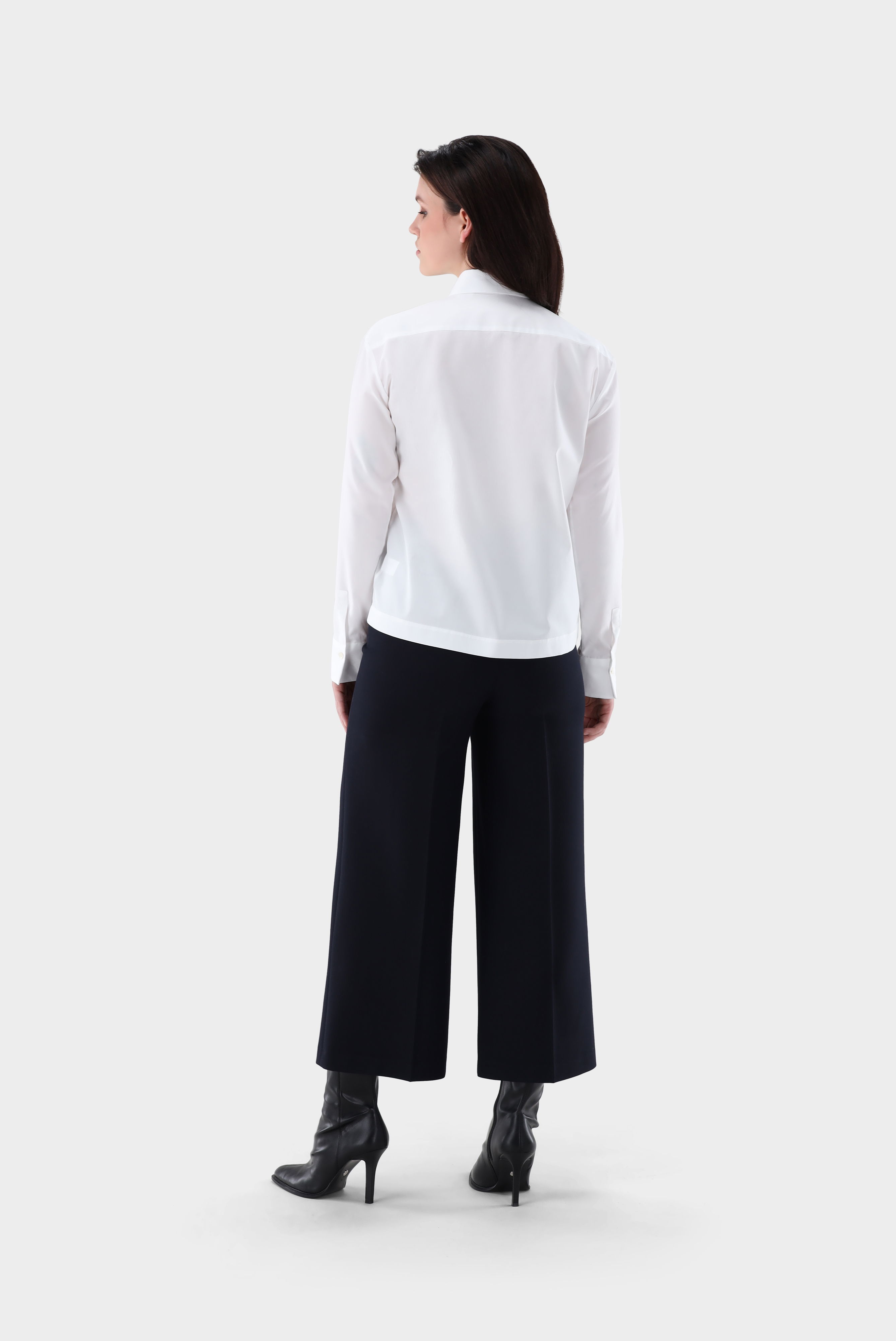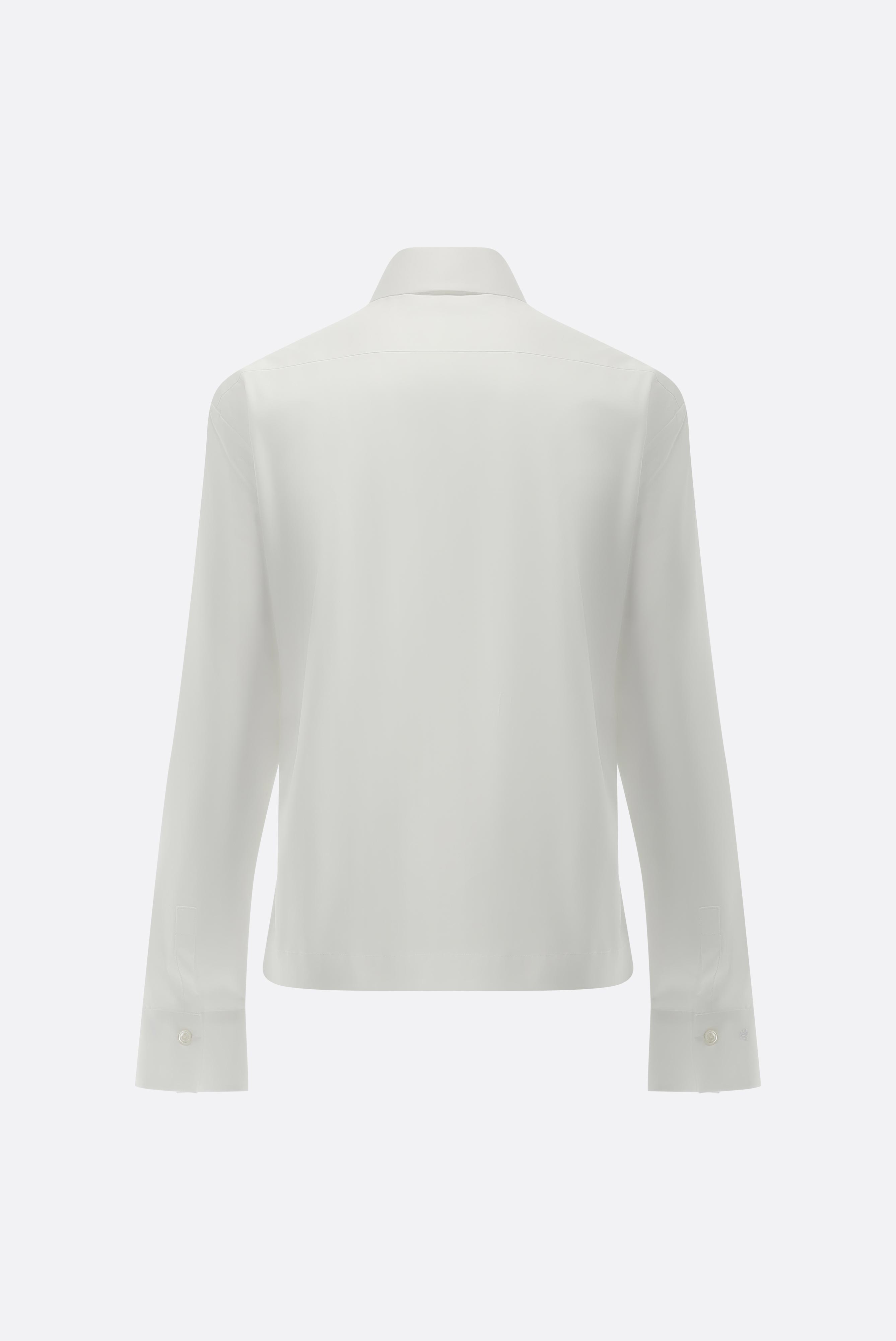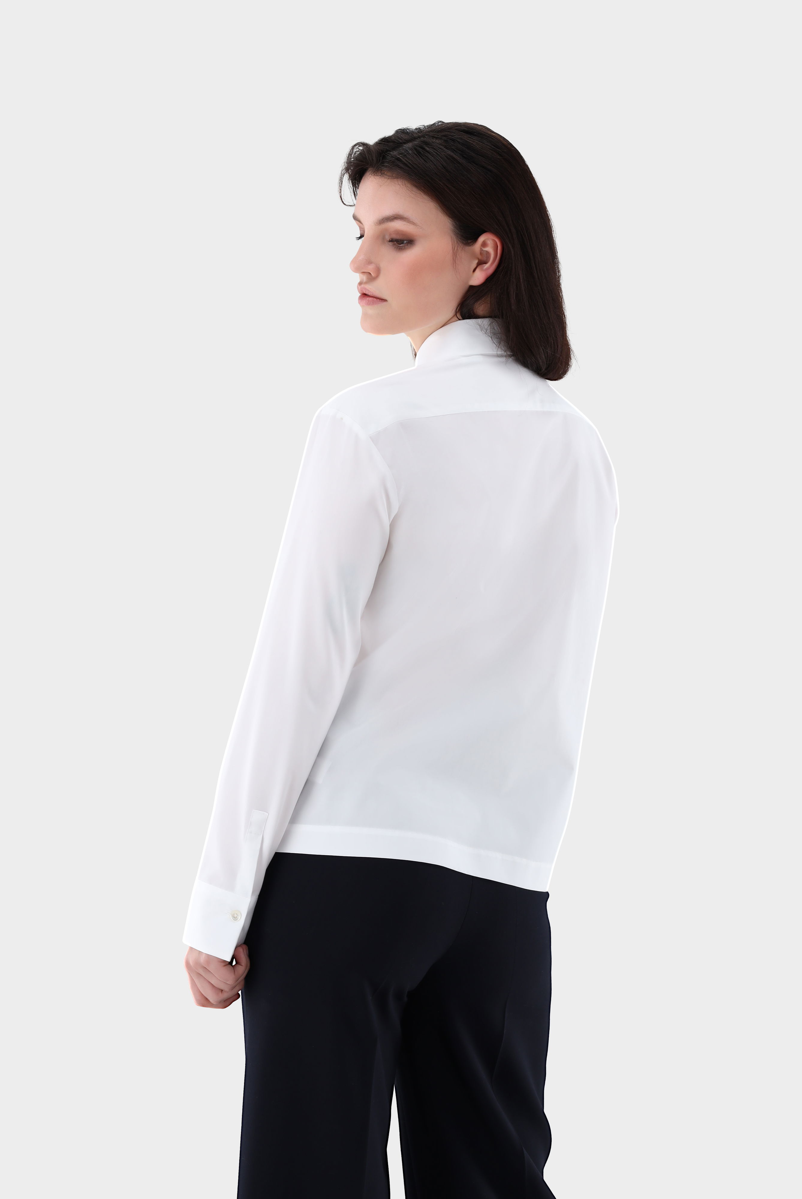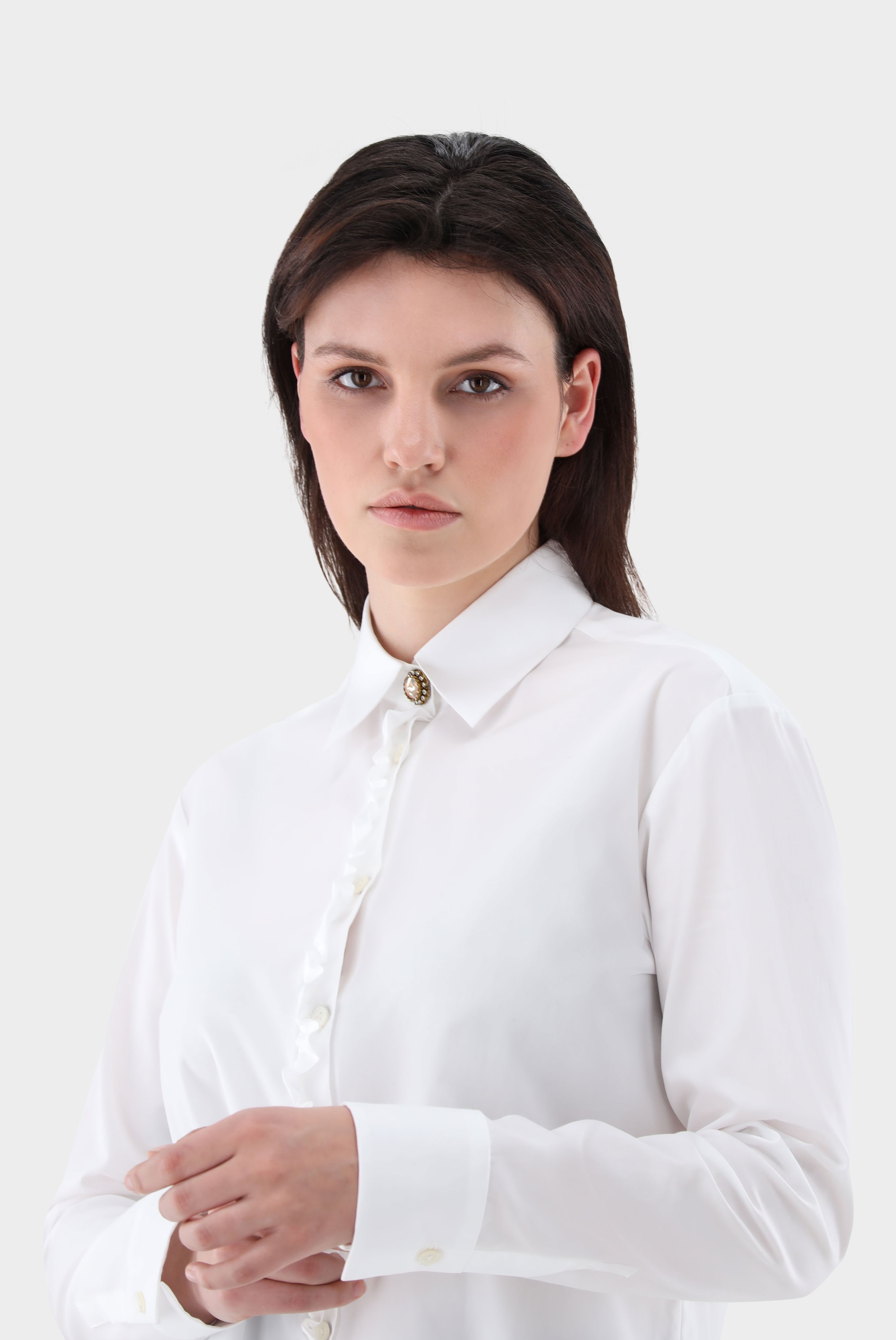 Unsere boxy geschnittene Bluse mit langen Ärmeln ist aus glatter Baumwollpopeline gefertigt. Sie verfügt über einen Hemdblusenkragen, eine verdeckte Knopfleiste mit angesetzten Rüschen, eine Rückenpasse und einen extra breit abgesteppten Saum. Ein dekorativer Schmuckknopf ziert den Kragensteg, der auch abgenommen werden kann. Perfekt für festliche Anlässe und den Business-Chic.