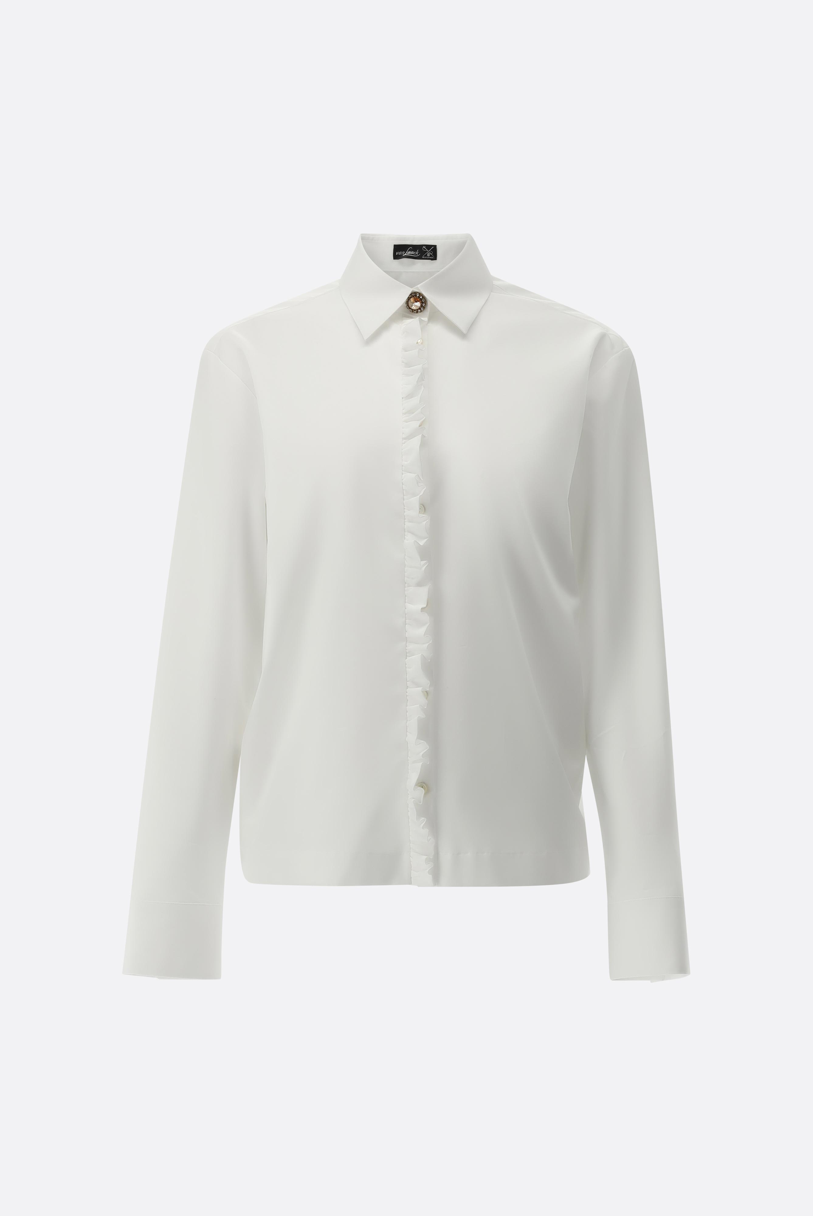 Look aus Bluse mit Rüschen und Schmuckknopf Boxy Fit