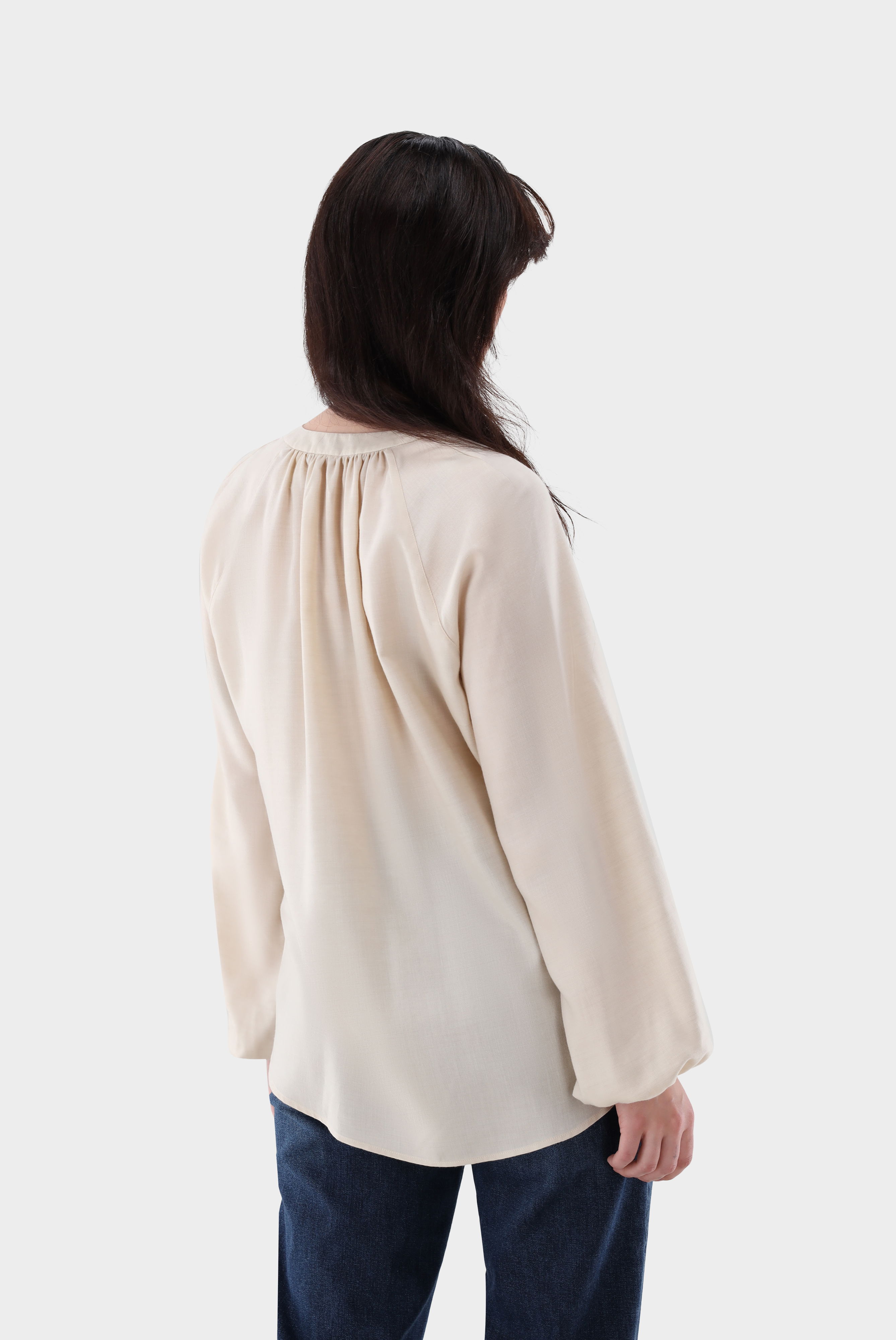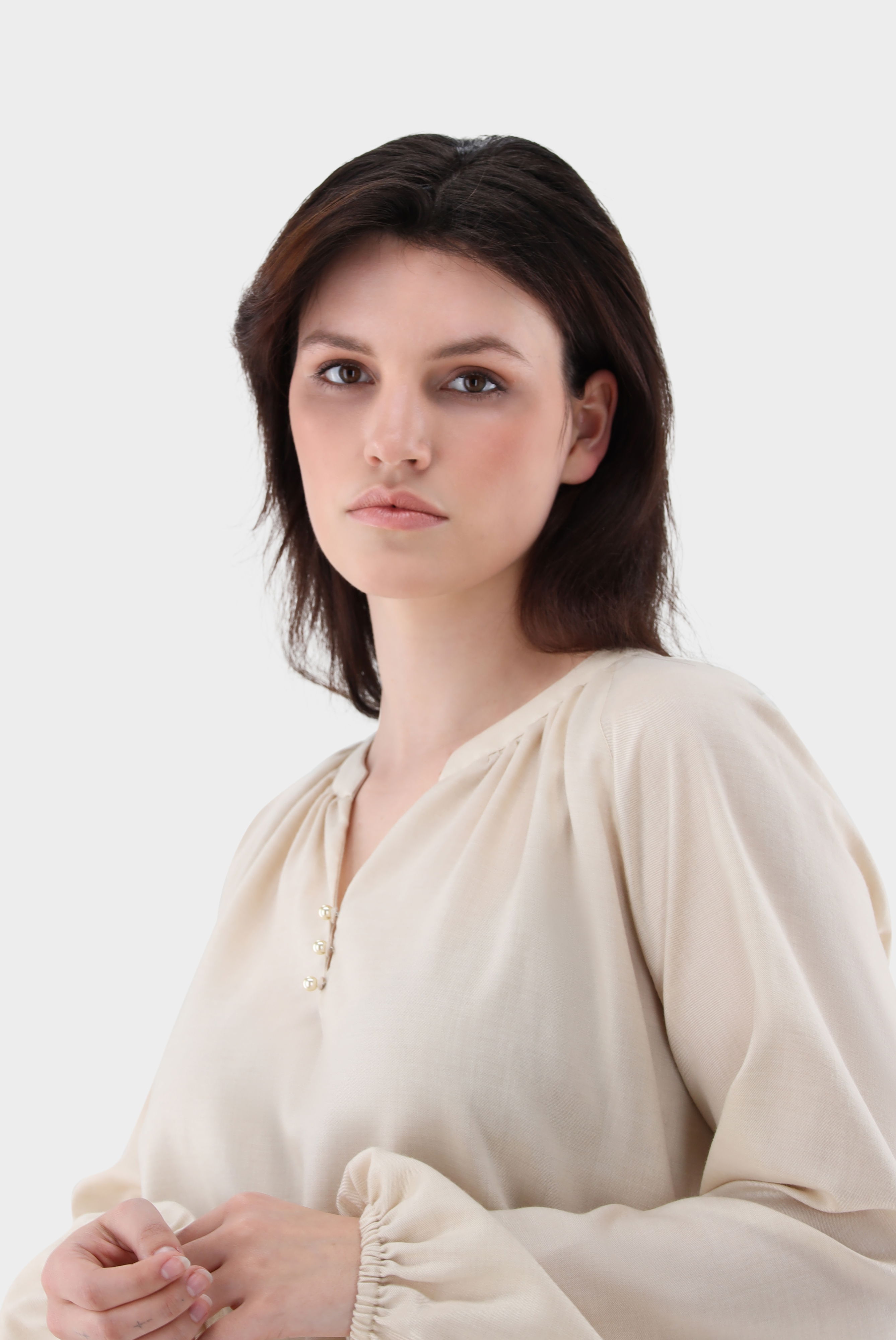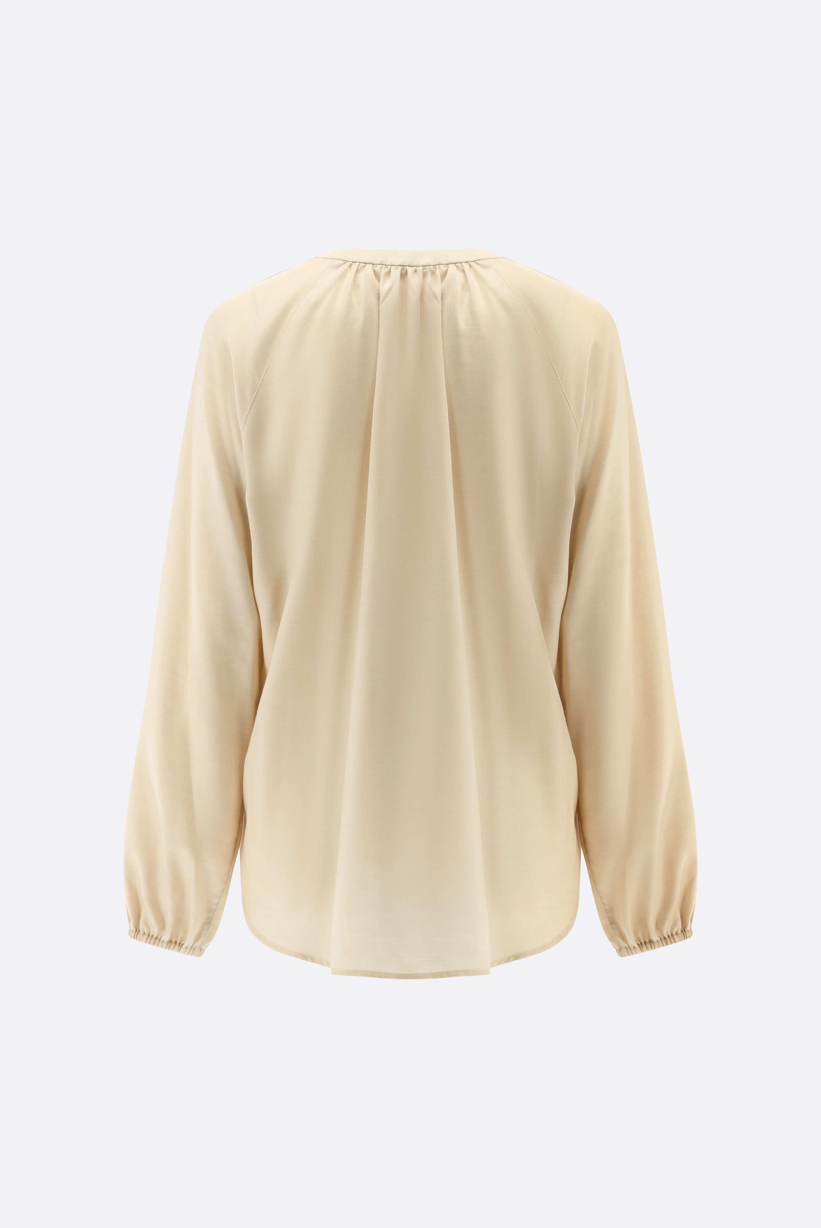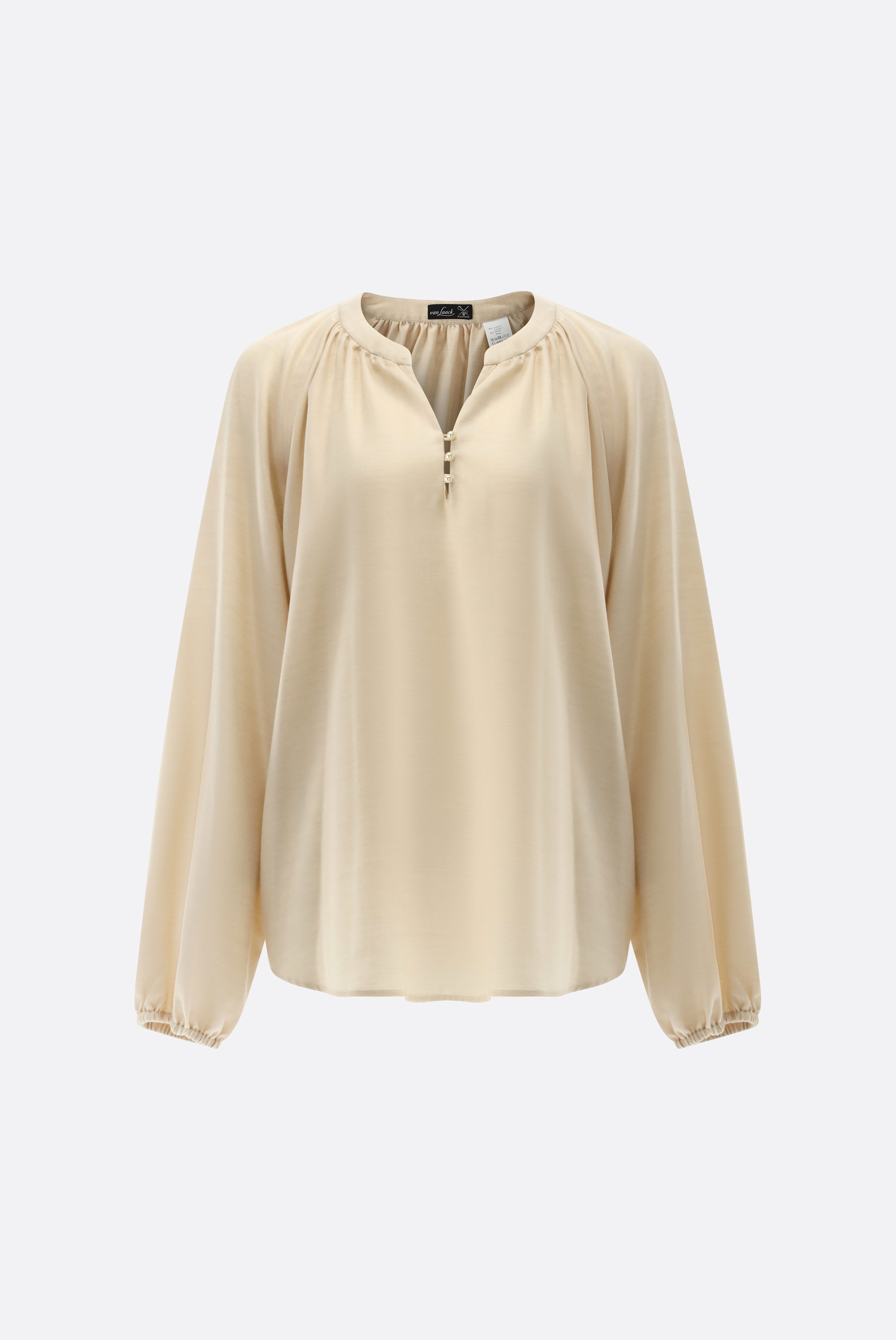 Die locker geschnittene Schlupfbluse mit langen Ärmeln und elastischer Verzierung am Kragen besteht aus einer Lyocell-Woll-Mischung mit leichtem Flanell. Diese vielseitige Bluse verfügt über weite, lange Raglanärmel, einen gerafften Stehkragen und perlenförmige Knöpfe mit Schlaufenverschluss. Geeignet für lässige und geschäftliche Anlässe.