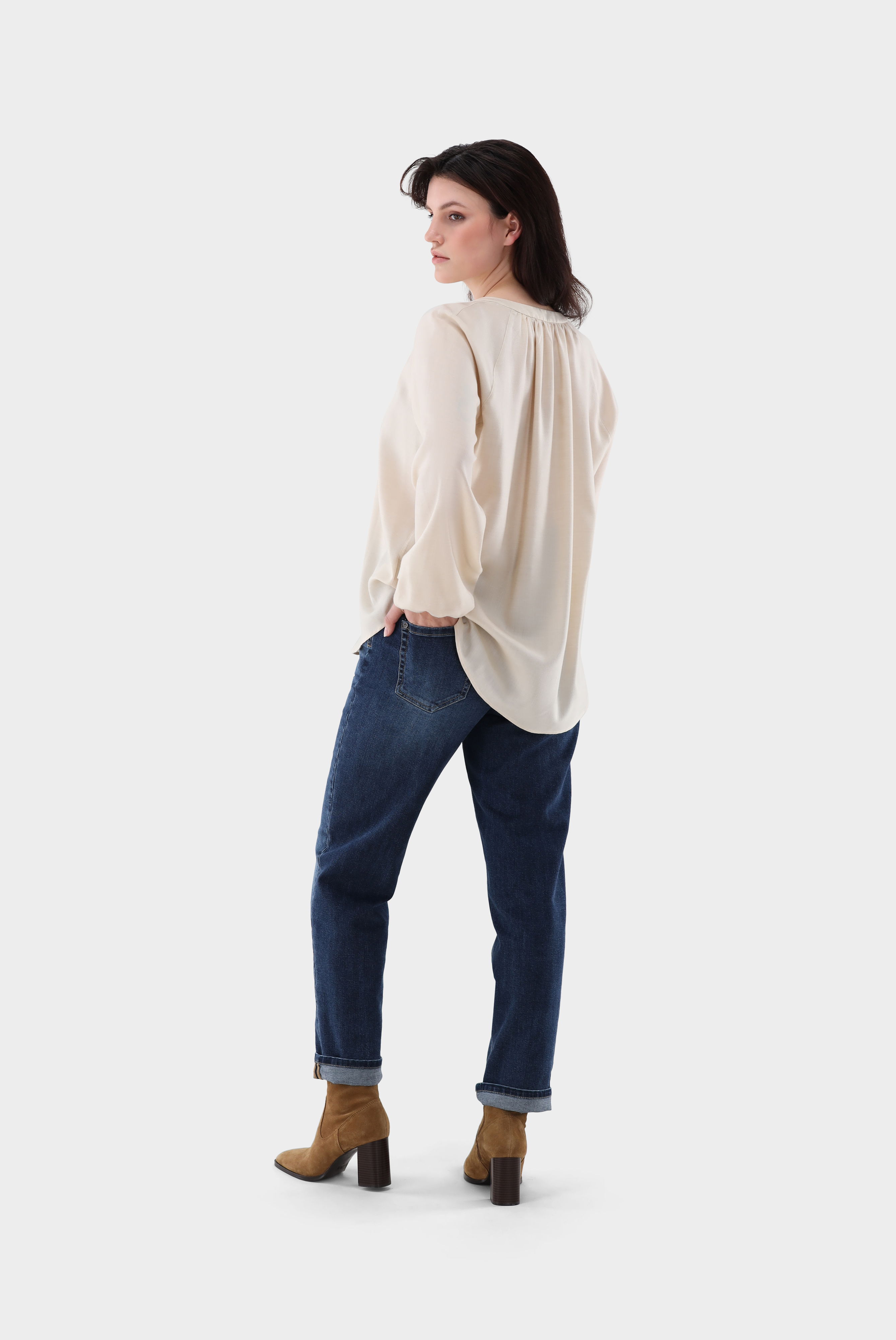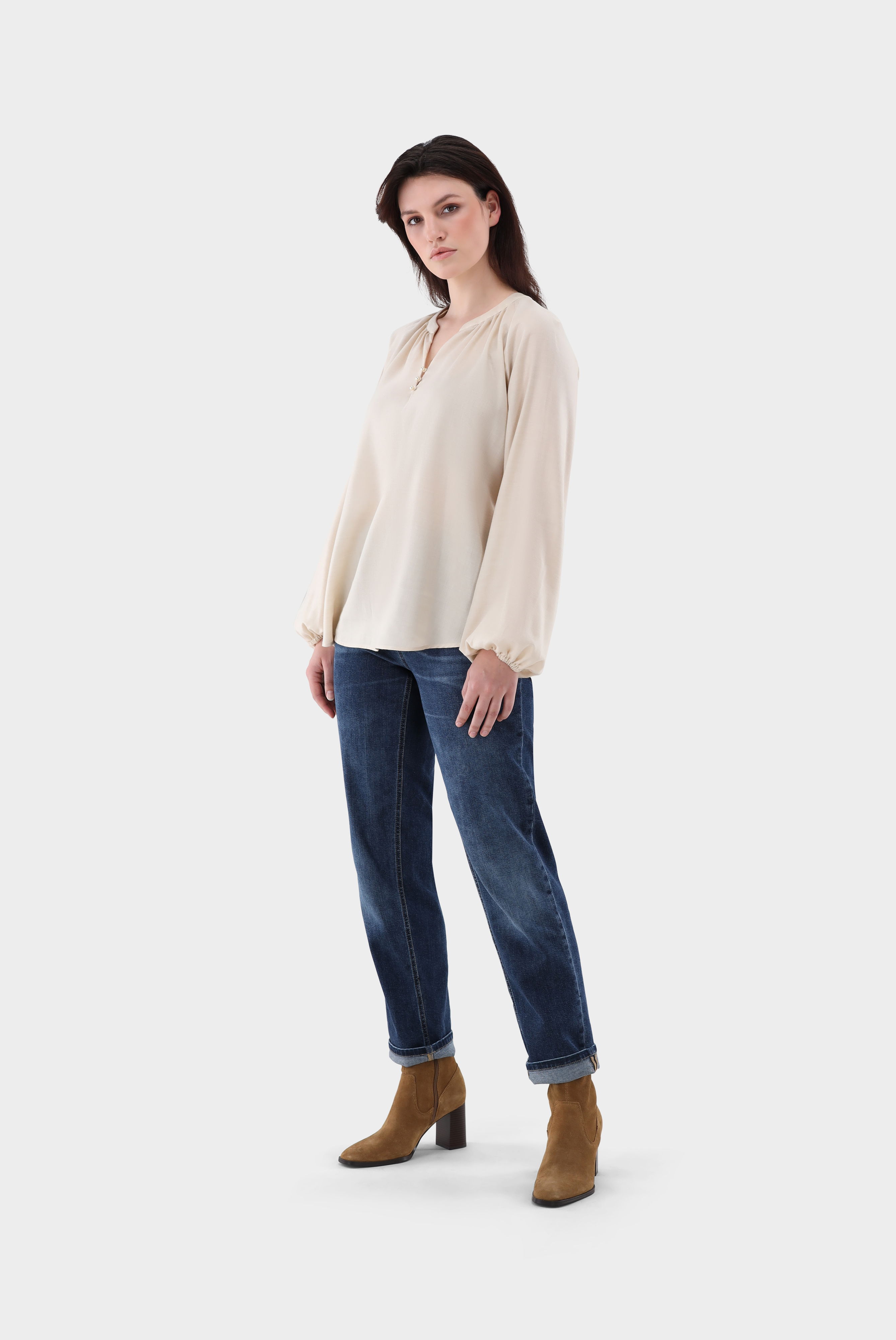 Look aus Bluse mit Stehkragen und lockerem Schnitt