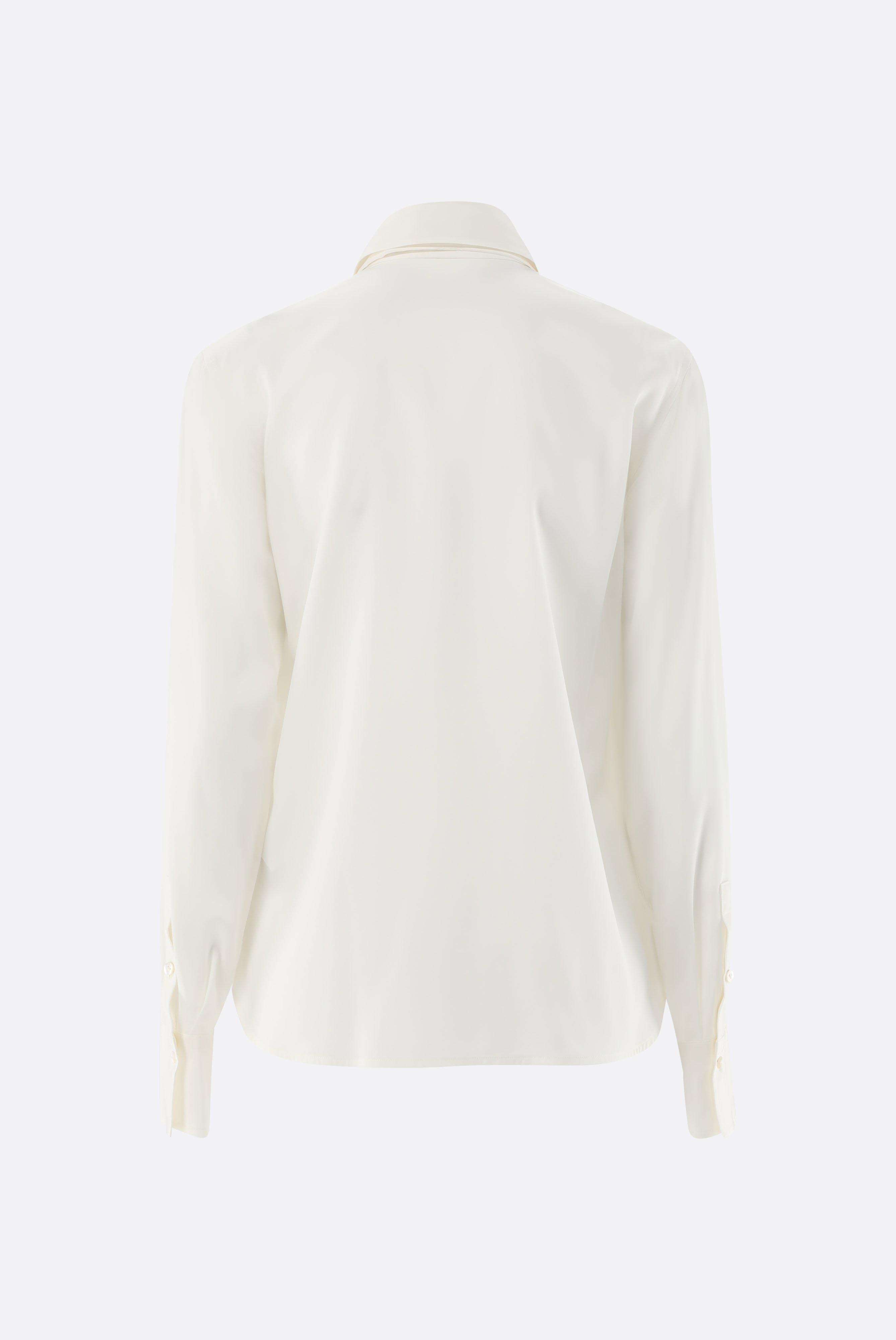 Halb taillierte Bluse mit langen Ärmeln, gefertigt aus Seiden-Stretch Satin. Diese klassische Bluse verfügt über eine selbstgebundene Schleife, die abnehmbar ist, einen figurbetonten Schnitt, Manschetten an den langen Ärmeln und einen leicht geschwungenen Saumverlauf.