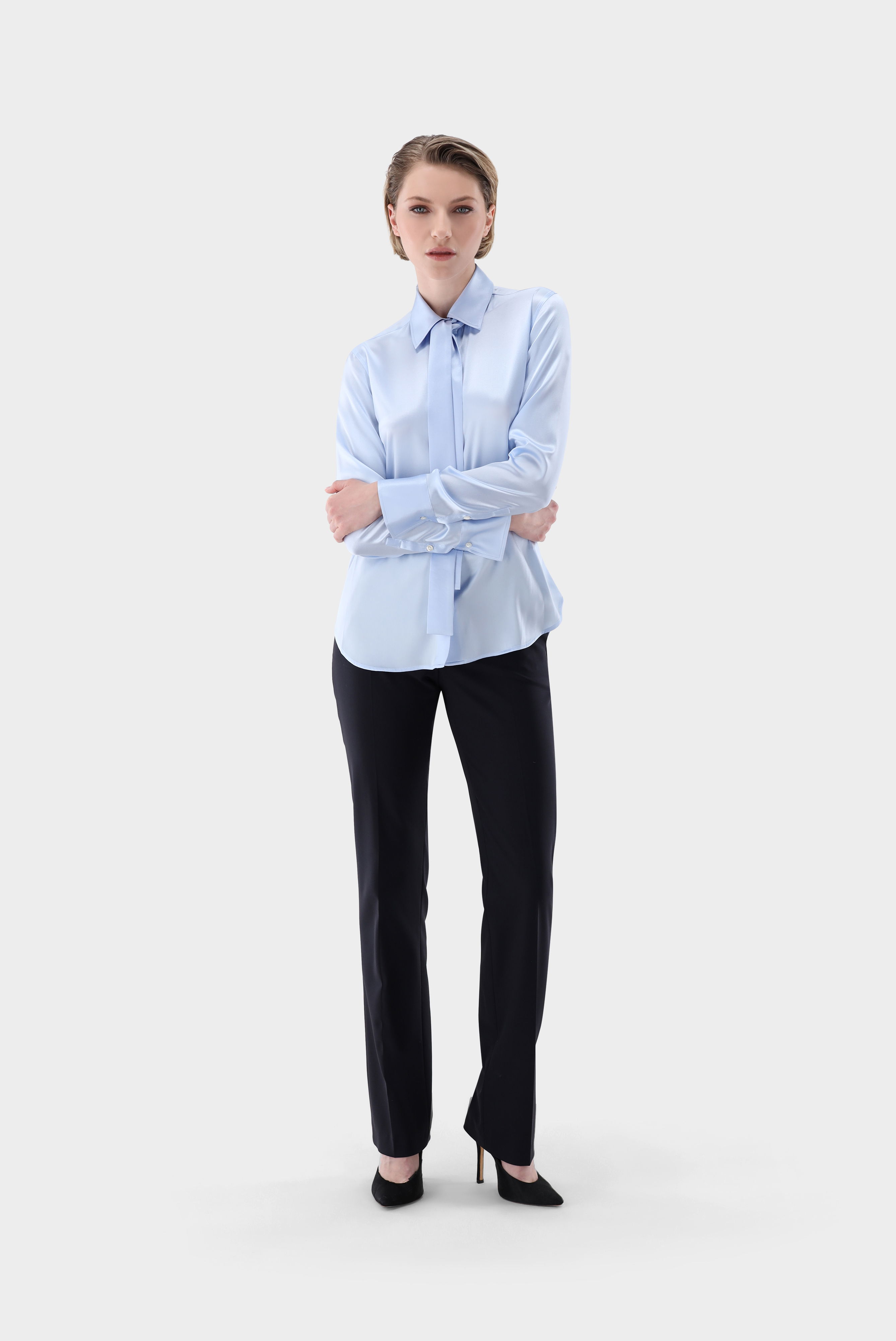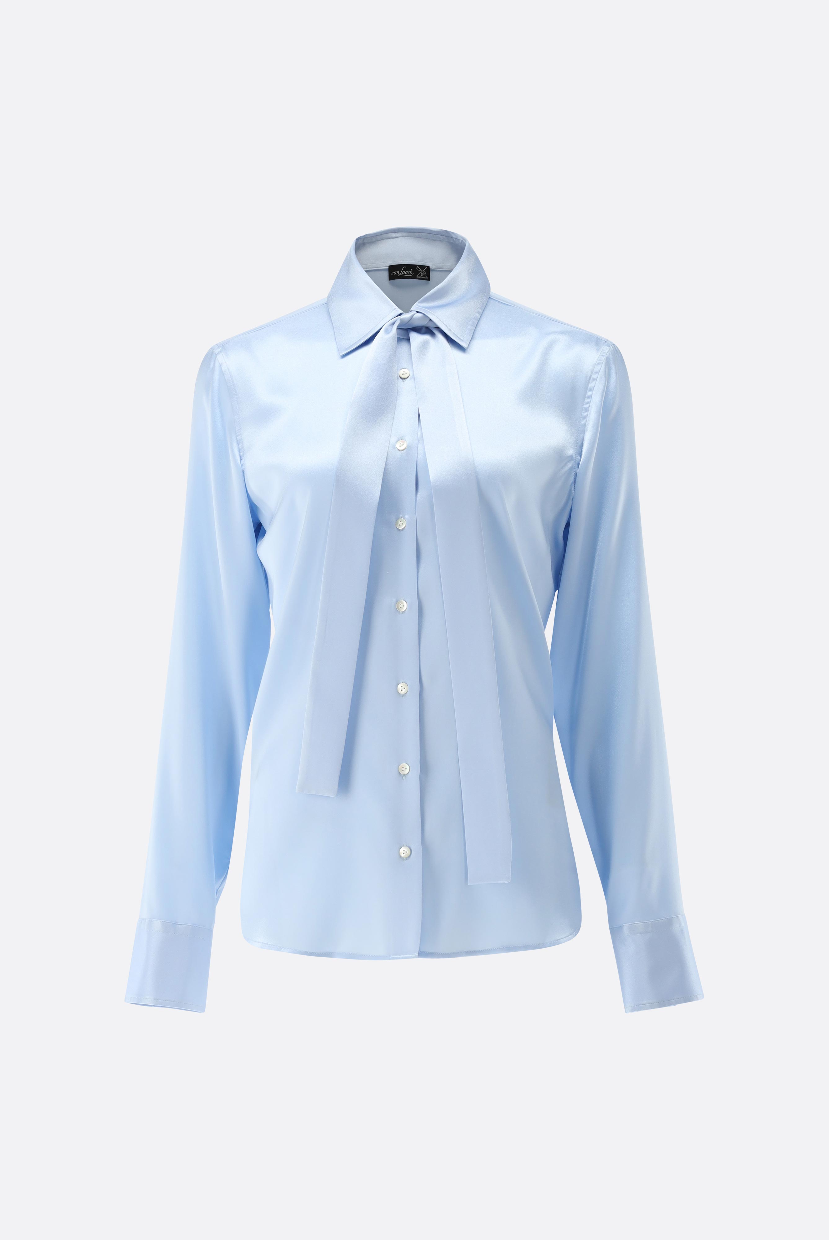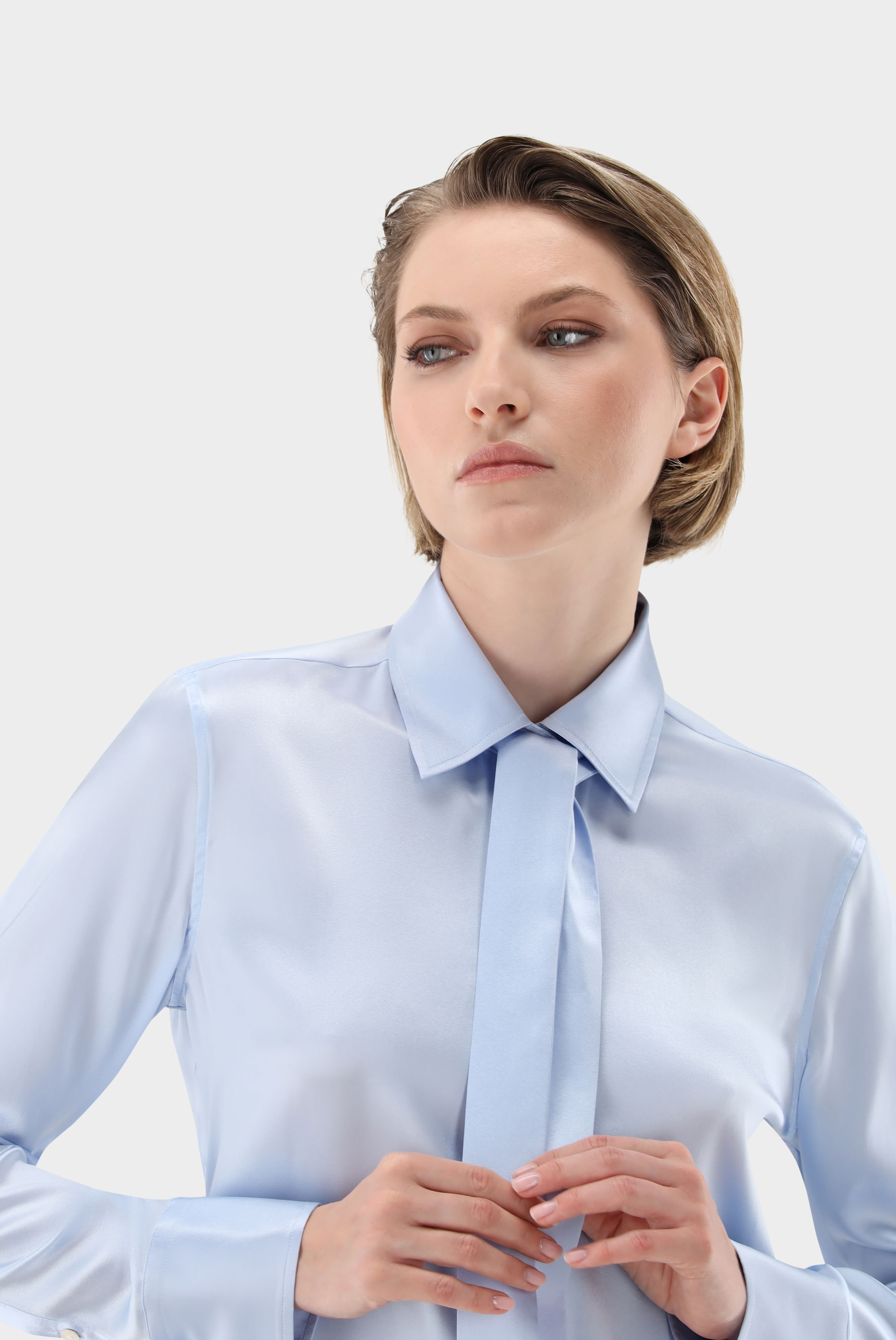 Halb taillierte Bluse mit langen Ärmeln, gefertigt aus Seiden-Stretch Satin. Diese klassische Bluse verfügt über eine selbstgebundene Schleife, die abnehmbar ist, einen figurbetonten Schnitt, Manschetten an den langen Ärmeln und einen leicht geschwungenen Saumverlauf.