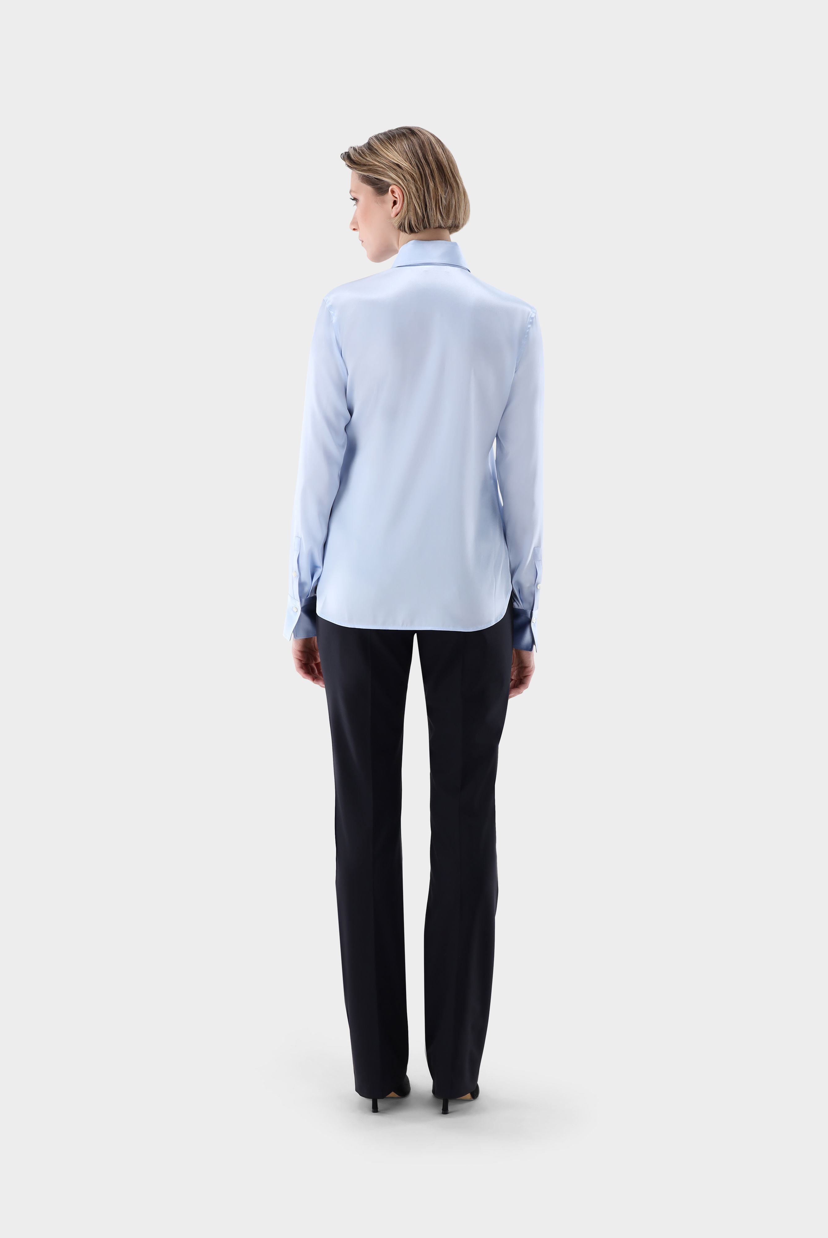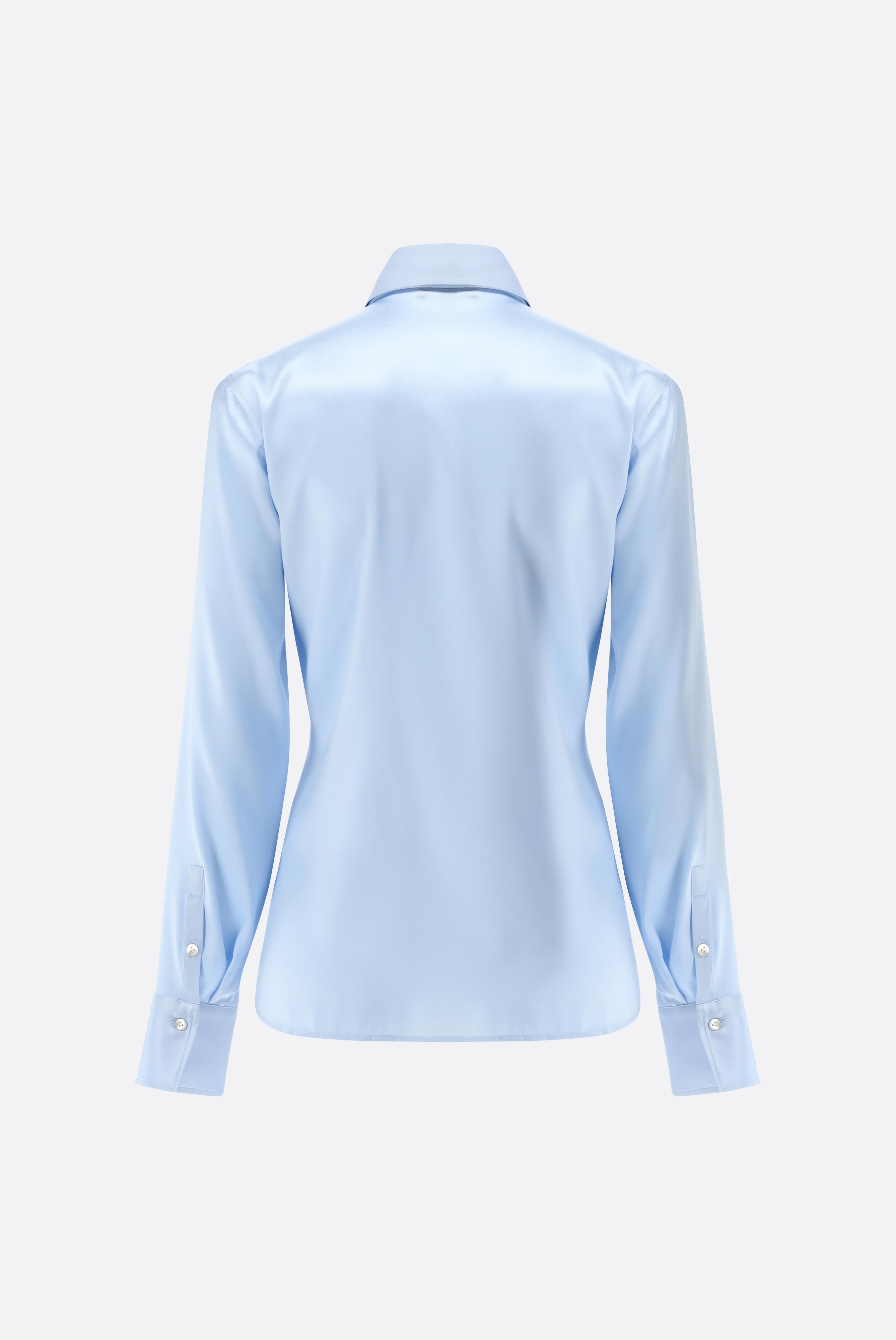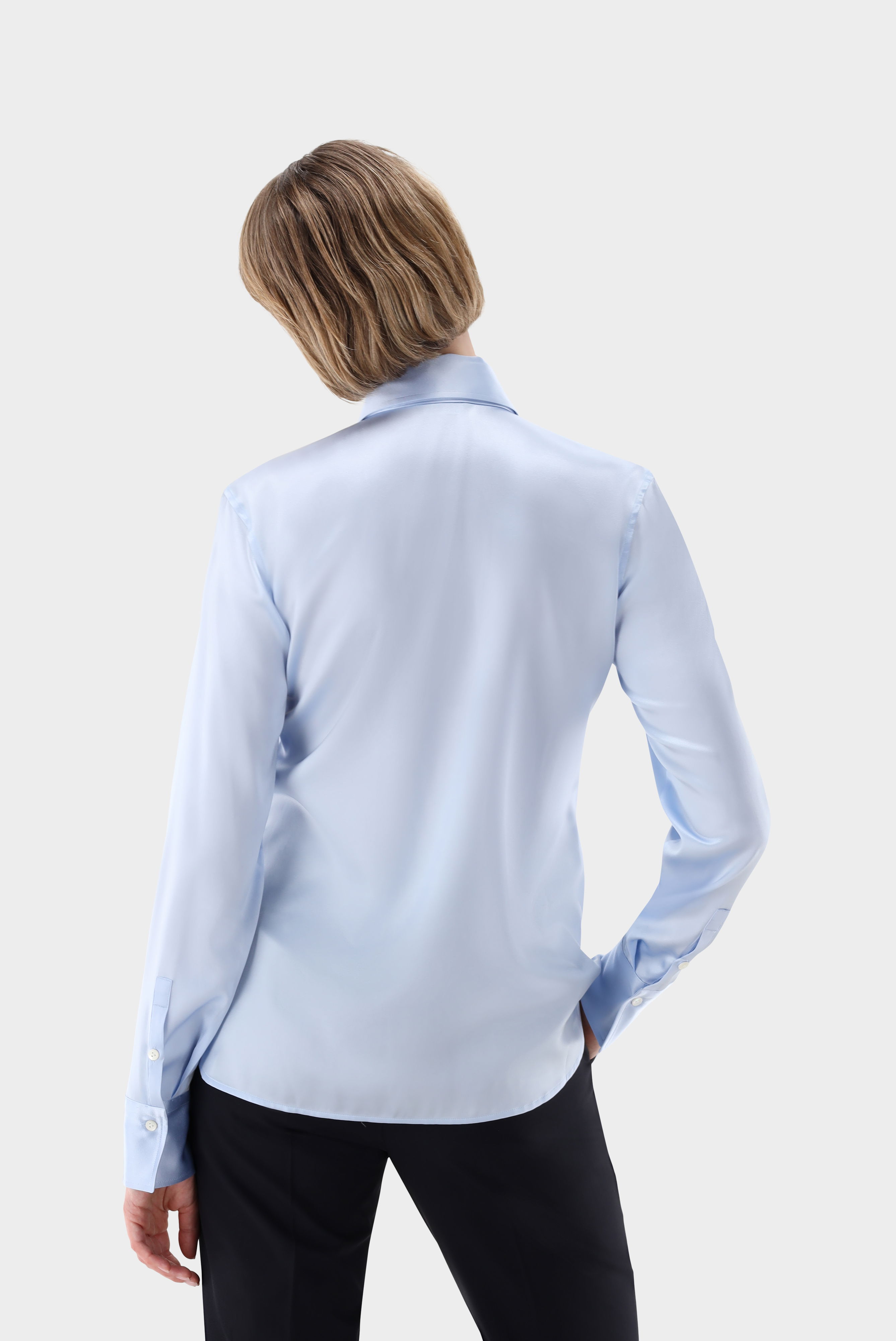 Halb taillierte Bluse mit langen Ärmeln, gefertigt aus Seiden-Stretch Satin. Diese klassische Bluse verfügt über eine selbstgebundene Schleife, die abnehmbar ist, einen figurbetonten Schnitt, Manschetten an den langen Ärmeln und einen leicht geschwungenen Saumverlauf.