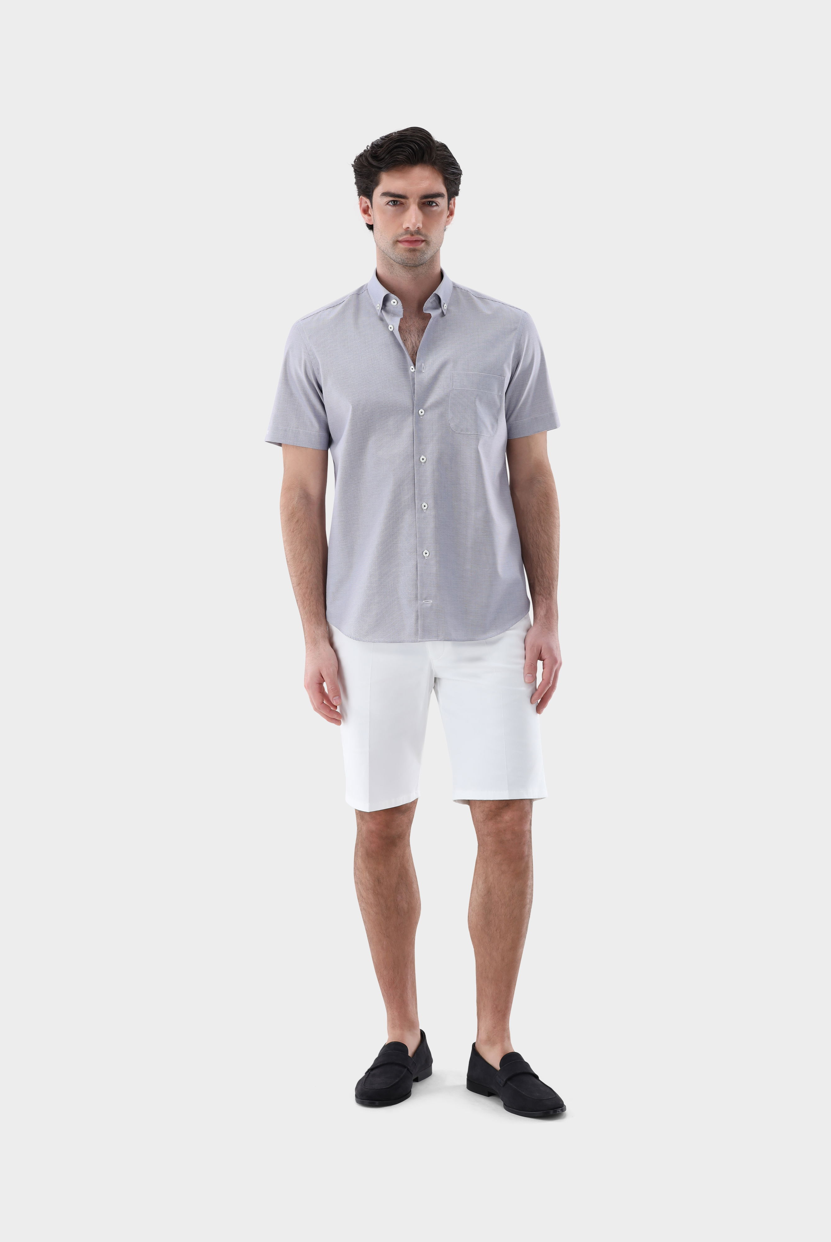 Dieses klein karierte City-Hemd aus feinem Baumwoll-Twill überzeugt mit gepflegter Optik und hohem Tragekomfort. Der Stoff ist Teil der „Perfect Look“-Kollektion und zeichnet sich dadurch aus, dass er kaum knittert und sich durch Körperwärme zusätzlich glättet – für ein dauerhaft glattes Erscheinungsbild. Die Kurzarm-Ausführung mit Button-Down-Kragen verleiht dem Modell eine sportive Note, während die aufgesetzte Brusttasche das Design funktional ergänzt. Ideal für sommerliche Business- und Smart-Casual-Looks.