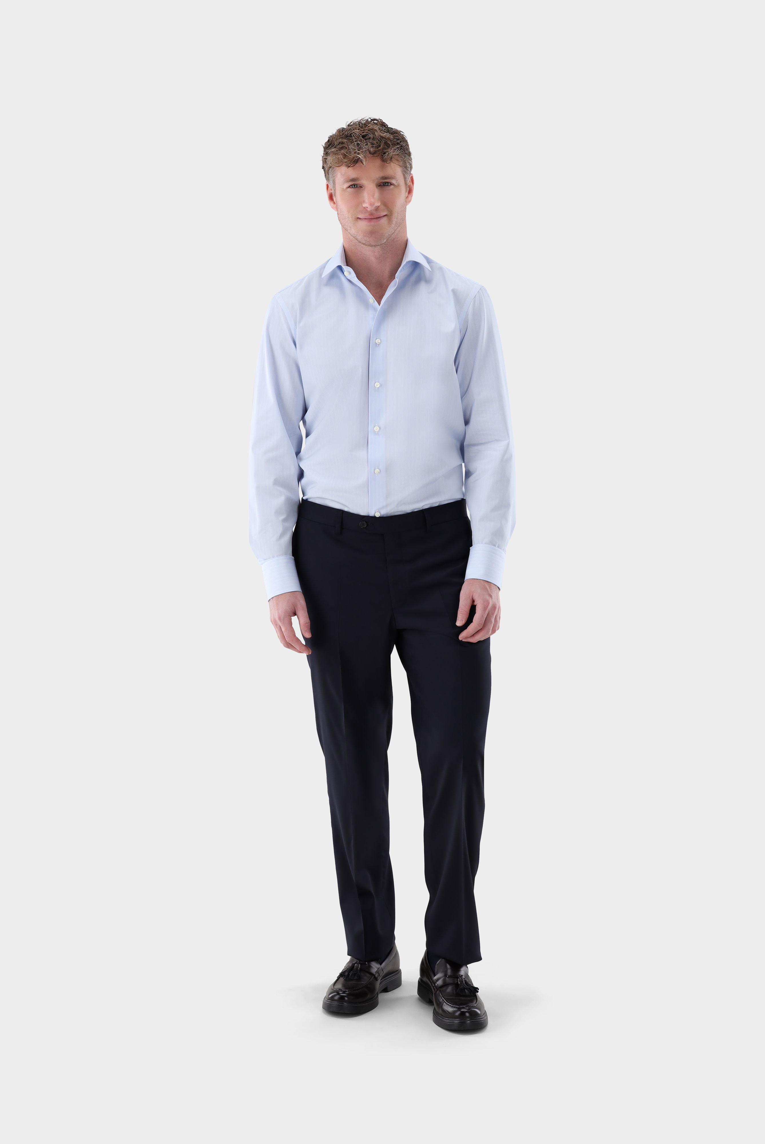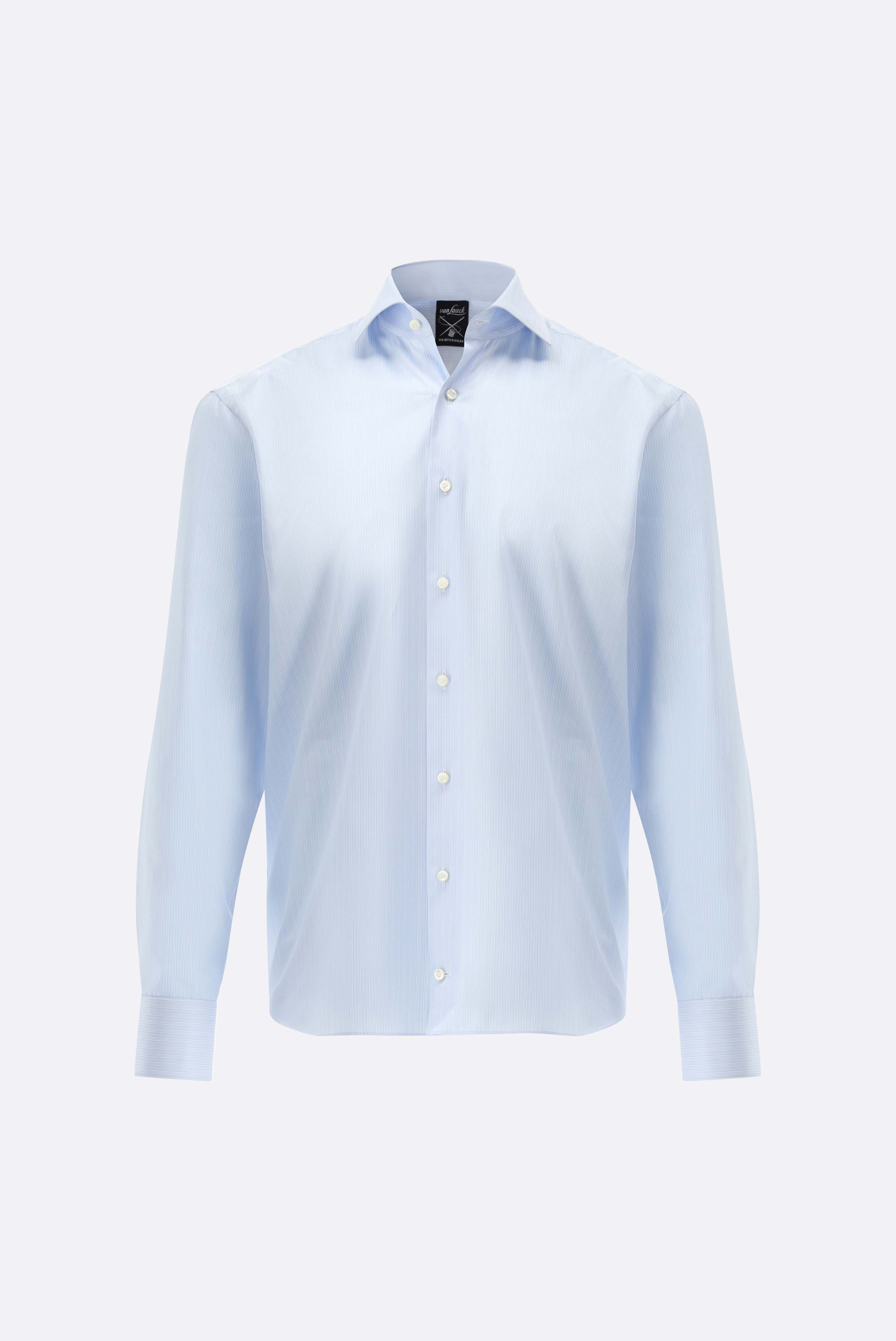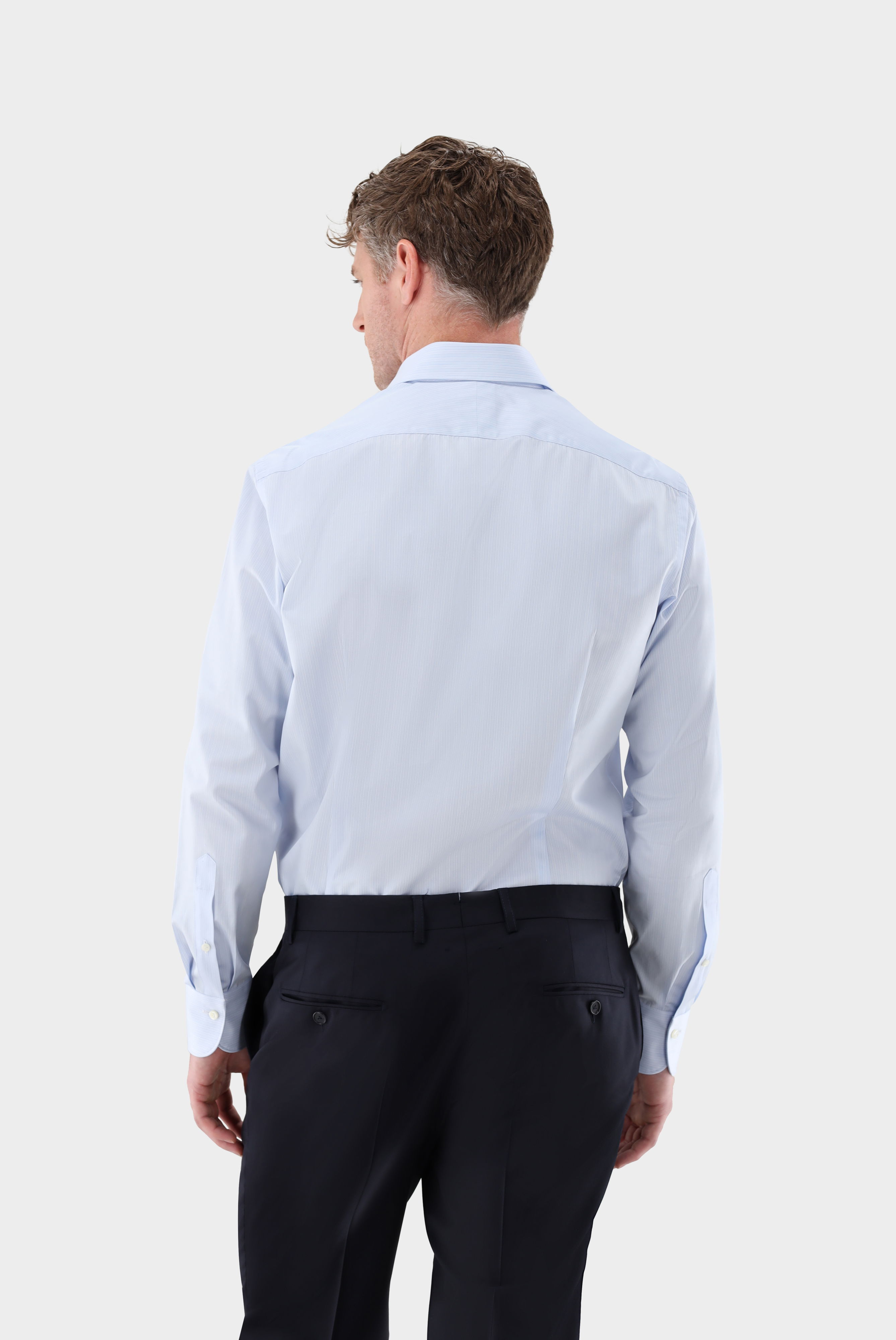 Unser luxuriöses Hemd aus Butterfly-Twill mit tonalen Streifen bietet eine maßgeschneiderte Passform für eine elegante Silhouette. Es ist aus hochwertigem Butterfly-Twill-Gewebe gefertigt, einer speziellen Art von Twill-Gewebe, das eine gewisse Textur und Struktur aufweist. Butterfly-Twill wird oft verwendet, um Hemden herzustellen, die eine glatte Oberfläche mit einem subtilen Glanz und einer angenehmen Haptik bieten. Die Sartoriale Verarbeitung zeichnet sich durch die abgerundete Meisterwerk Manschette mit einem Knopf, eine besondere geteilte Passe für erhöhten Tragekomfort, handstich Schulternähte und von Hand angenähte filigrane van Laack Beinecken aus. Das Hemd ist mit einem tonalen Streifenmuster versehen, das seine elegante Erscheinung unterstreicht.