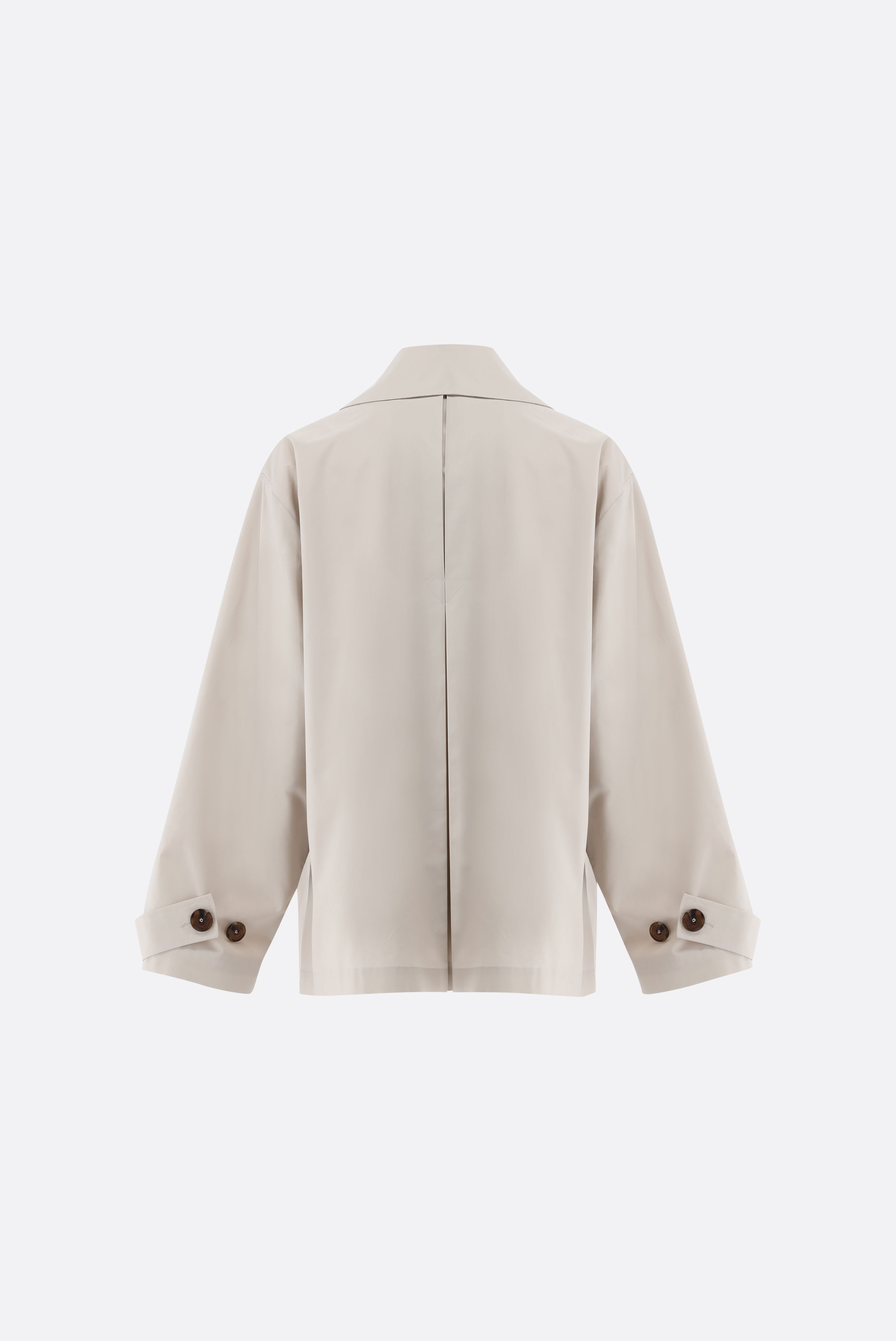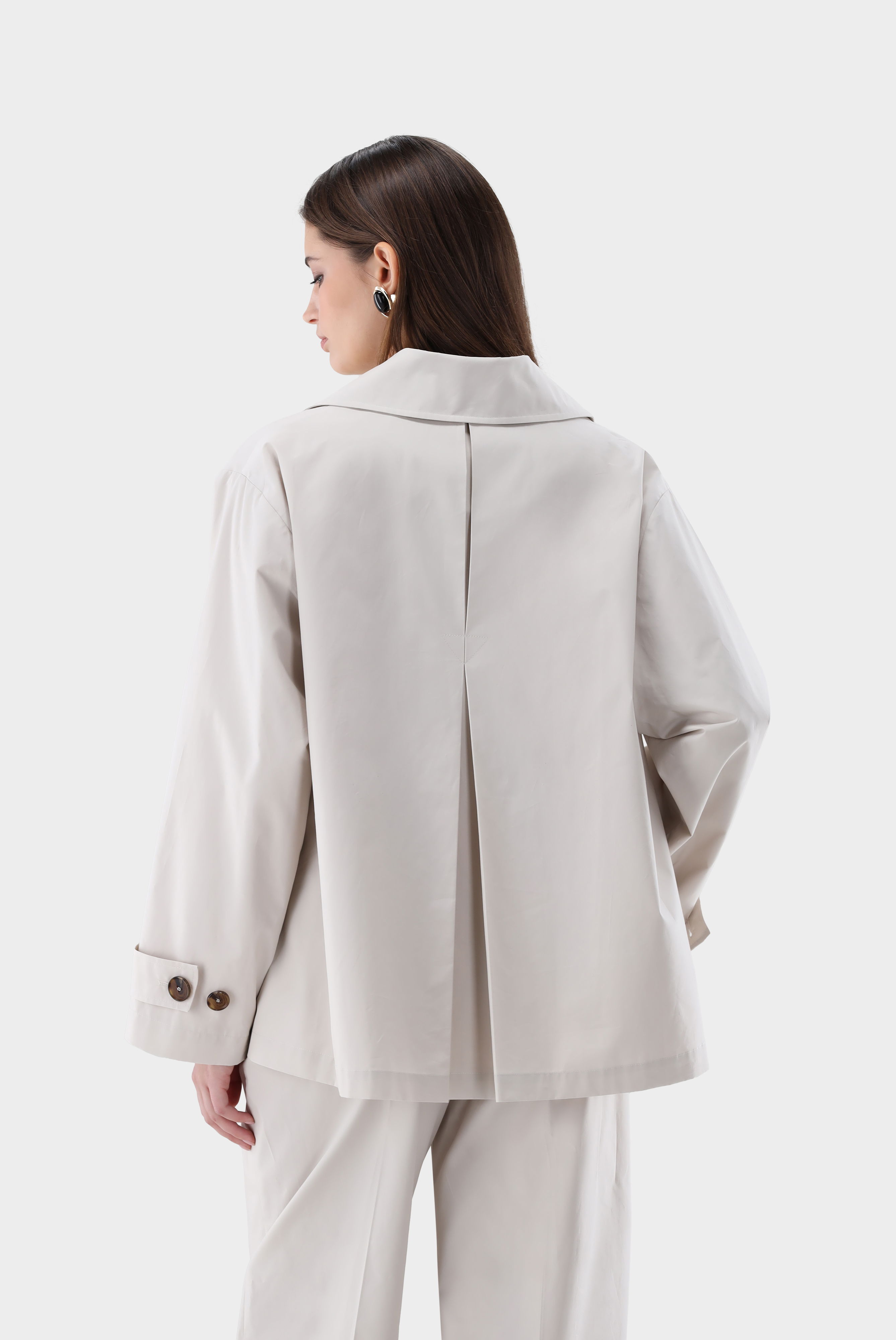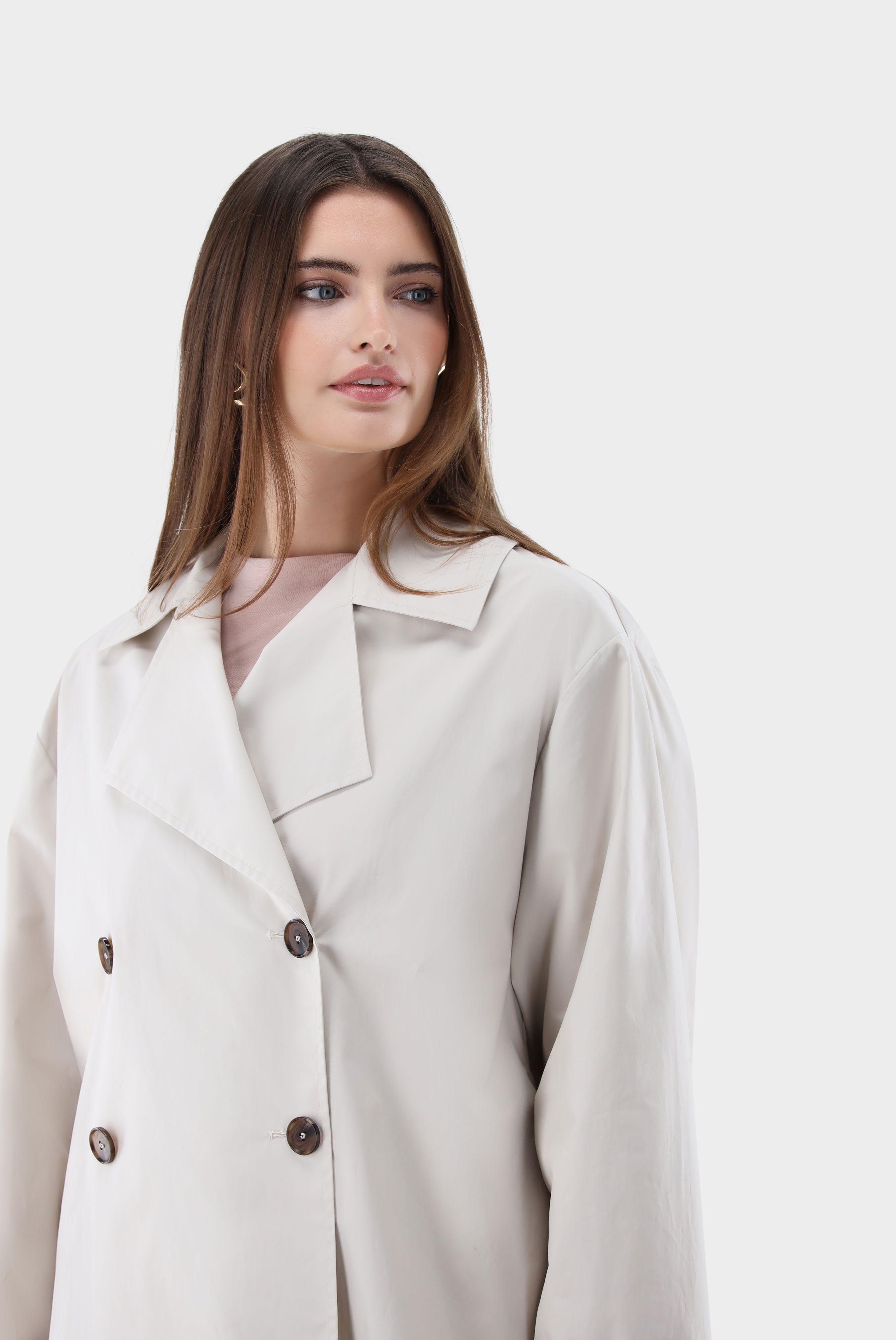 Dieser locker geschnittene Cabanmantel aus hochwertiger Baumwollpopeline überzeugt durch zeitlose Eleganz und funktionale Details. Lange Ärmel und eine doppelreihige Knopfleiste prägen den klassischen Look, während Seitentaschen praktischen Komfort bieten. Eine Kellerfalte im Rücken sorgt für Bewegungsfreiheit und eine entspannte Silhouette. Das leichte, dennoch strapazierfähige Material macht den Mantel ideal für Übergangszeiten und verleiht ihm eine gepflegte, moderne Ausstrahlung für vielseitige Alltags- und Business-Looks.