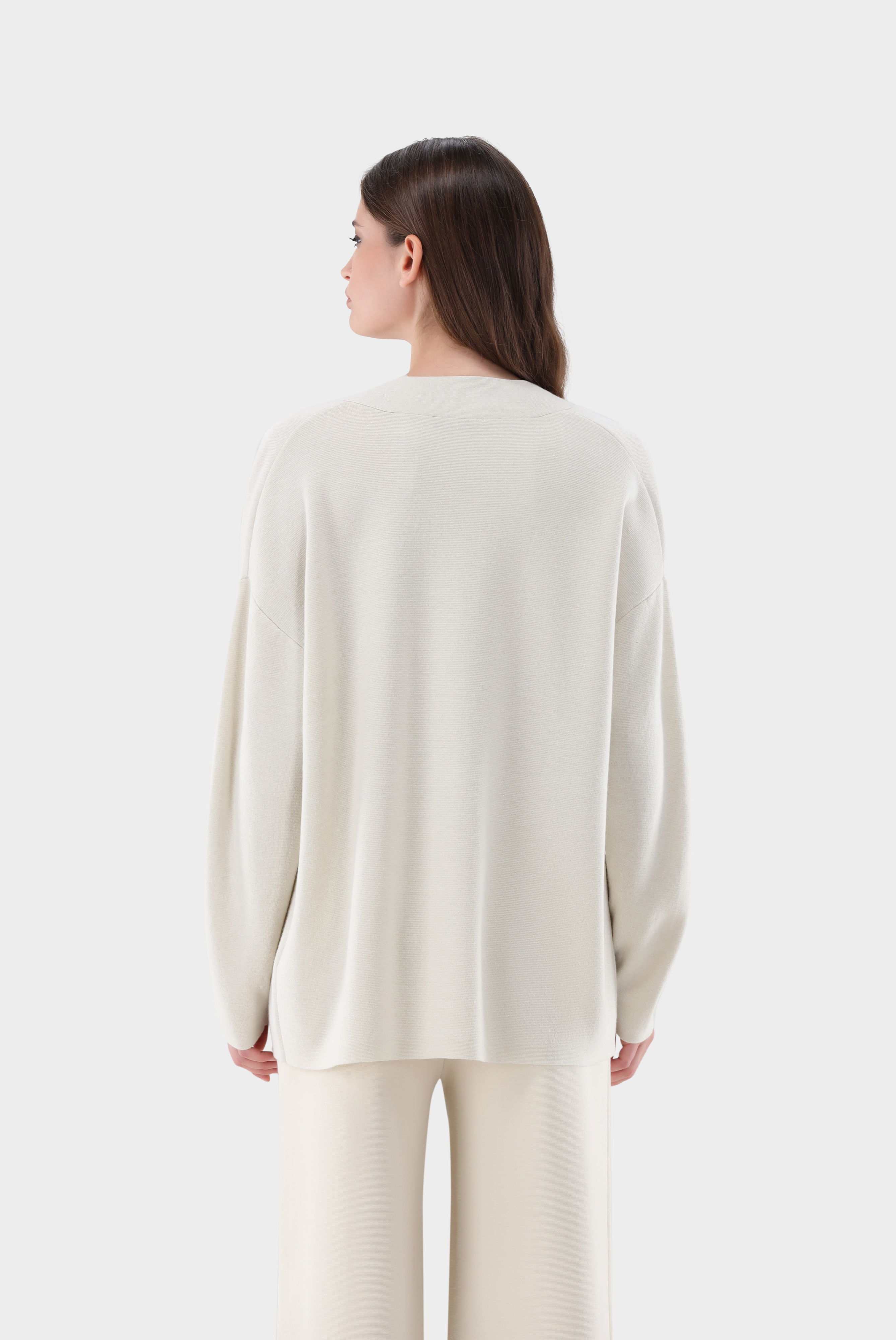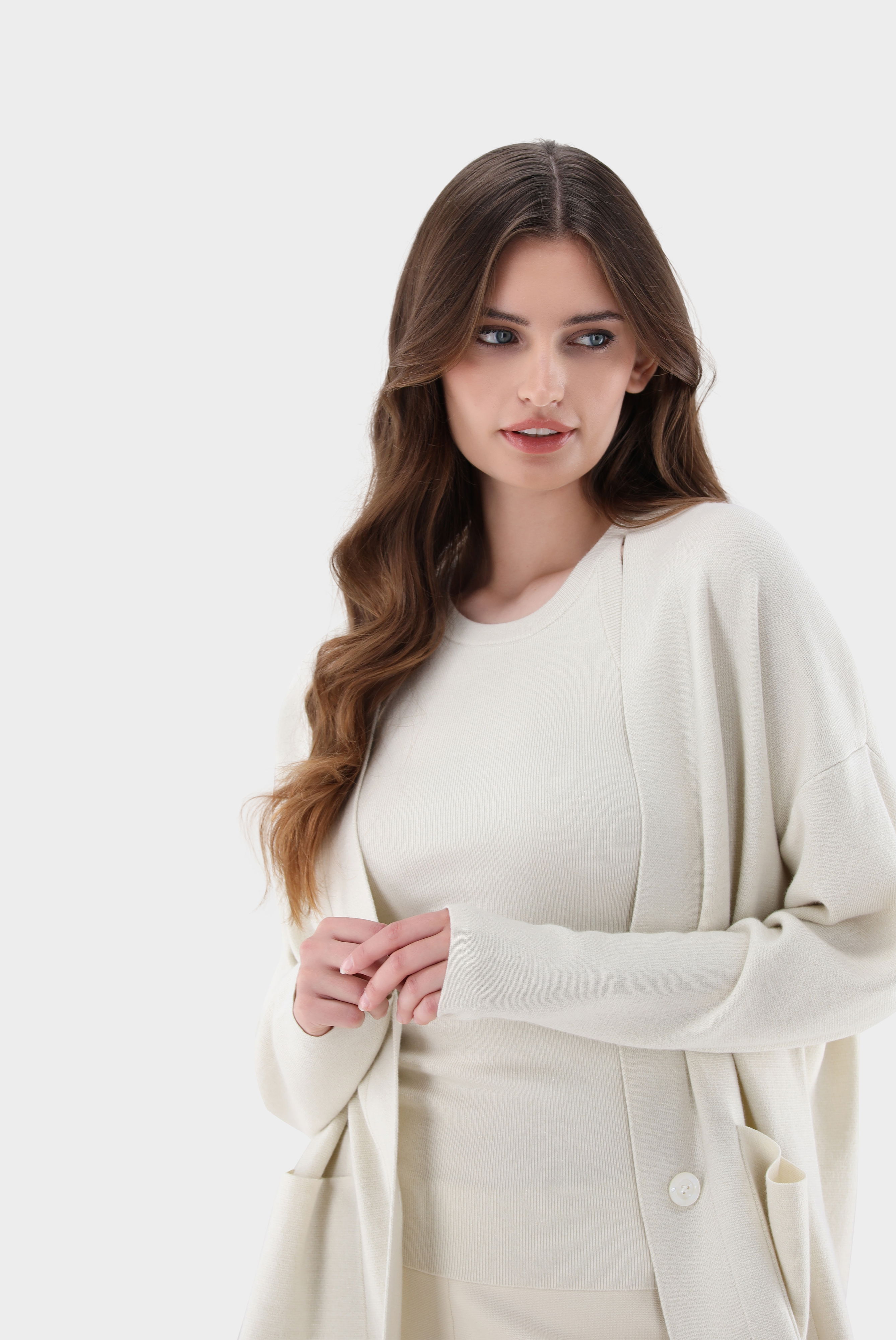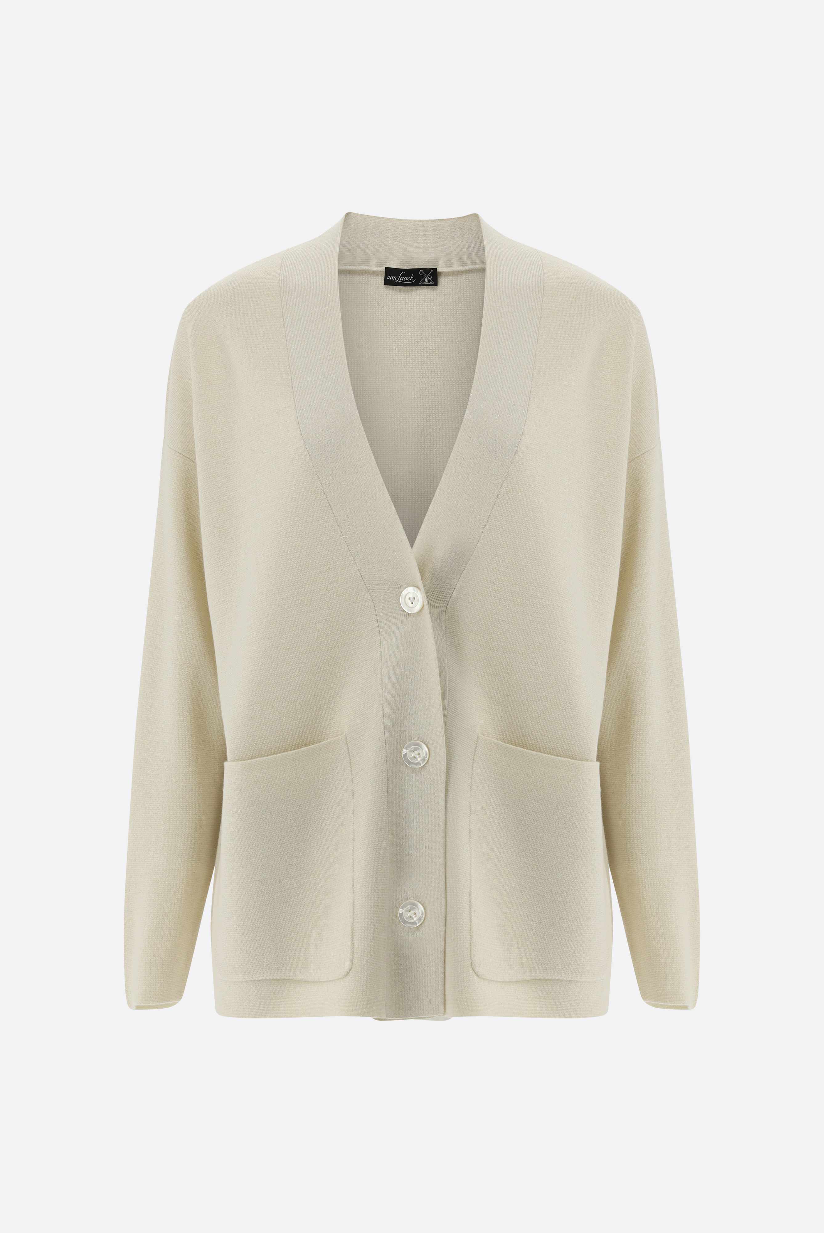 Oversize Cardigan mit V-Ausschnitt mit Merino und Lame. Die Strickjacke verfügt über lange Ärmel und überschnittene Schultern, sowie zwei aufgesetzte Taschen für einen lässigen Alltags-Look. Er eignet sich ideal für kühle Sommer Abende und kühle Tage im Frühjahr. Der Cardigan lässt sich ideal mit dem Tanktop SAPHIA in der gleichen Qualität kombinieren.