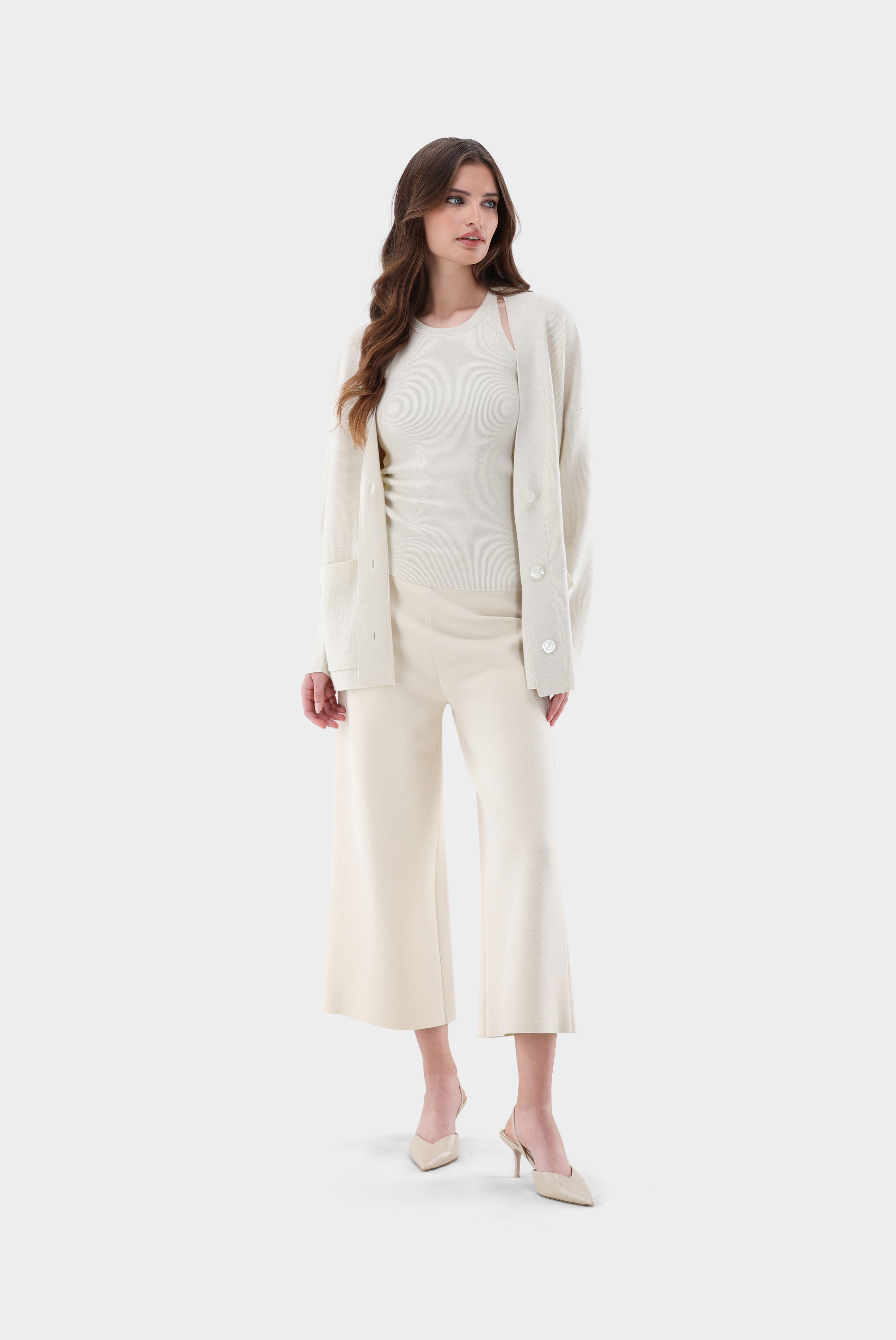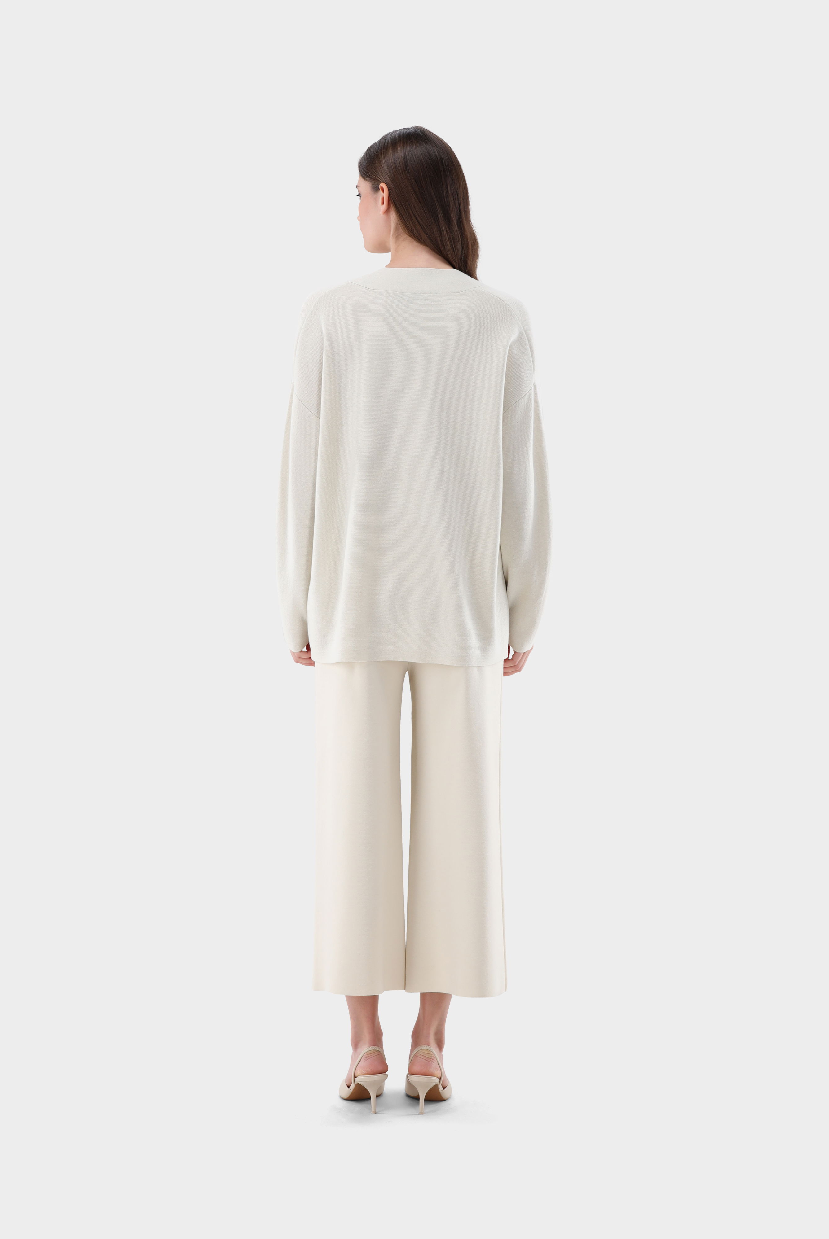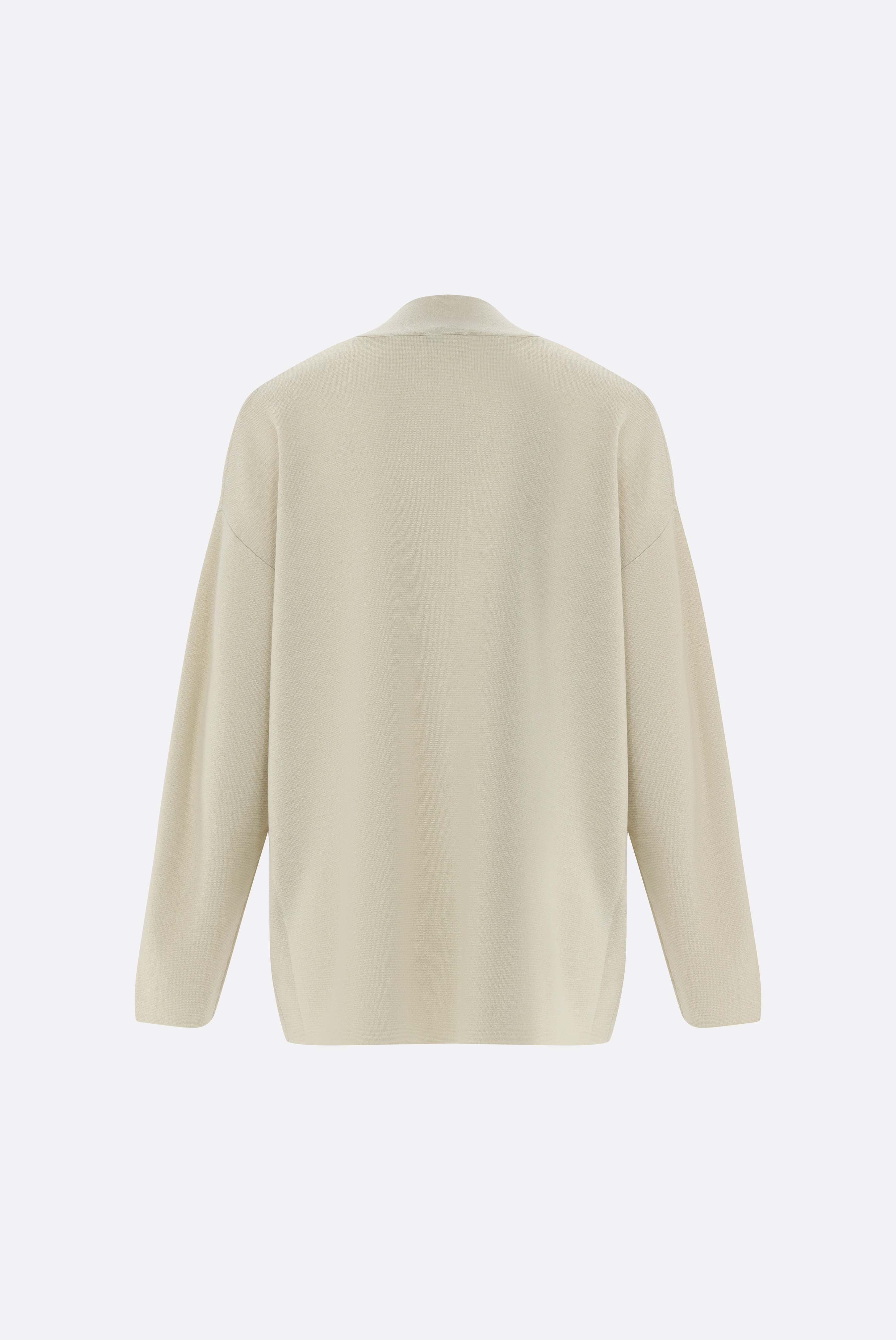 Oversize Cardigan mit V-Ausschnitt mit Merino und Lame. Die Strickjacke verfügt über lange Ärmel und überschnittene Schultern, sowie zwei aufgesetzte Taschen für einen lässigen Alltags-Look. Er eignet sich ideal für kühle Sommer Abende und kühle Tage im Frühjahr. Der Cardigan lässt sich ideal mit dem Tanktop SAPHIA in der gleichen Qualität kombinieren.