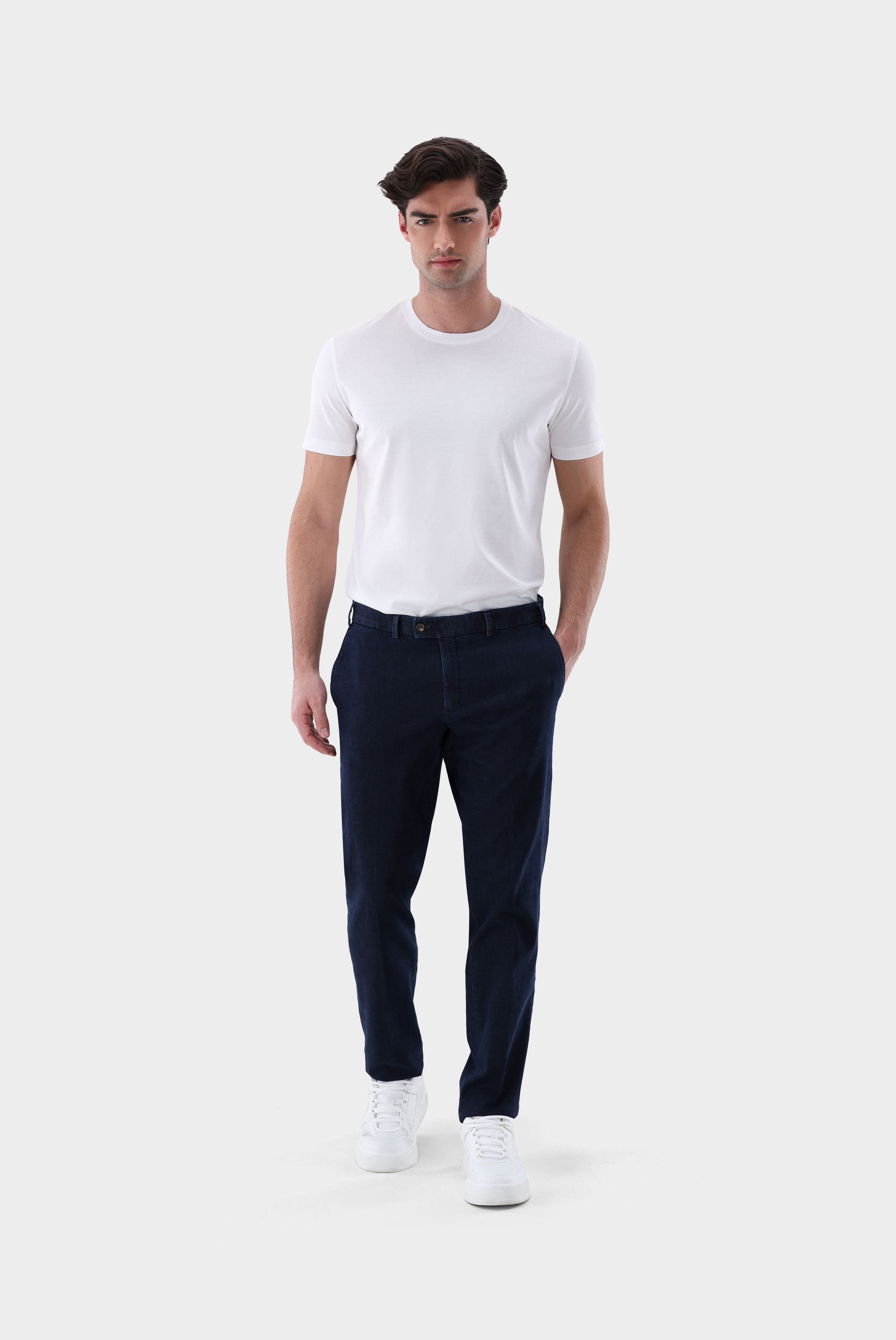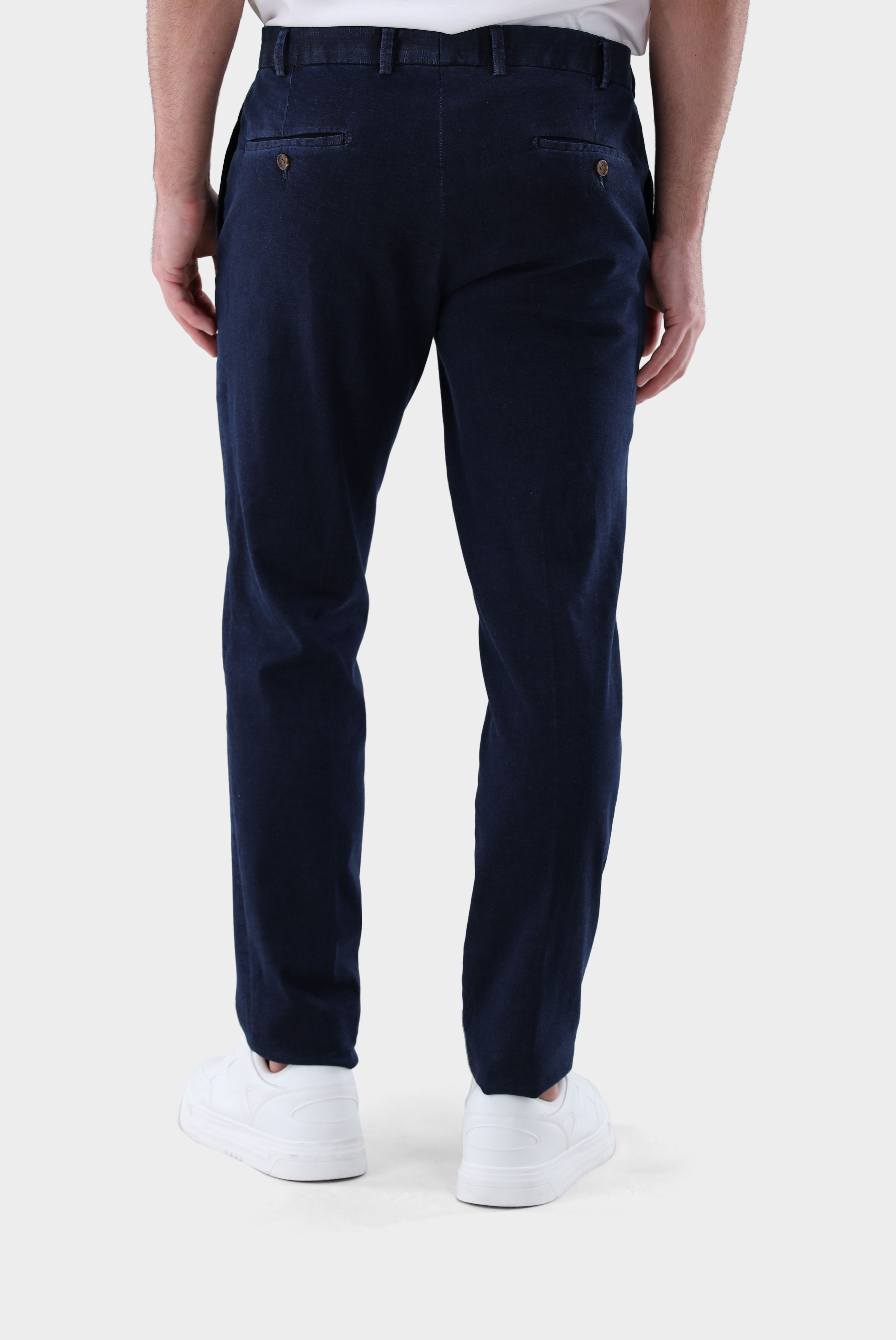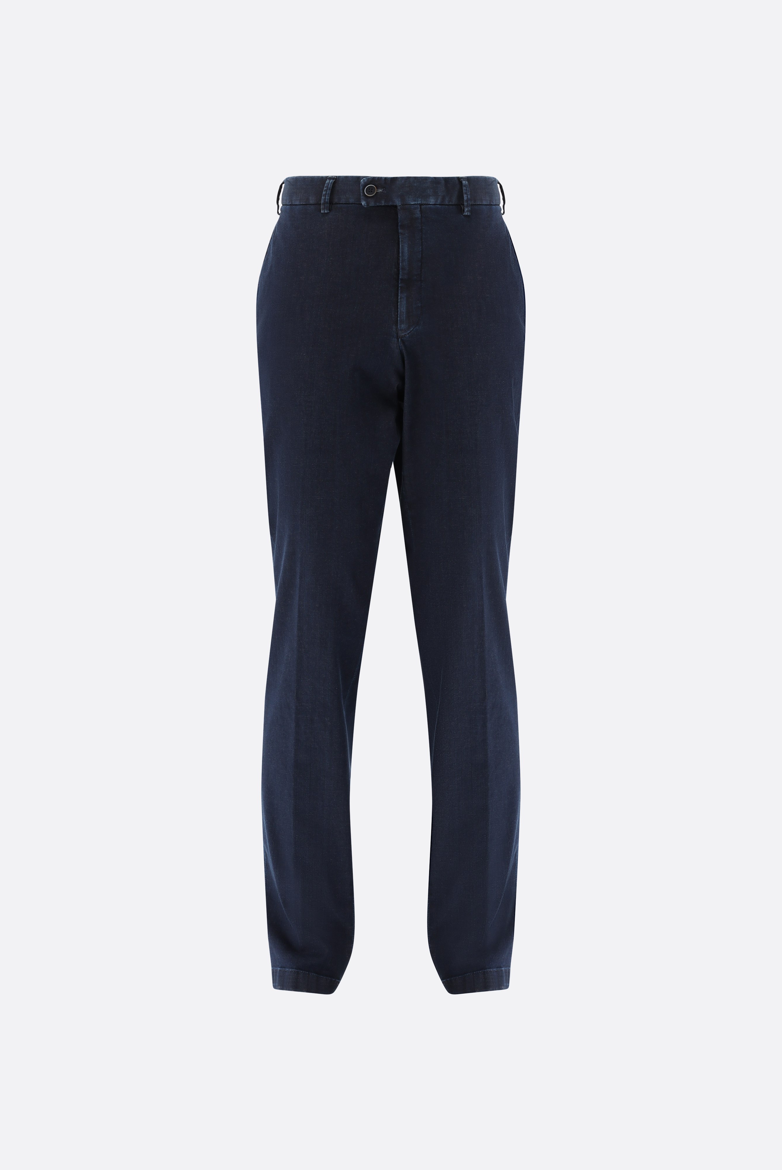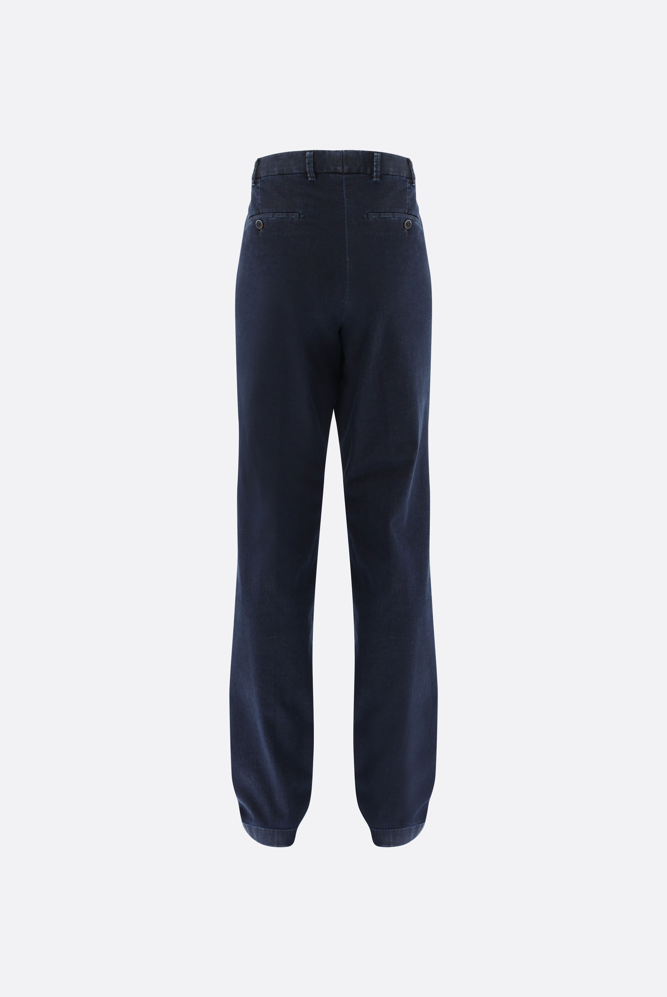 Entdecken Sie unsere zeitlose Chinohose mit hochwertiger Bundverarbeitung und Bügelfalte. Diese Hose verfügt über eine klassische Hosenschlitzverarbeitung mit 3-Loch Knopfverschluss, schräge Eingriffstaschen und beidseitige Paspeltaschen mit Knopfverschluss in der Hinterhose. Die Chino wird aus einem Material mit Denim optik gefertigt und erhält so einen leicht gewaschenen Look.
