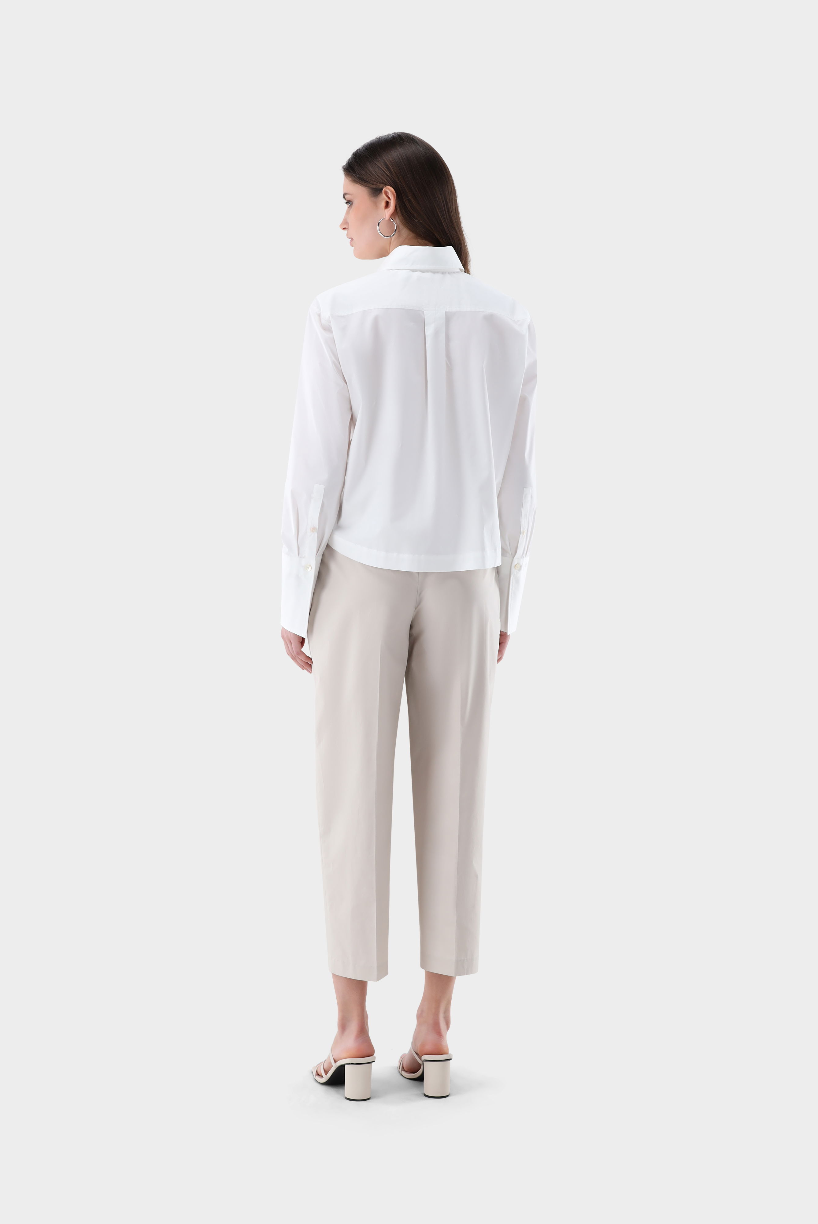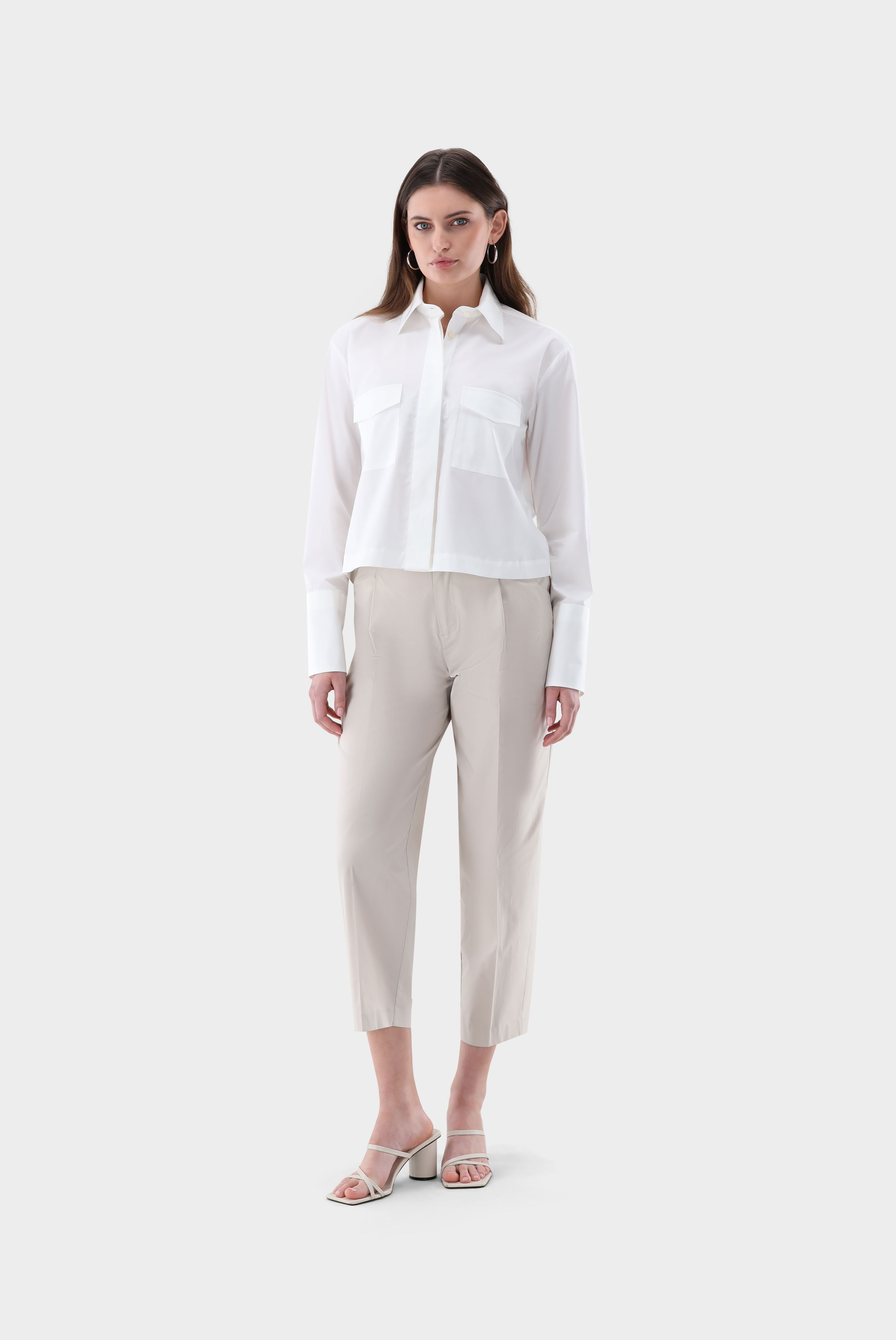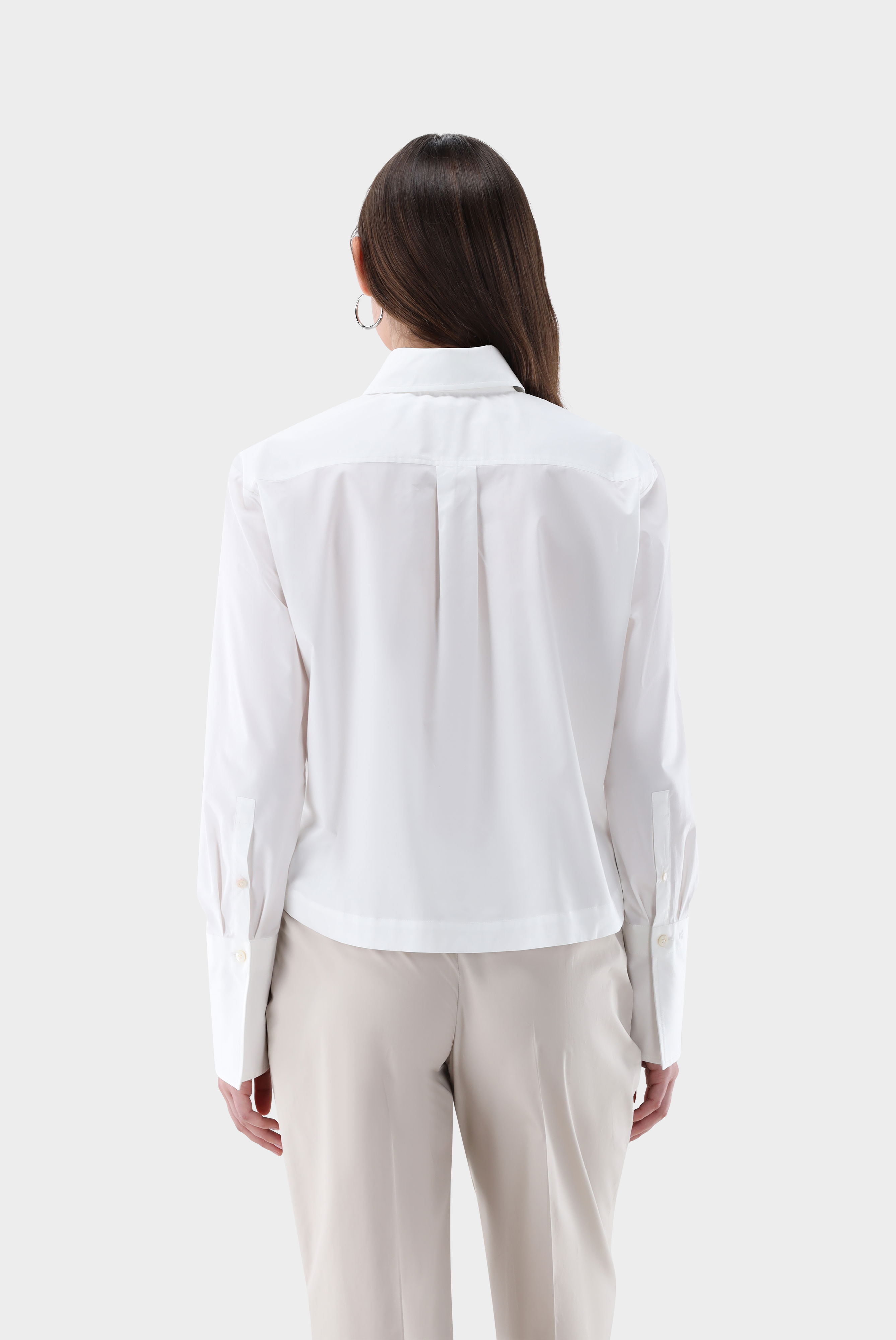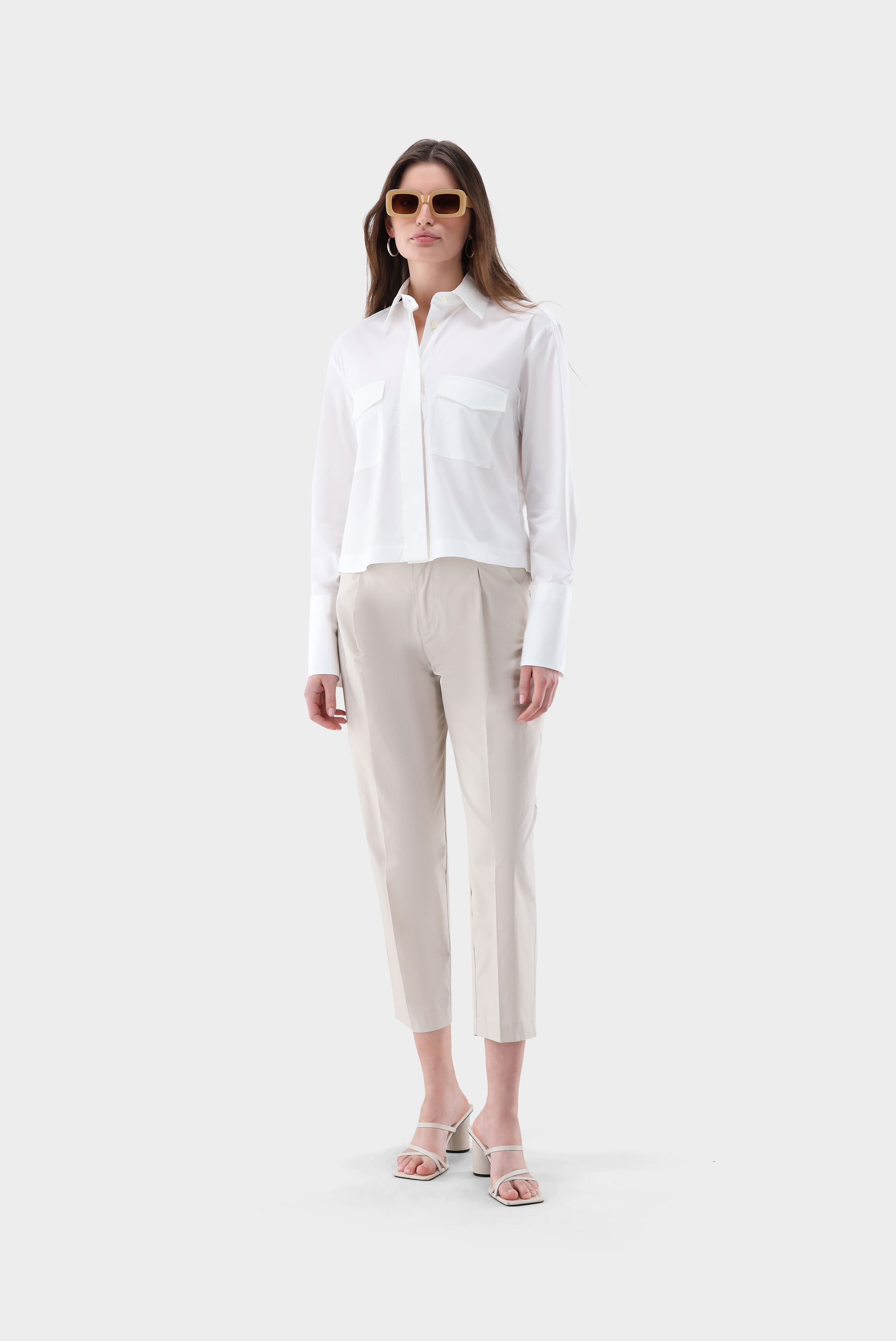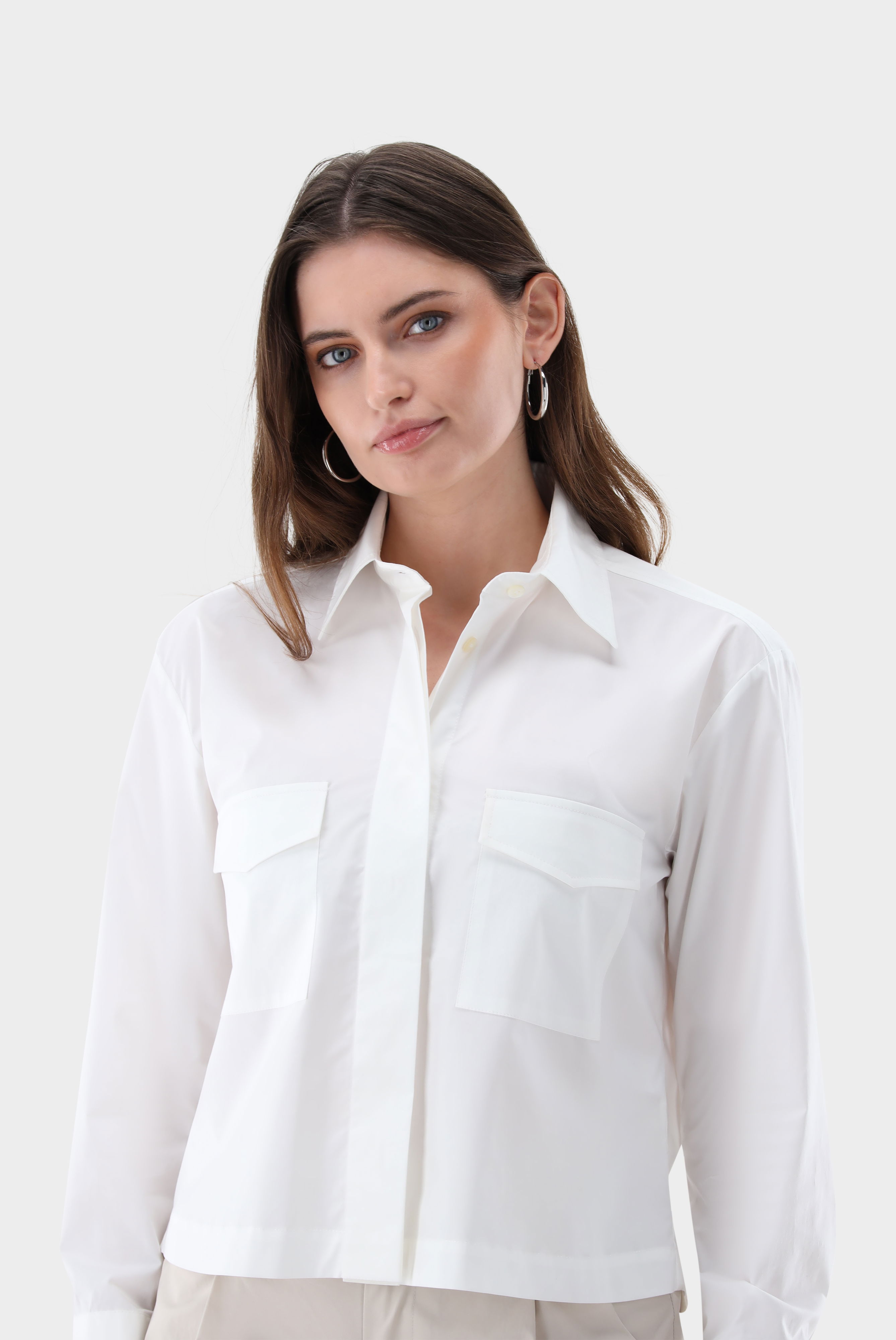 Diese verkürzt geschnittene Bluse mit langen Ärmeln vereint moderne Klarheit mit funktionalen Details. Die verdeckte Knopfleiste unterstreicht die puristische Optik, während zwei Brusttaschen einen dezent sportiven Akzent setzen. Eine Rückenpasse mit Kellerfalte sorgt für angenehme Bewegungsfreiheit. Gefertigt aus einer hochwertigen Baumwoll-Stretch-Mischung in Paper-Touch-Popeline überzeugt das Modell durch eine glatte Oberfläche, leichten Griff und hohen Tragekomfort.