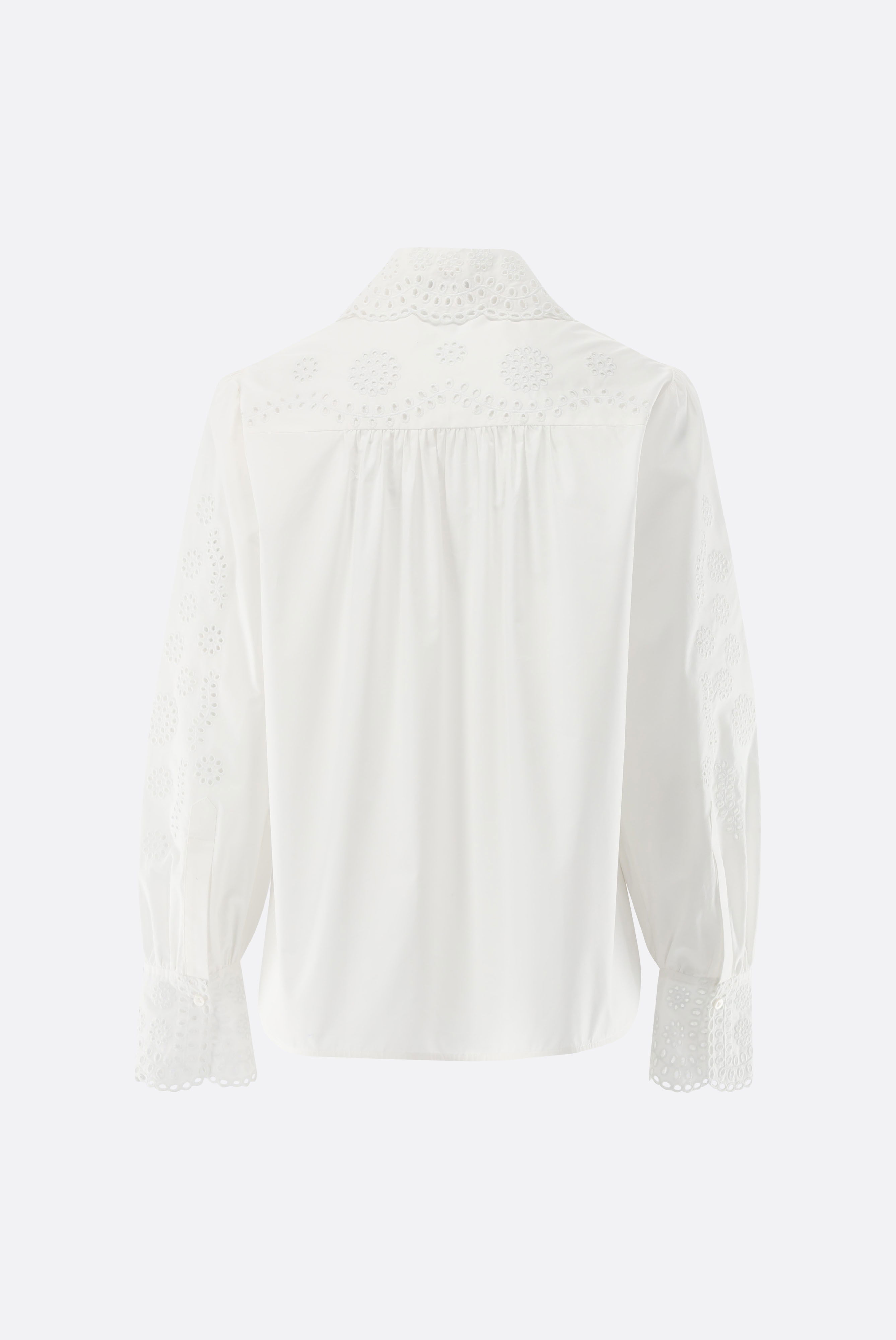 Diese moderne Hemdbluse in boxy Fit und cropped Länge verbindet klare Linien mit femininen Details. Lange Puffärmel, eine geraffte Rückenpasse und ein geschwungener Saum mit feiner Lochstickerei verleihen dem Design Struktur und Leichtigkeit. Auch Kragen und Manschetten sind kunstvoll bestickt und unterstreichen die hochwertige Verarbeitung. Aus glatter Baumwollpopeline gefertigt, eignet sich die Bluse ideal für trendbewusste, vielseitige Looks mit modischem Anspruch.