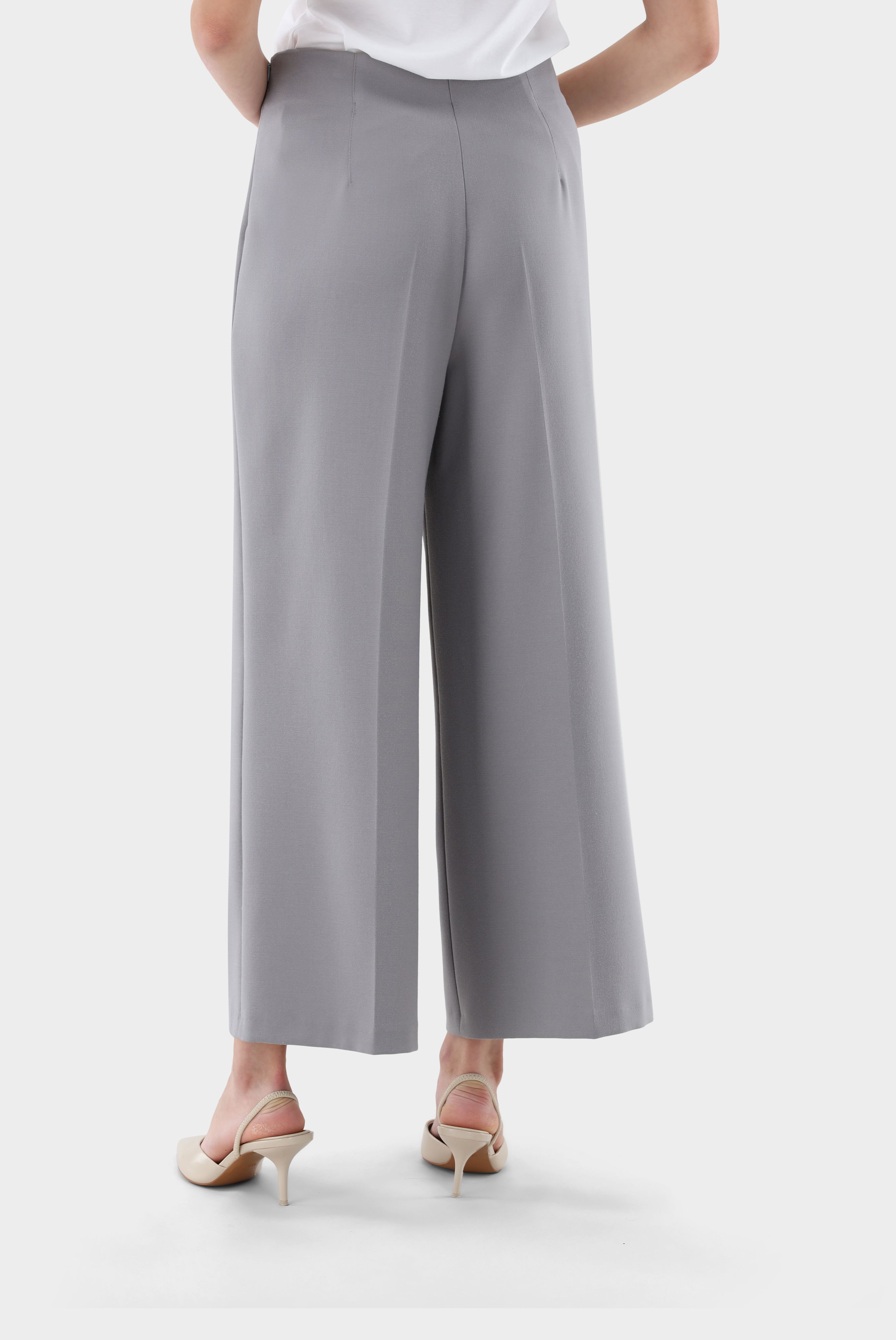 Unsere Culotte Hose mit hoher Leibhöhe und Bügelfalte kombiniert modernen Stil mit bequemem Tragekomfort. Der Reißverschluss in der Seitennaht sorgt für eine glatte Silhouette und eine einfache Handhabung. Ideal für verschiedene Anlässe, ob geschäftlich oder lässig.