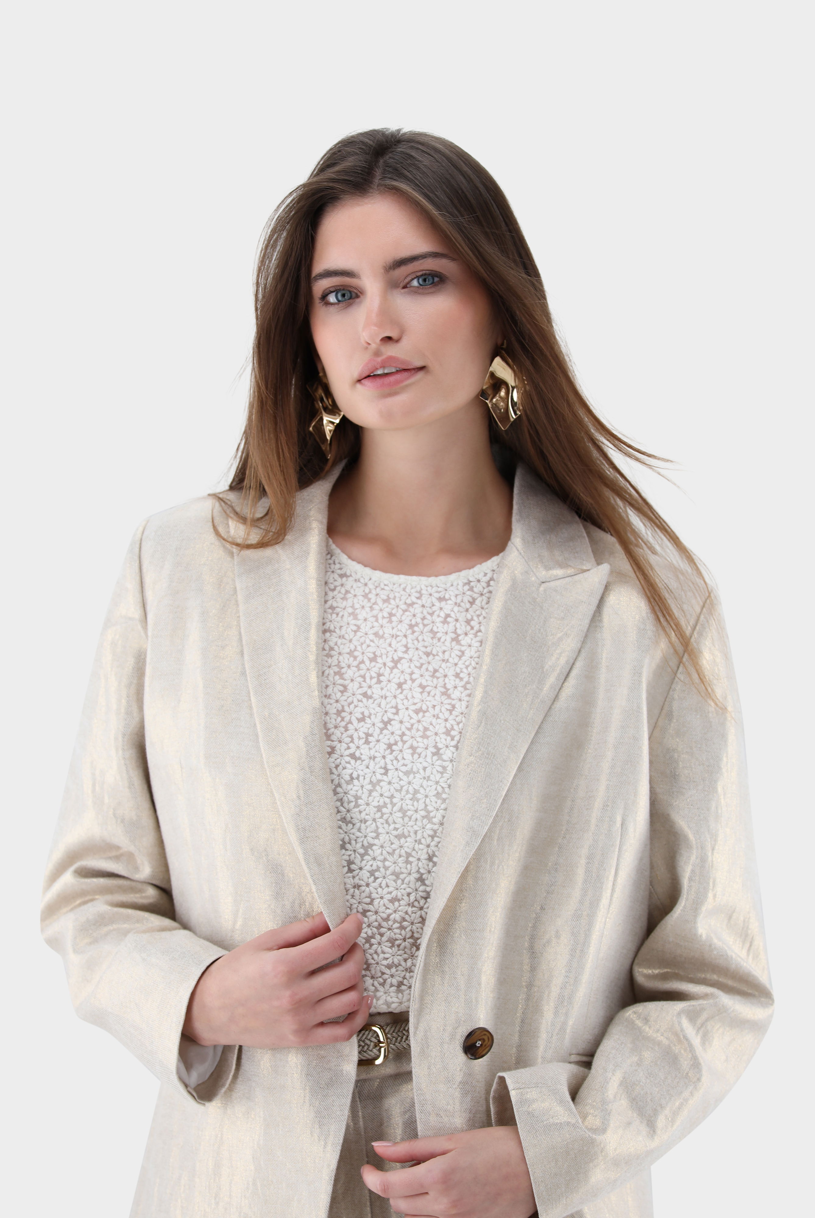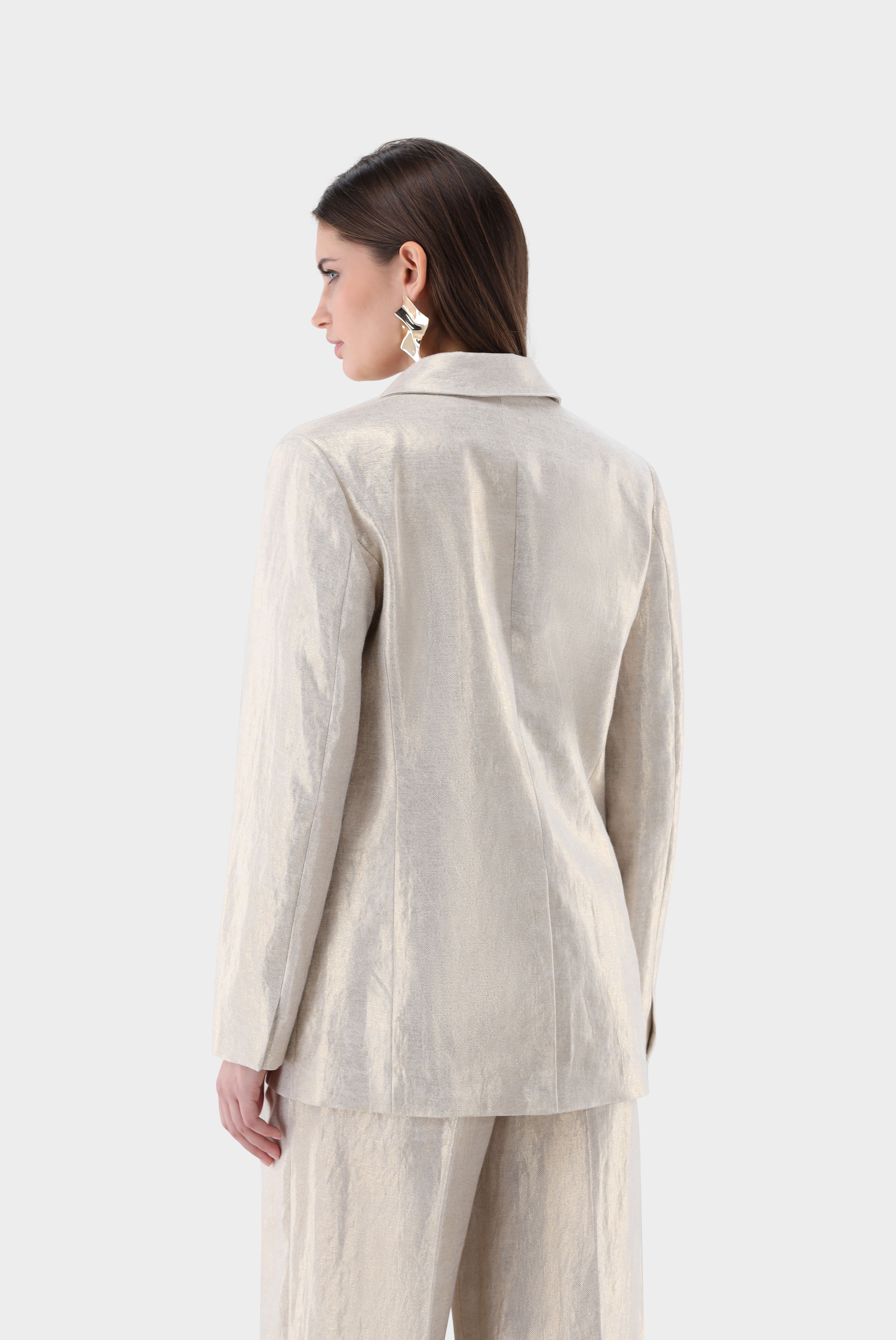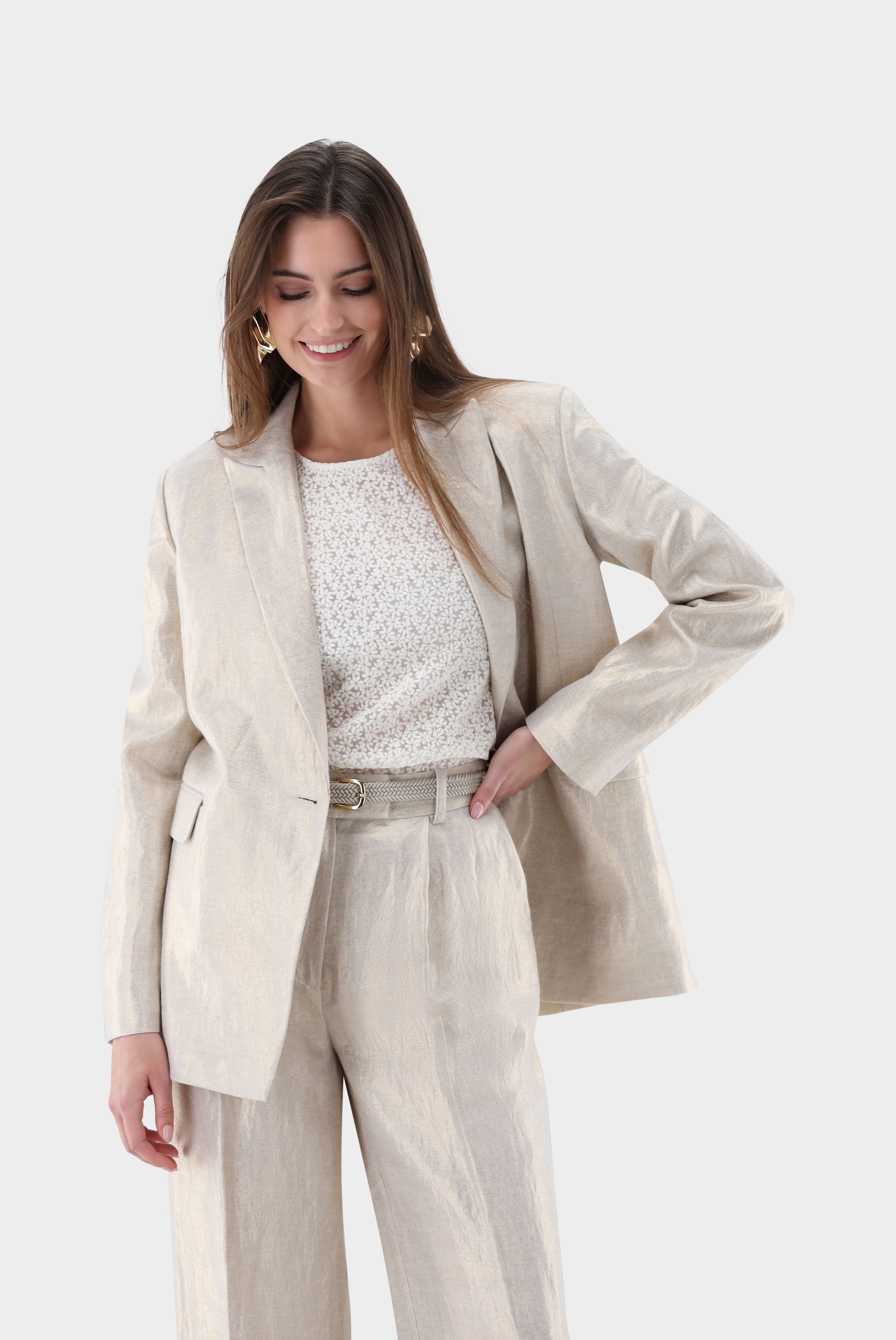 Dieser leicht taillierte, einreihige Blazer überzeugt durch eine elegante Silhouette und hochwertige Verarbeitung. Das fallende Revers und die langen Ärmel betonen den klassischen Stil, während der Rückenschlitz Bewegungsfreiheit bietet. Zwei seitliche Pattentaschen ergänzen das Design funktional, die vollständige Fütterung sorgt für angenehmen Tragekomfort. Gefertigt aus strukturiertem Leinen-Lurex-Twill mit dezentem Schimmer lässt sich der Blazer perfekt mit der passenden Hose HALIRA-XX zu einem harmonischen Total Look kombinieren.