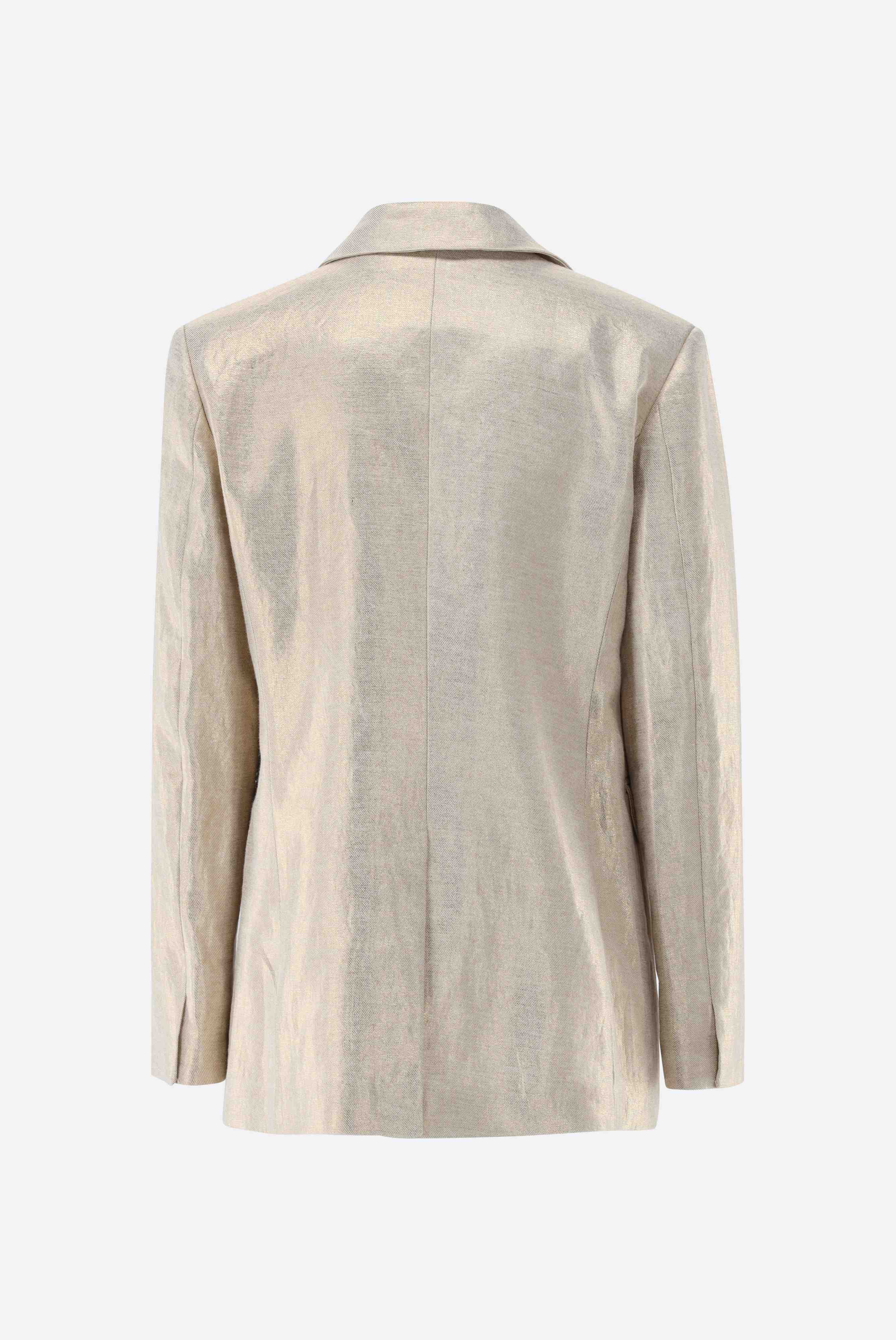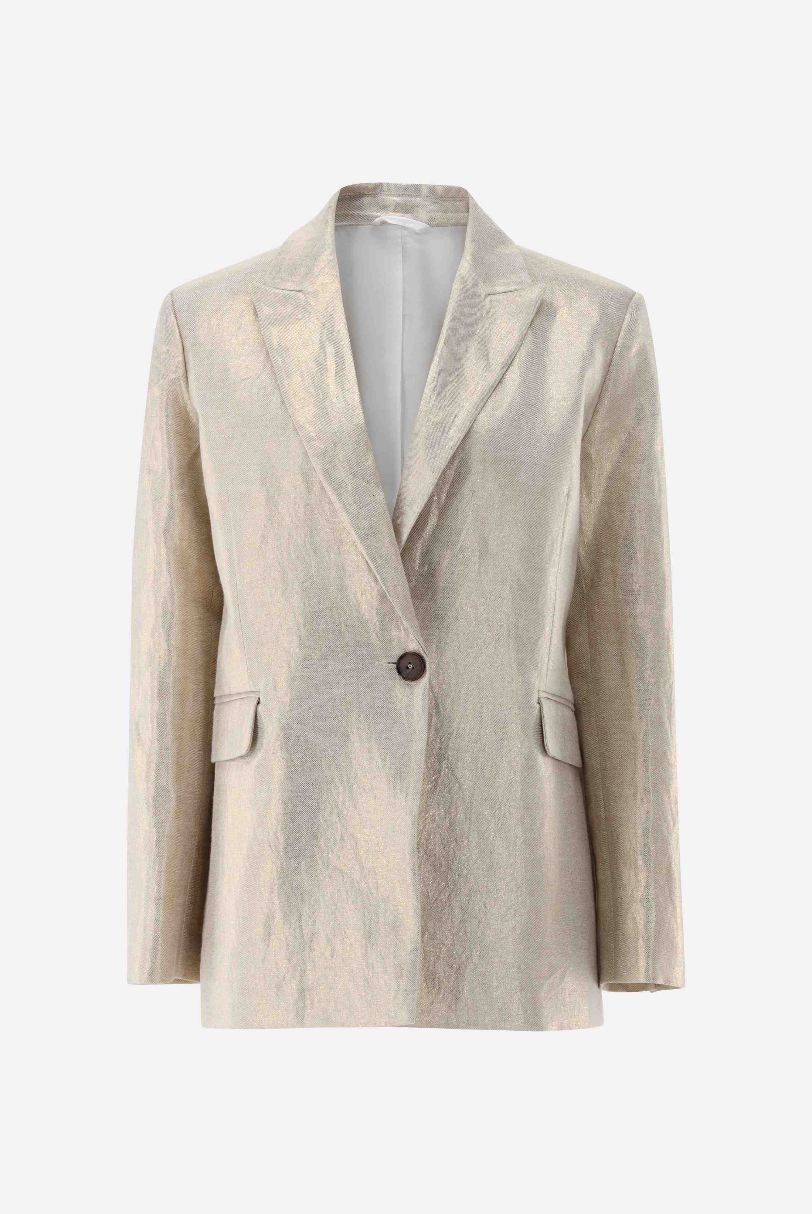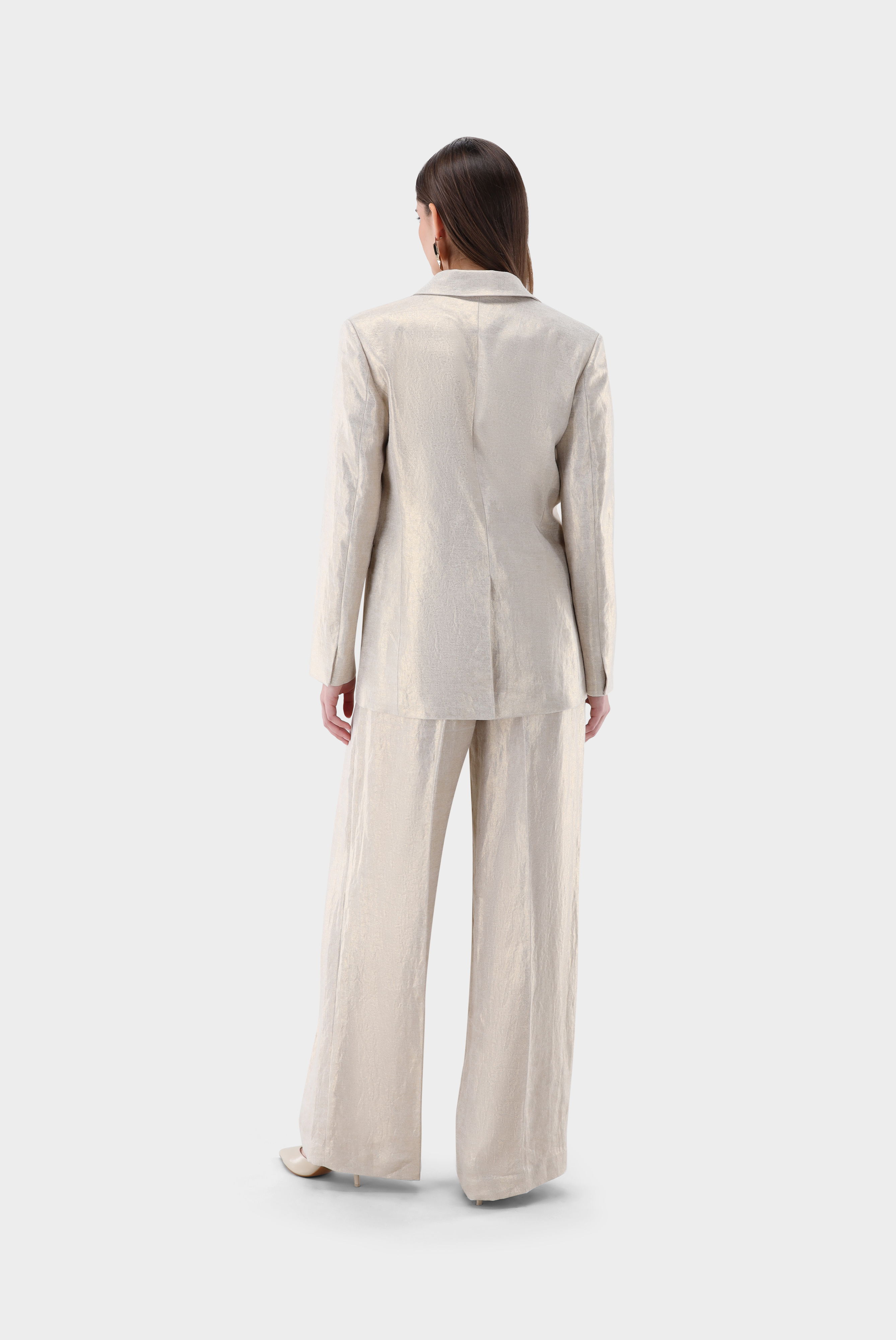 Dieser leicht taillierte, einreihige Blazer überzeugt durch eine elegante Silhouette und hochwertige Verarbeitung. Das fallende Revers und die langen Ärmel betonen den klassischen Stil, während der Rückenschlitz Bewegungsfreiheit bietet. Zwei seitliche Pattentaschen ergänzen das Design funktional, die vollständige Fütterung sorgt für angenehmen Tragekomfort. Gefertigt aus strukturiertem Leinen-Lurex-Twill mit dezentem Schimmer lässt sich der Blazer perfekt mit der passenden Hose HALIRA-XX zu einem harmonischen Total Look kombinieren.