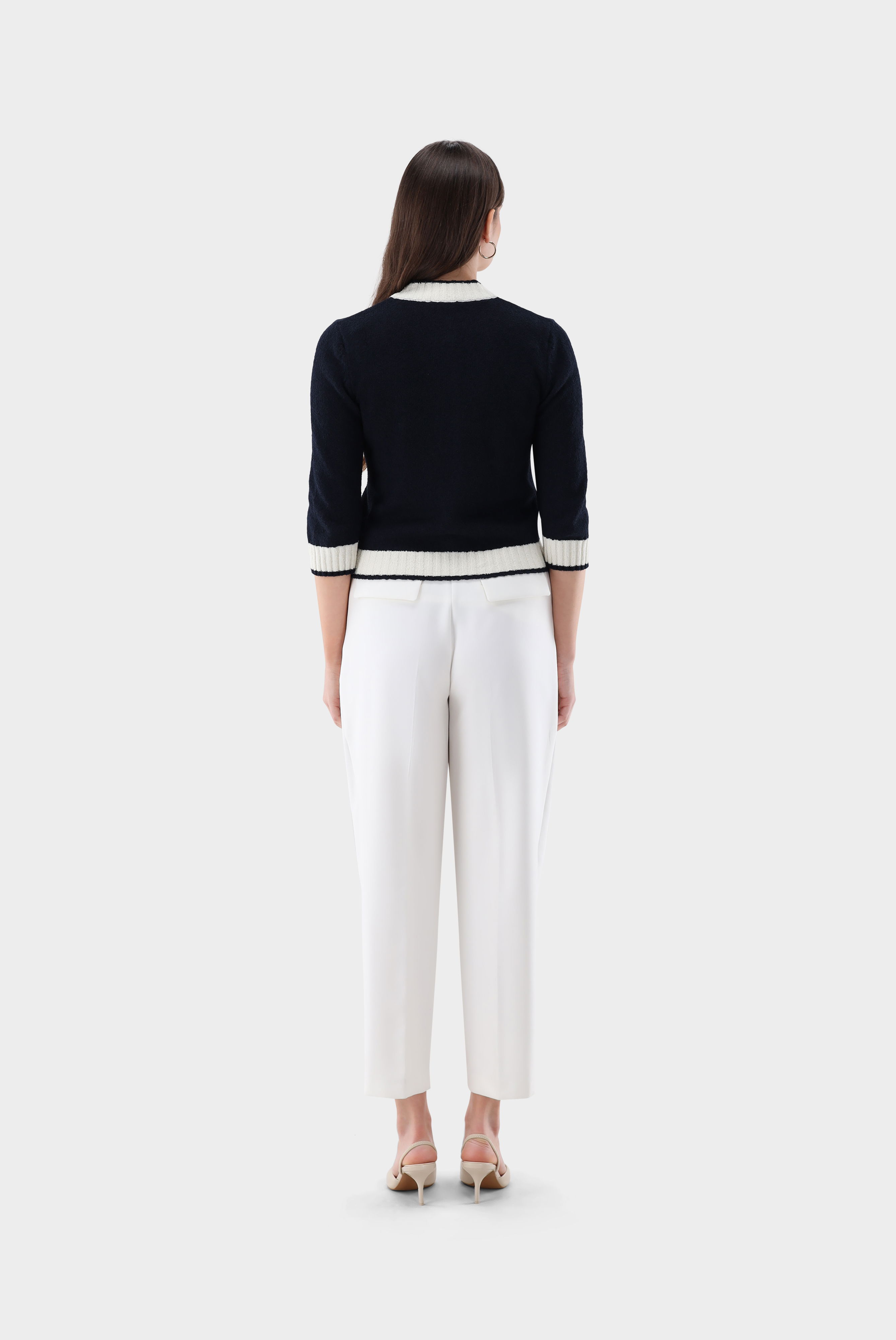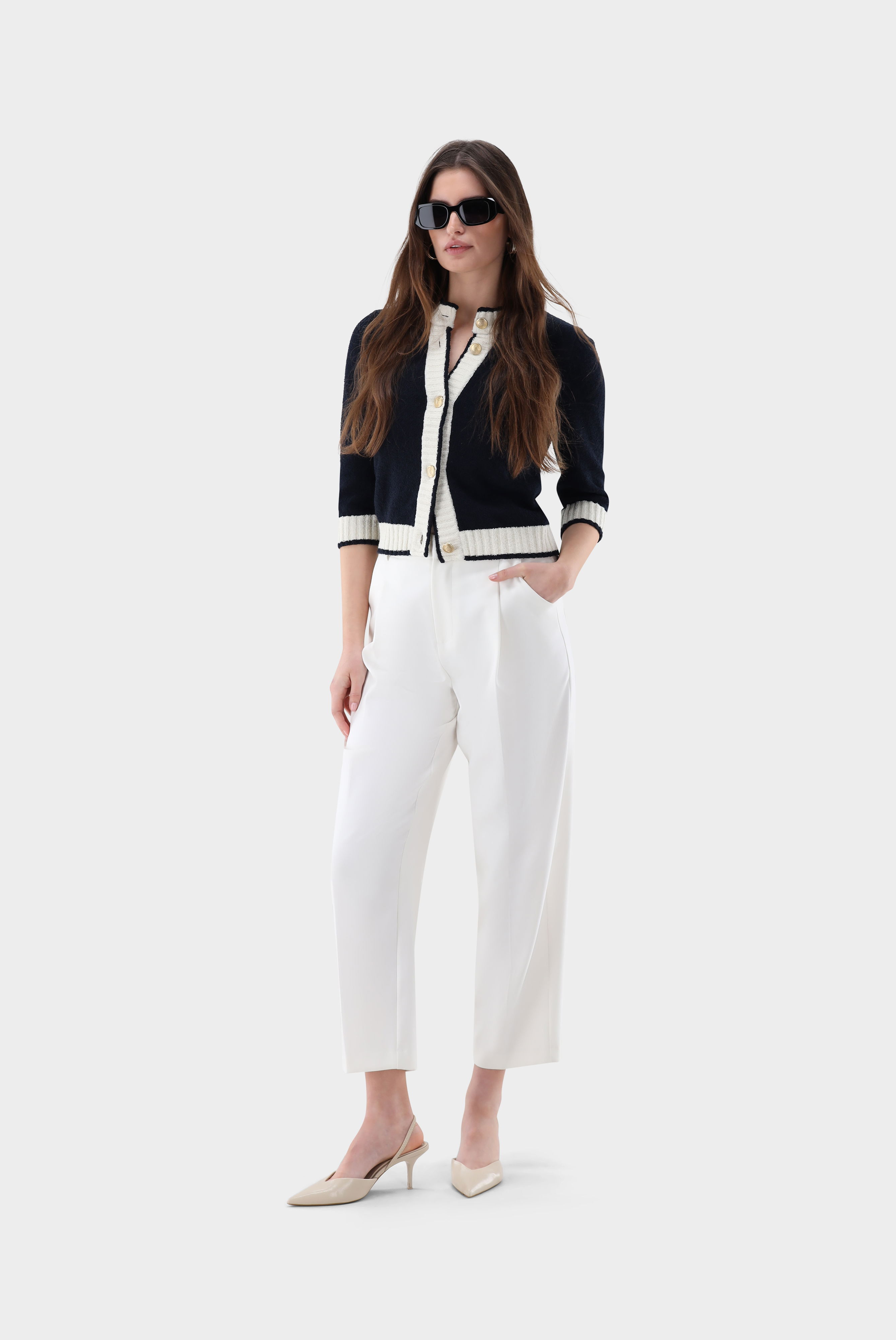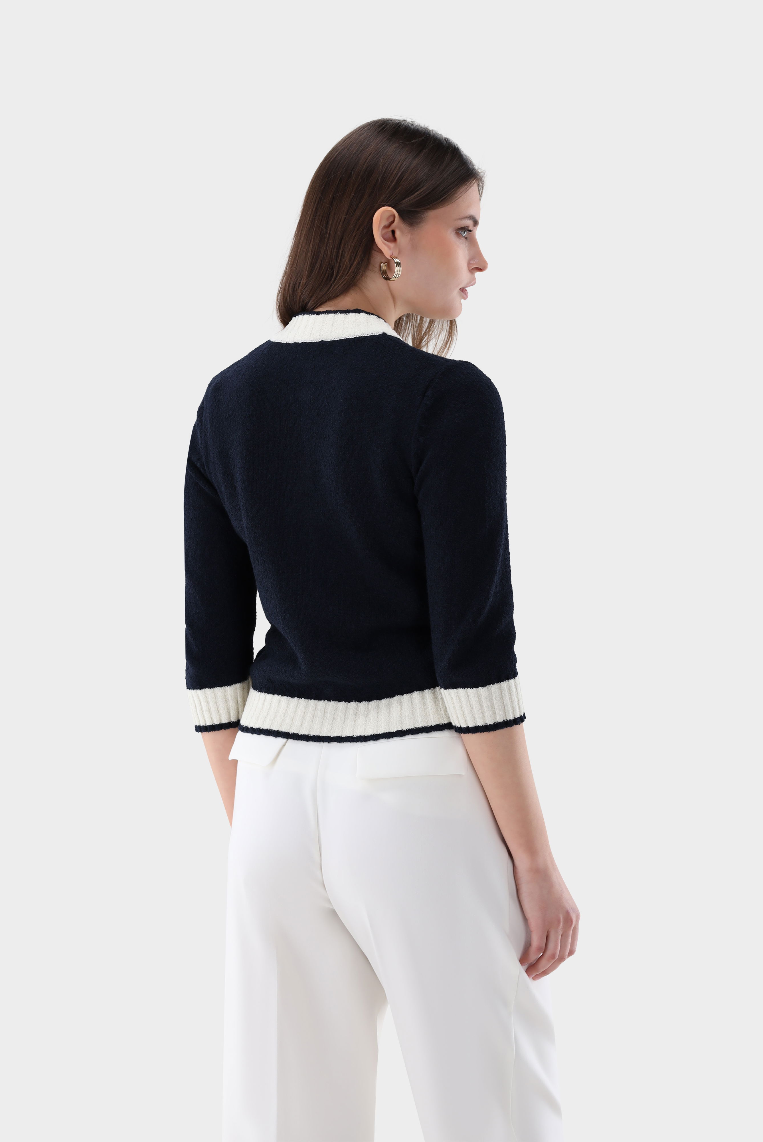 Diese leicht taillierte Strickjacke mit 2/3 Armlänge überzeugt durch ihre elegante Silhouette und moderne Details. Der Stehkragen verleiht dem Modell eine stilvolle Note, während kontrastierende Akzente das Design raffiniert unterstreichen. Die strukturierte Bouclé-Strickqualität sorgt für eine besondere Optik und angenehmen Tragekomfort. Goldfarbene Knöpfe setzen edle Highlights und runden den hochwertigen Look ab – ideal für feminine Casual- und Smart-Casual-Kombinationen.