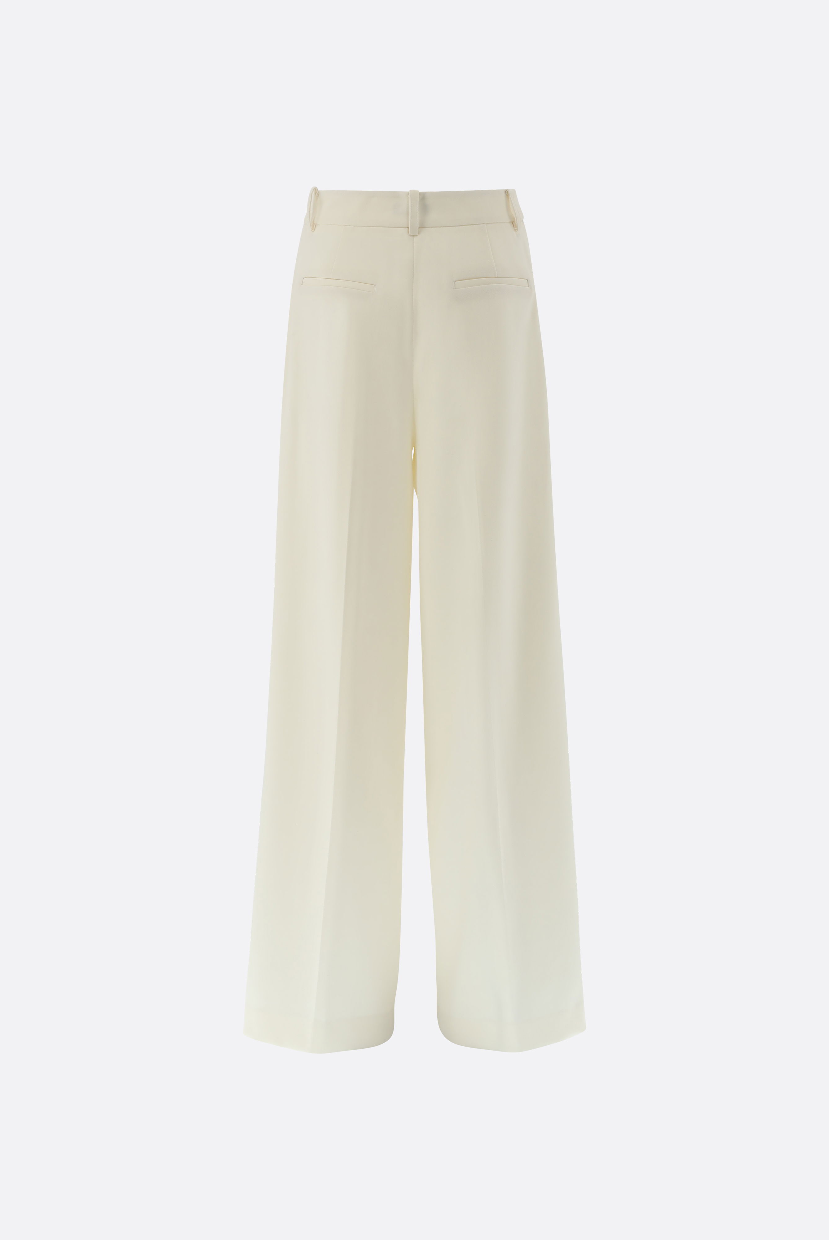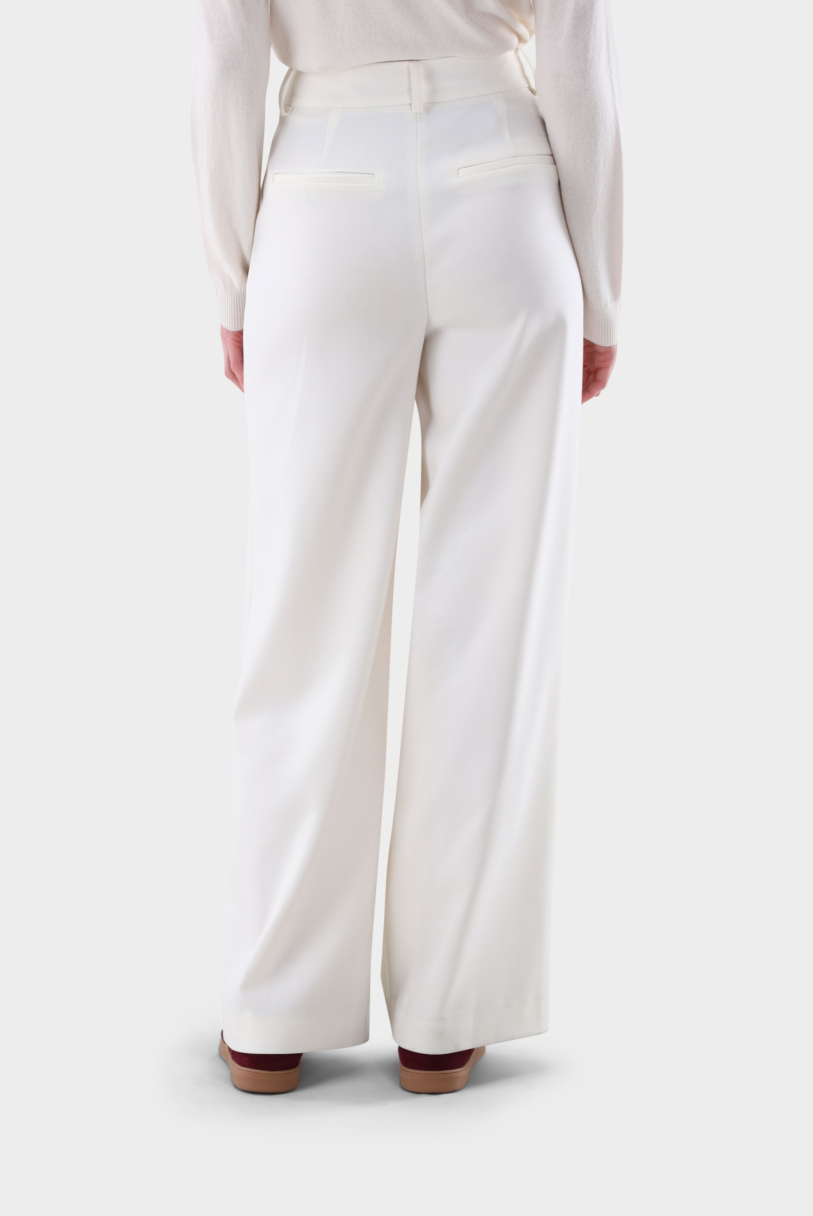 Elegante Hose mit mittelhohem Bund und weitem Bein aus einer einfarbigen Woll-Polyester-Stretchmischung. Die vorderen Bügelfalten sowie der verdeckte Haken- und Reißverschluss sorgen für eine klare, gepflegte Silhouette. Gürtelschlaufen und seitliche Eingrifftaschen bieten Funktionalität im Alltag, ergänzt durch Leistentaschen auf der Rückseite. Das Material verbindet angenehmen Tragekomfort mit formstabiler Qualität. Eine vielseitige Hose für Büro, Business oder formelle Anlässe.