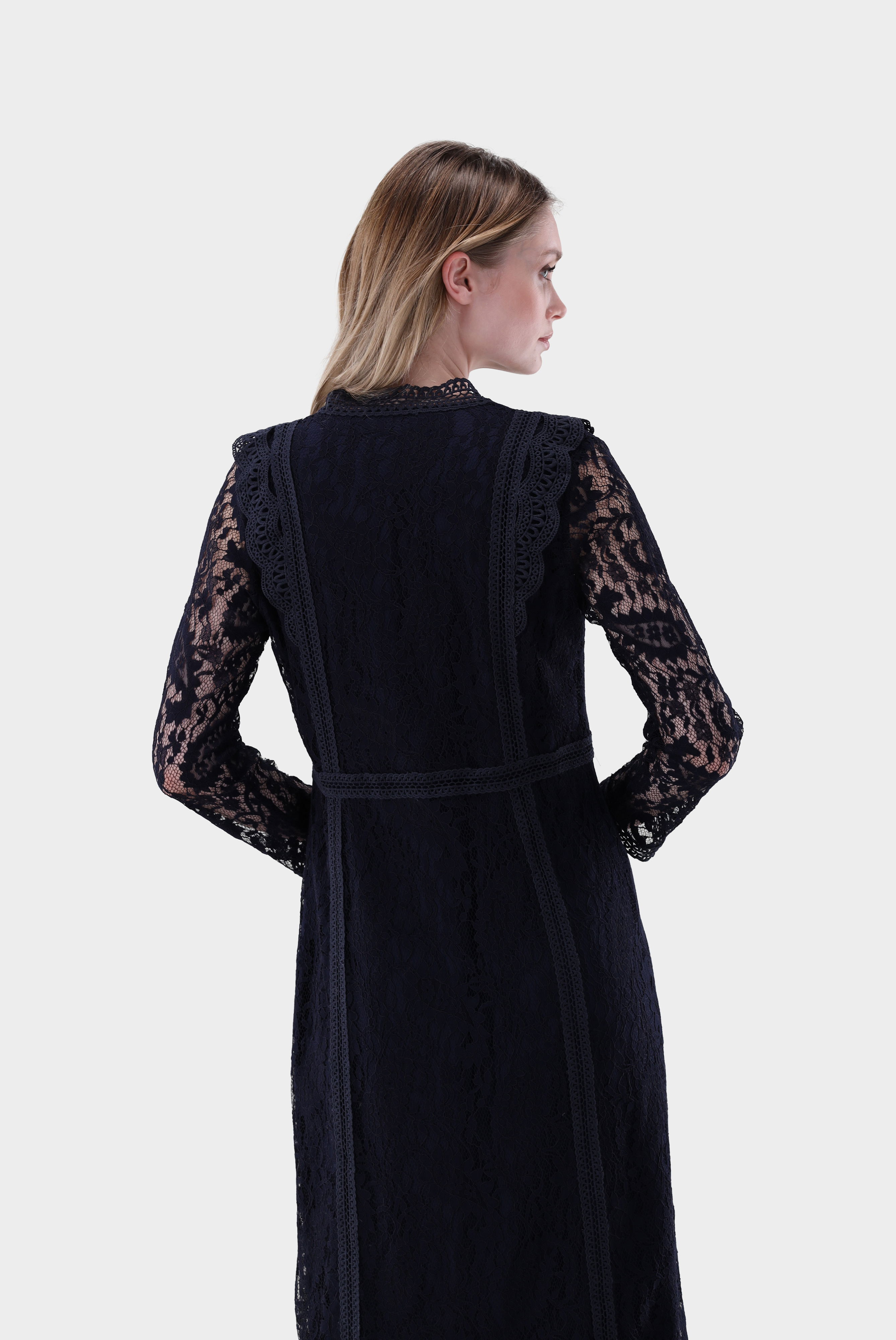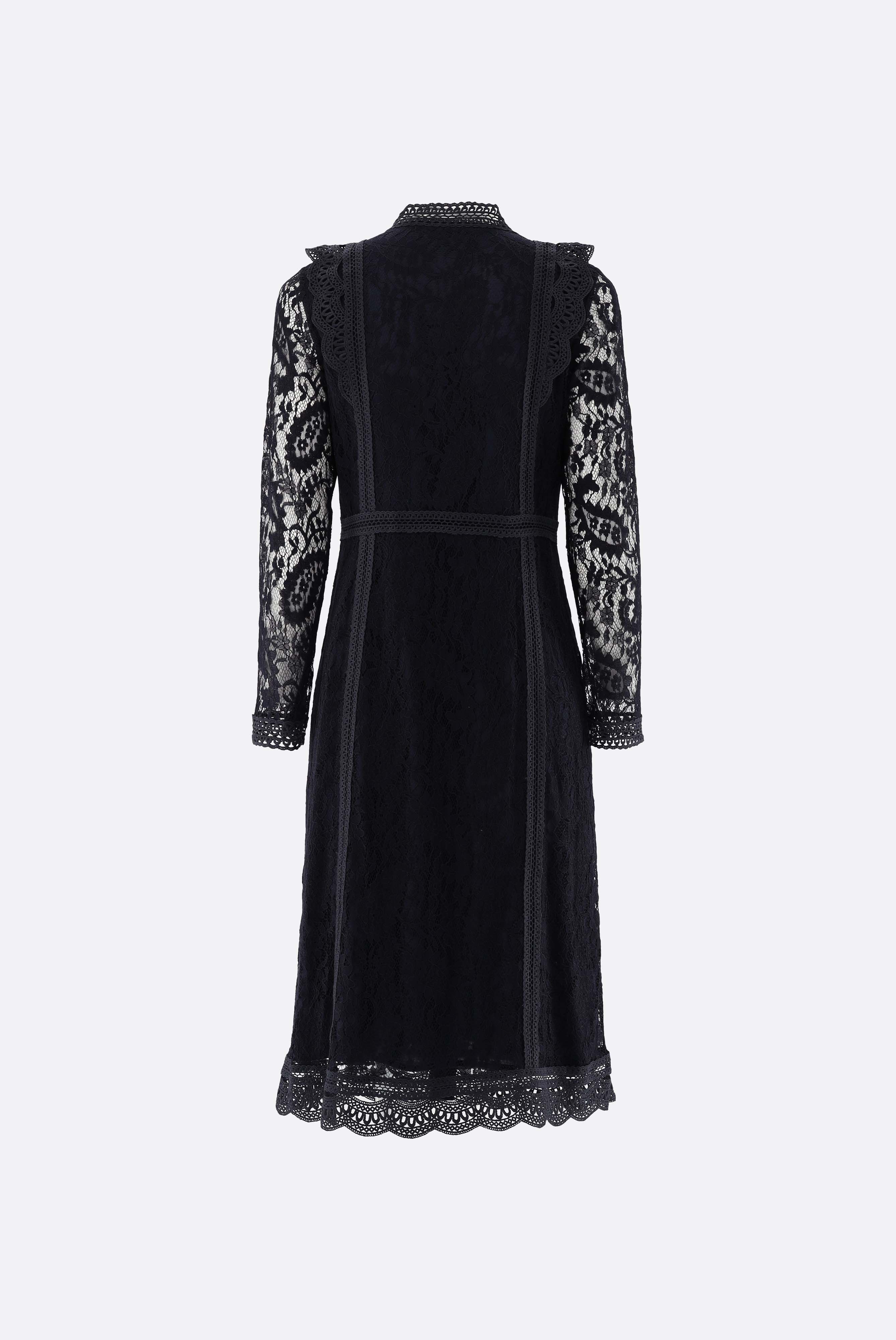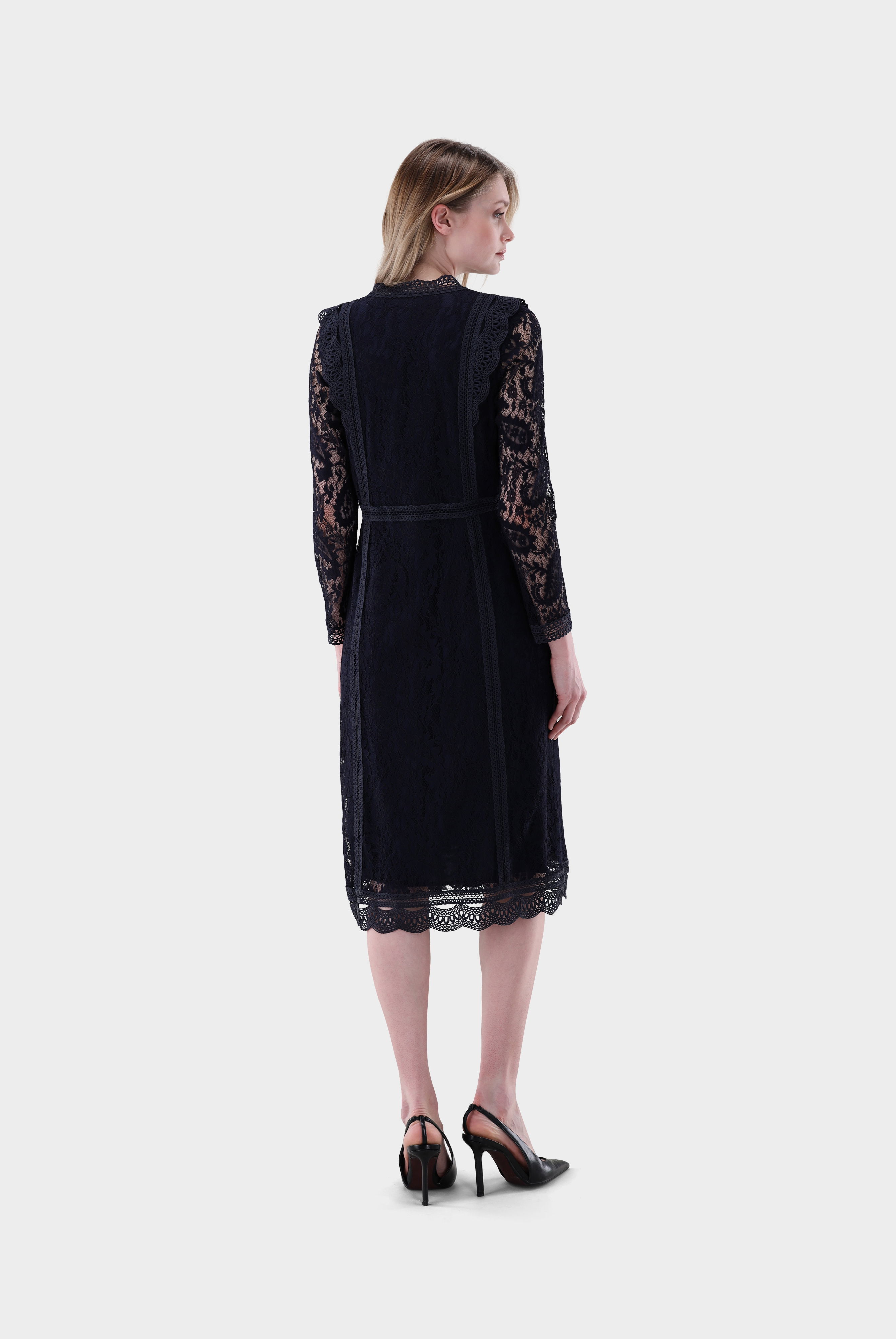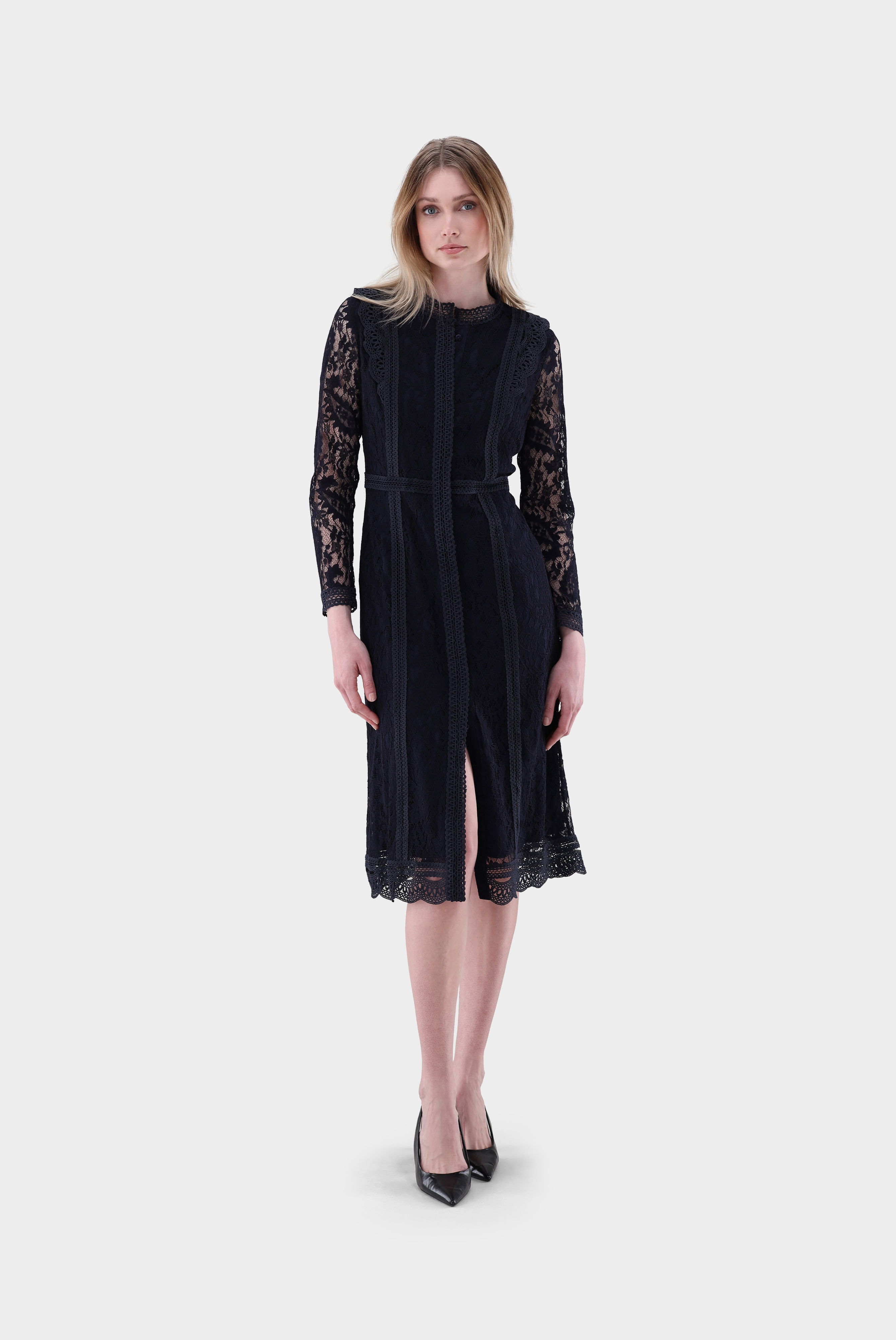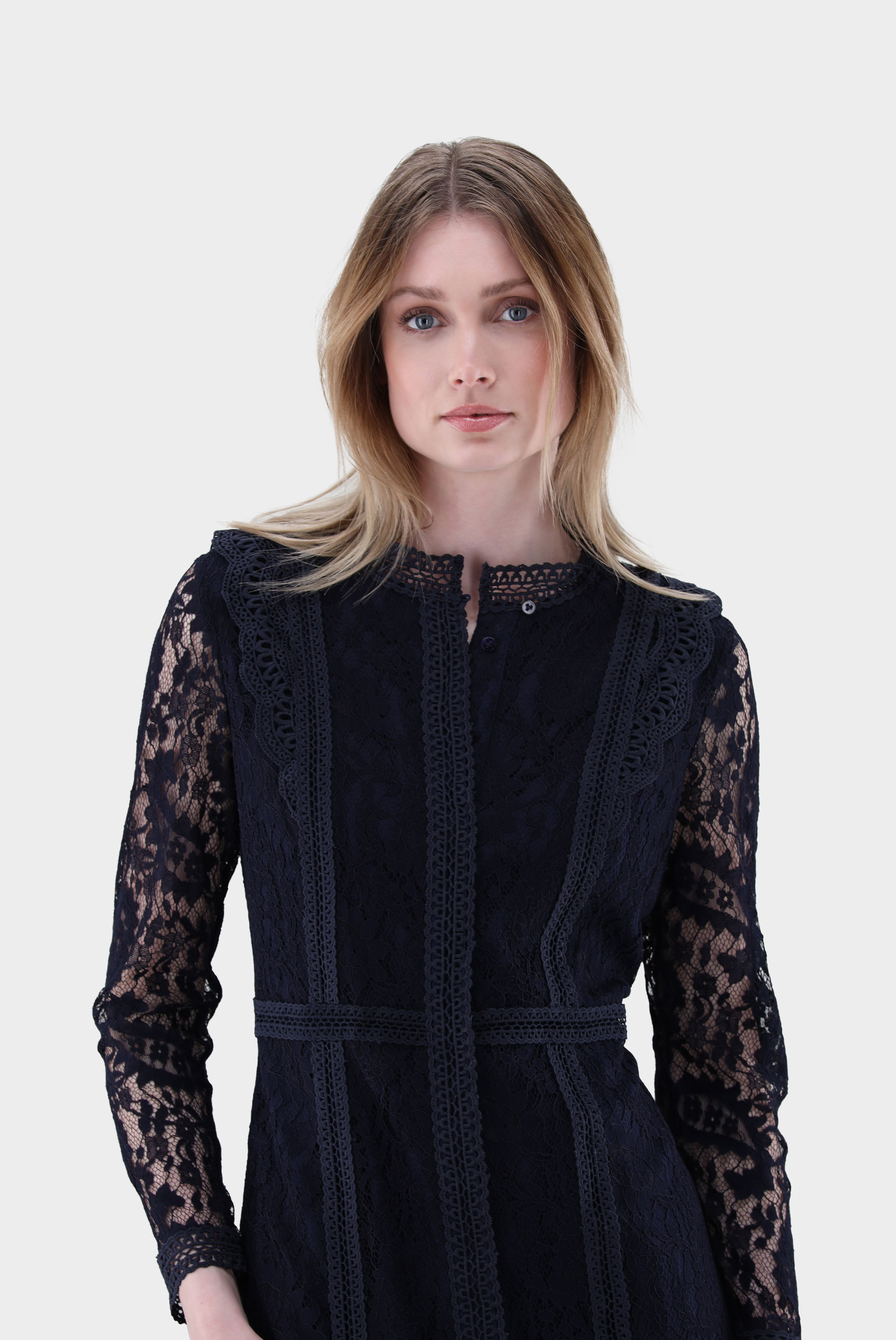 Elegantes, tailliertes Midi-Spitzenkleid mit langen Ärmeln und einem femininen Stehkragen – perfekt für stilvolle Anlässe. Die verdeckte Knopfleiste sorgt für eine harmonische Silhouette, während der gewellte Saum dem Kleid eine romantische Note verleiht. Gefertigt aus einem hochwertigen Mix aus Baumwolle, Nylon und Viskose bietet das Kleid angenehmen Tragekomfort. Die feine Spitze ist komplett gefüttert und sorgt für ein edles, blickdichtes Finish. Dieses Spitzenkleid vereint klassische Eleganz mit modernen Details – ein Must-have für besondere Momente.