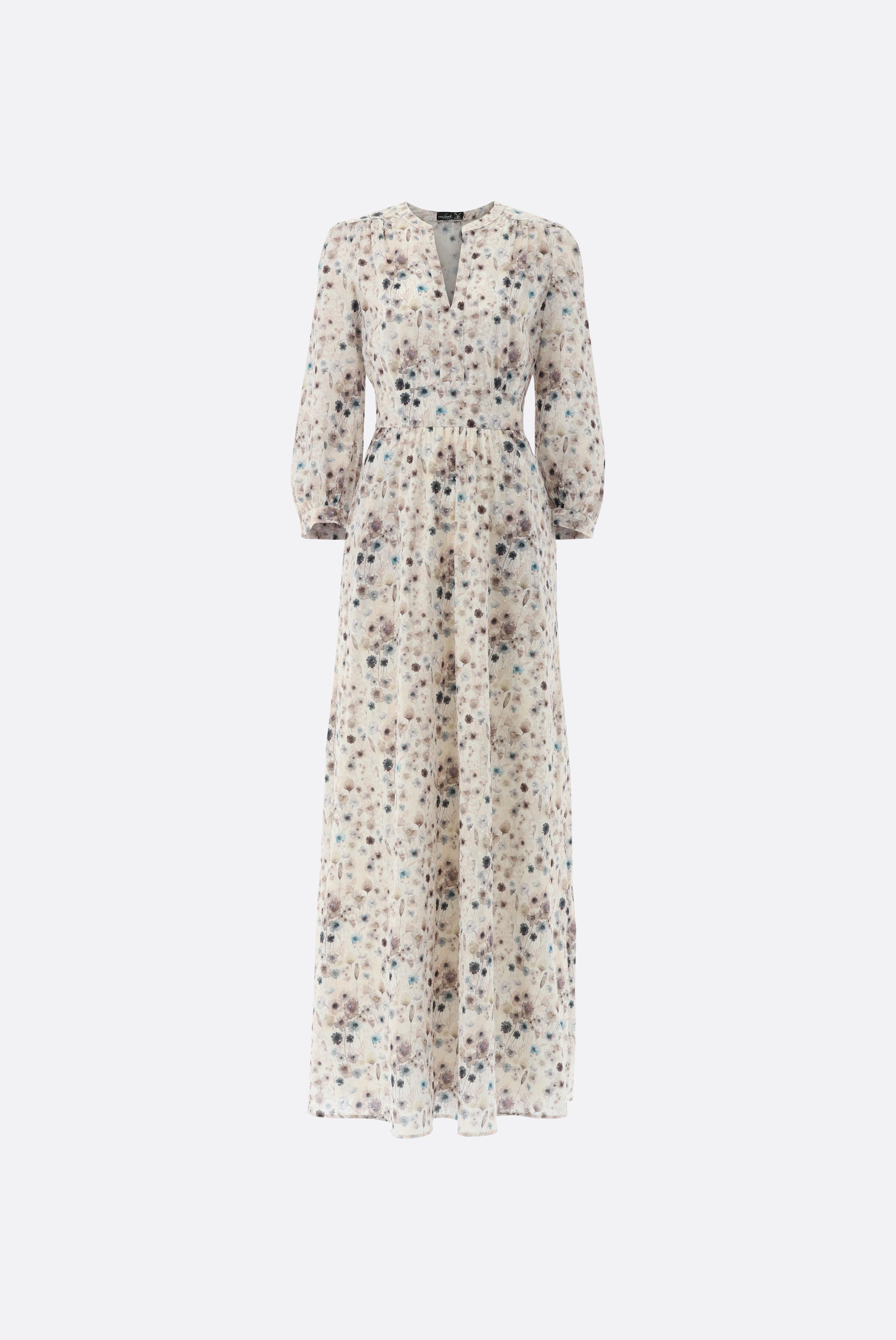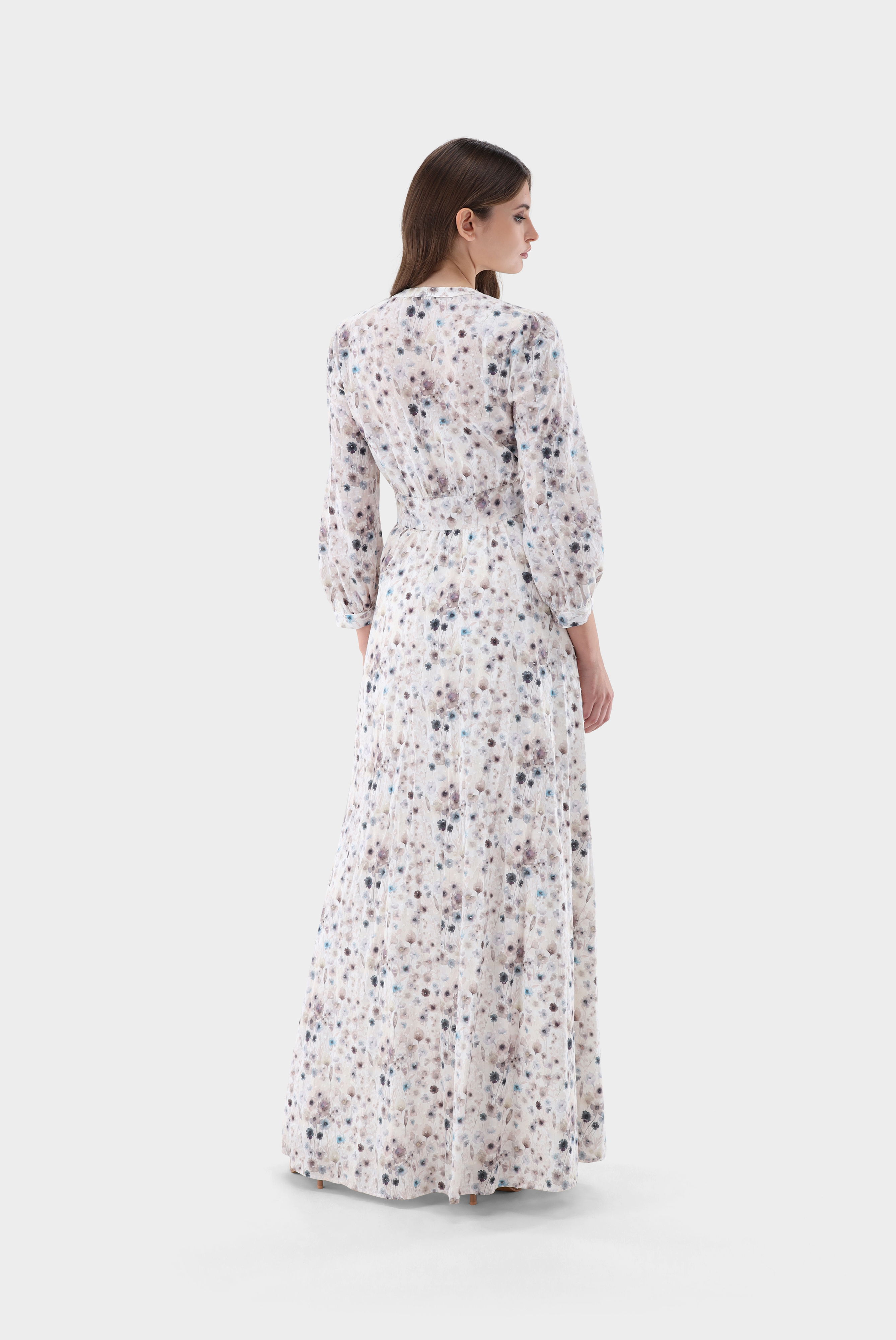 Das Maxikleid mit seitlichen Taschen, langen Puffärmeln und Taillenband wird aus Baumwoll-Plumetis mit Blumenprint gefertigt. Plumetis ist ein Gewebe mit kleinen erhabenen Punkten, die an Wattebäusche oder Schneeflocken erinnern. Das lange, ausgestellte Kleid betont die Taille mit Kräuseln, hat 3/4-Ärmel und Rüschen an Schulter und Manschetten. Es ist gefüttert und verfügt über Seitennahttaschen und einen V-Ausschnitt. Die Knöpfe sind aus Perlmutt.
