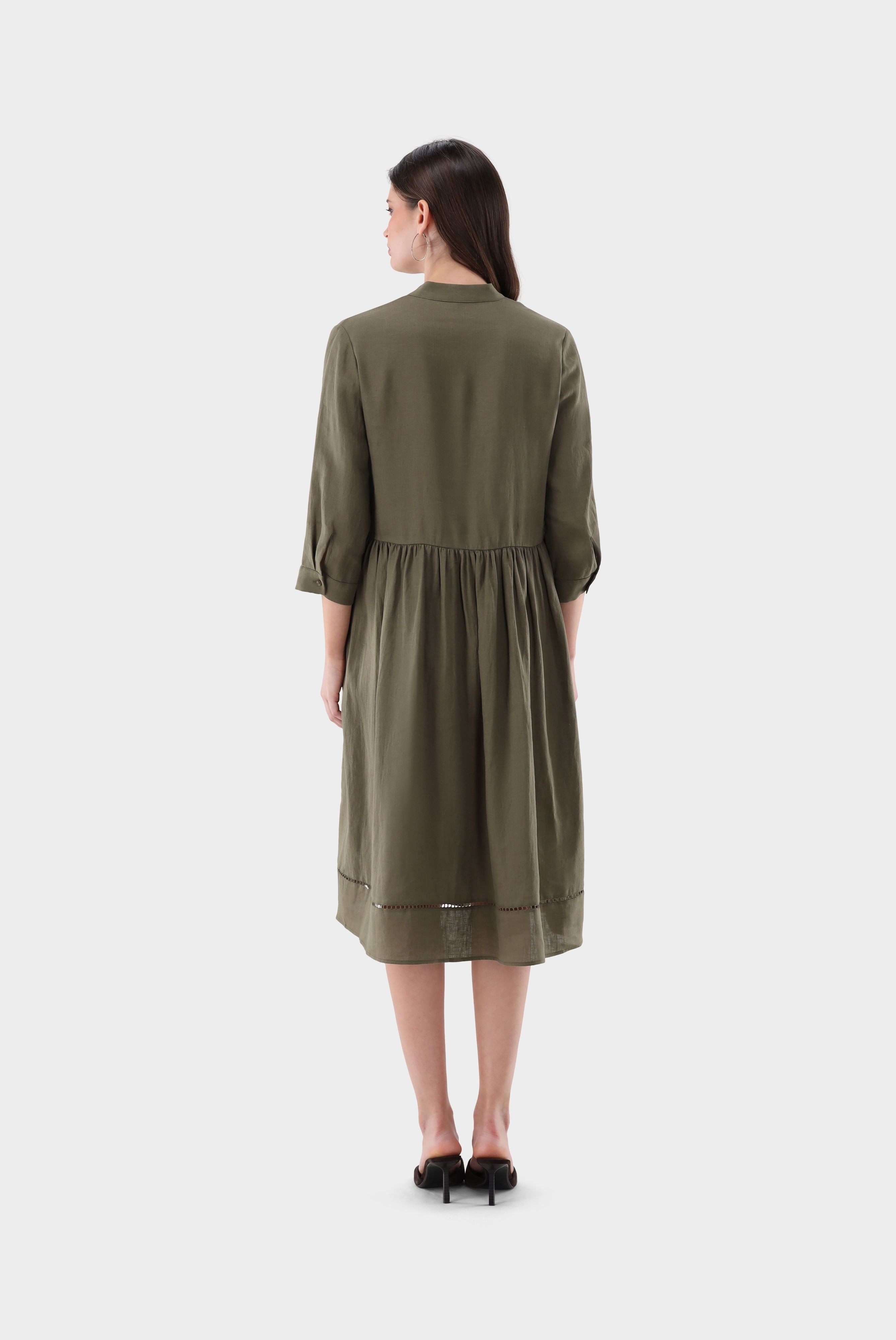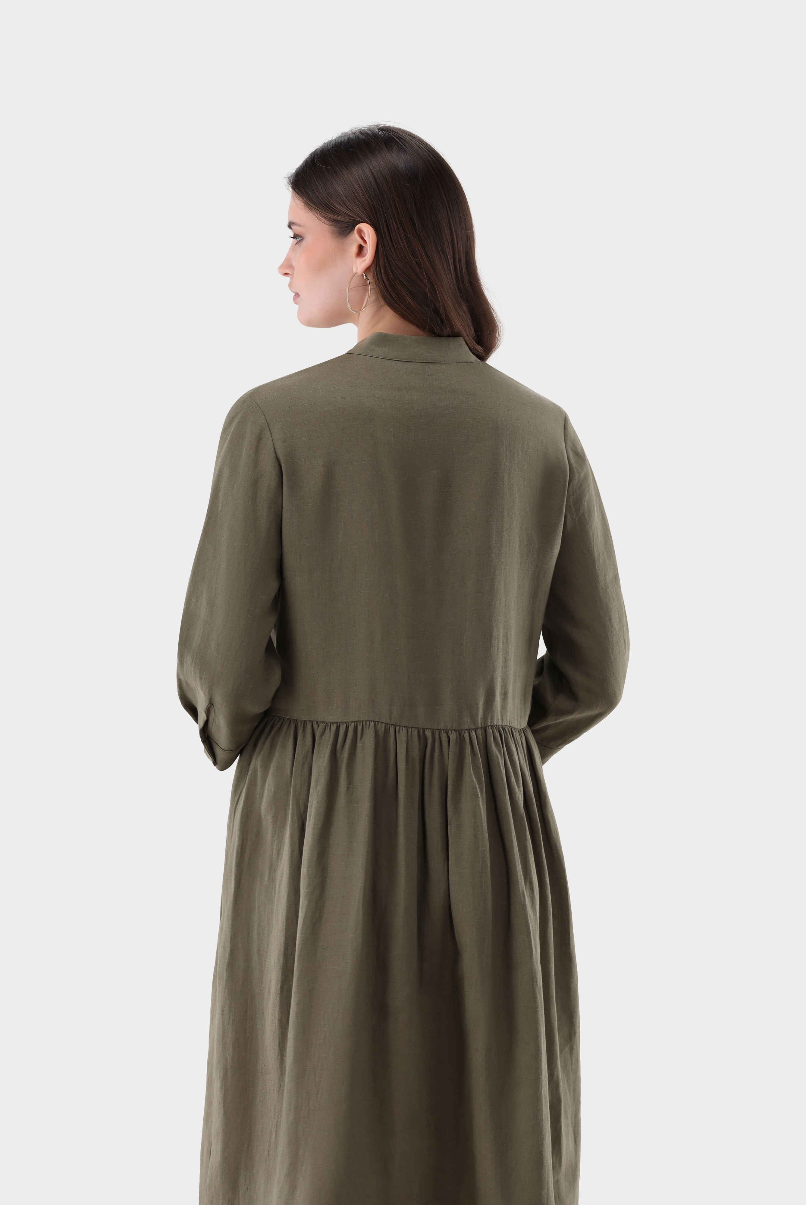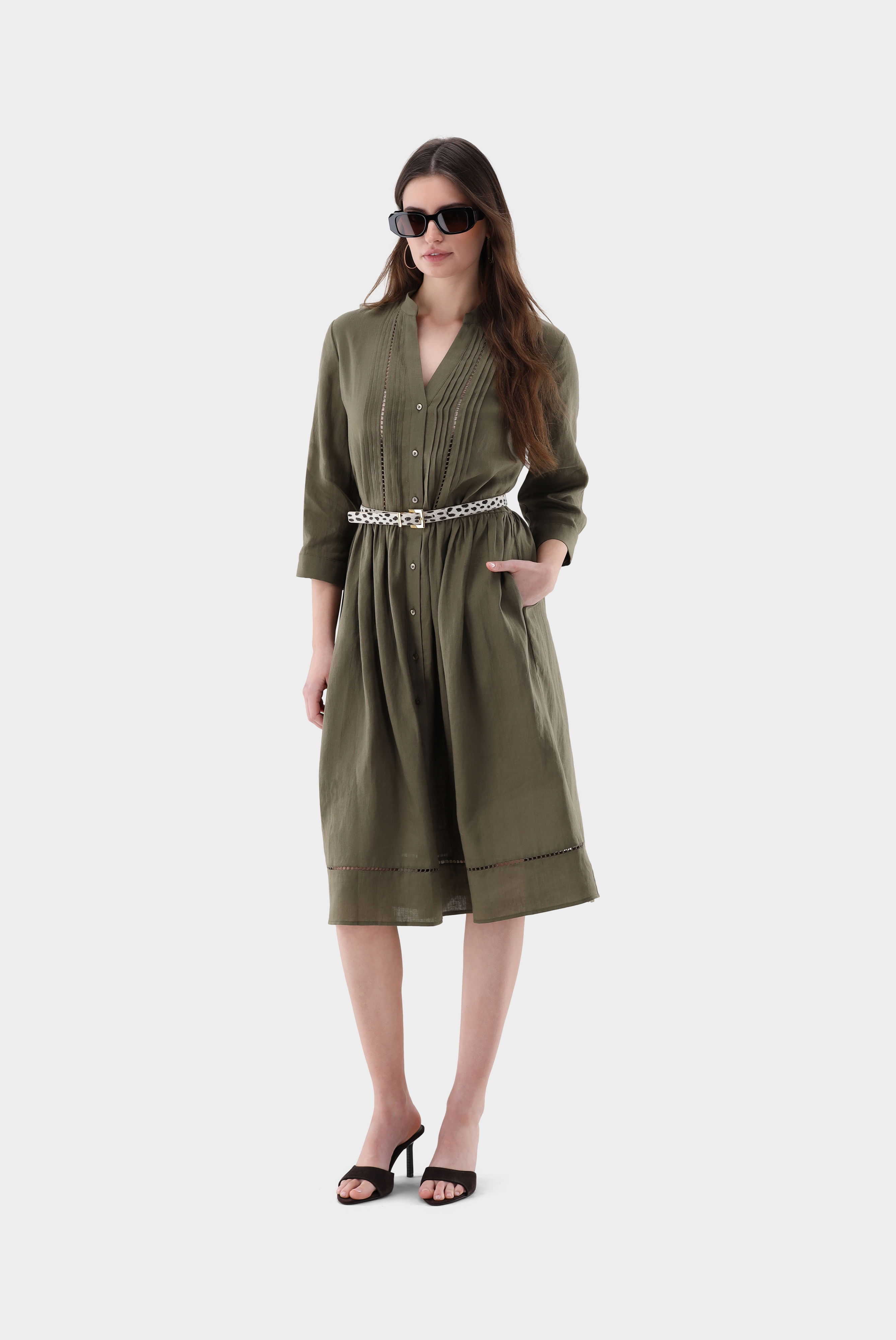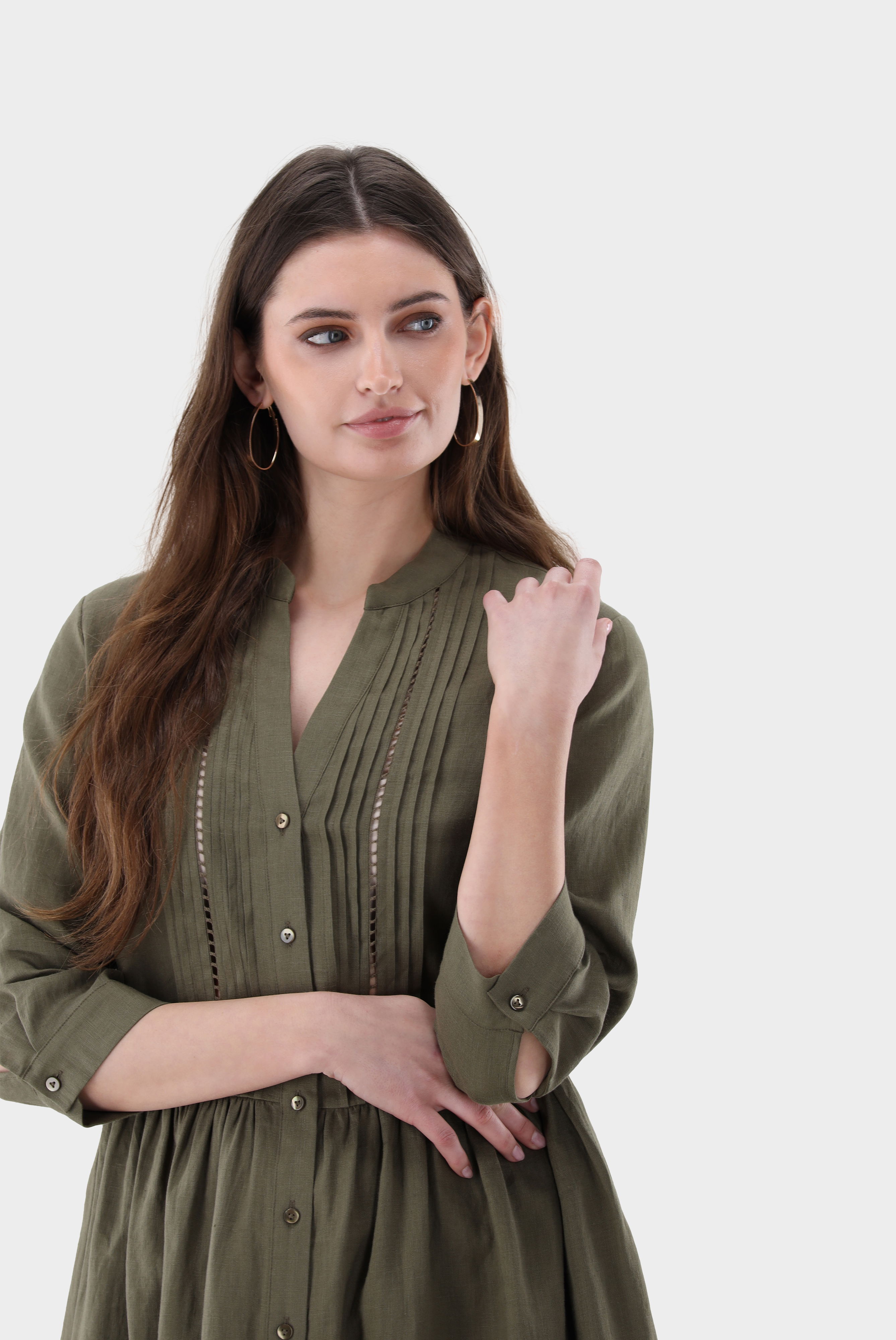 Dieses leicht taillierte Midikleid verbindet klare Linien mit feinen Details. Der Stehkragen und die lange Ärmel sorgen für eine elegante Silhouette, während das plissierte Latz-Detail dem Design Struktur verleiht. Eine zarte Lochstickerei akzentuiert den Saum dezent. Praktische Seitentaschen erhöhen den Tragekomfort. Gefertigt aus weichem Leinen bietet das Kleid Atmungsaktivität, angenehmen Fall und eine natürliche, hochwertige Optik für vielseitige Alltags- und Sommerlooks.