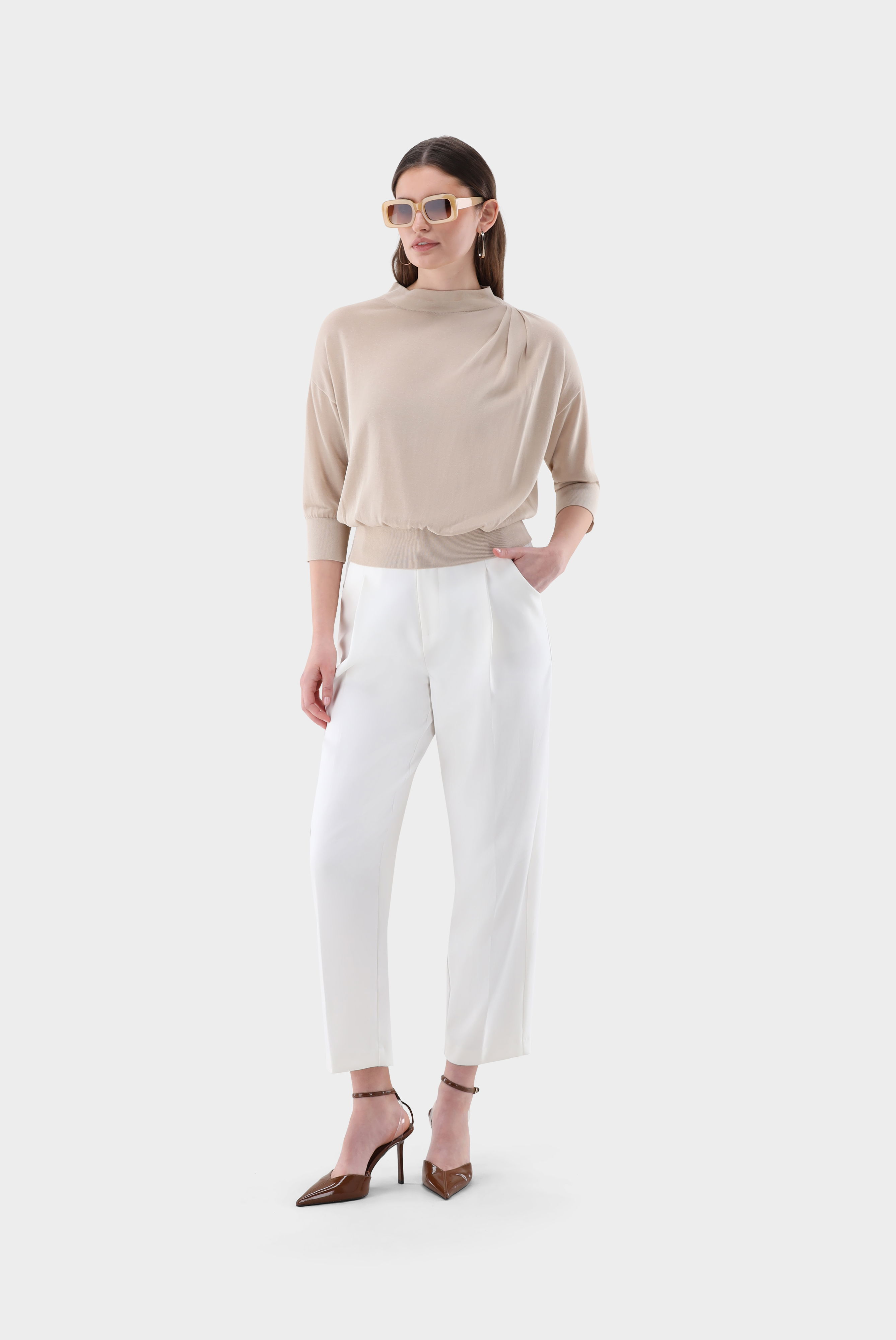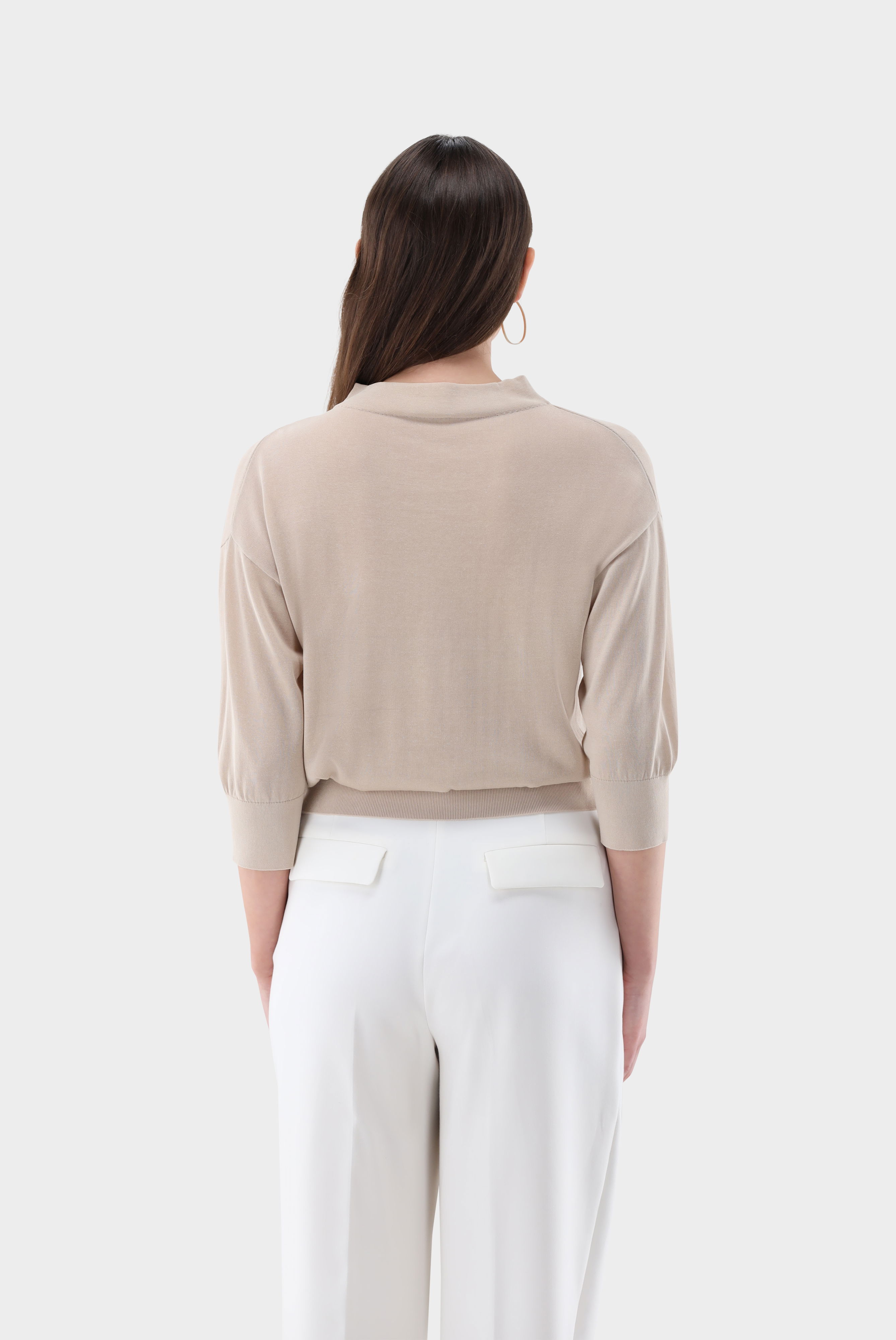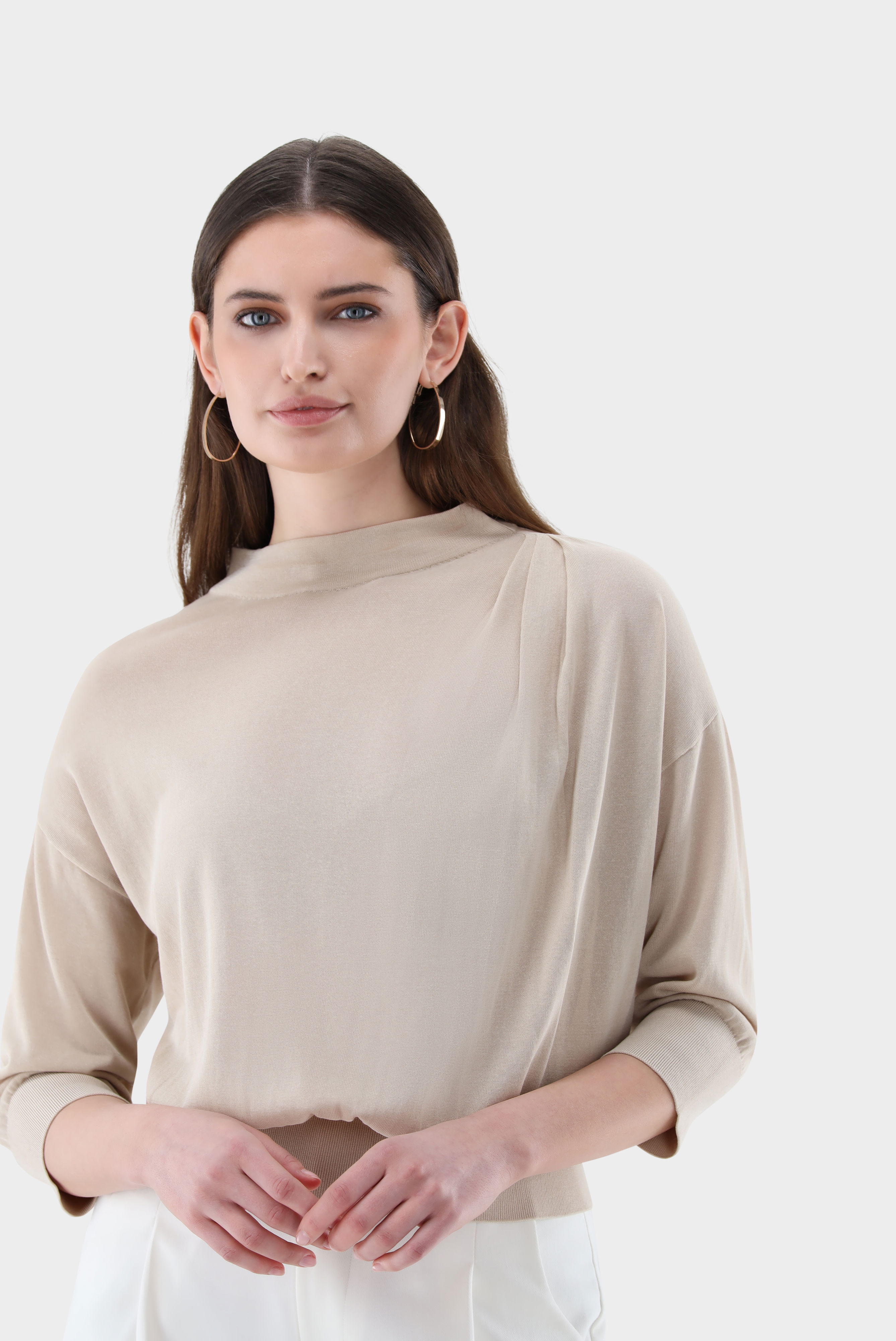 Dieser locker geschnittene Pullover aus feinem Baumwoll-Viskose-Strick überzeugt durch weiche Haptik und leichten Tragekomfort. 3/4-Ärmel und ein Mock-Neck sorgen für moderne Linienführung, während die drapierte Front elegante Akzente setzt. Das feine, atmungsaktive Material bietet Bewegungsfreiheit und angenehmes Hautgefühl. Vielseitig kombinierbar, eignet sich der Pullover ideal für stilvolle Casual- und Smart-Casual-Looks – perfekt für Übergangszeiten oder leichte Layering-Outfits.