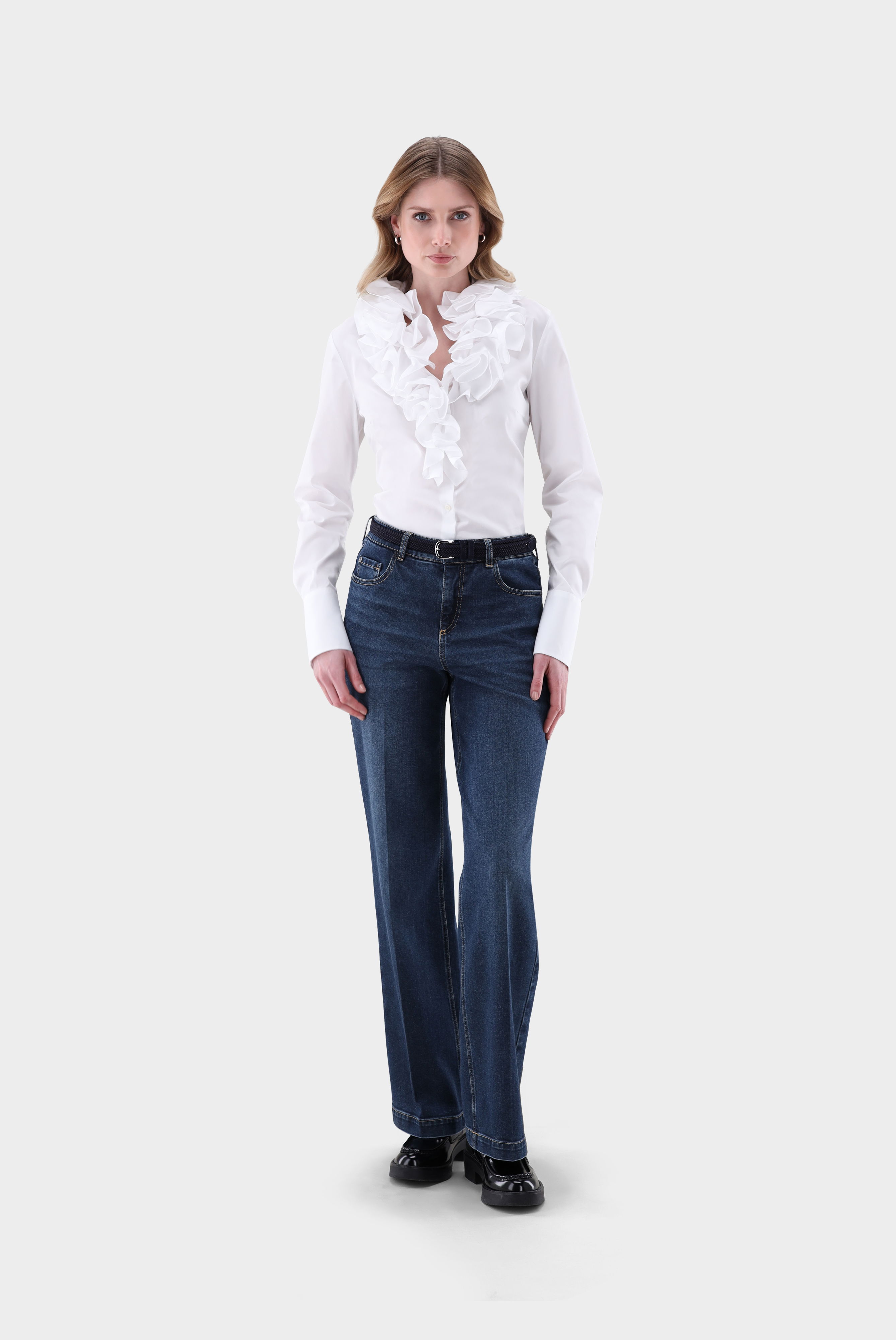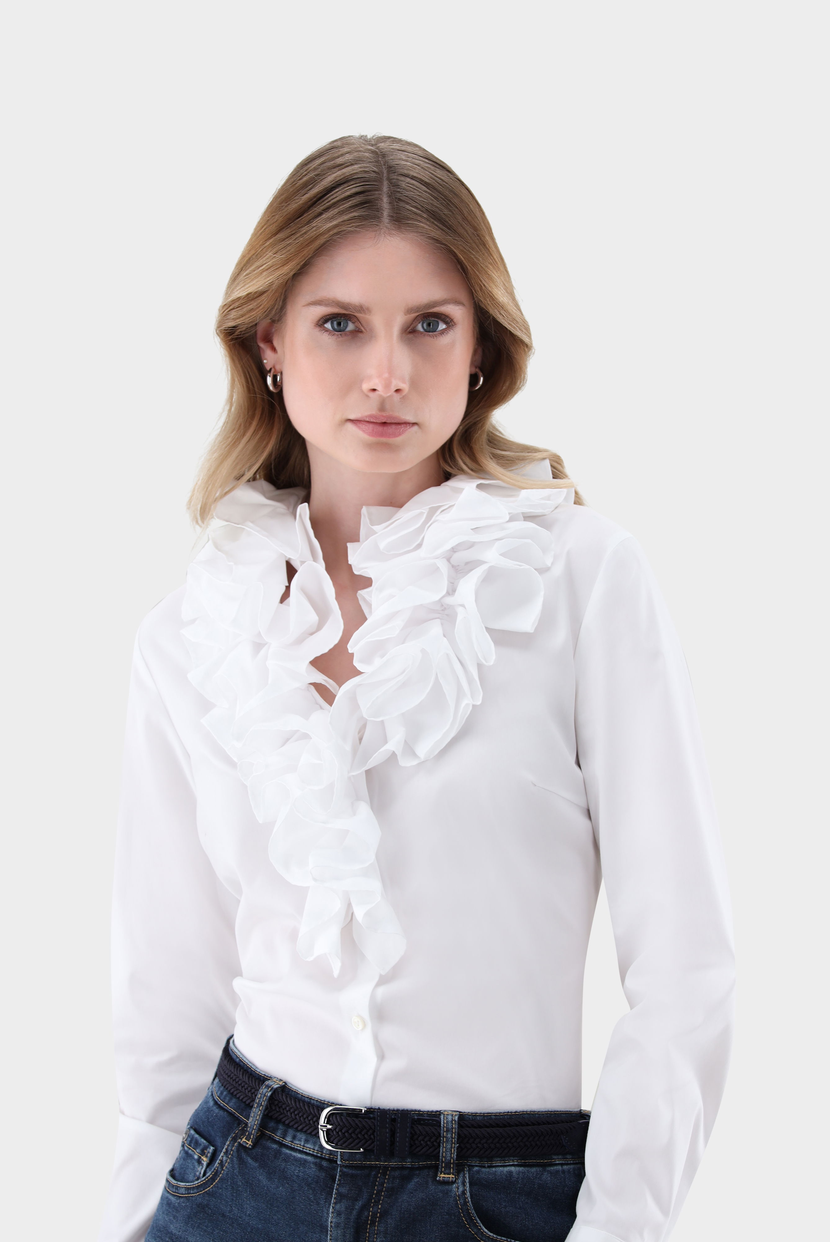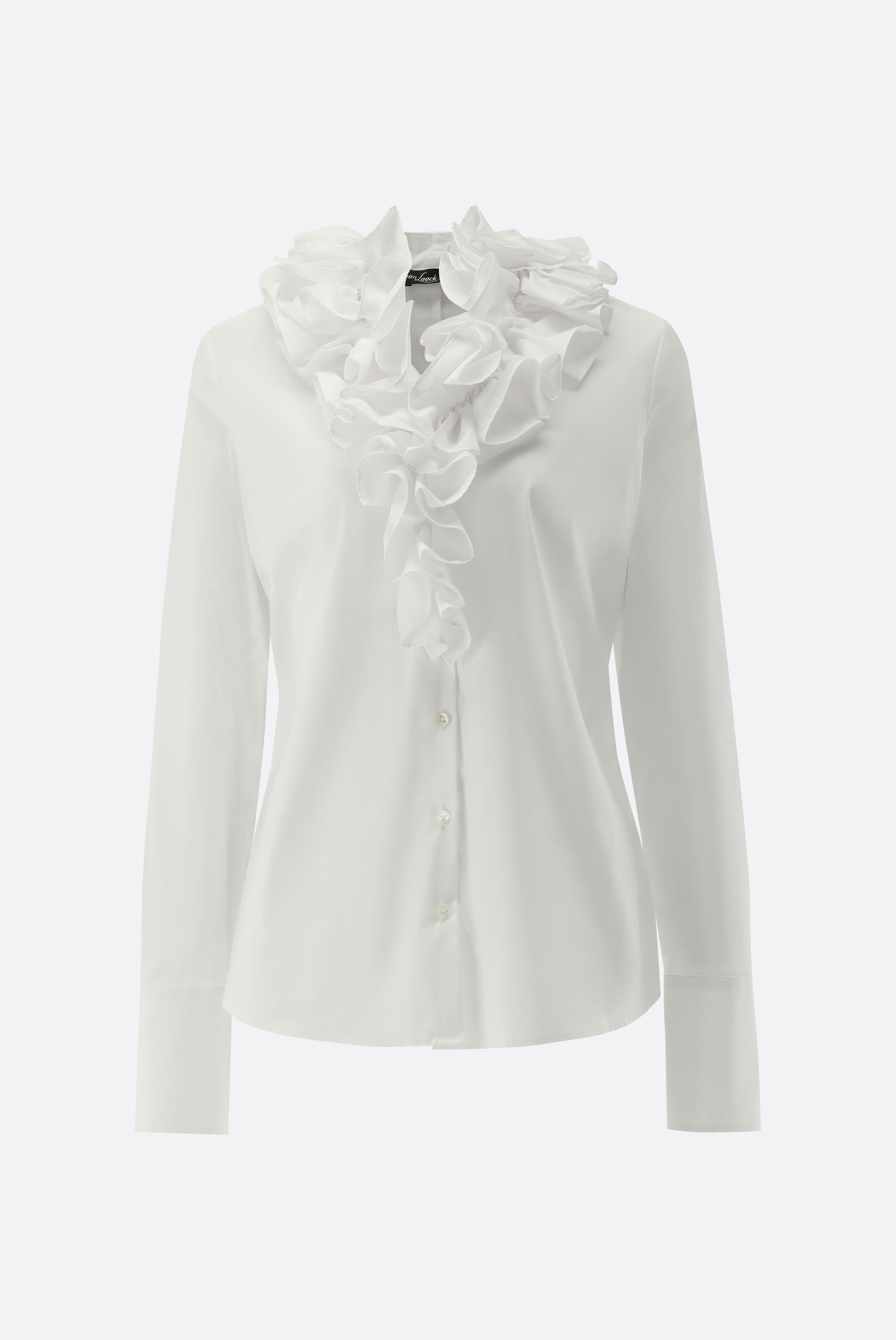 Diese taillierte Bluse bietet eine feminine Passform und betont die Silhouette. Lange Ärmel und ein eleganter Ausschnitt mit Rüschen setzen auffällige, stilvolle Akzente. Gefertigt ist sie aus einer einfarbigen Baumwoll-Stretch-Mischung, die Bewegungsfreiheit und Komfort vereint. Das Material sorgt für einen angenehmen Sitz und eine gepflegte Optik. Ideal für Büro oder besondere Anlässe.