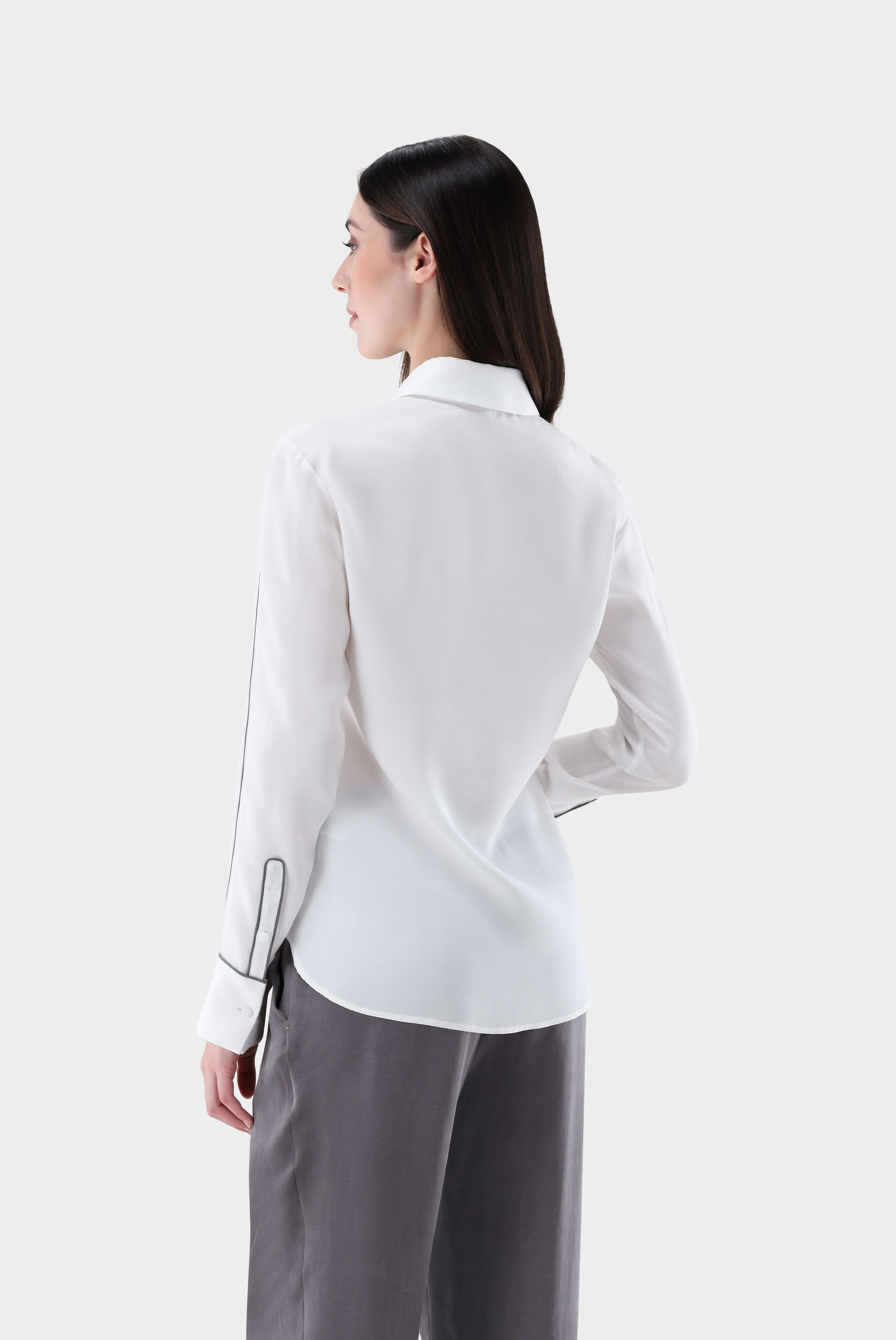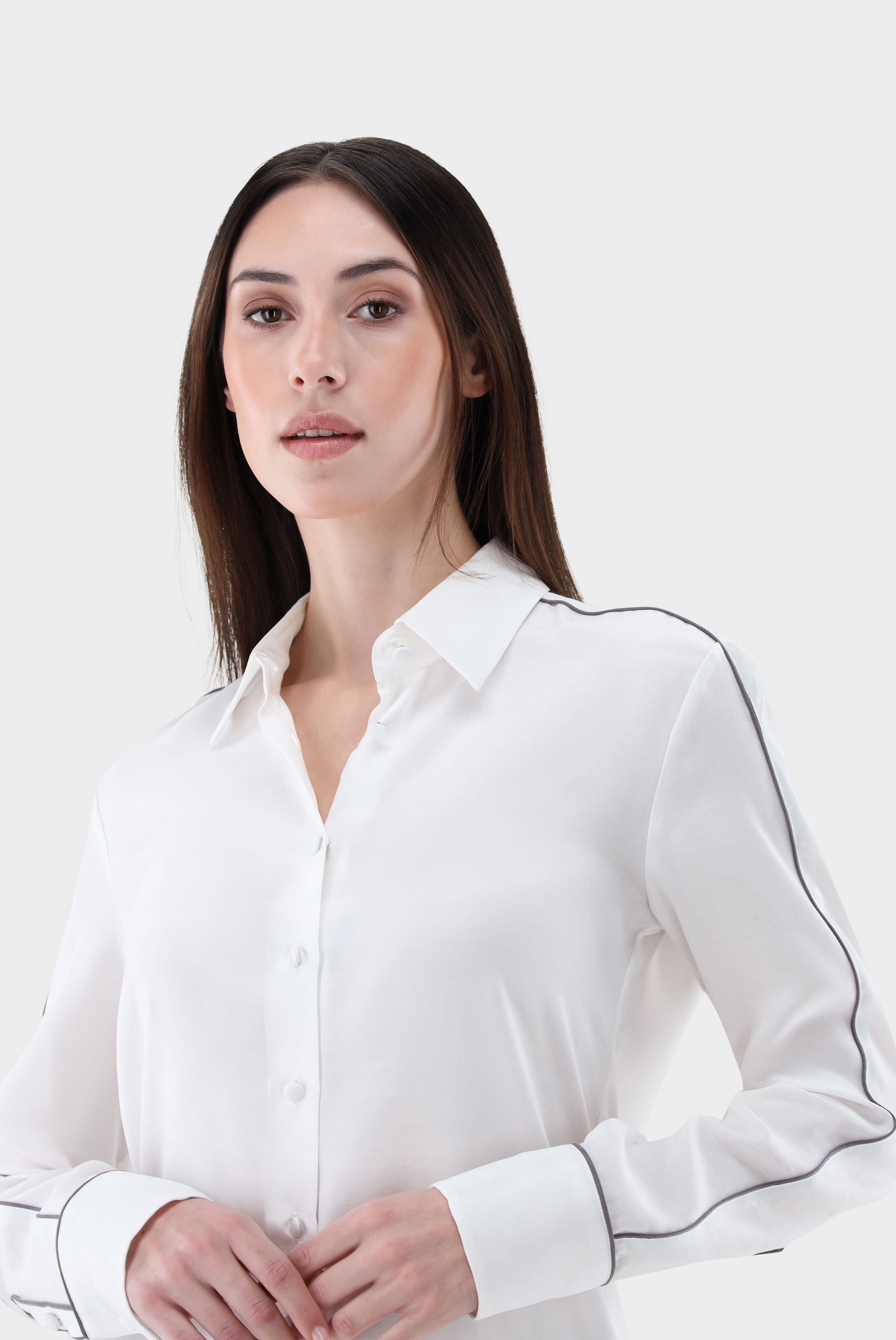 Taillierte Bluse mit langen Ärmeln, Schulterpasse und Manschetten mit einfarbiger Paspel, aus Lyocell. Diese vielseitige Bluse verfügt über einen Hemdblusenkragen, Langarm mit Manschette und einen leicht geschwungenen Saumverlauf. Paspelband in Kontrastfarbe betont Ärmel, Schulter, Manschette und Ärmelschlitz. Geeignet für lässige, geschäftliche und festliche Anlässe.