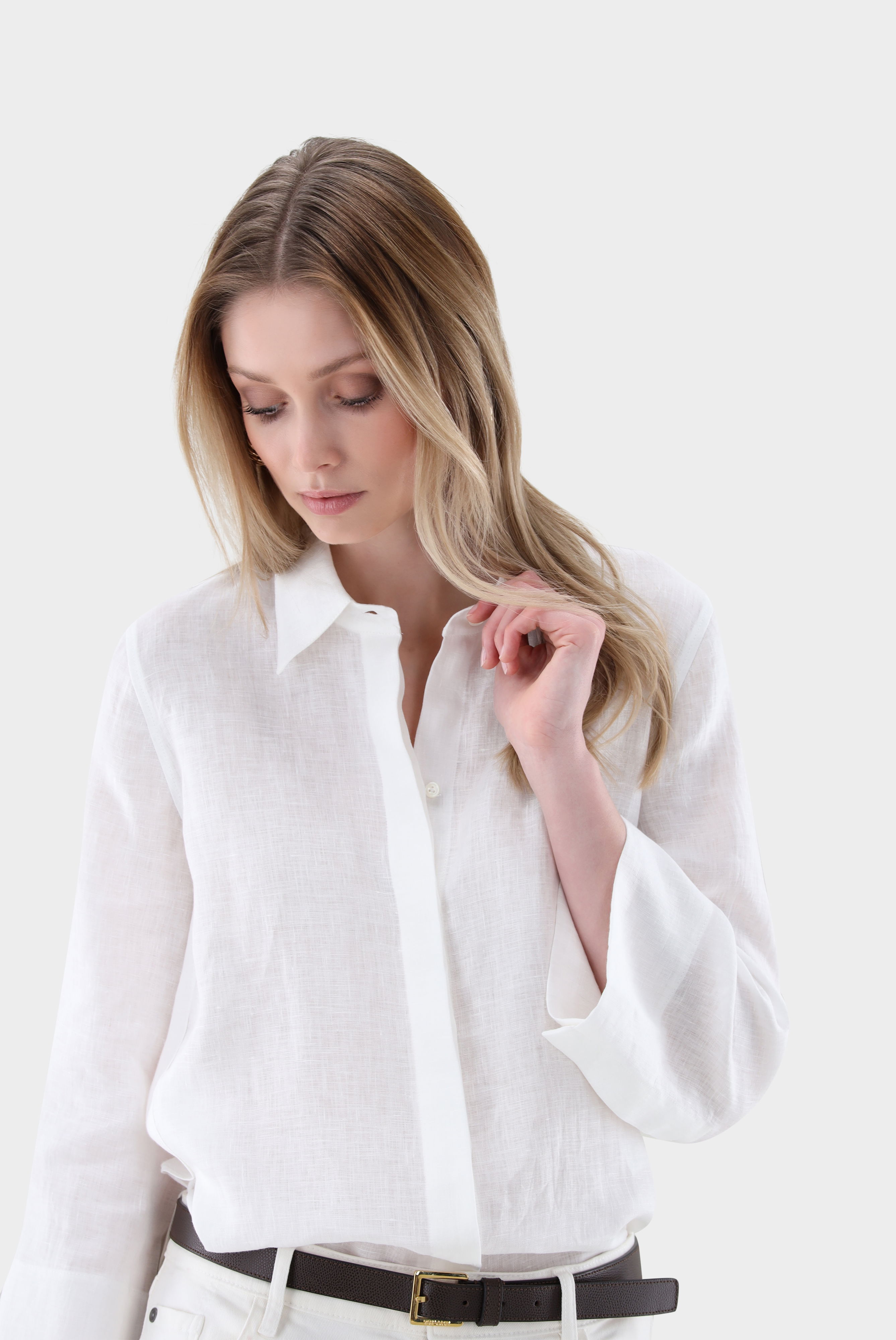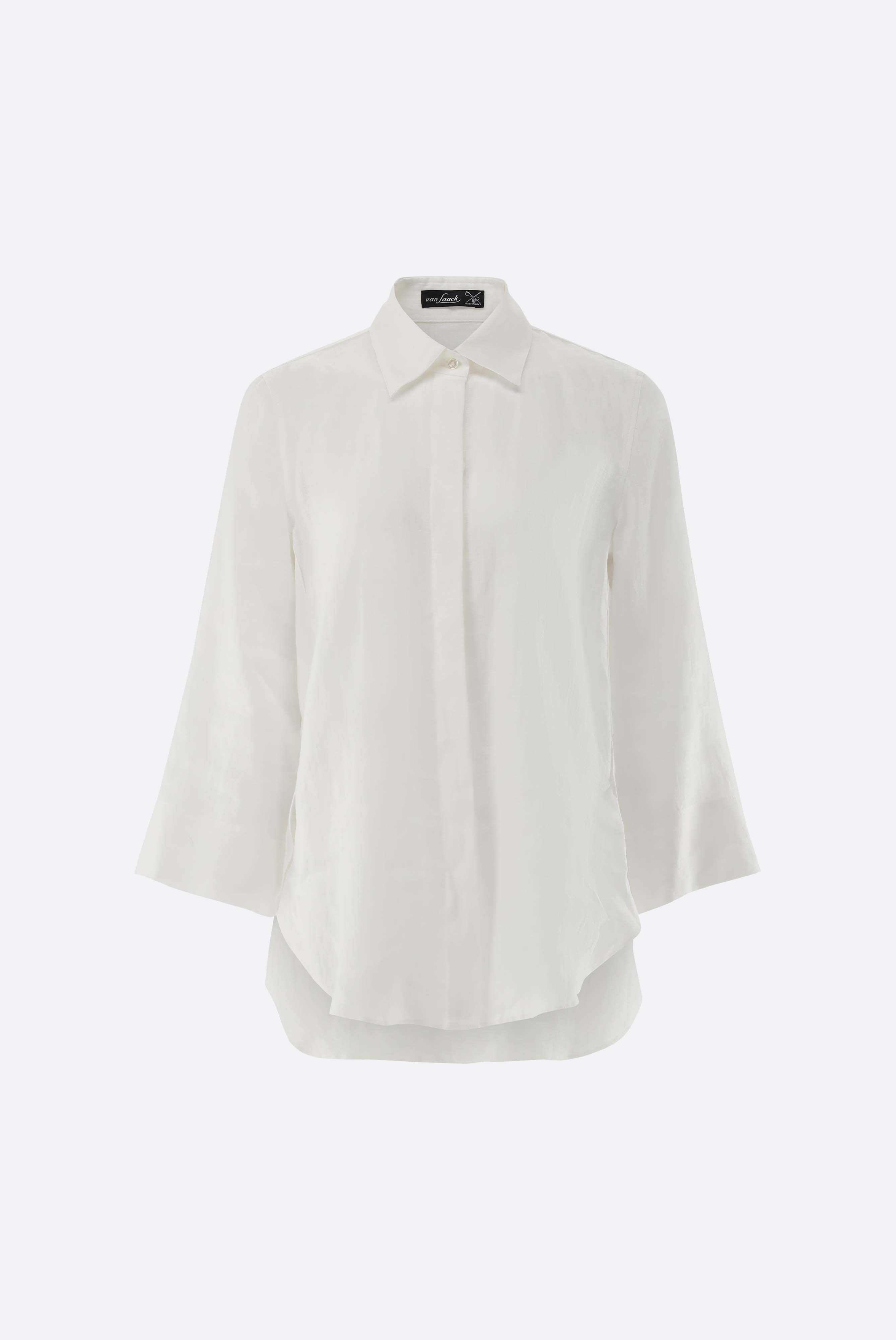 Diese Hemdbluse aus weichem Leinen besticht durch eine lockere Passform. Sie verfügt über 7/8 Ärmel und eine verdeckte Knopfleiste. Der Garn-Gefärbte Leinenstoff ist besonder atmungsaktiv. Ideal für legere Sommerpartys oder elegante Casual-Looks.