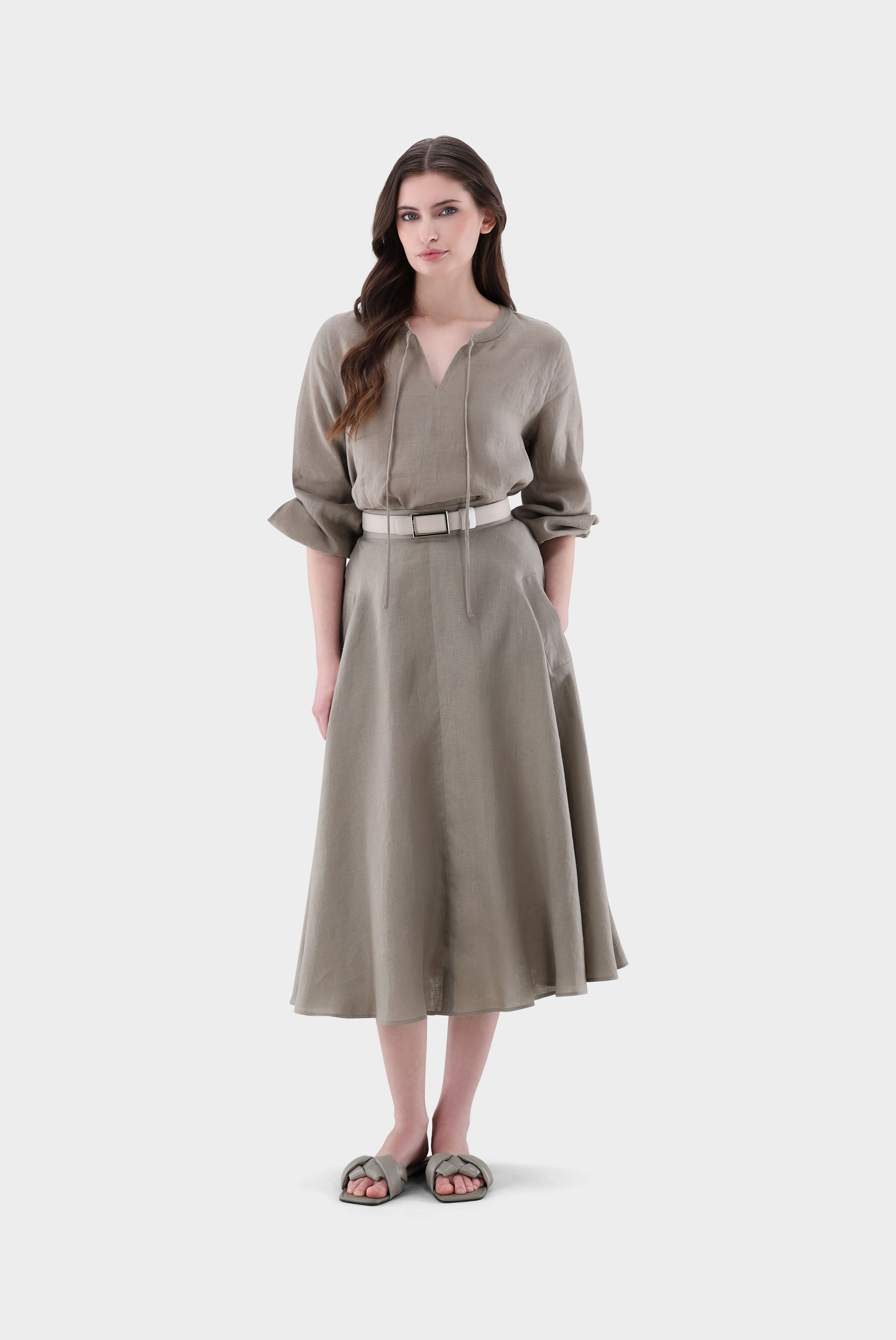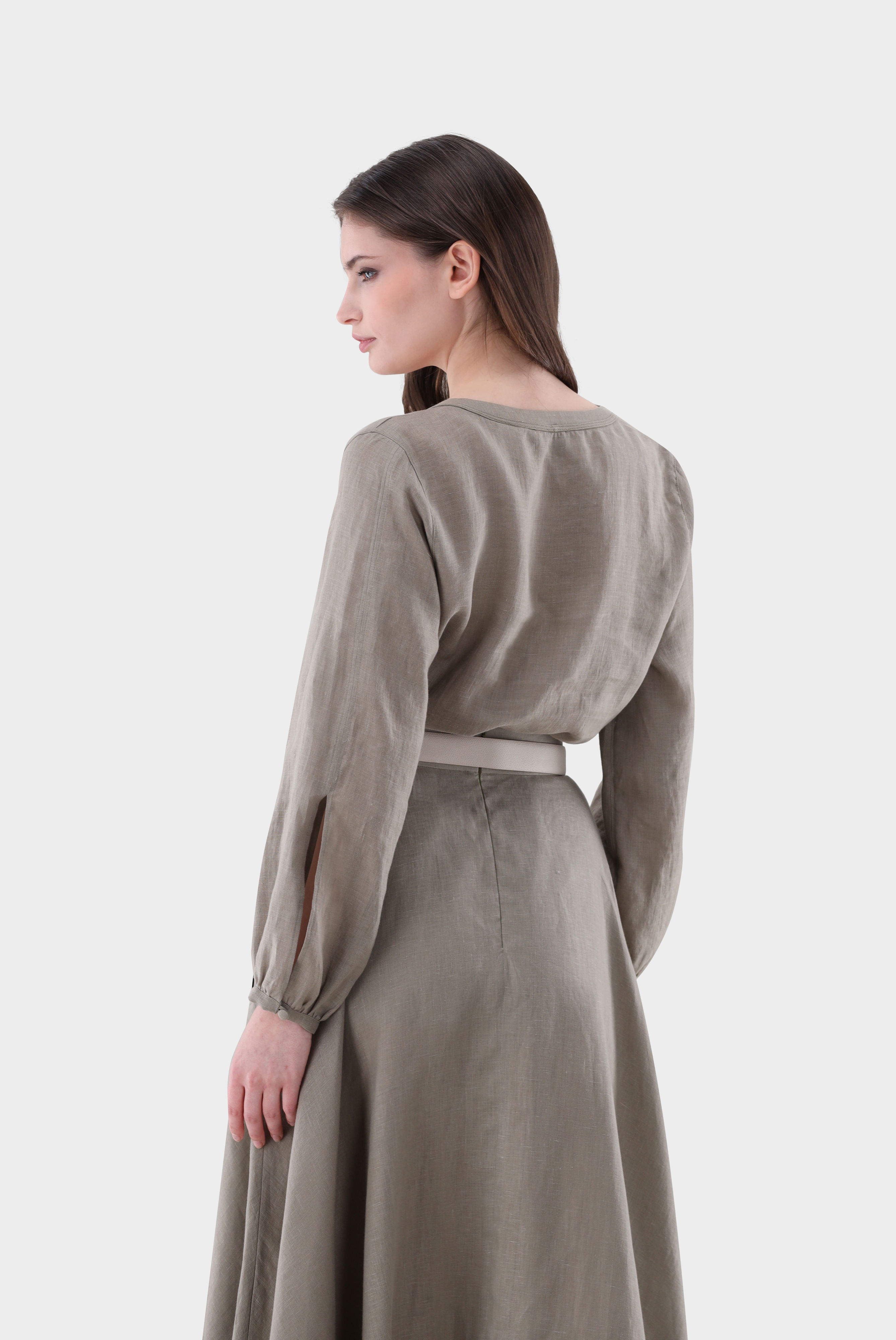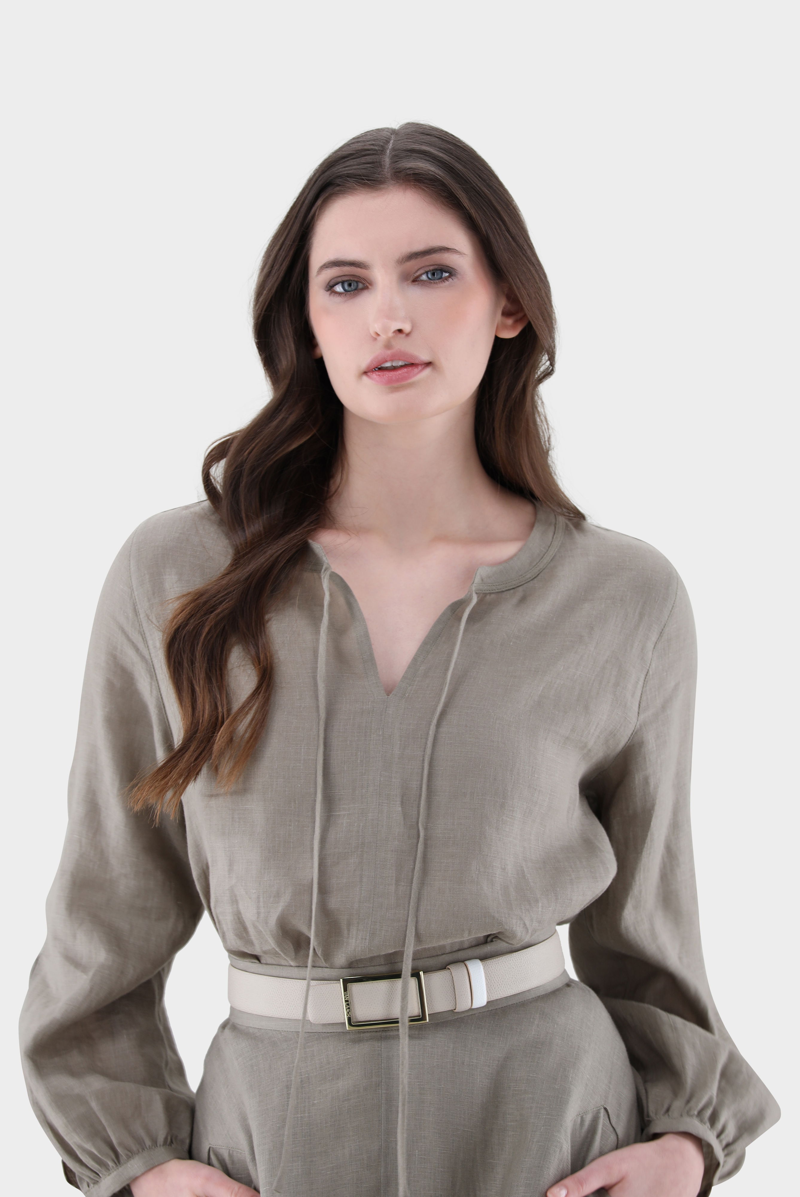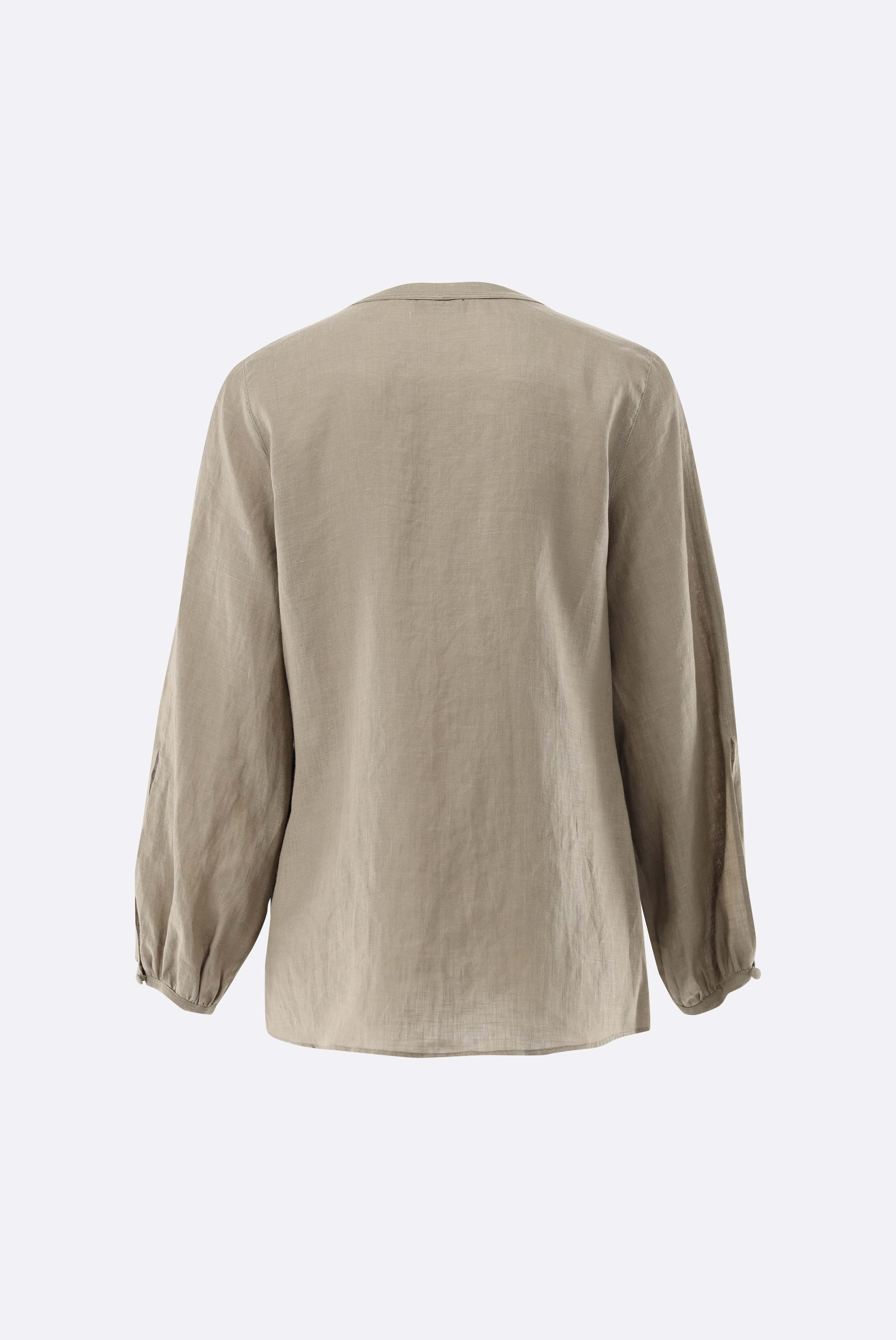 Diese Tunika Bluse wird aus hochwertigem und weichem Leinen gefertigt. Sie verfügt über lange Ärmel mit Schlitzen, einen Stehkragen, Manschetten mit Stoffbezogenem Ösenknopf und ein Bindeband am Kragen. Ideal für legere Sommerpartys oder elegante Casual-Looks.