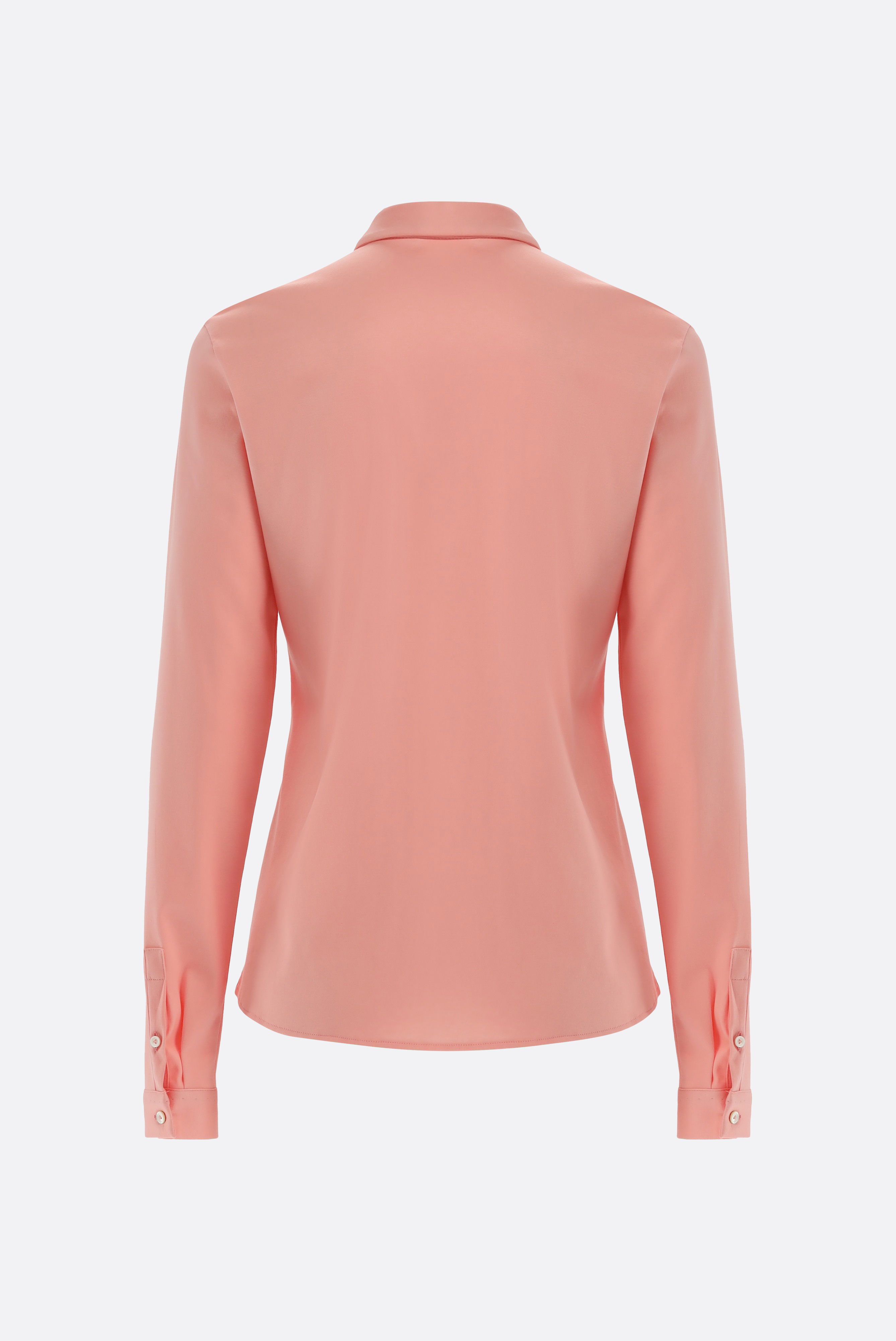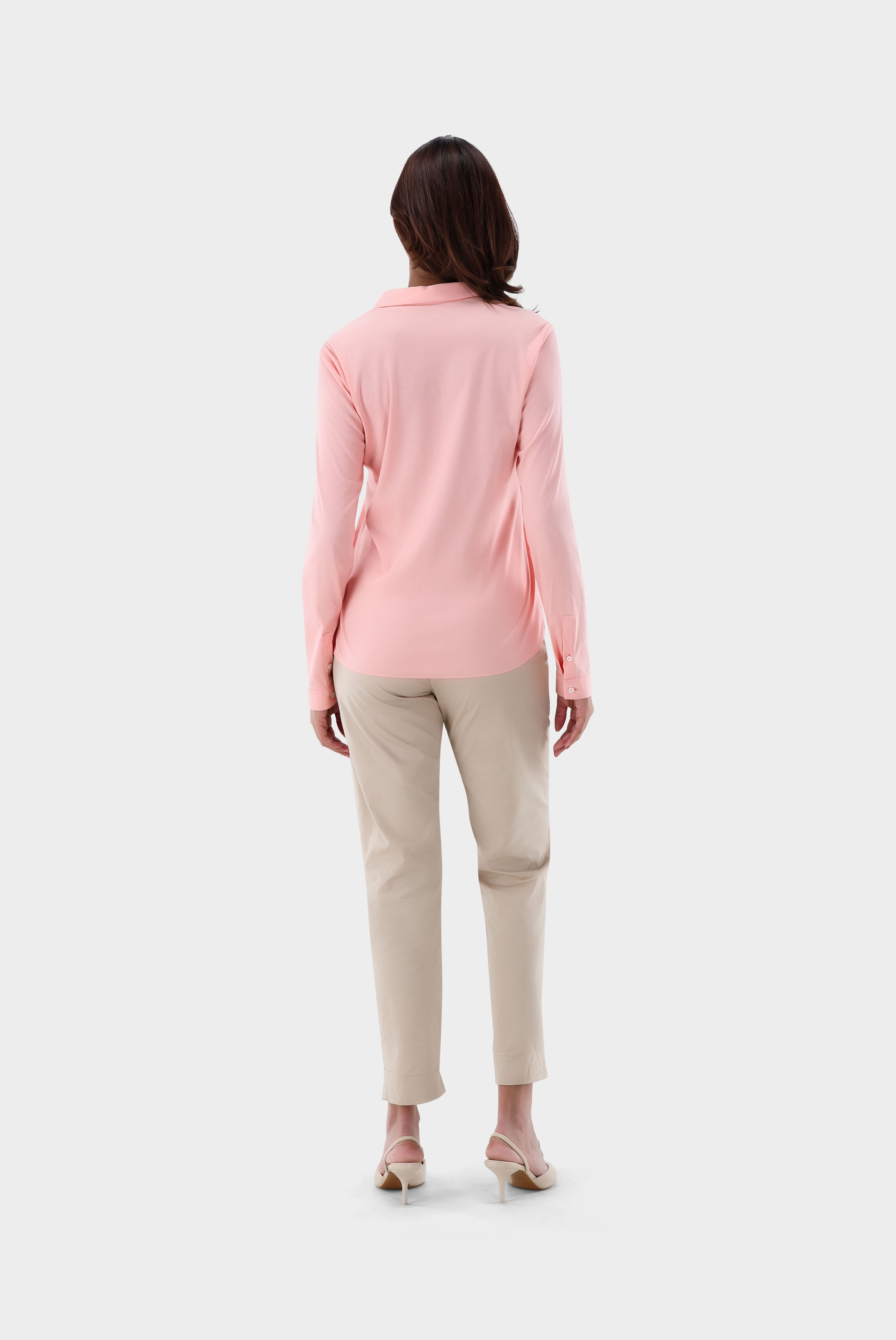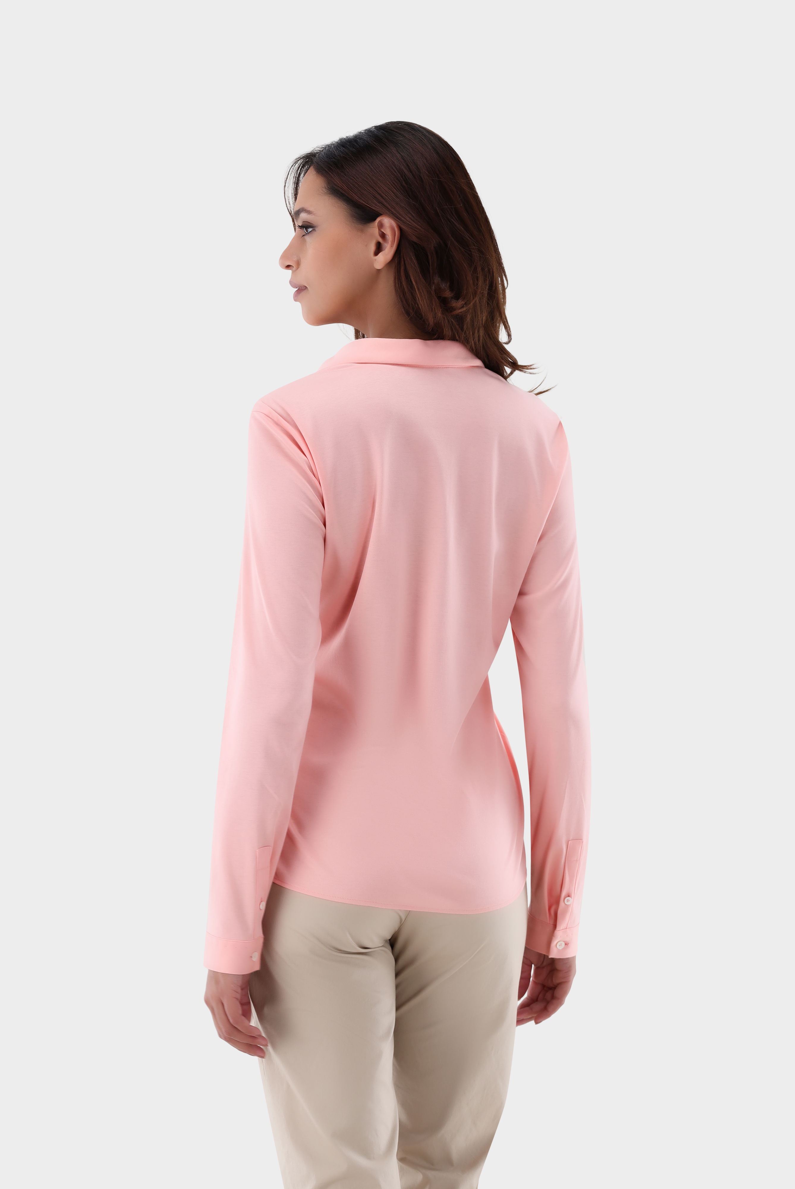 Unsere taillierte Hemdbluse mit langen Ärmeln besteht aus glattem Jersey aus Schweizer Baumwolle. Diese klassische Hemdbluse bietet einen figurbetonten Schnitt und lange Ärmel. Hergestellt aus hochwertigem und weichem Interlock-Jersey mit Natural-Stretch sorgt die Swiss Cotton Jersey Qualität für ein angenehmes Tragegefühl. Die glänzende Optik, die französische Knopfleiste und die Perlmuttknöpfe verleihen der Bluse einen edlen Touch.