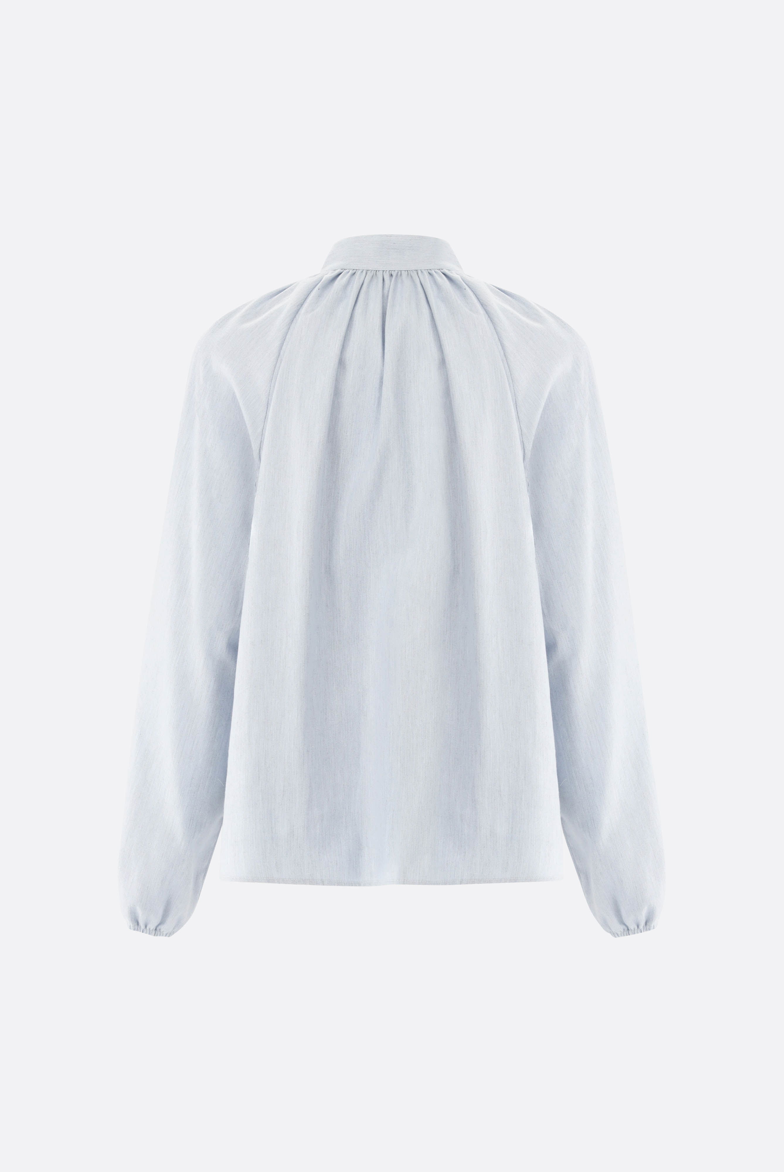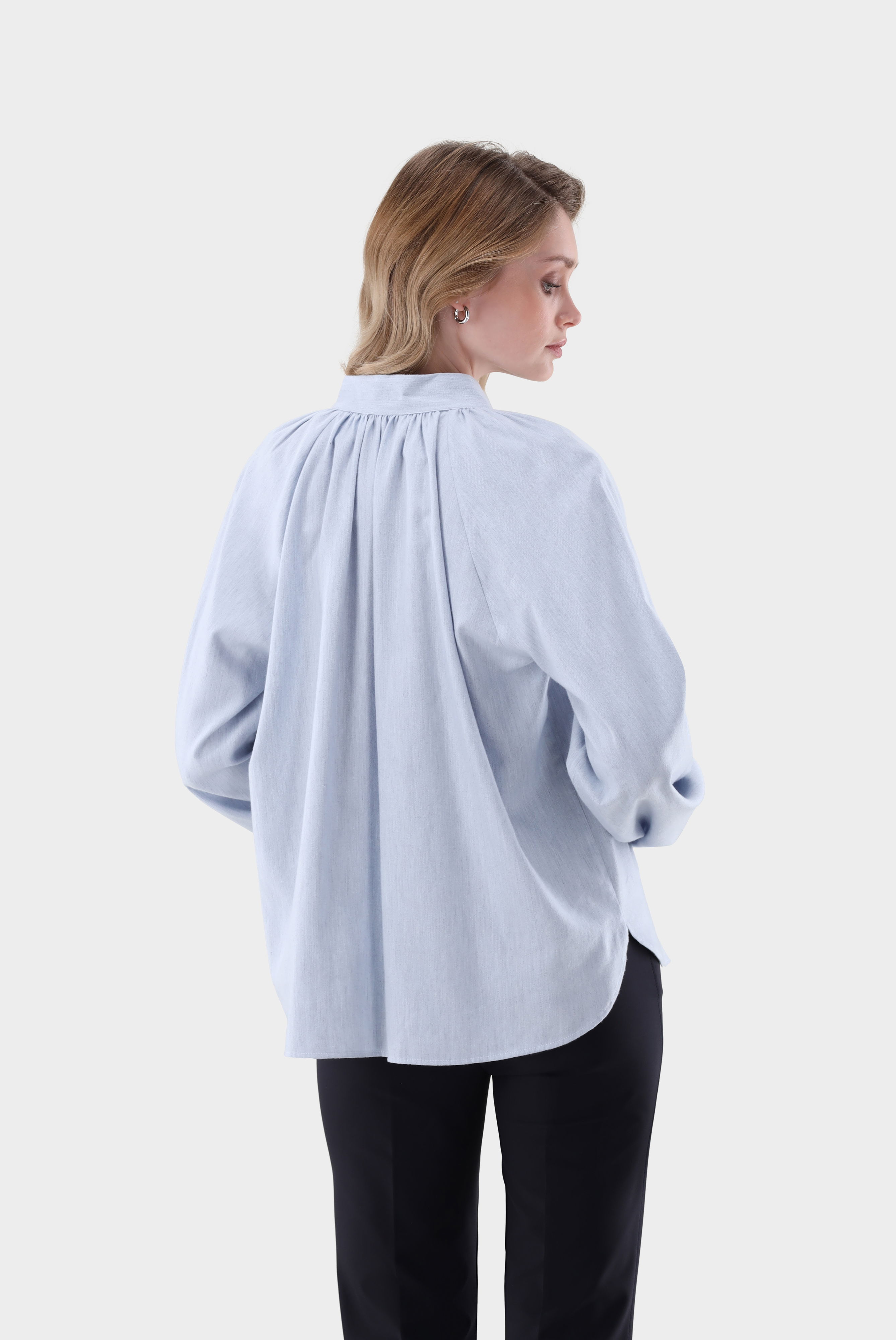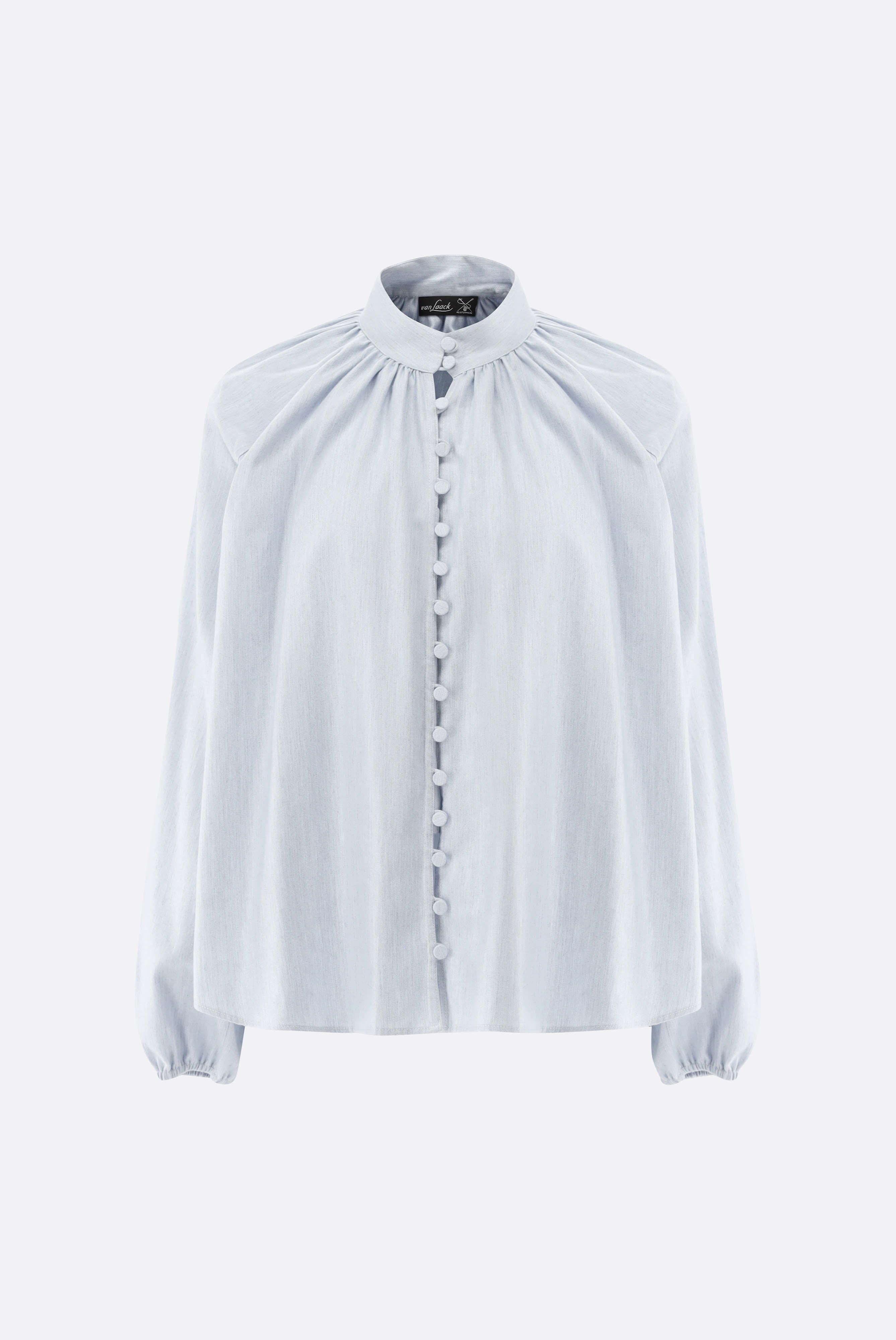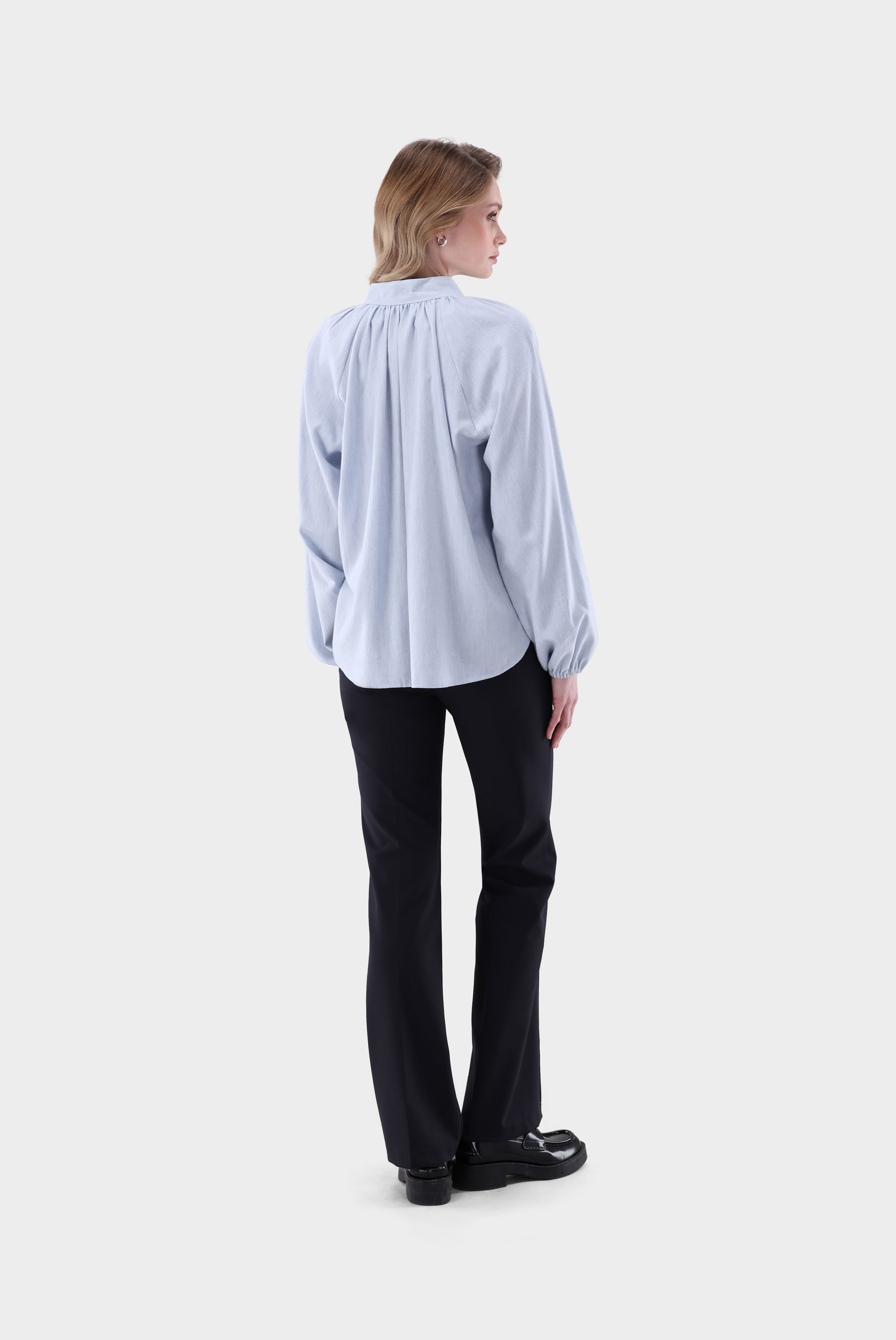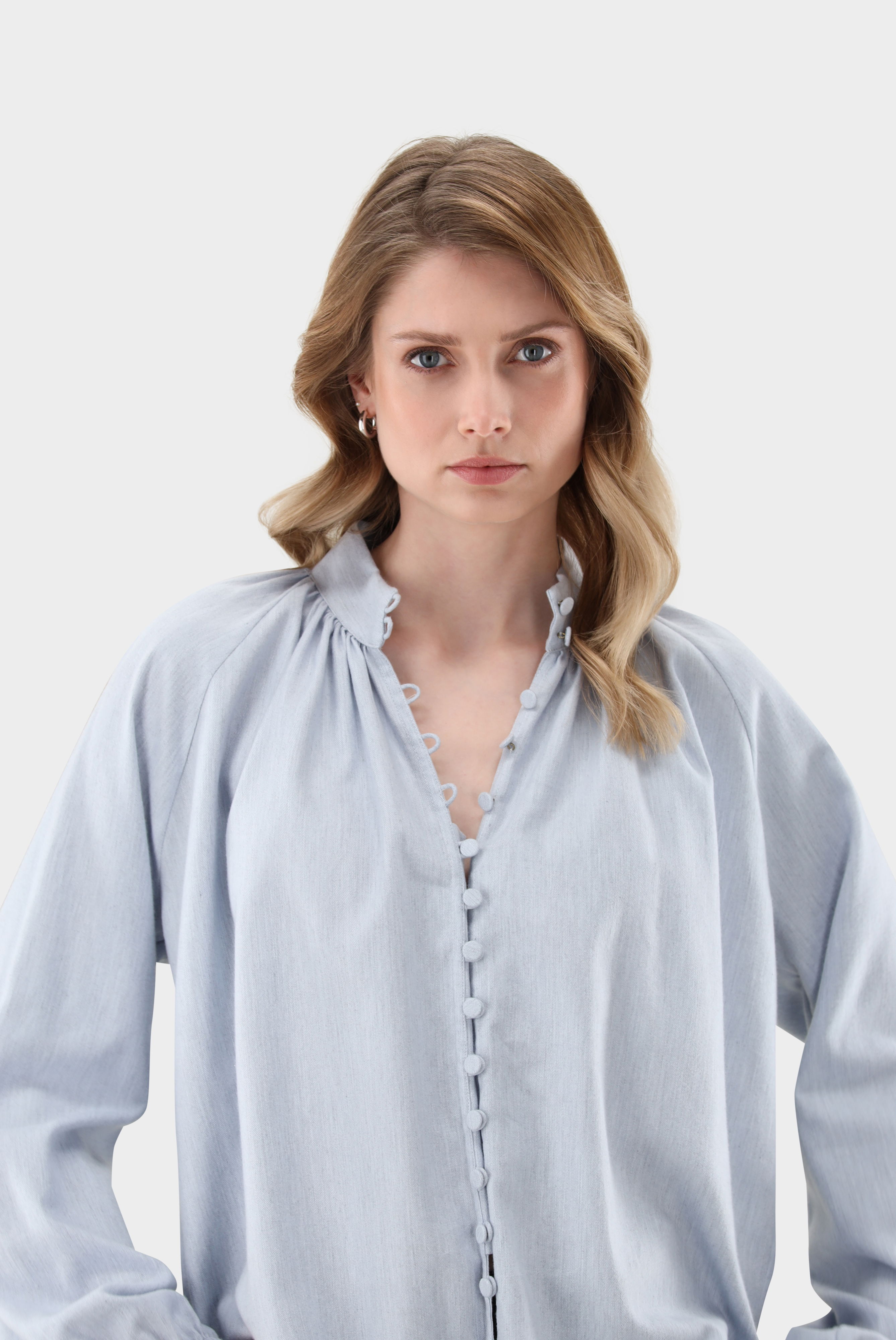 Diese weit geschnittene Bluse überzeugt mit ausgestellter Form und einem fließenden Fall. Lange, voluminöse Ärmel mit elastischen Bündchen sorgen für eine moderne Silhouette. Am Stehkragen setzen feine Raffungen elegante Akzente, während überzogene Knöpfe mit Schlaufenverschluss ein harmonisches Gesamtbild abrunden. Gefertigt aus superweichem Fischgrät-Flanell in einer hochwertigen Baumwoll-Lyocell-Mischung, bietet das Modell angenehmen Tragekomfort und eignet sich ideal für vielseitige Kombinationen im Alltag und Büro.