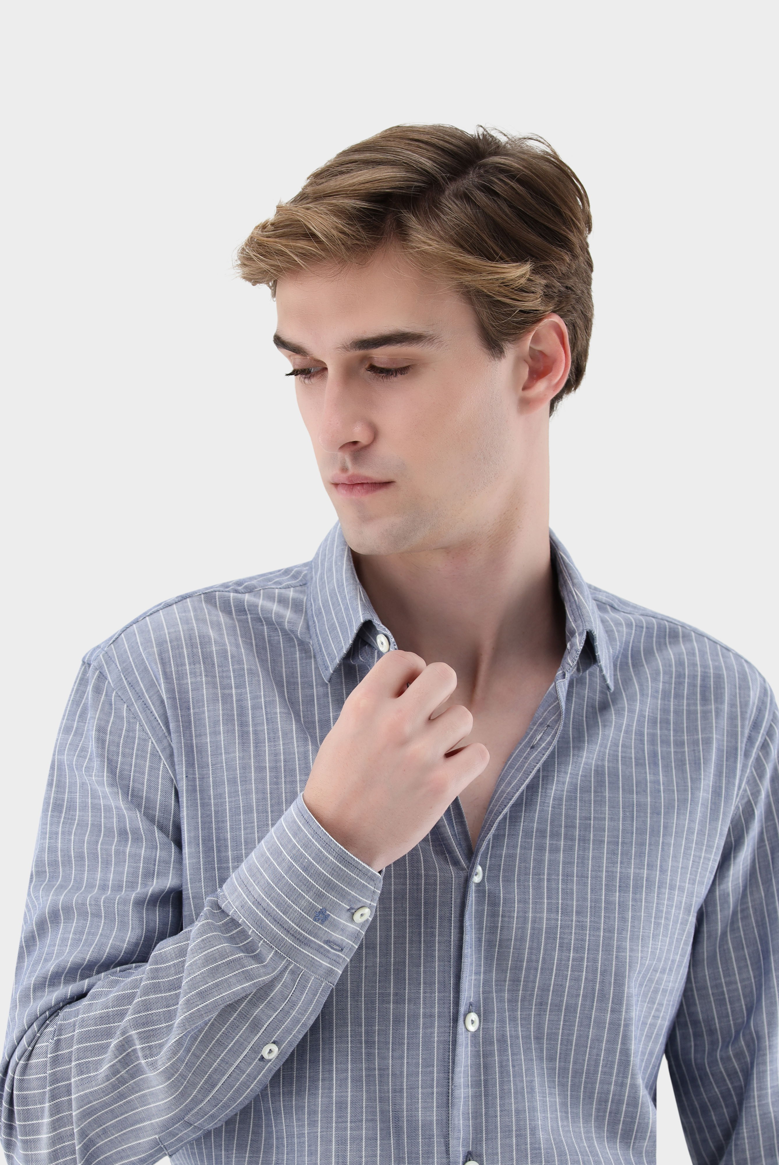 Dieses Slim-Fit-Hemd aus sommerlicher Baumwoll-Twill-Qualität überzeugt durch seine feine Pinstripe-Optik und den leicht gewaschenen Look für moderne Lässigkeit. Der klassische Kent-Kragen und hochwertige Perlmuttknöpfe unterstreichen die elegante Verarbeitung. Das atmungsaktive Material bietet angenehmen Tragekomfort und eine gepflegte Silhouette. Vielseitig kombinierbar, eignet sich das Hemd ideal für Business- und Smart-Casual-Looks mit sommerlicher Frische und zeitloser, stilvoller Ausstrahlung.