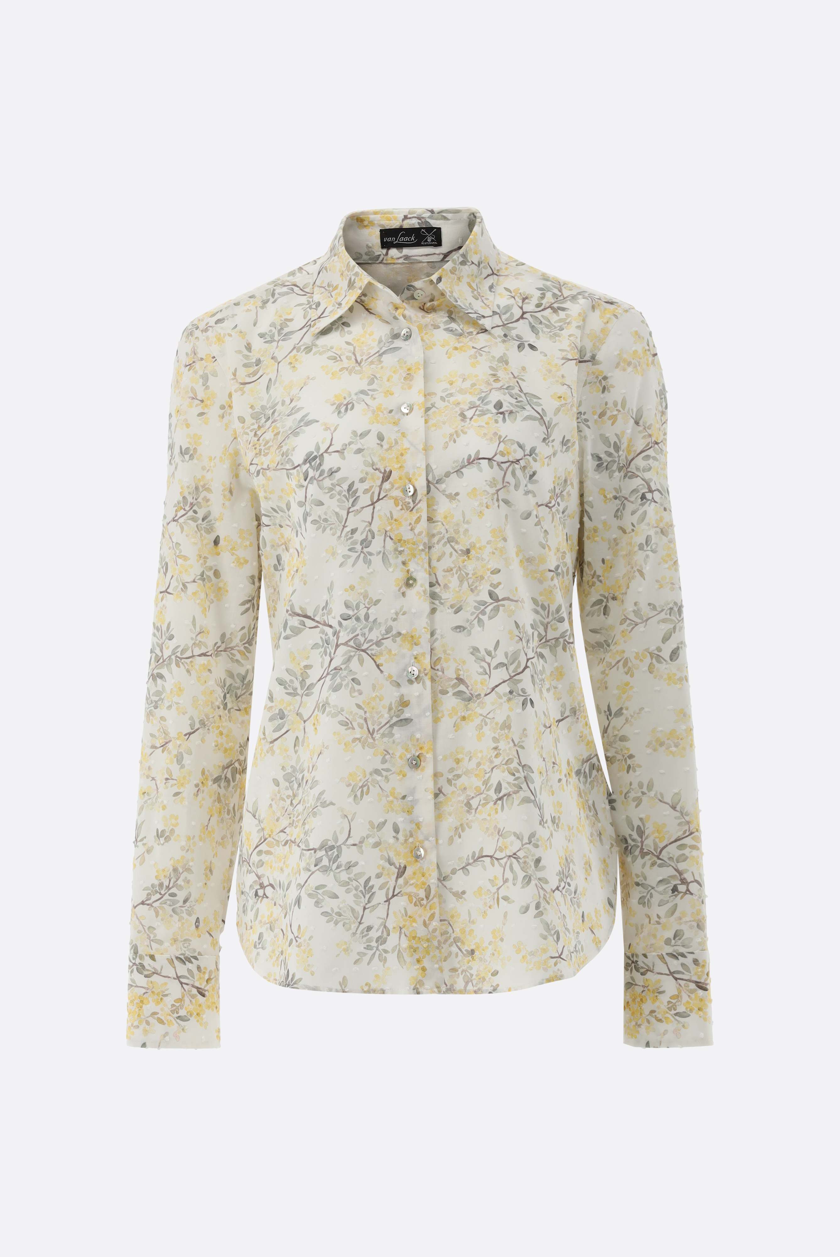 Die semi-taillierte Bluse aus leichtem Baumwoll-Plumetis verbindet feminine Eleganz mit hohem Tragekomfort. Plumetis, ein feiner Baumwoll-Batist mit kleinen, erhabenen Punkten, erinnert an Federn oder Wolken und verleiht dem Stoff eine einzigartige Struktur. Perlmuttknöpfe und lange Ärmel machen die Bluse zu einem vielseitigen Begleiter für Casual- und Business-Looks.