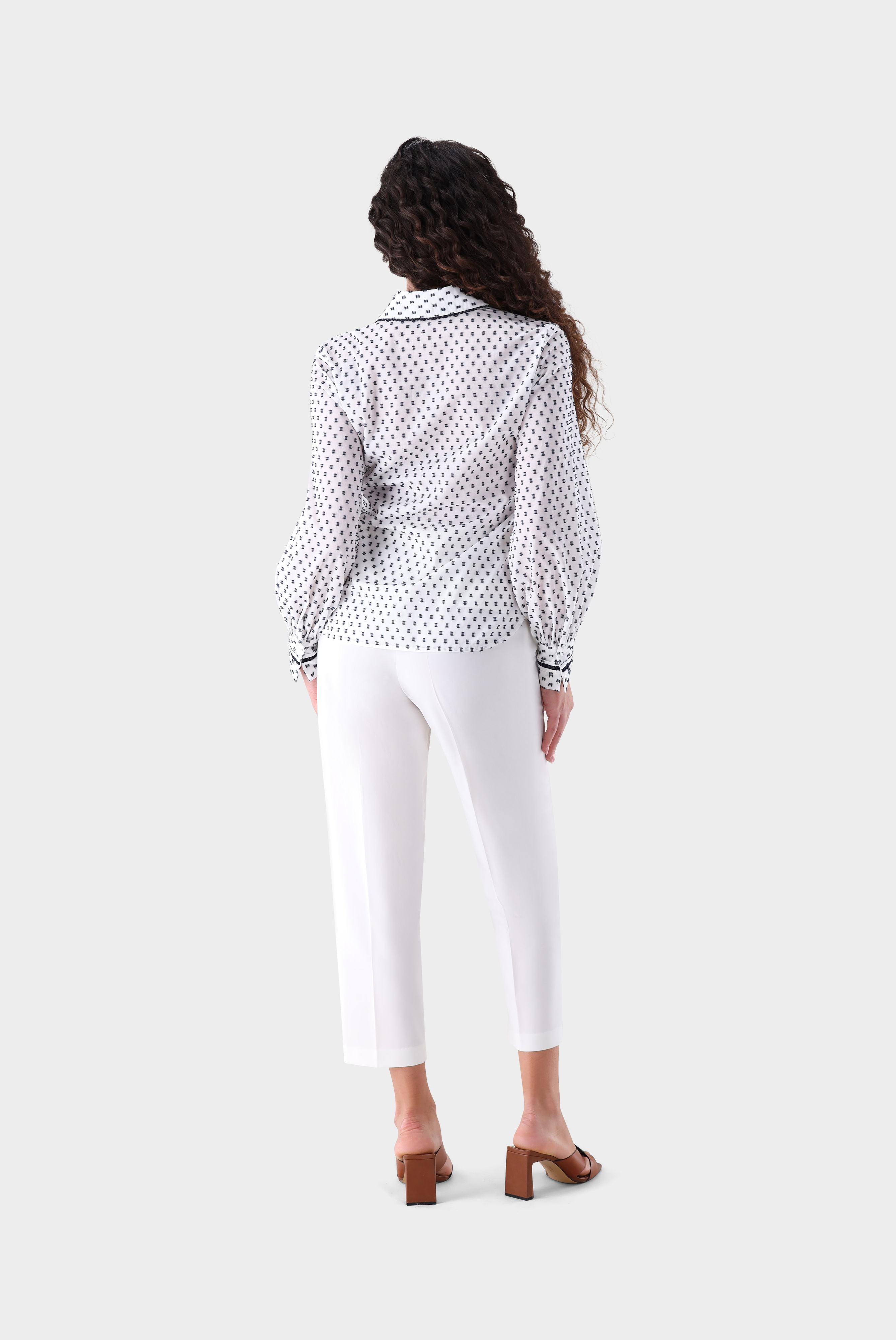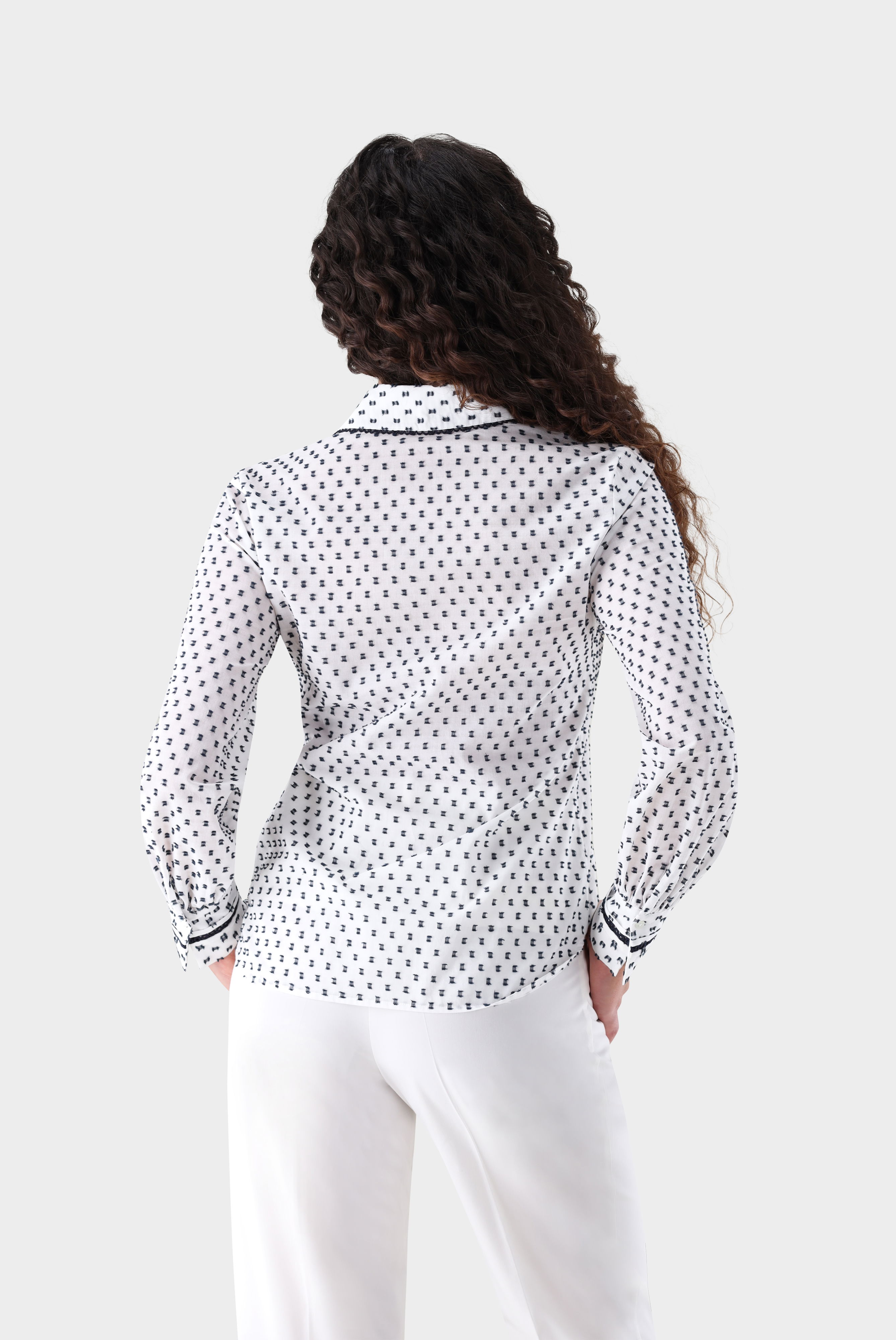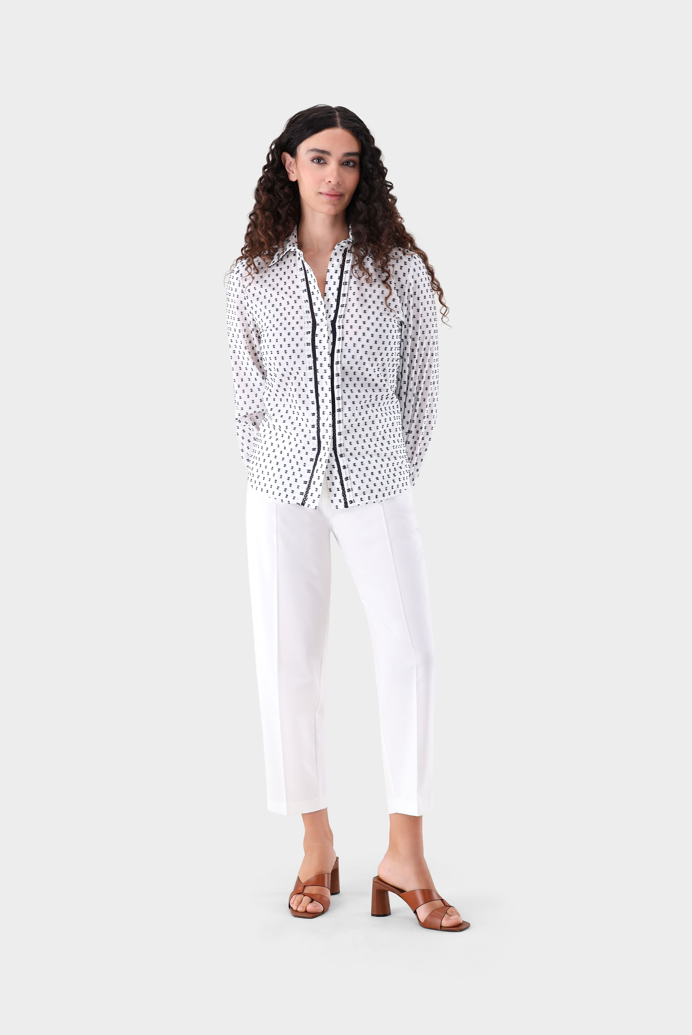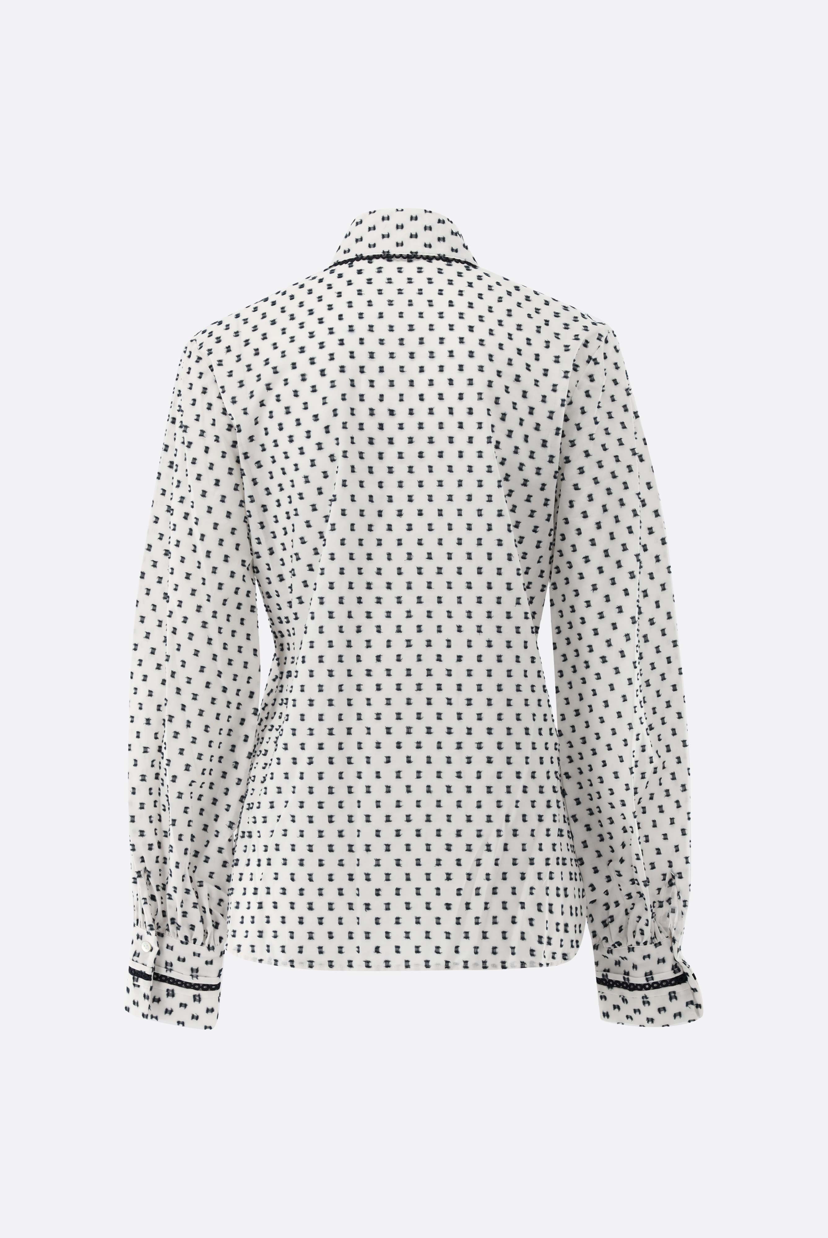 Diese leicht taillierte Hemdbluse überzeugt durch feminine Details und hochwertige Verarbeitung. Lange Ärmel mit gerafften Manschetten, feine Spitzeneinsätze und dezente Faltenverzierungen verleihen dem Modell Struktur und Eleganz. Gefertigt aus weichem Baumwollbatist mit kontrastierendem Plumetis bietet die Bluse ein angenehmes Tragegefühl und eine edle Optik. Ideal für stilvolle Business- und Casual-Looks sowie besondere Anlässe, bei denen ein moderner, femininer Auftritt gewünscht ist.