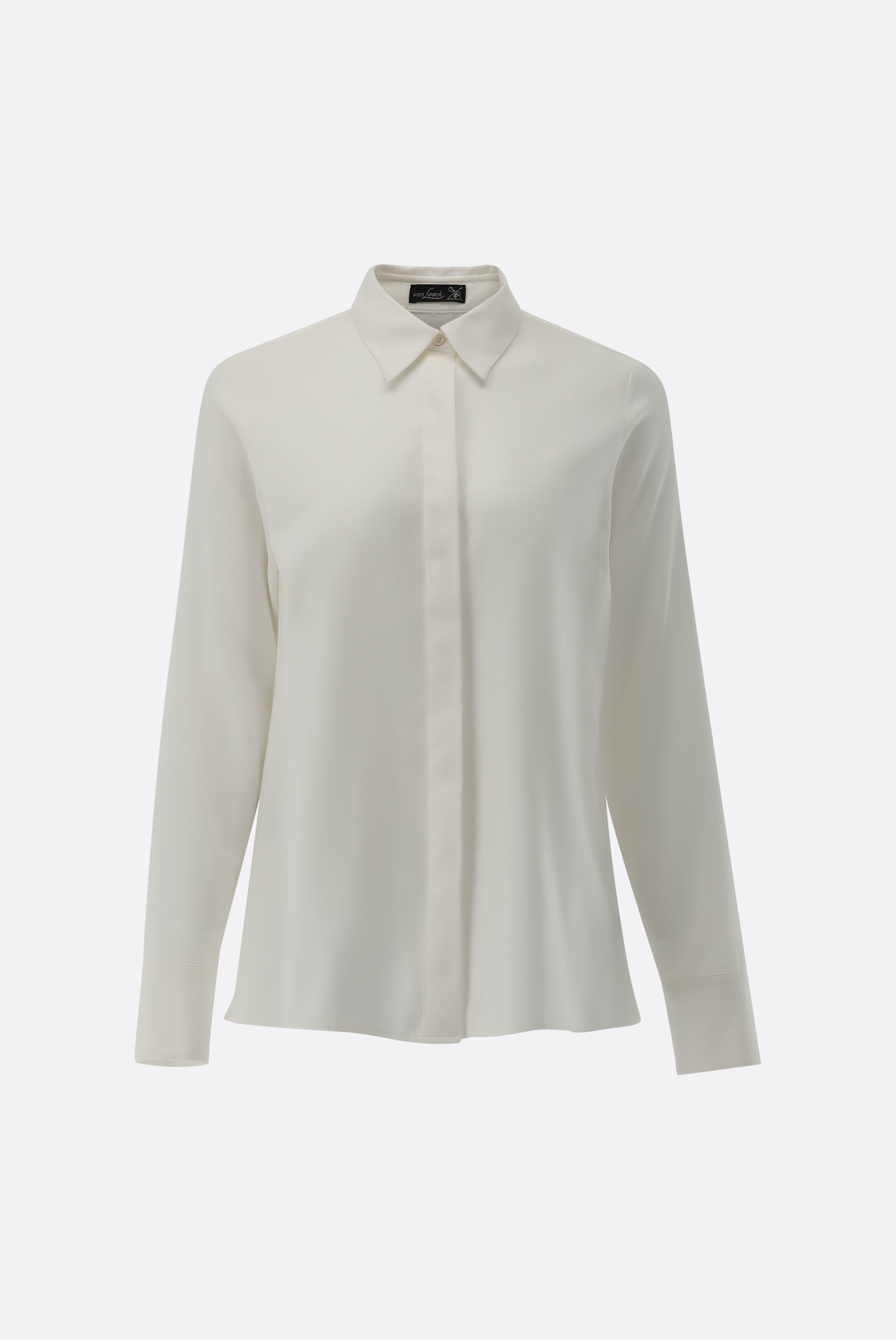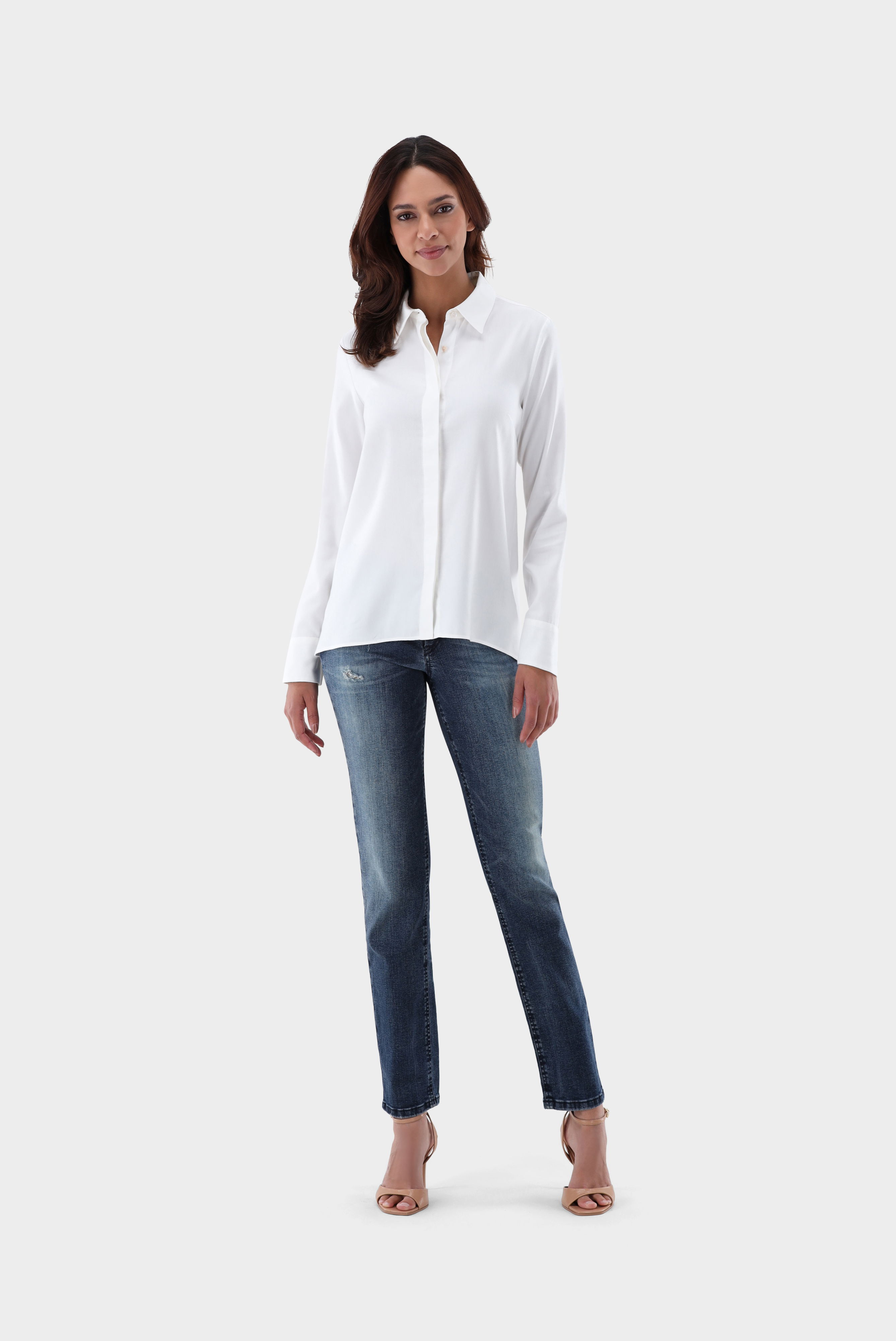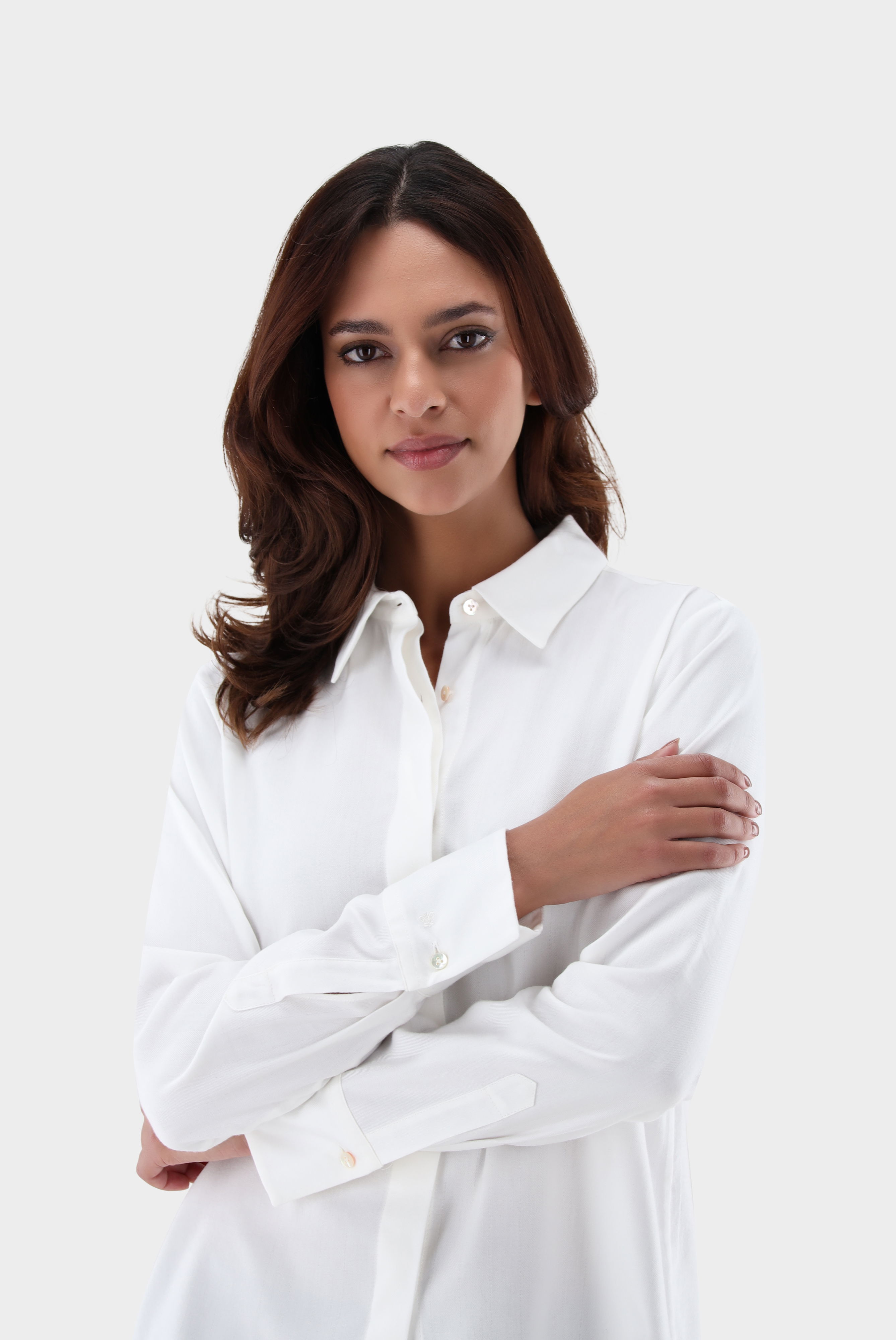 Leicht ausgestellte Hemdbluse mit langen Ärmeln und leicht ausgestelltem Saum. Hergestellt mit Baumwolle und Lyocell in gewebtem Flanell. Die Bluse bietet eine verdeckte Knopfleiste mit Perlmuttknöpfen, sowie einen klassischen Hemdblusenkragen.