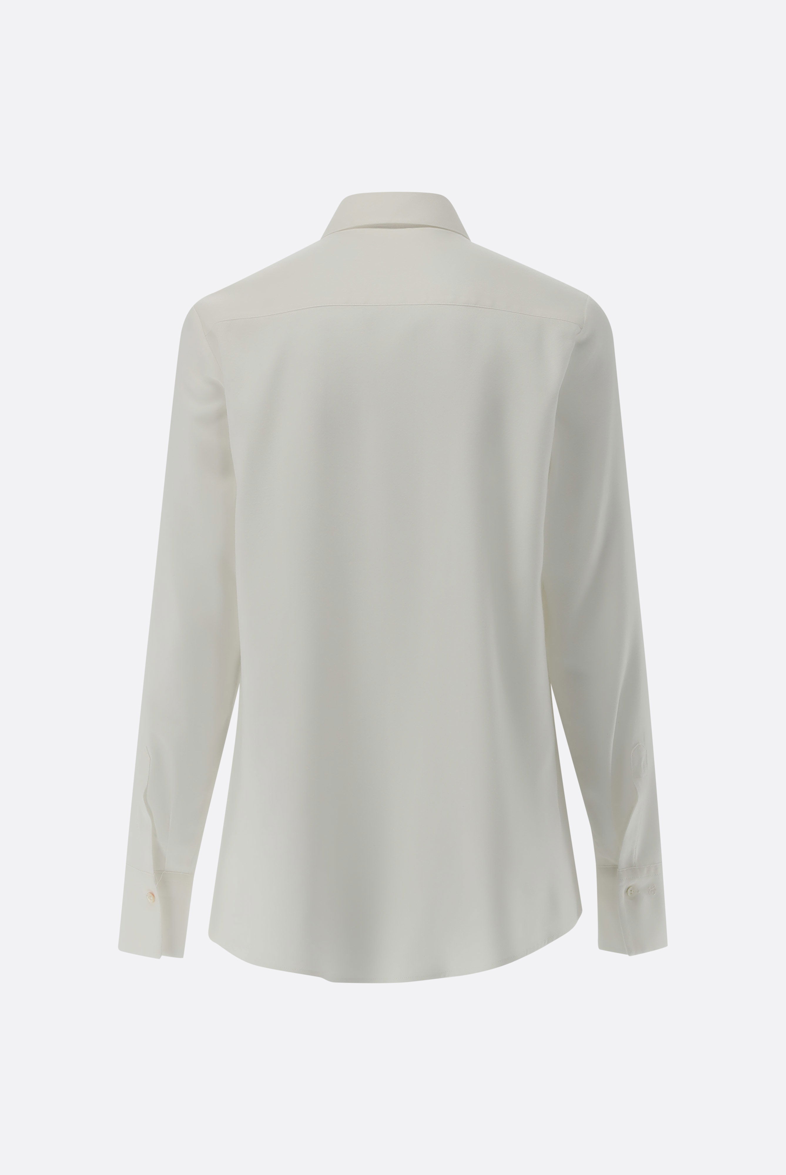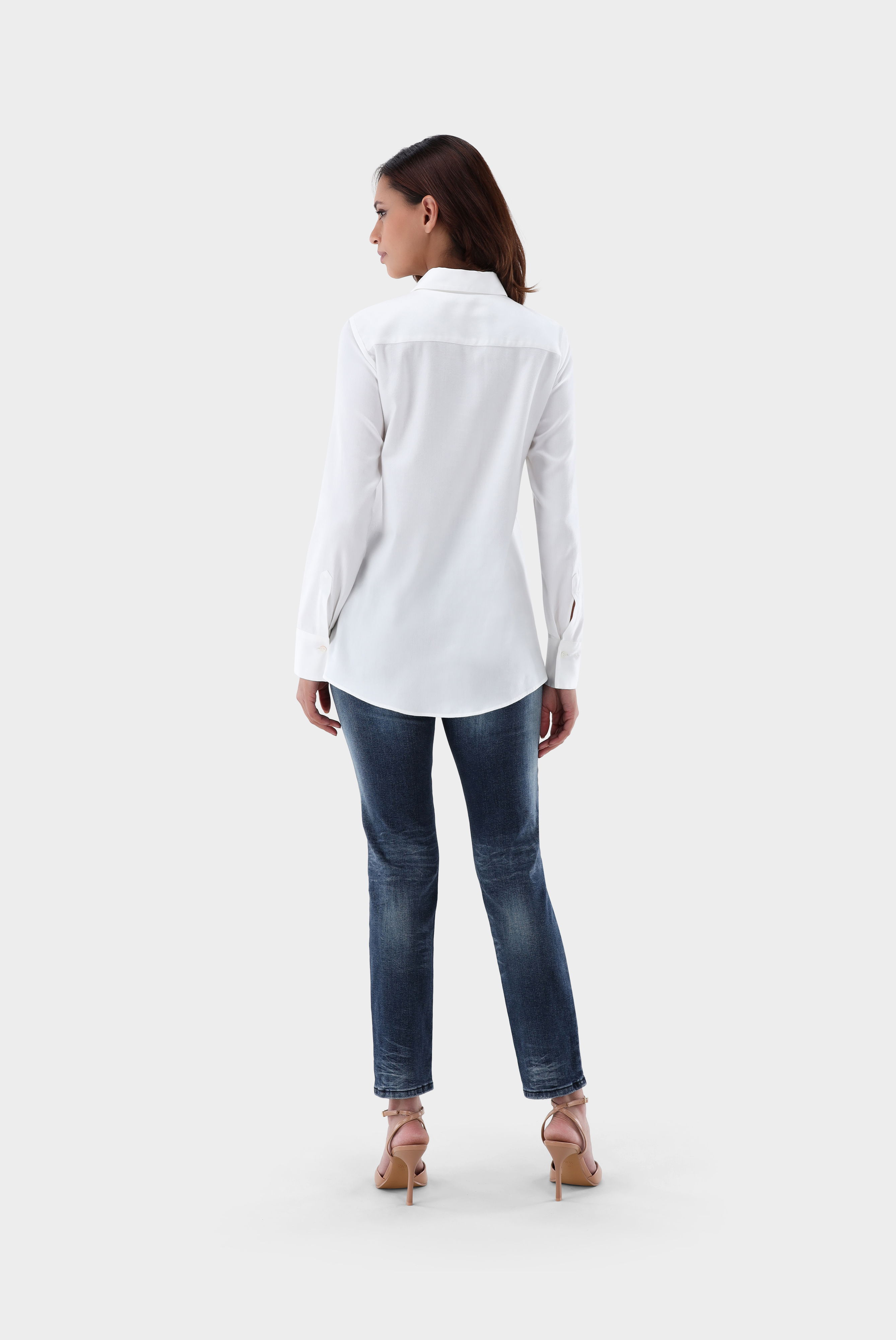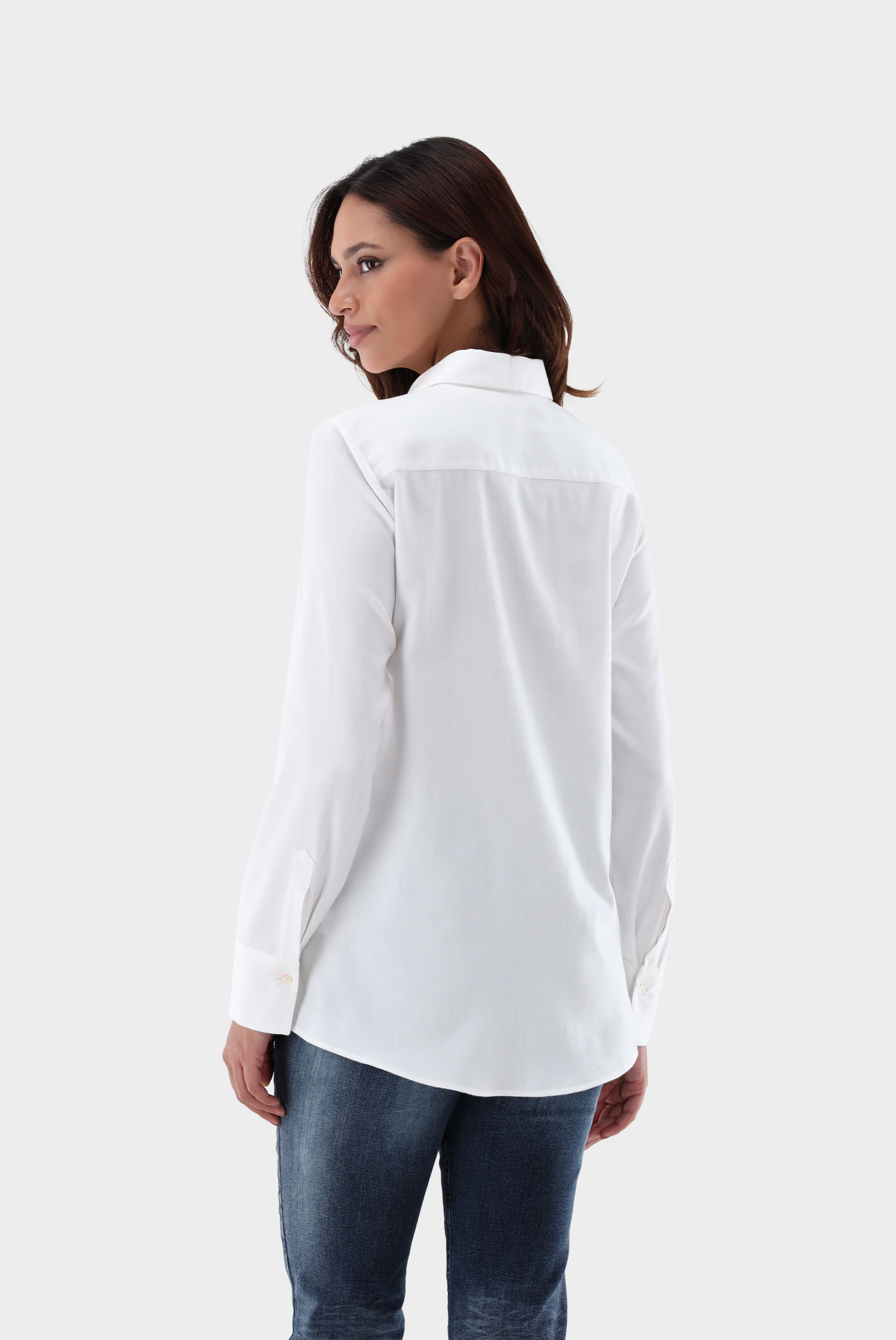 Leicht ausgestellte Hemdbluse mit langen Ärmeln und leicht ausgestelltem Saum. Hergestellt mit Baumwolle und Lyocell in gewebtem Flanell. Die Bluse bietet eine verdeckte Knopfleiste mit Perlmuttknöpfen, sowie einen klassischen Hemdblusenkragen.