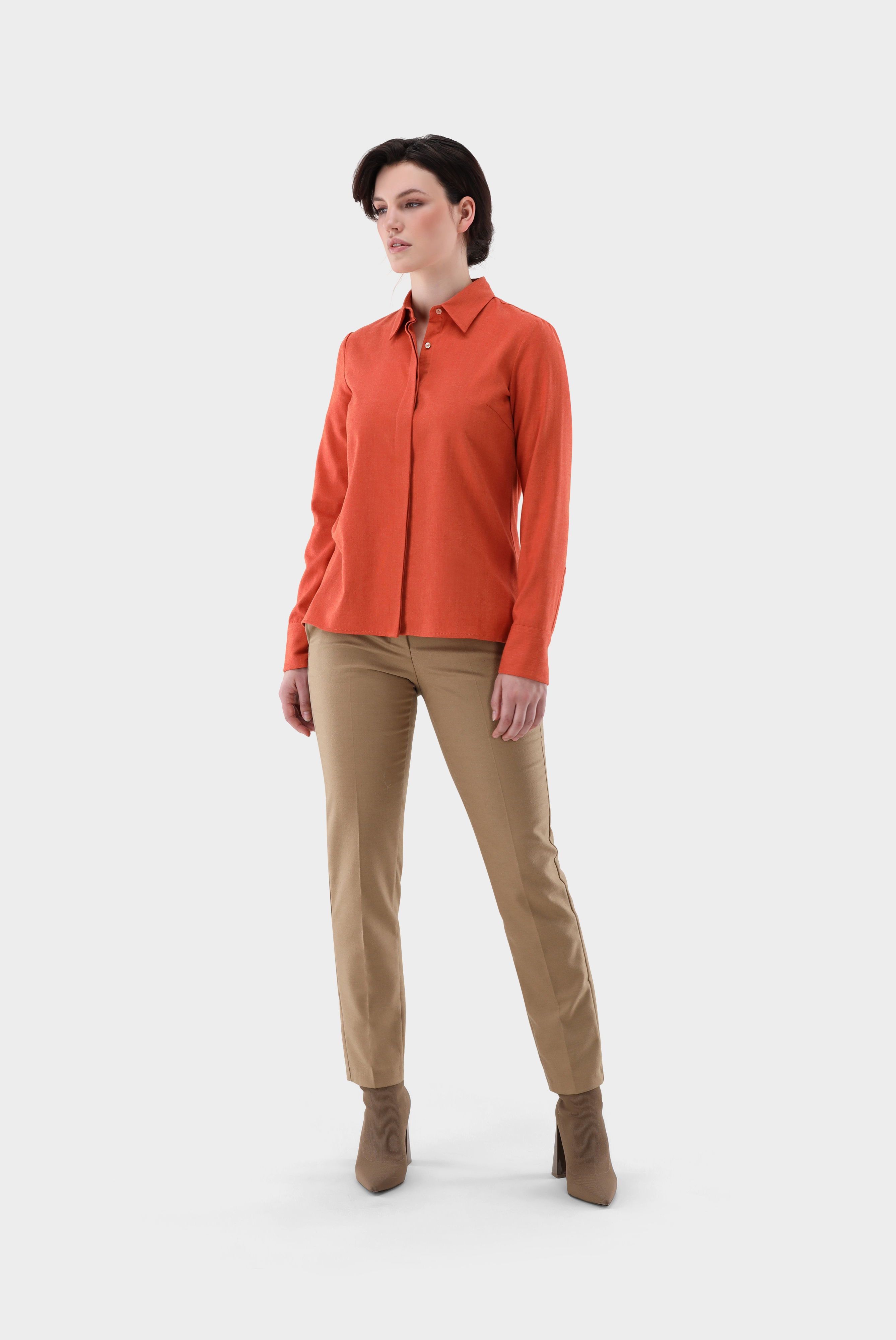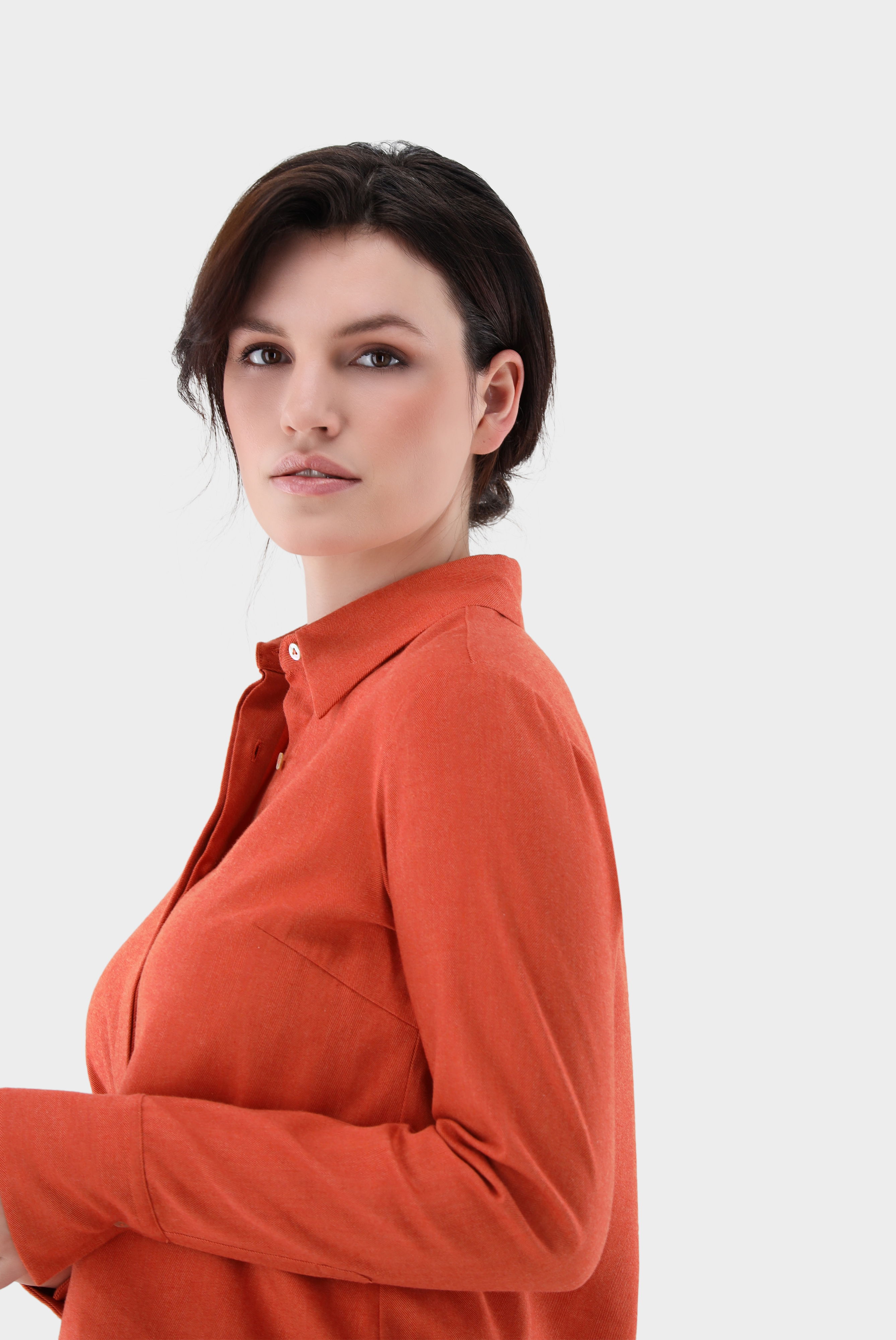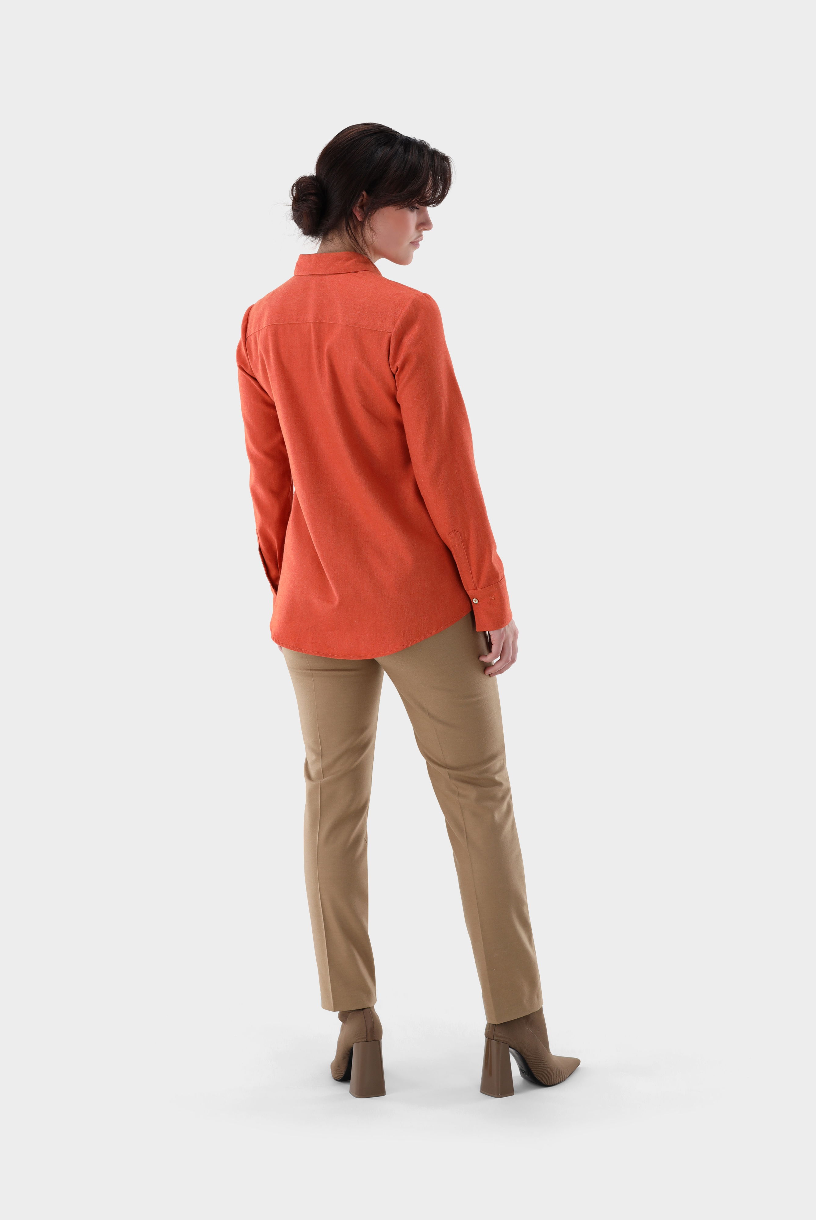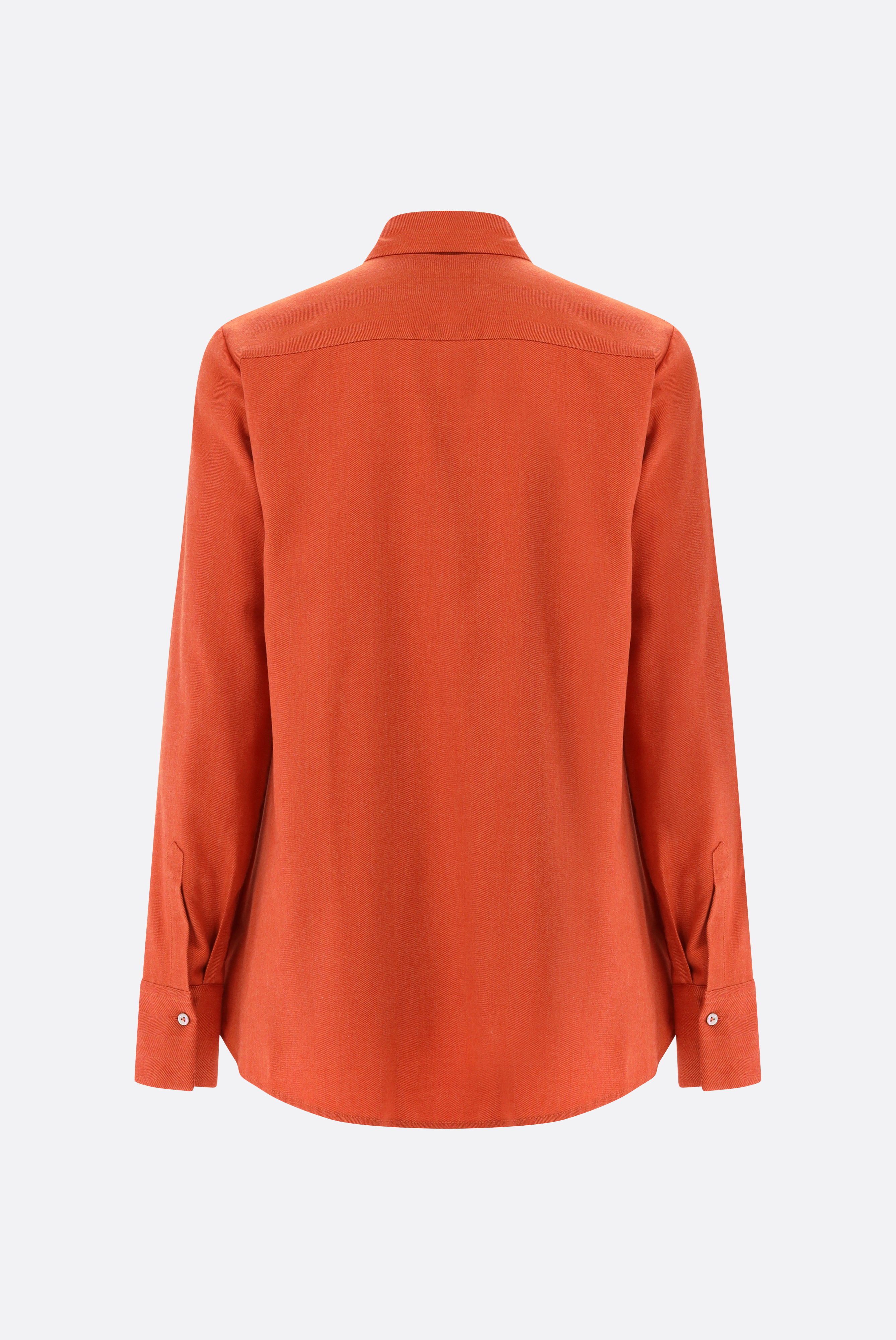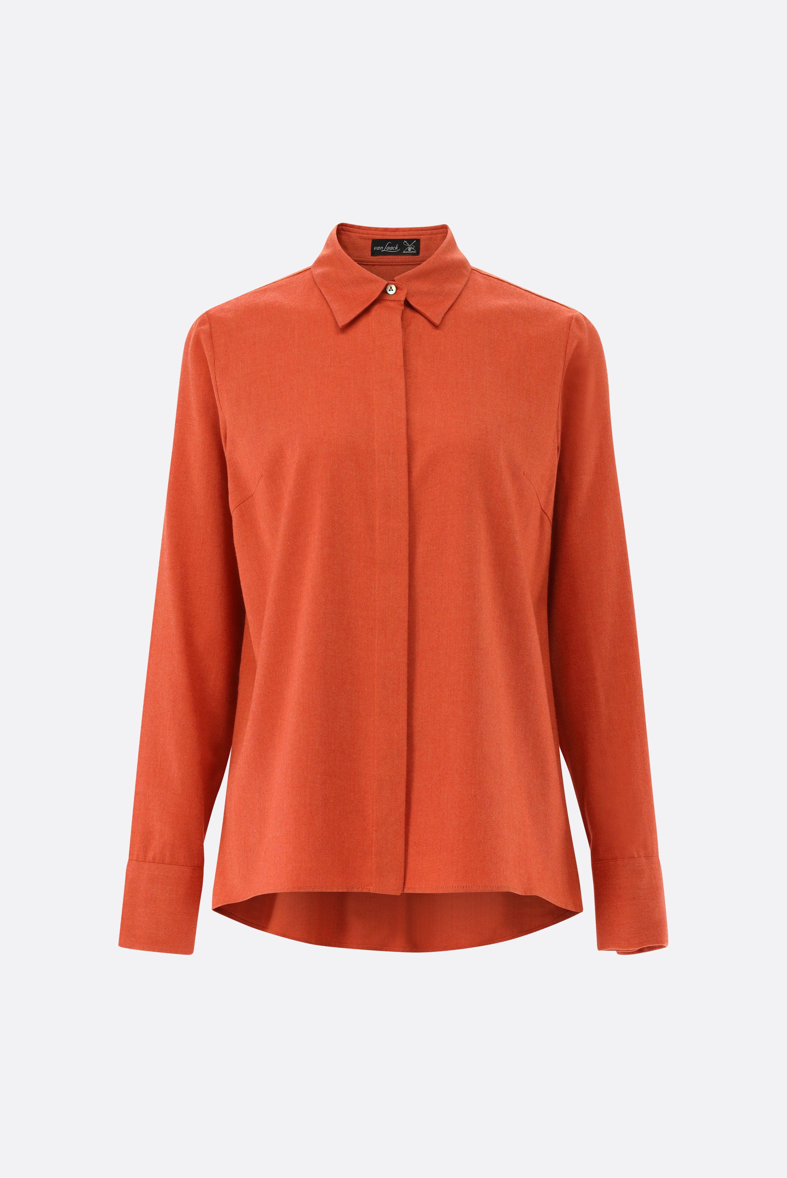 Leicht ausgestellte Hemdbluse mit langen Ärmeln und leicht ausgestelltem Saum. Hergestellt mit Baumwolle und Lyocell in gewebtem Flanell. Die Bluse bietet eine verdeckte Knopfleiste mit Perlmuttknöpfen, sowie einen klassischen Hemdblusenkragen.