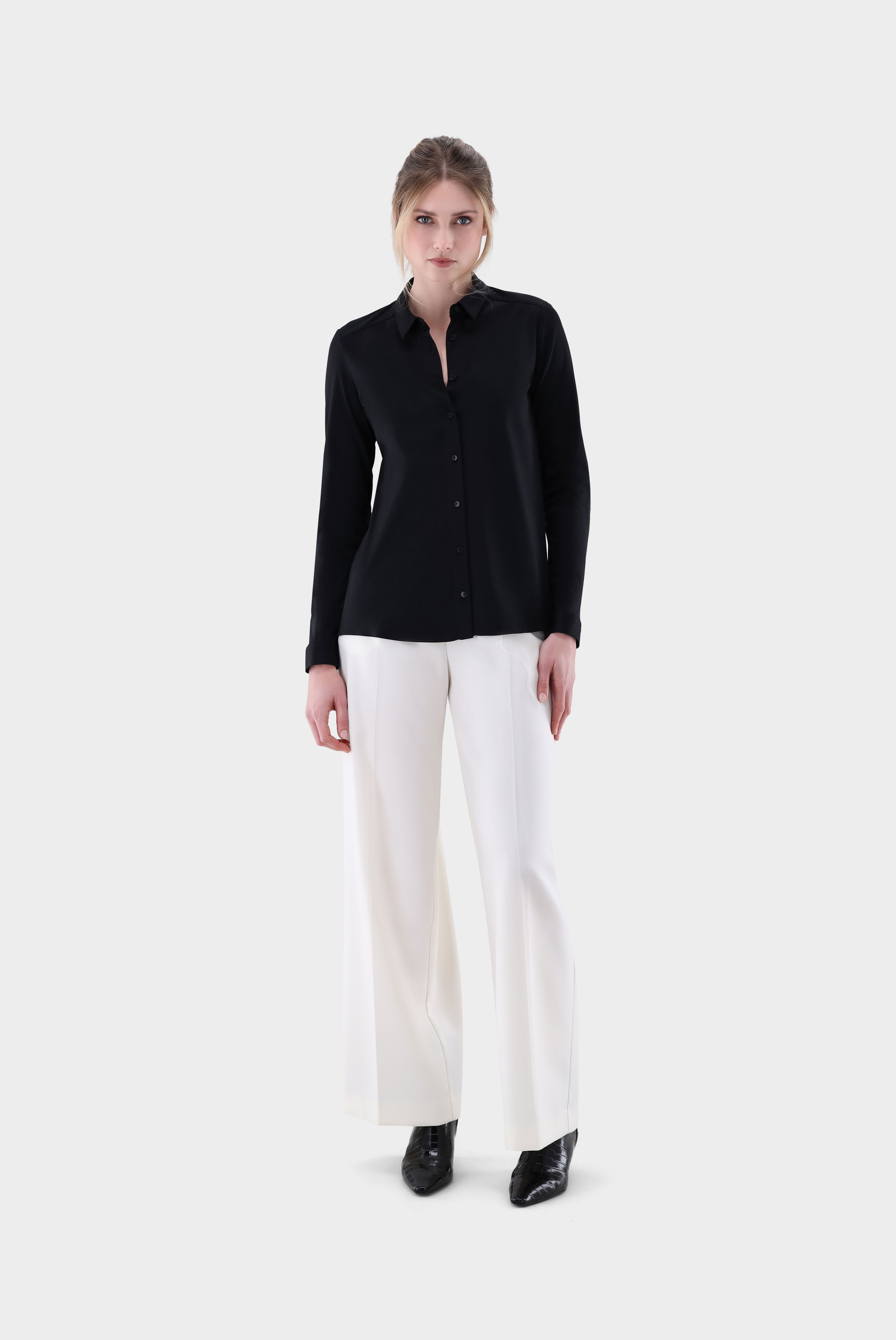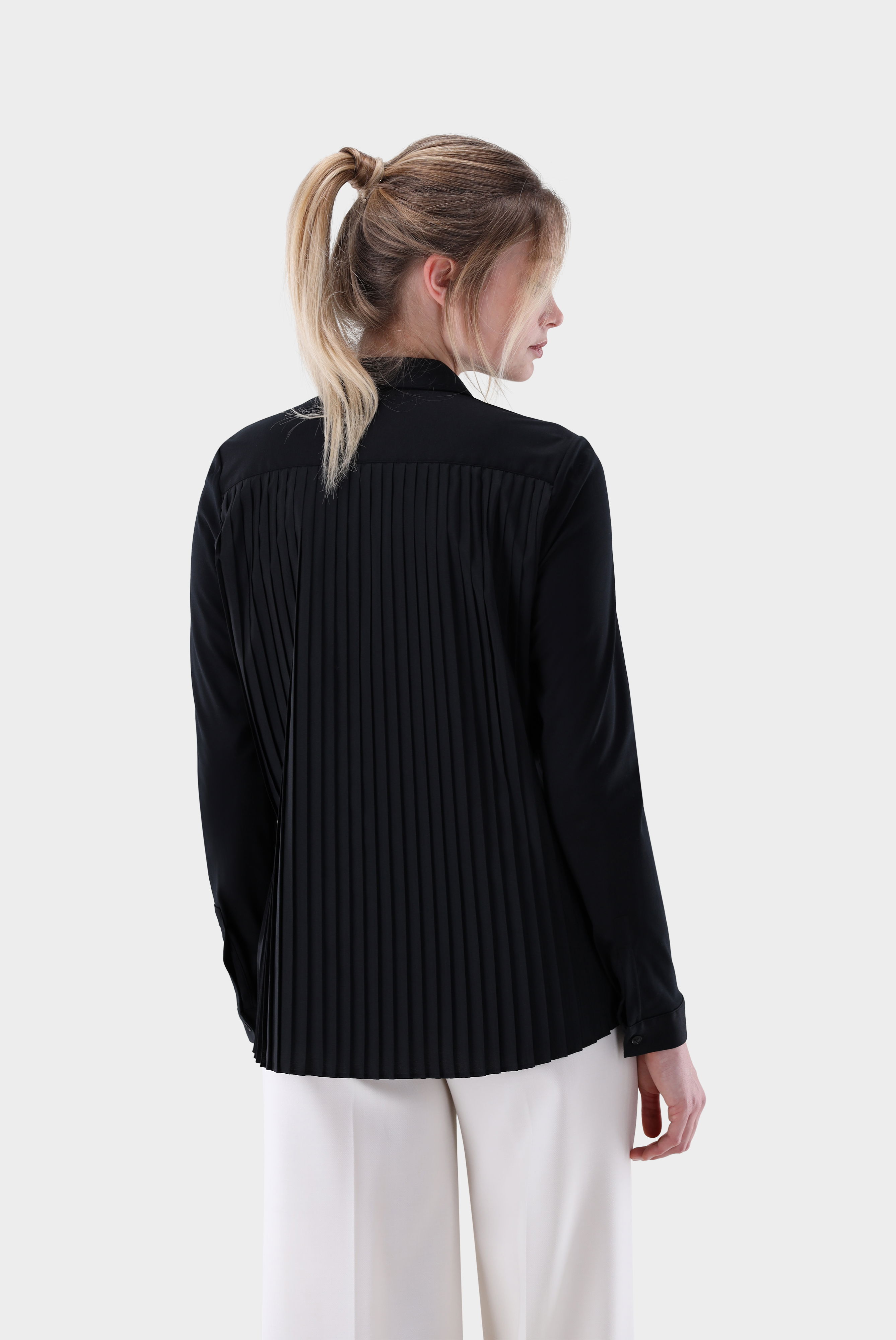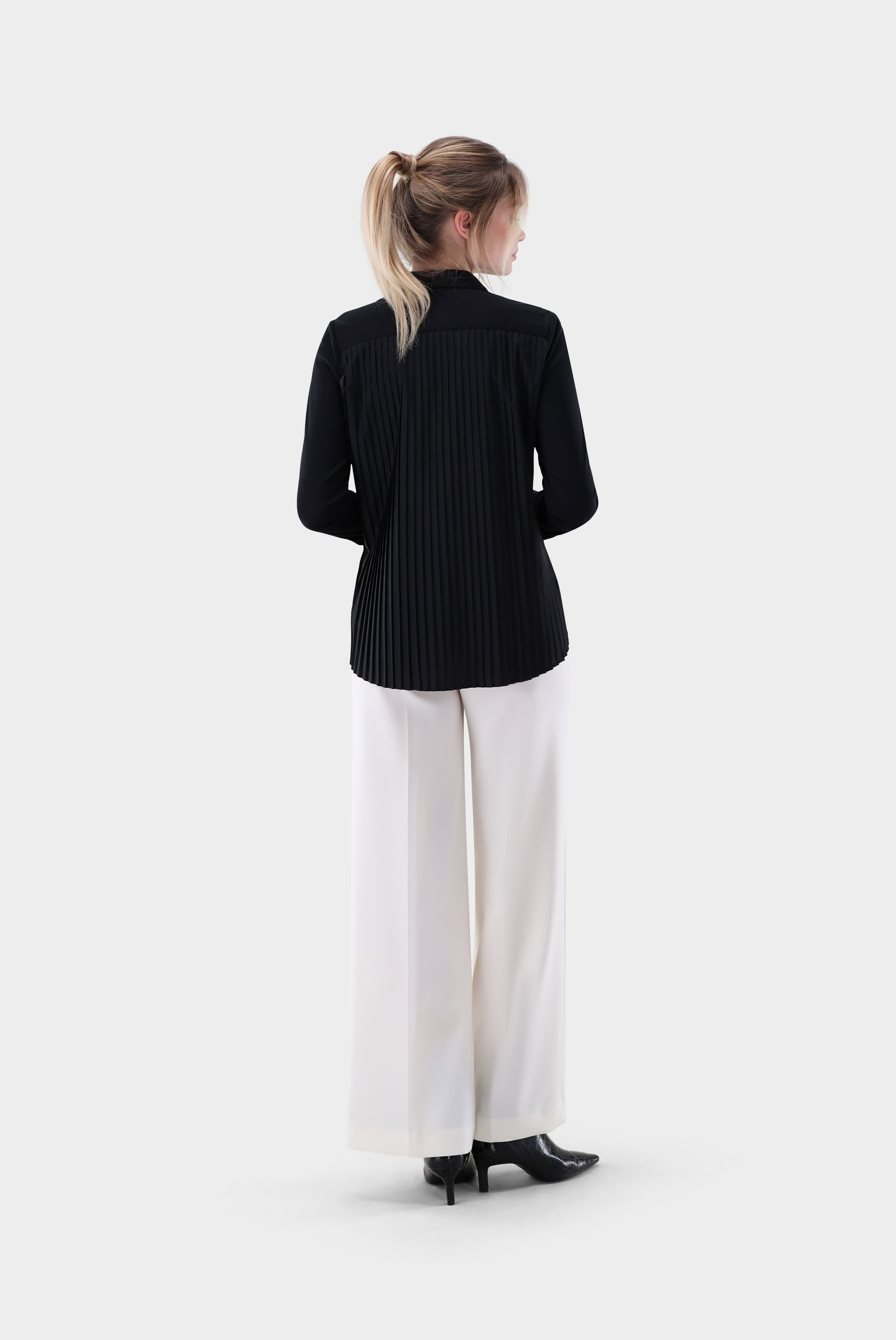 Look aus Hemdbluse aus Jersey mit Plisseerücken