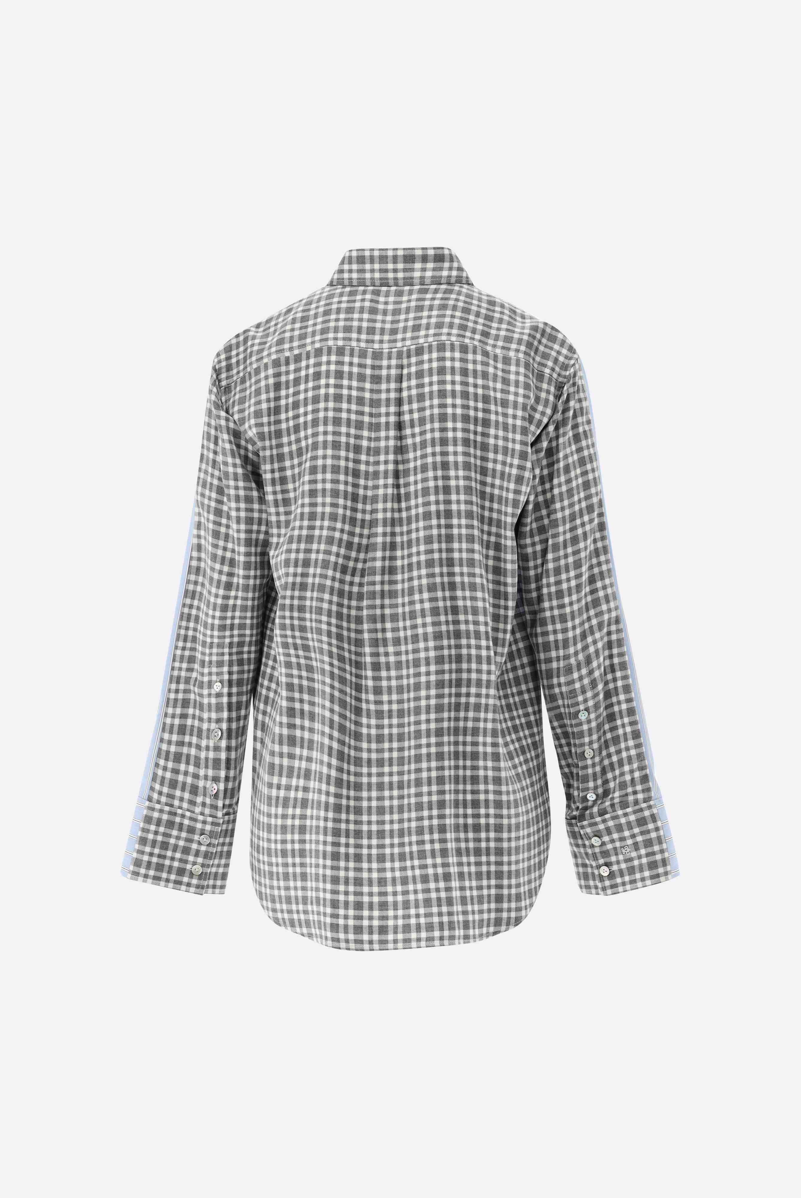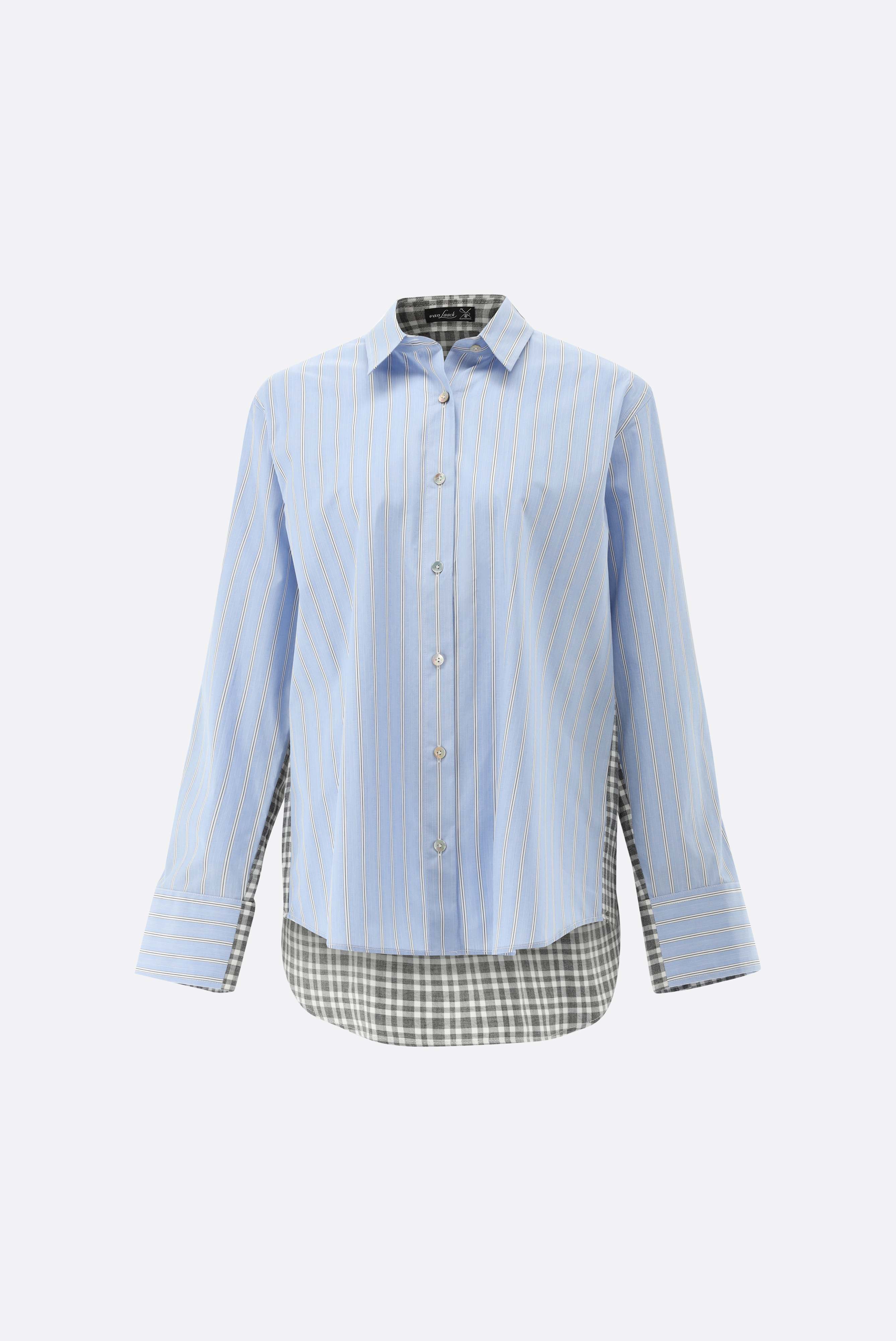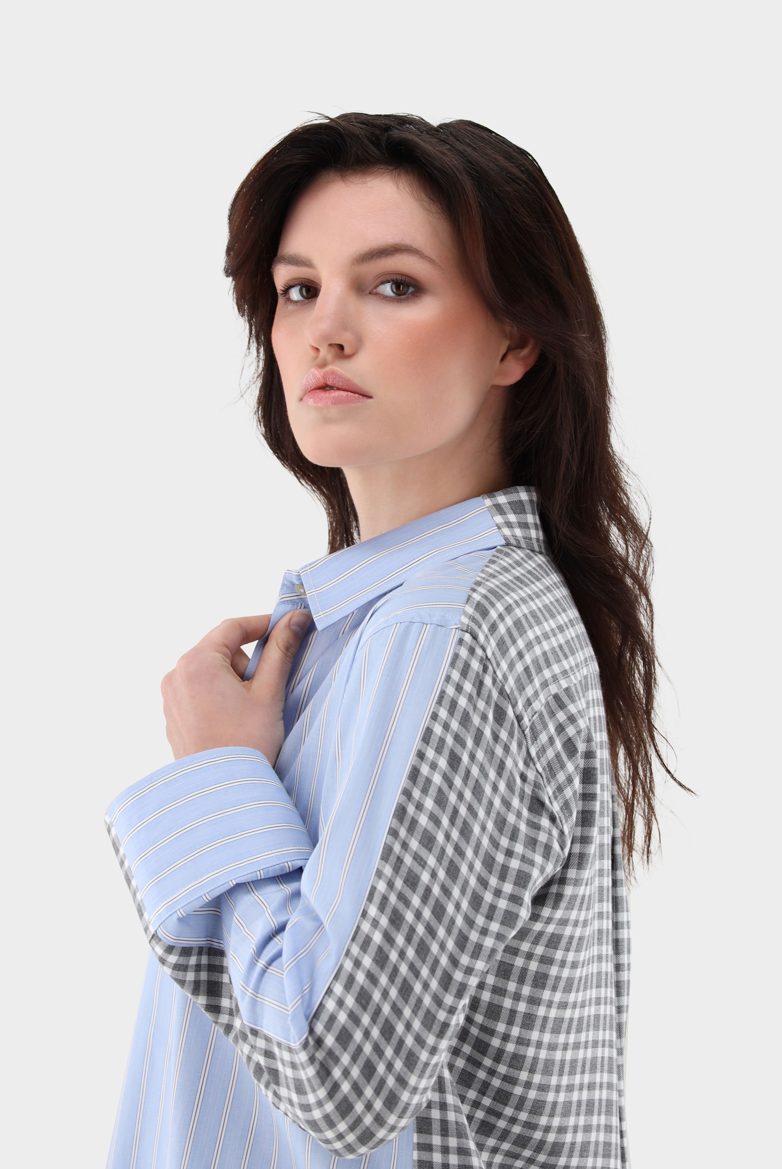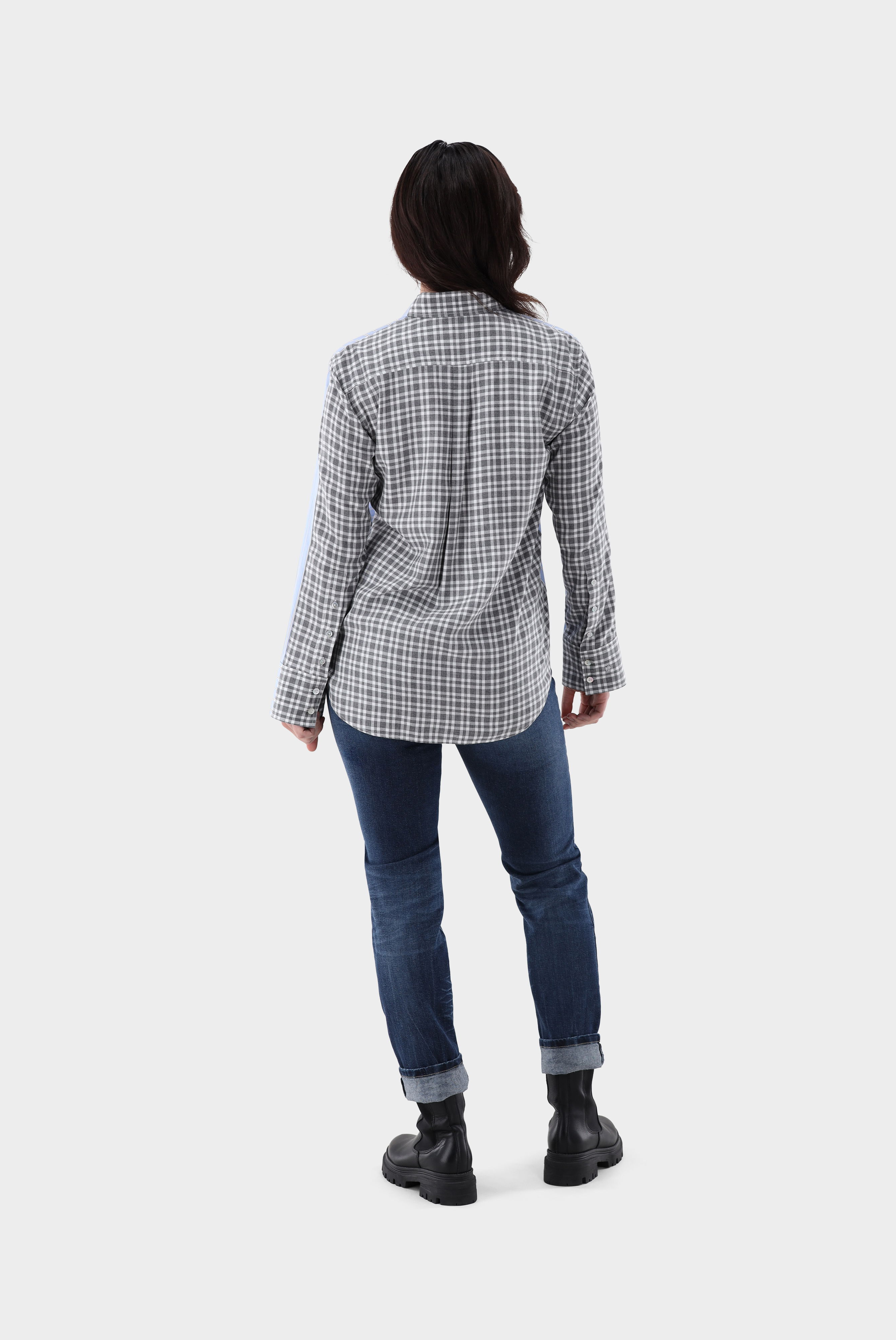Look aus Hemdbluse aus kontrastierenden Stoffen