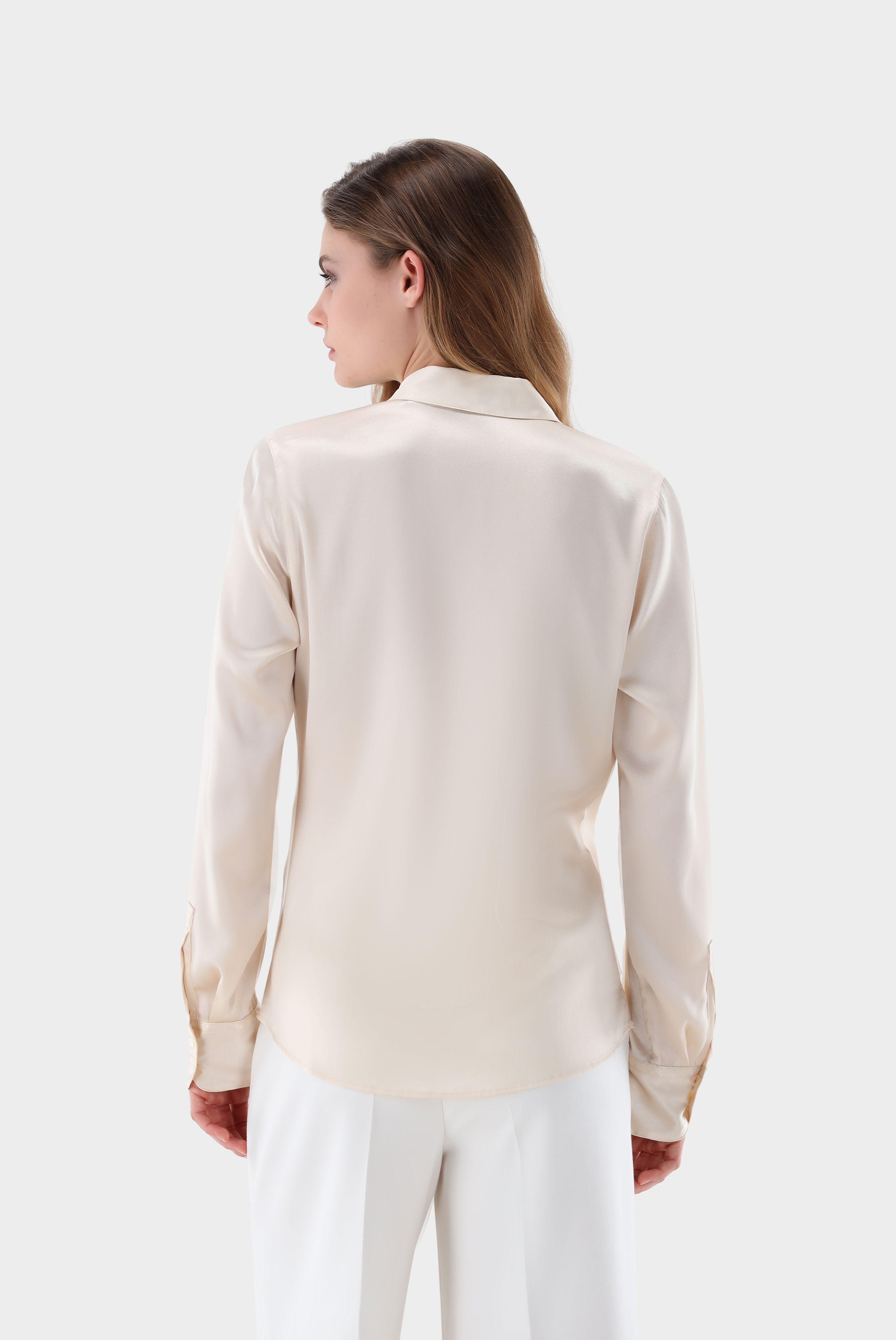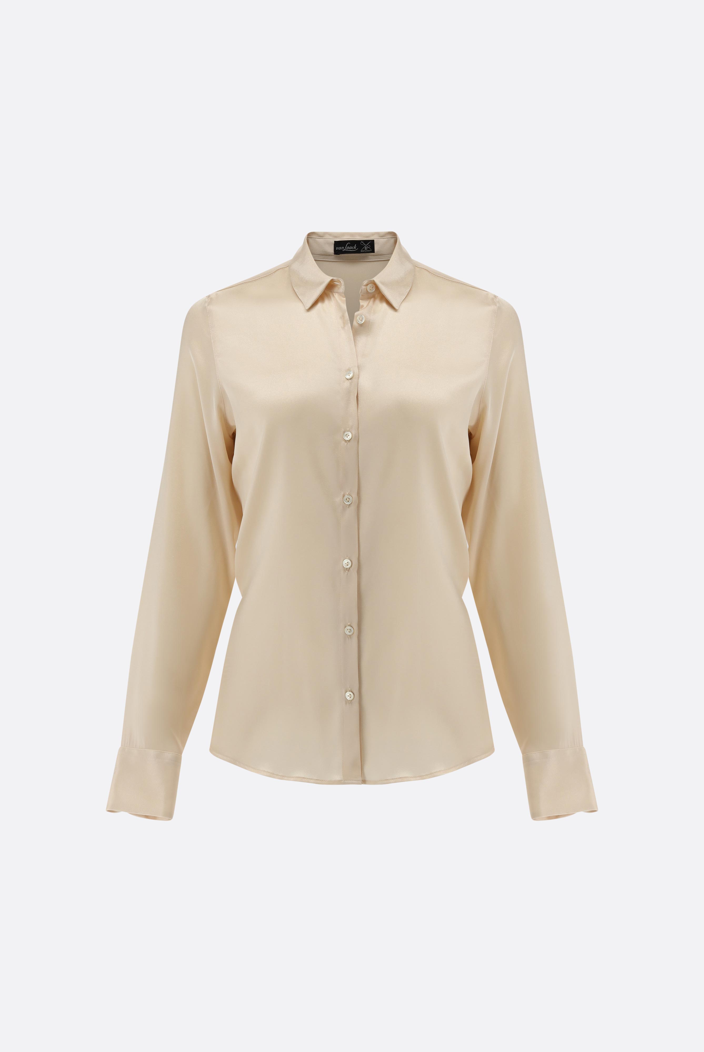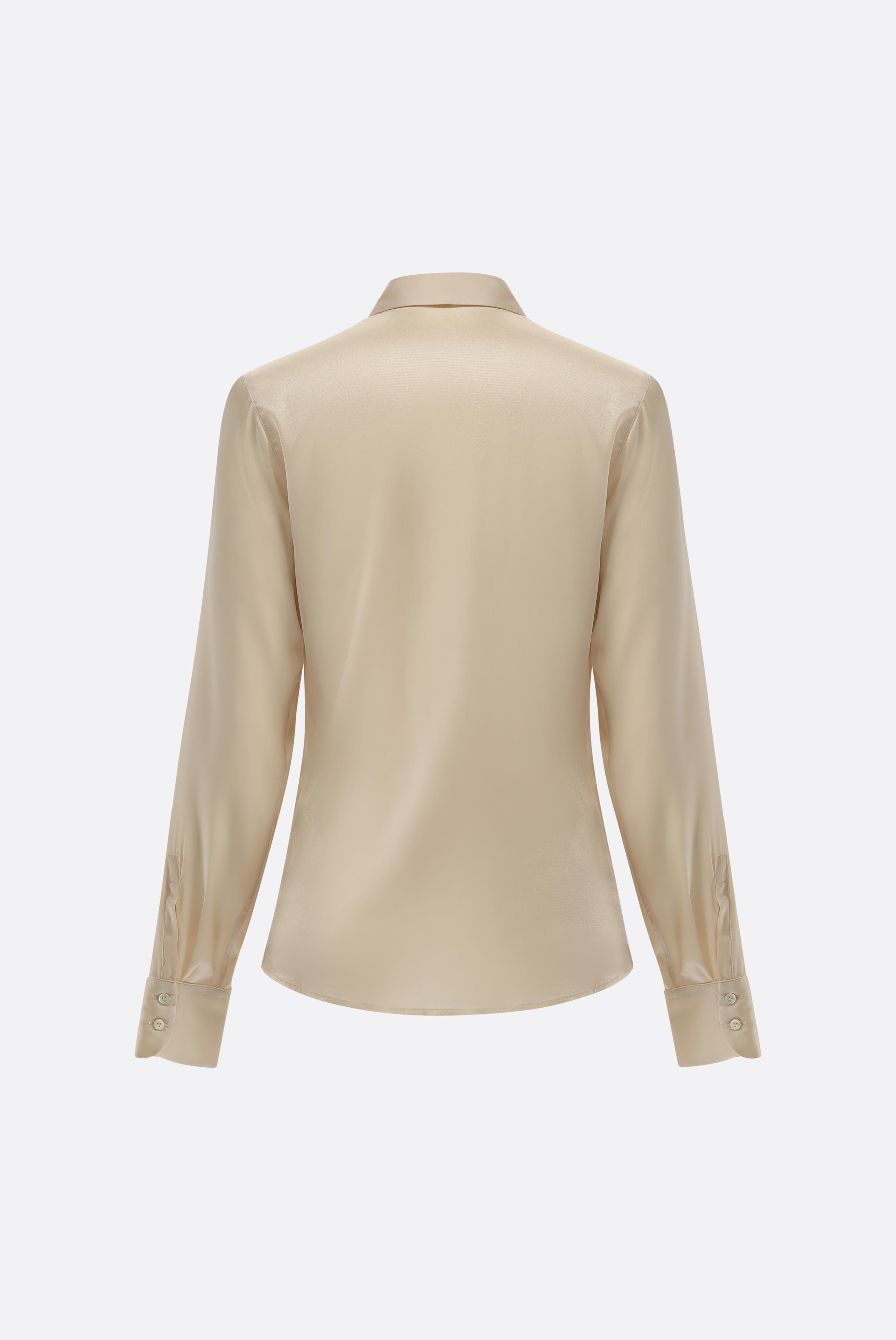 Unsere taillierte Bluse aus Stretch-Seidentwill kombiniert luxuriösen Komfort mit zeitloser Eleganz. Diese Bluse, die aus Seide und Elasthan besteht, bietet eine dezent glänzende Oberfläche und eine perfekte Passform. Der klassische Hemdblusenkragen und die Perlmuttknöpfe verleihen der Bluse einen Hauch von Raffinesse. Mit einer Rückenlänge von 66 cm ist sie ideal für sowohl geschäftliche als auch legere Anlässe.