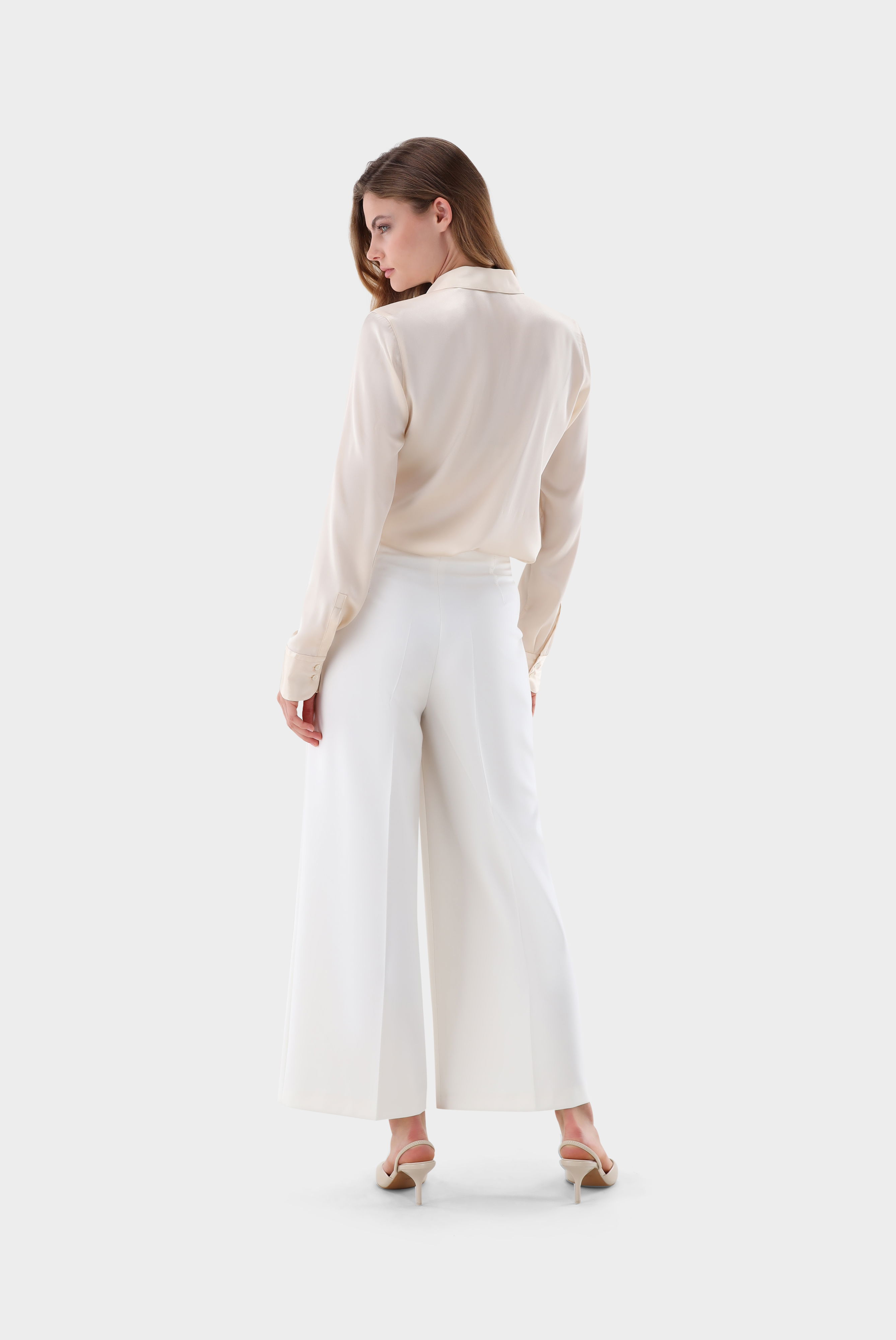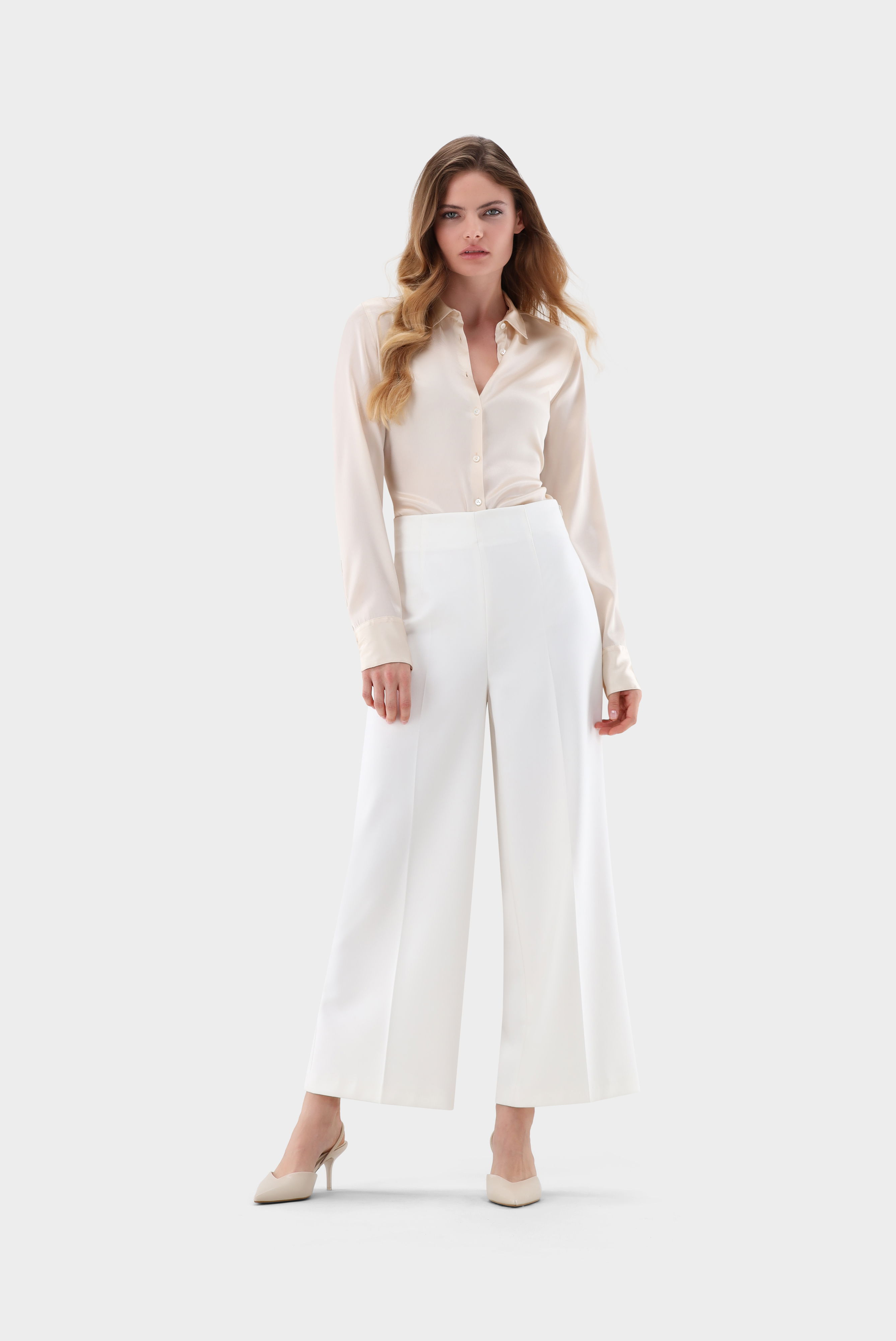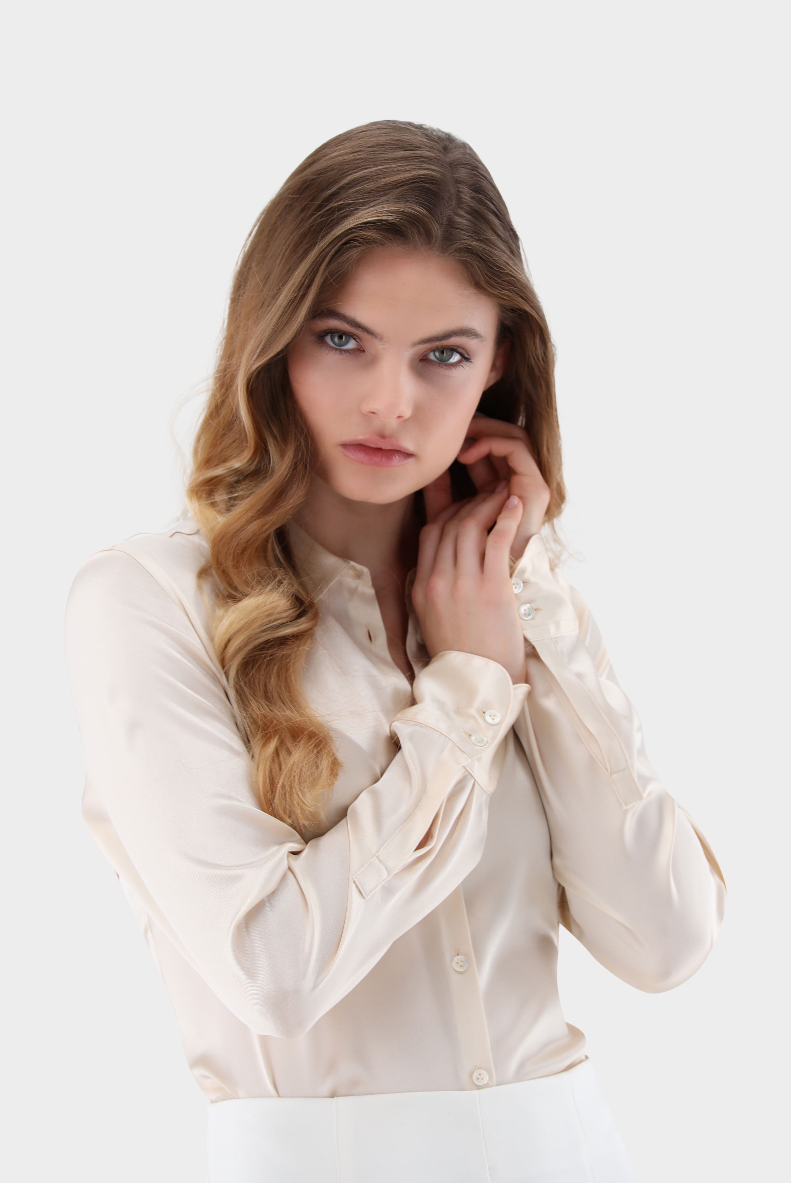 Unsere taillierte Bluse aus Stretch-Seidentwill kombiniert luxuriösen Komfort mit zeitloser Eleganz. Diese Bluse, die aus Seide und Elasthan besteht, bietet eine dezent glänzende Oberfläche und eine perfekte Passform. Der klassische Hemdblusenkragen und die Perlmuttknöpfe verleihen der Bluse einen Hauch von Raffinesse. Mit einer Rückenlänge von 66 cm ist sie ideal für sowohl geschäftliche als auch legere Anlässe.