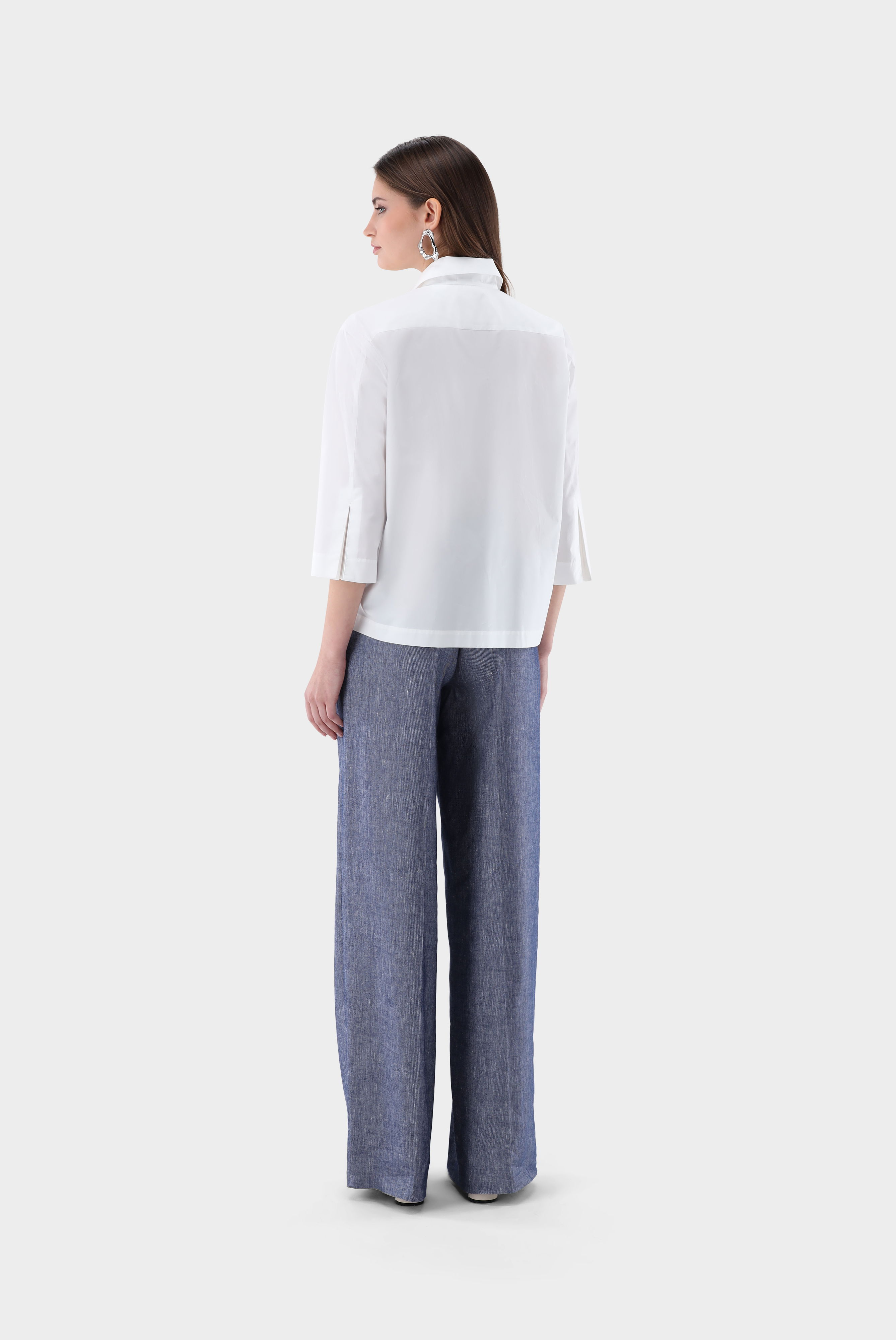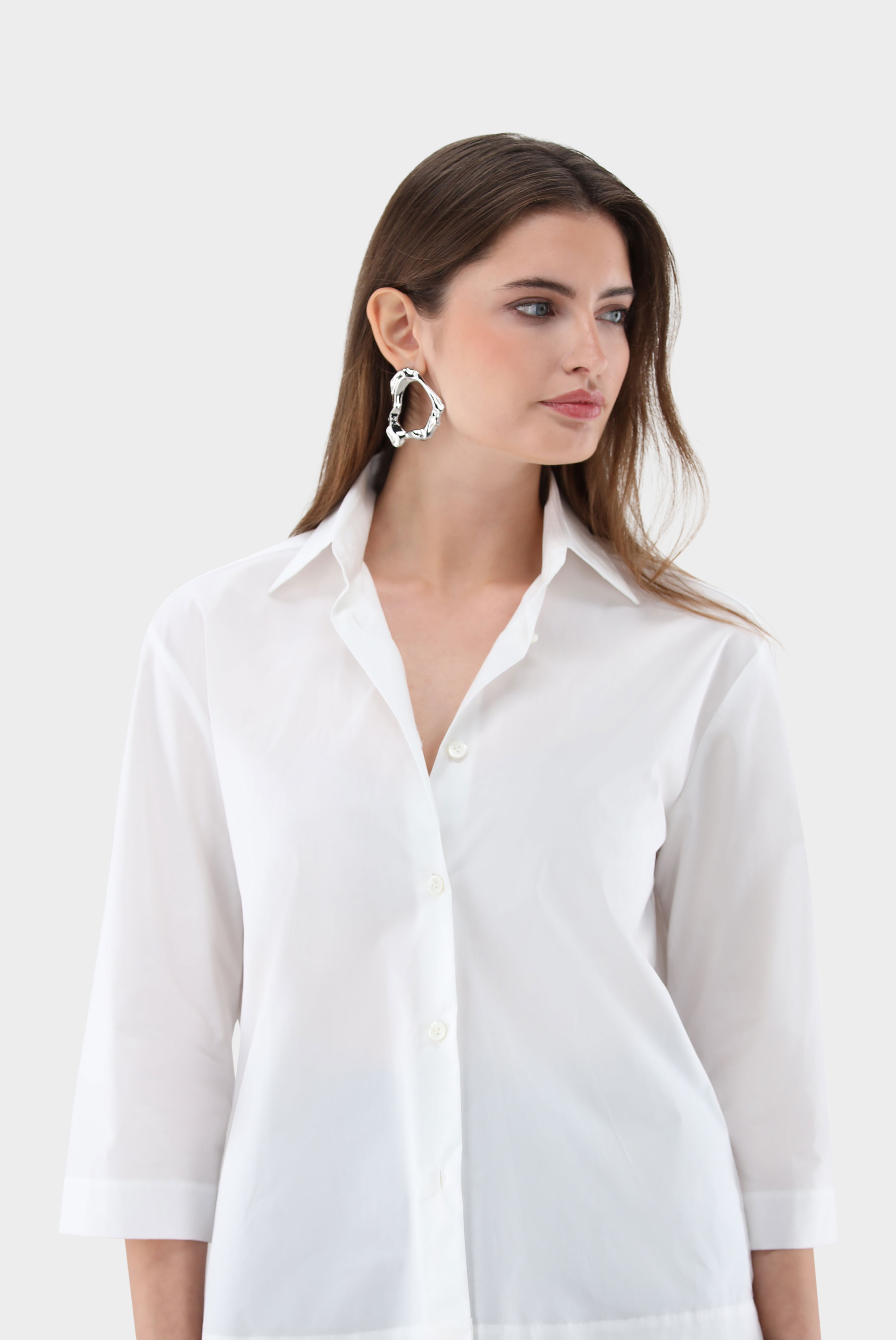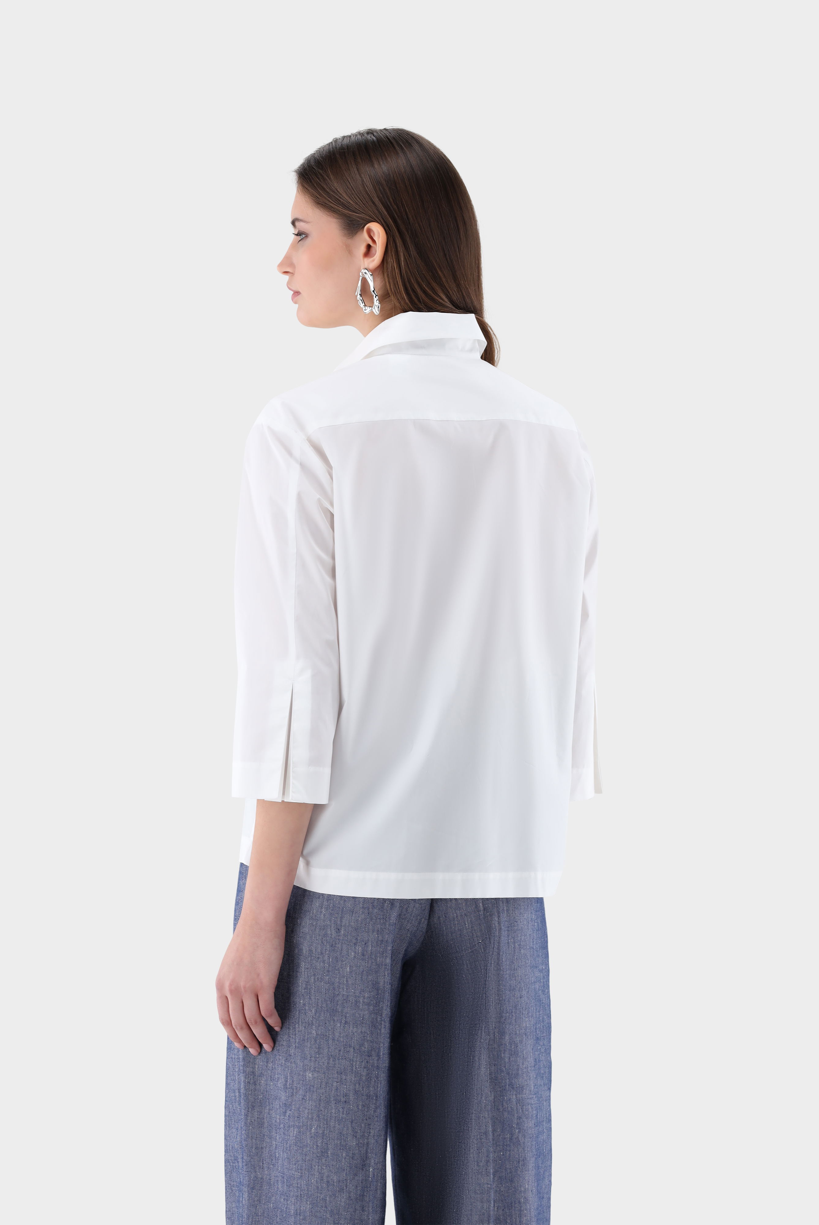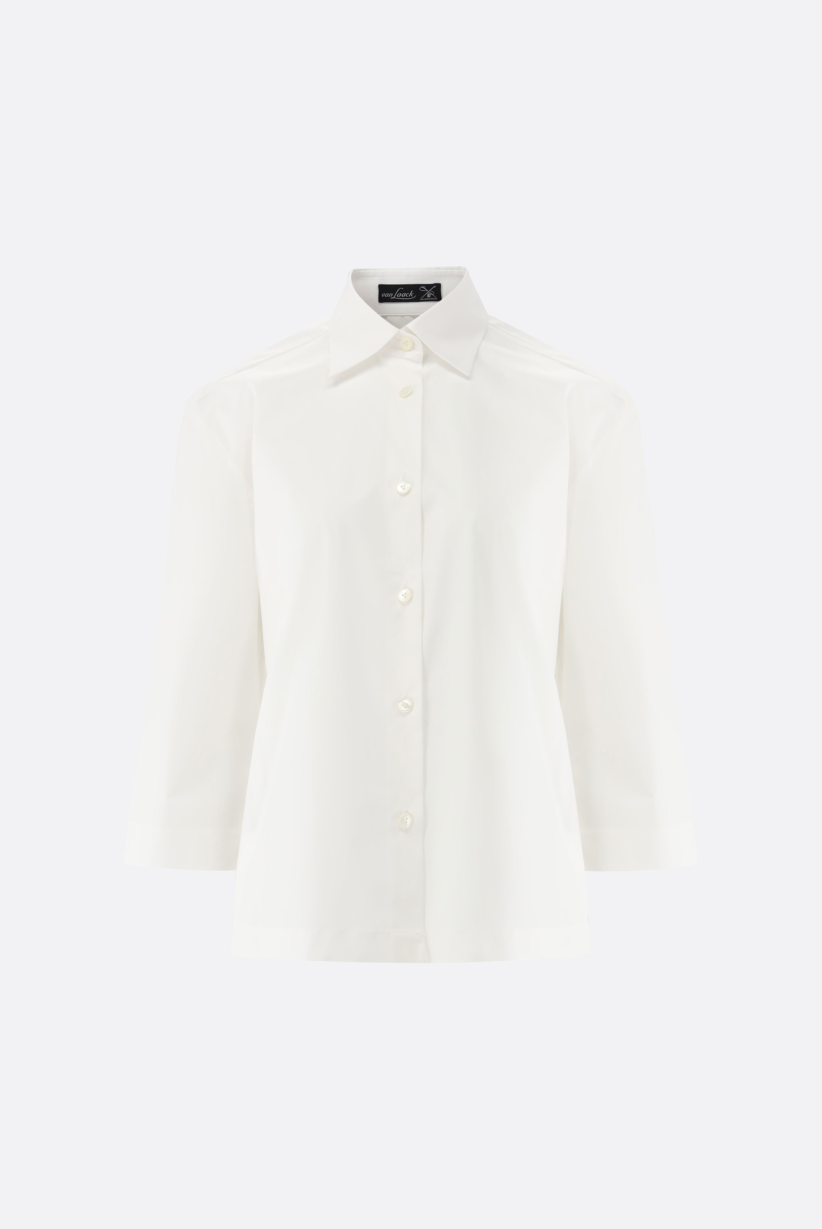 Diese kastenförmige Hemdbluse überzeugt durch eine moderne Silhouette und hochwertige Verarbeitung. Die 7/8-Ärmel mit eleganter Godetfalte verleihen dem Design eine besondere Leichtigkeit und Bewegungsfreiheit. Gefertigt aus feiner Baumwollpopeline bietet die Bluse ein angenehmes Tragegefühl und eine glatte Optik. Edle Perlmuttknöpfe runden das Gesamtbild stilvoll ab und unterstreichen den hochwertigen Charakter des Modells.