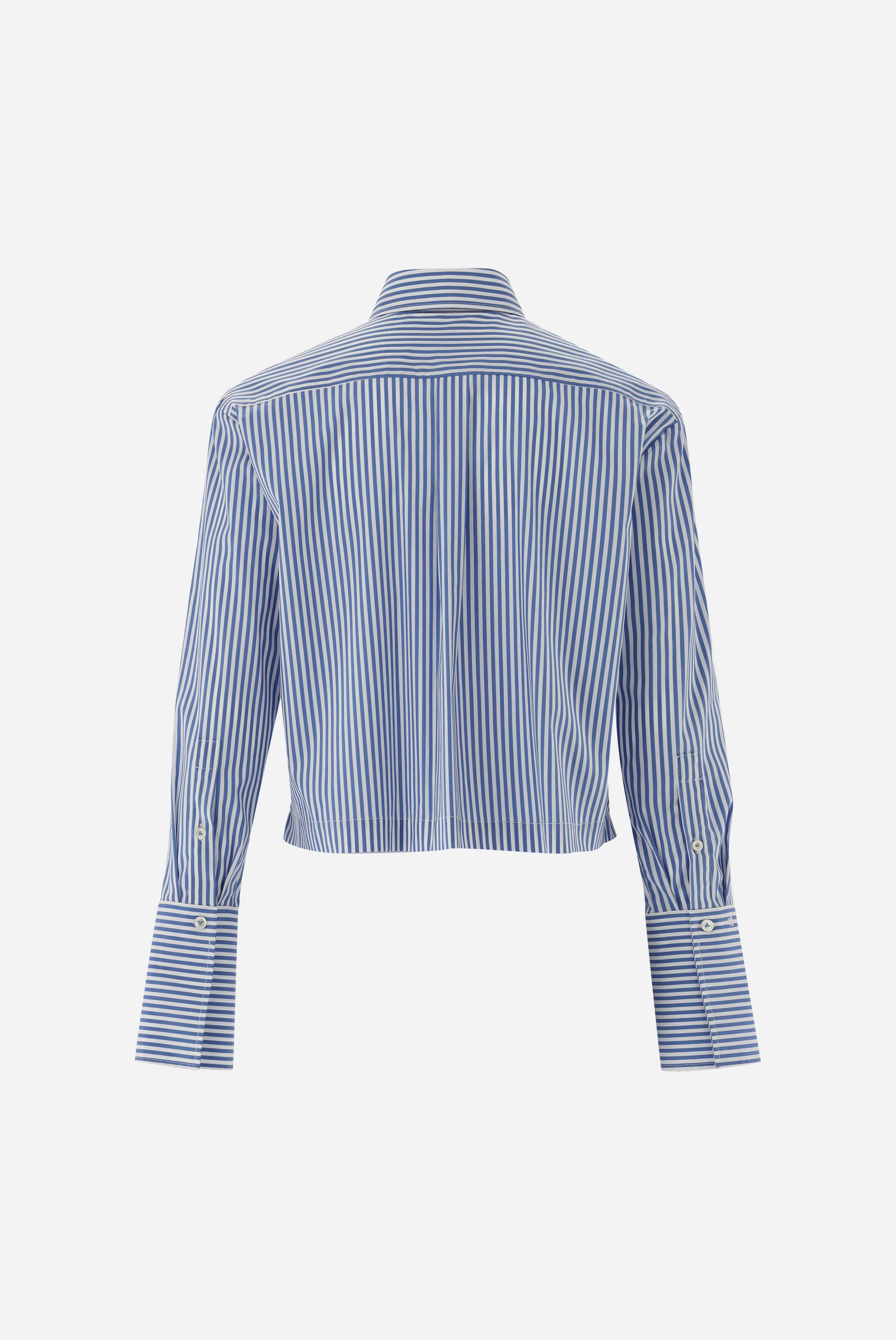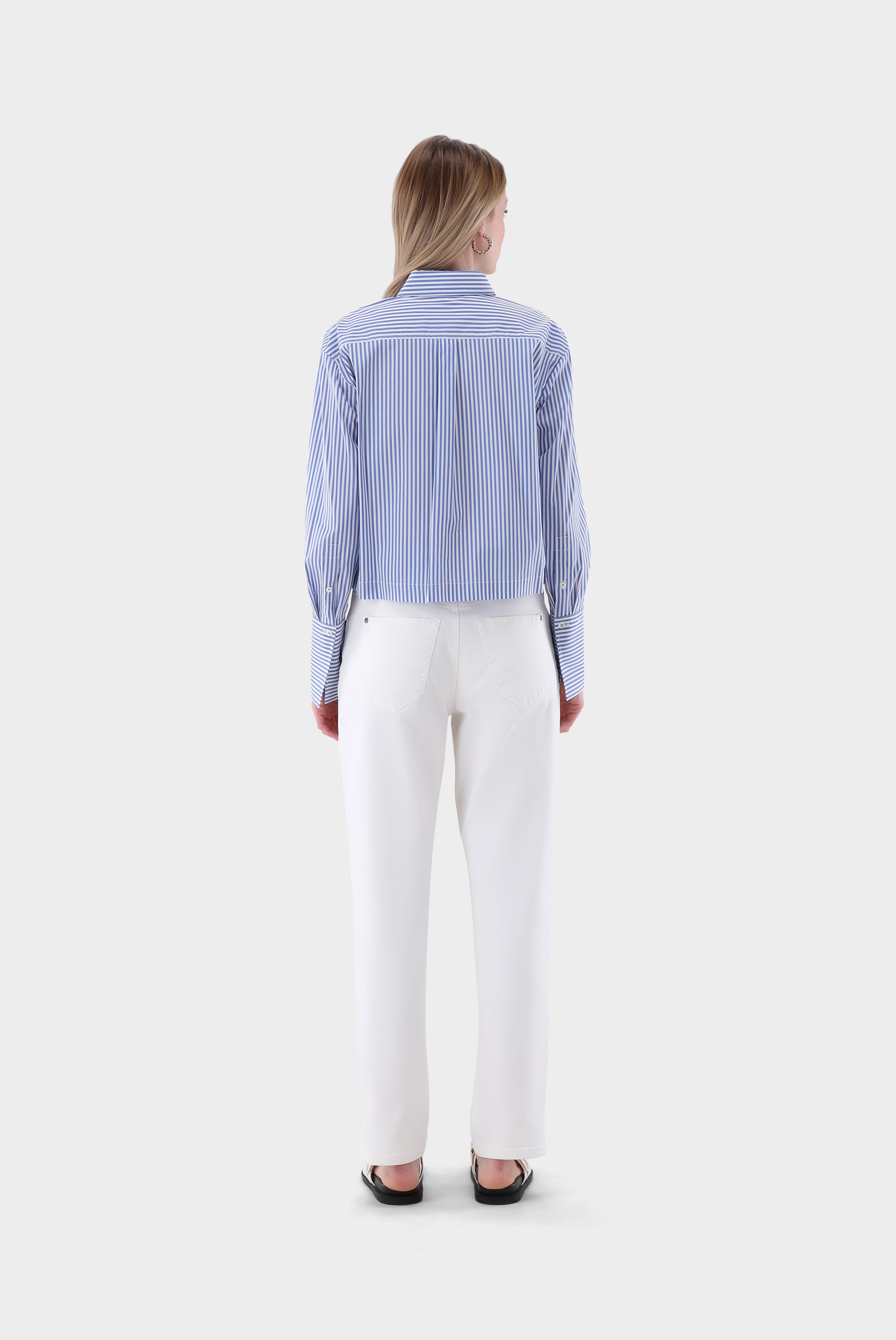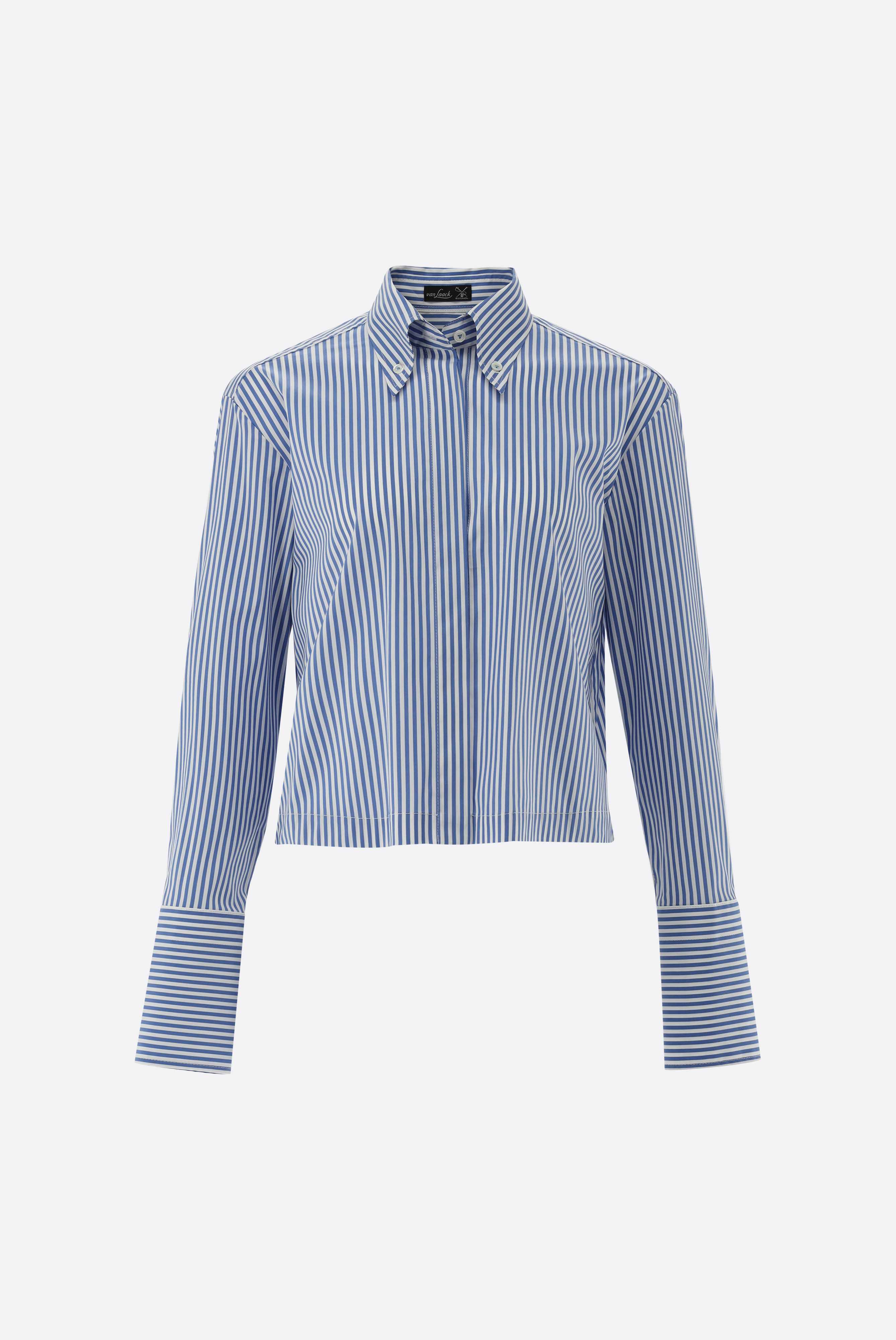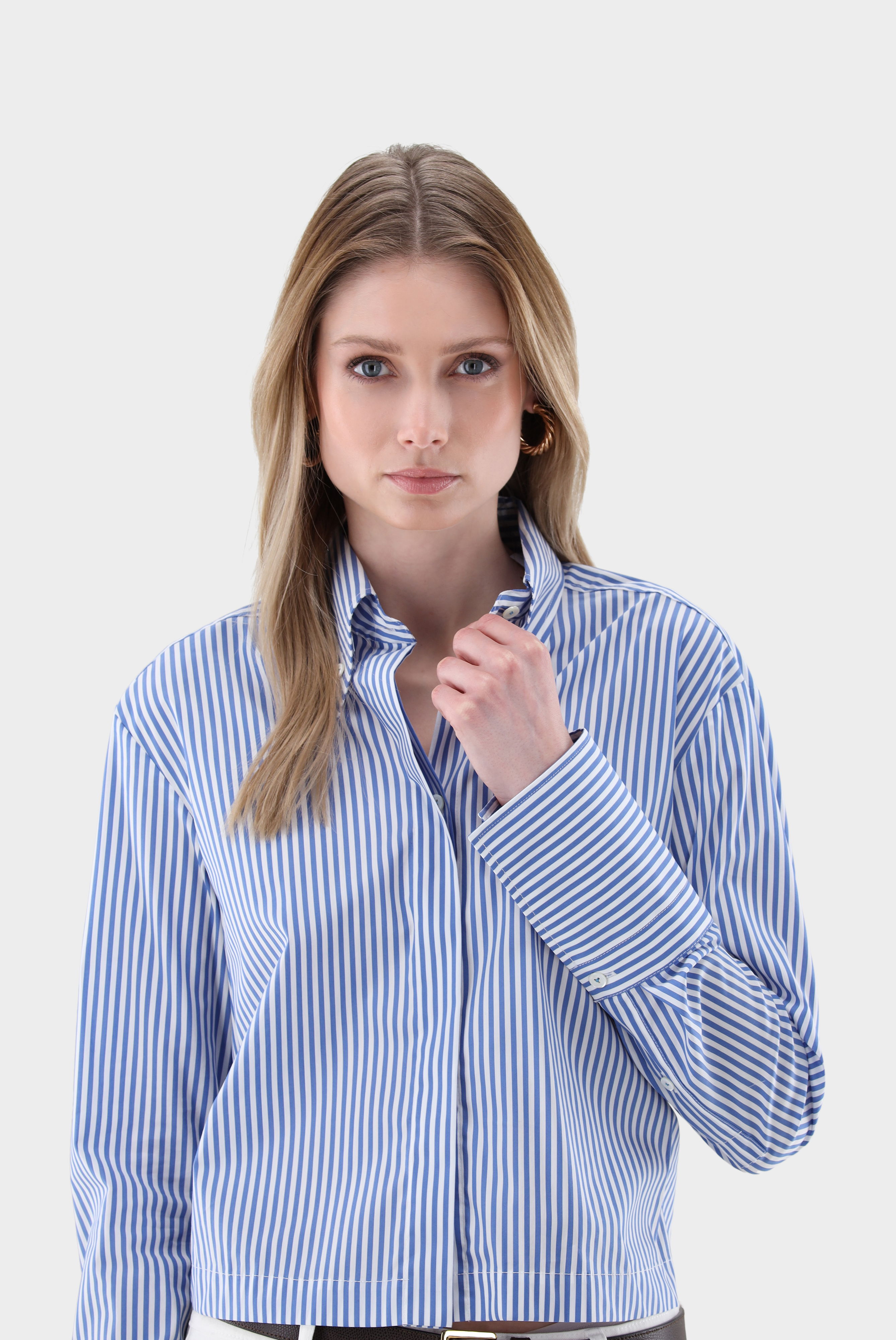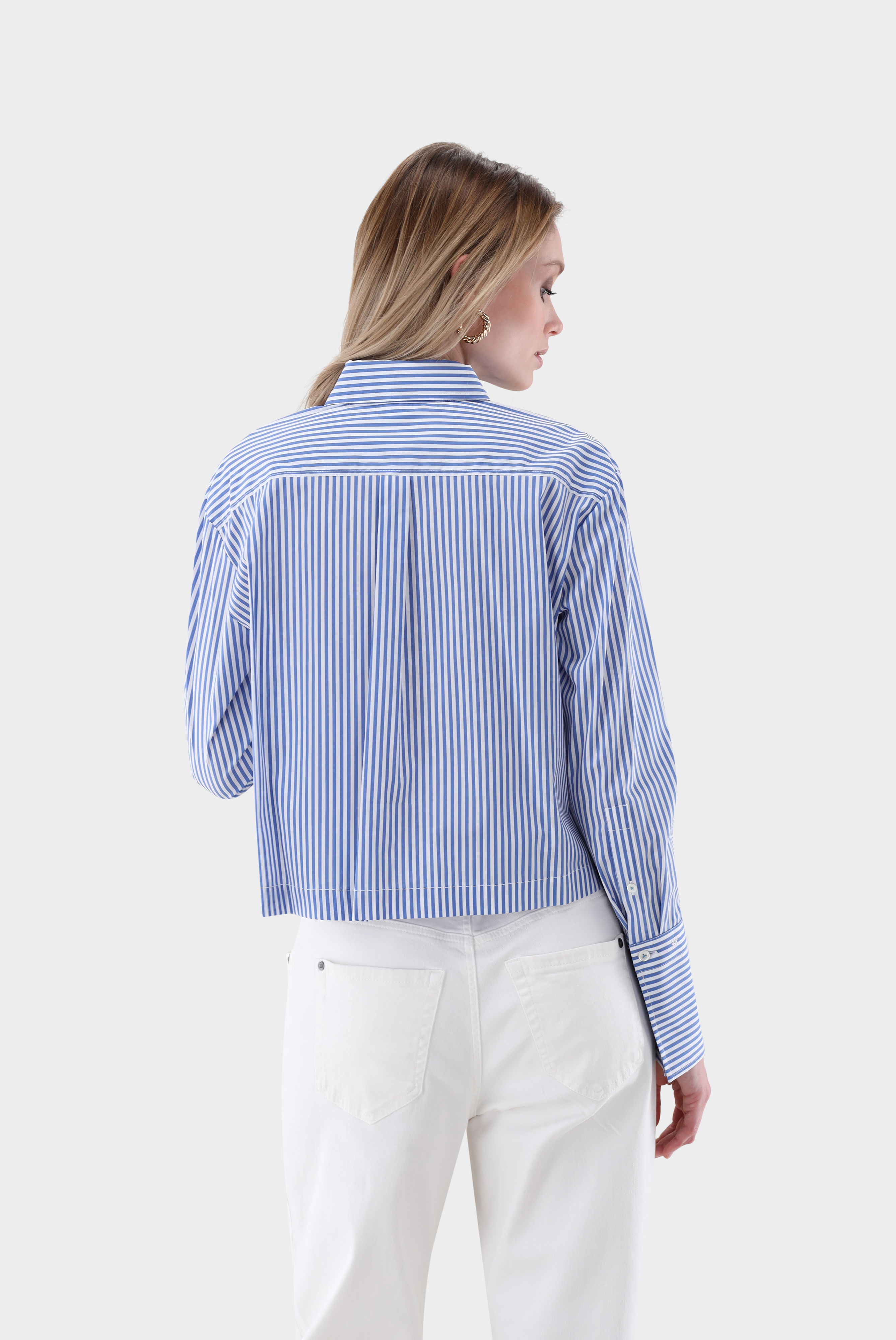 Die locker geschnittene, kurze Hemdbluse vereint Komfort und Stil. Die Streifen sorgen für einen angezogenen Look und die Crop-Form sorgt für Modernität. Perfekt für High-Waist-Hosen und vielseitig für Casual- und Business-Looks. Eine Rückenpasse mit Kellerfalte akzentuiert den Rücken. Elegante Perlmuttknöpfe runden das Design ab.