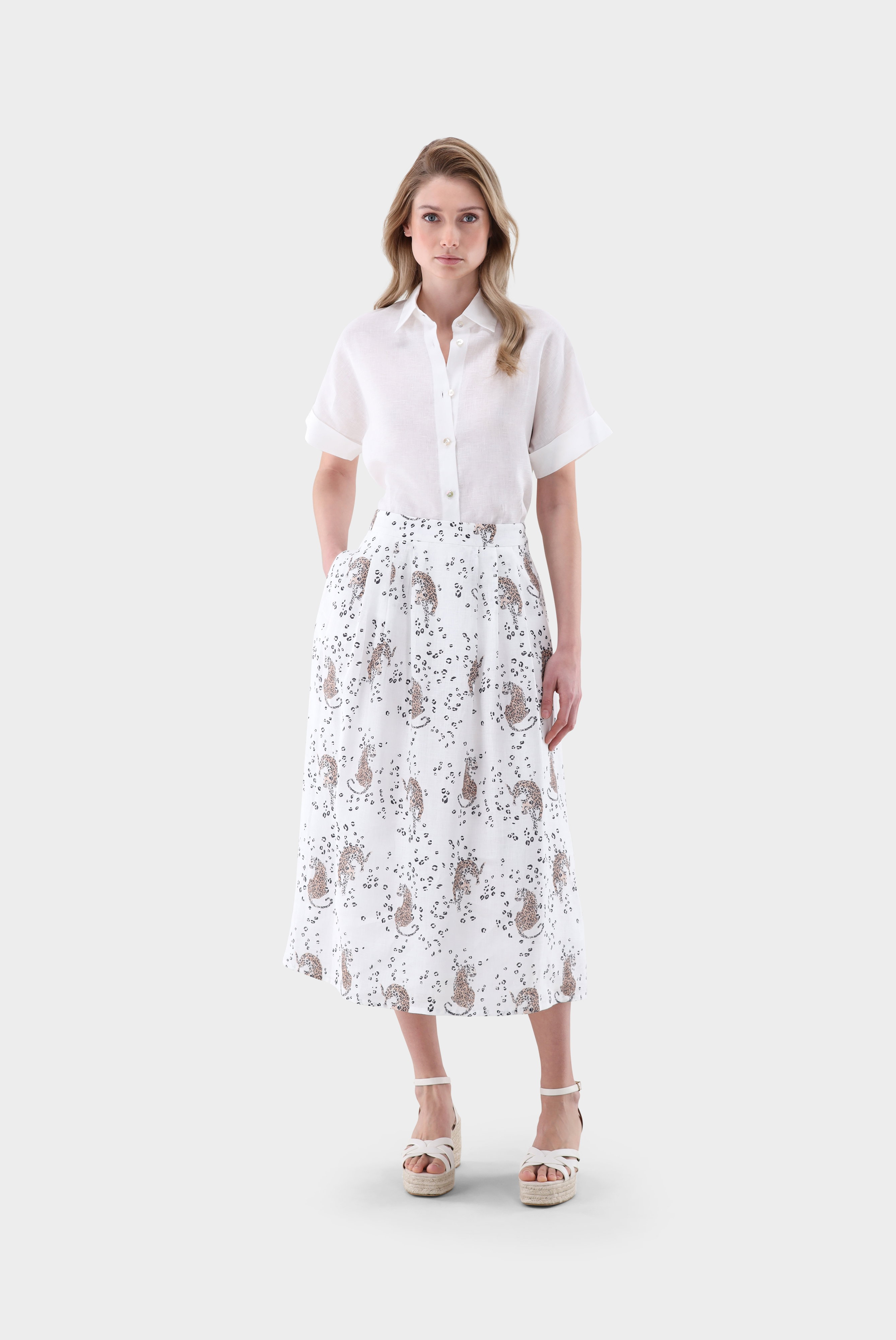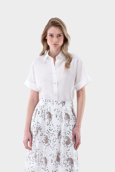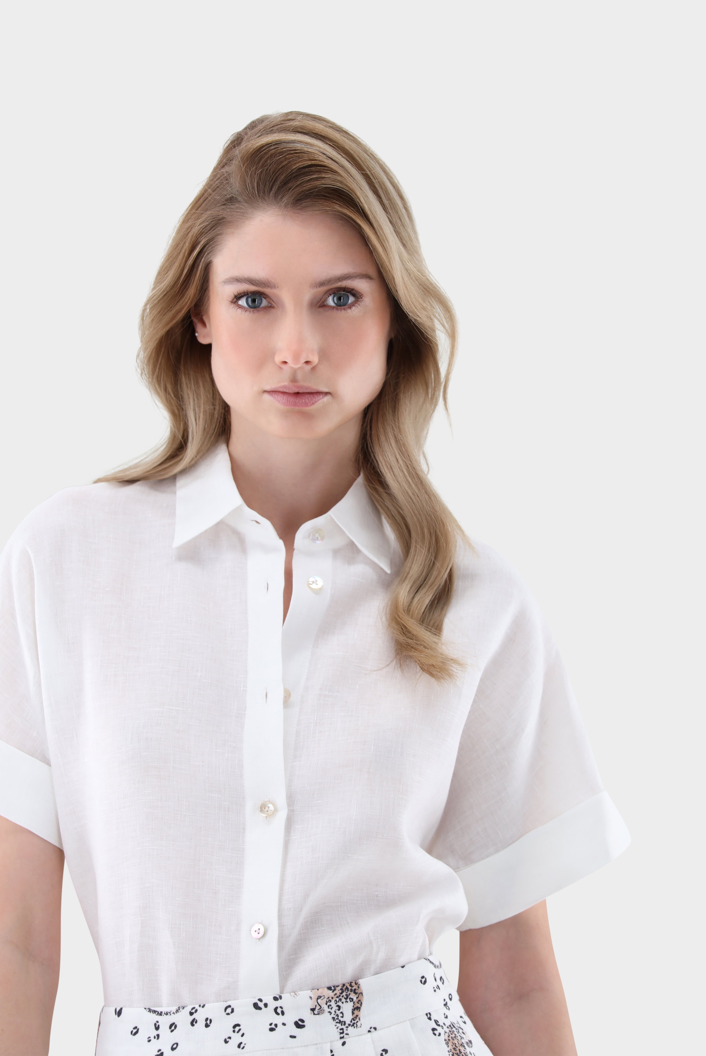 Diese locker geschnittene Hemdbluse besticht durch eine entspannte Silhouette und sommerliches Design. Die angeschnittenen kurzen Ärmel mit Umschlag sorgen für einen legeren Look. Gefertigt aus weichen Leinen bietet die Bluse angenehmen Tragekomfort, Leichtigkeit und fließenden Fall. Ein vielseitiges Kleidungsstück für warme Tage, das sich ideal für Casual- und Urlaubslooks oder legere Freizeit-Outfits kombinieren lässt.