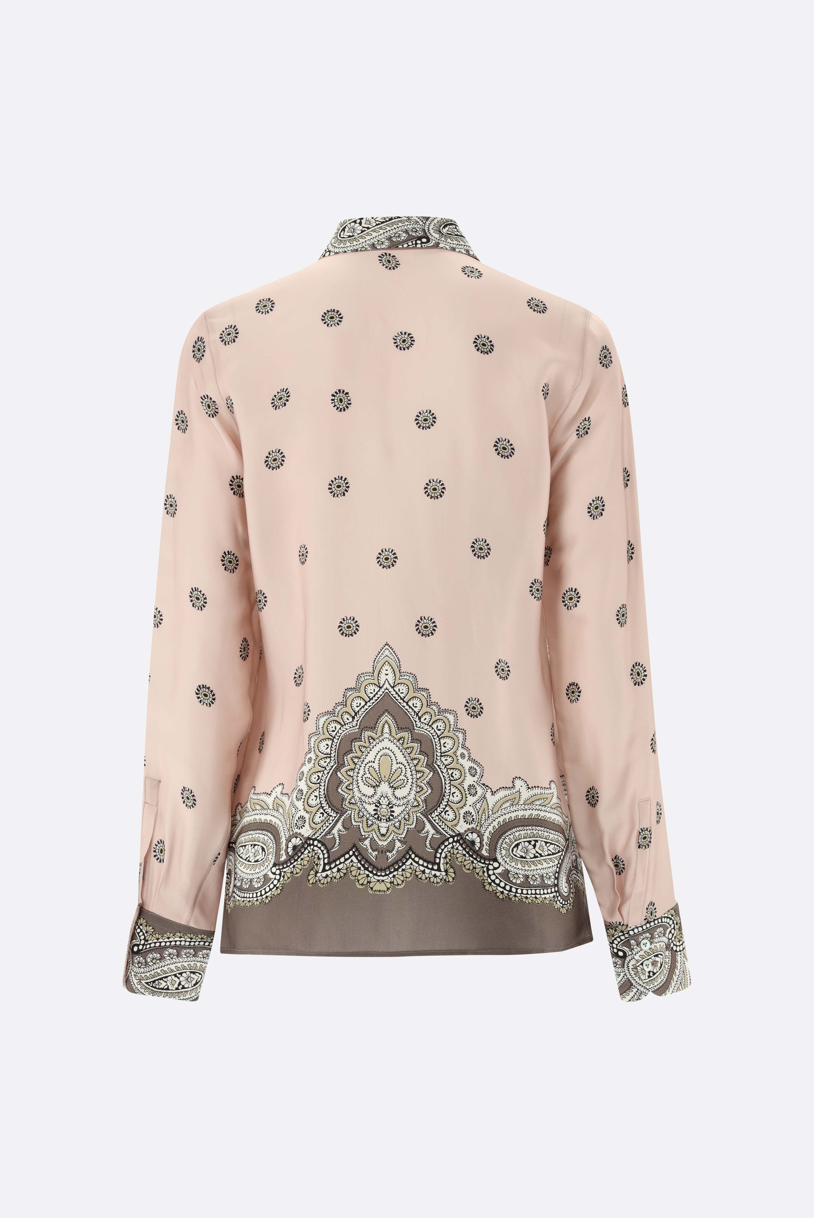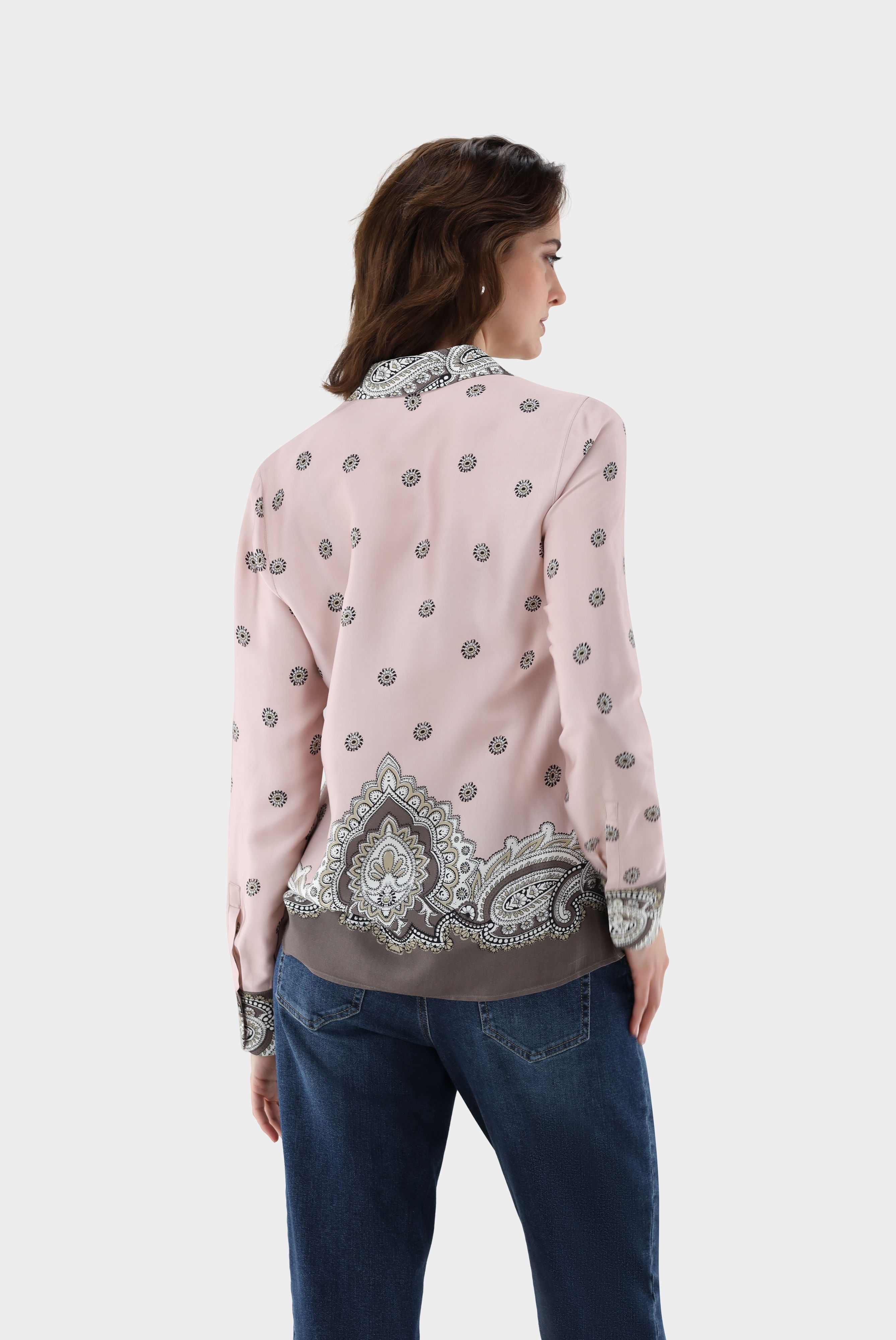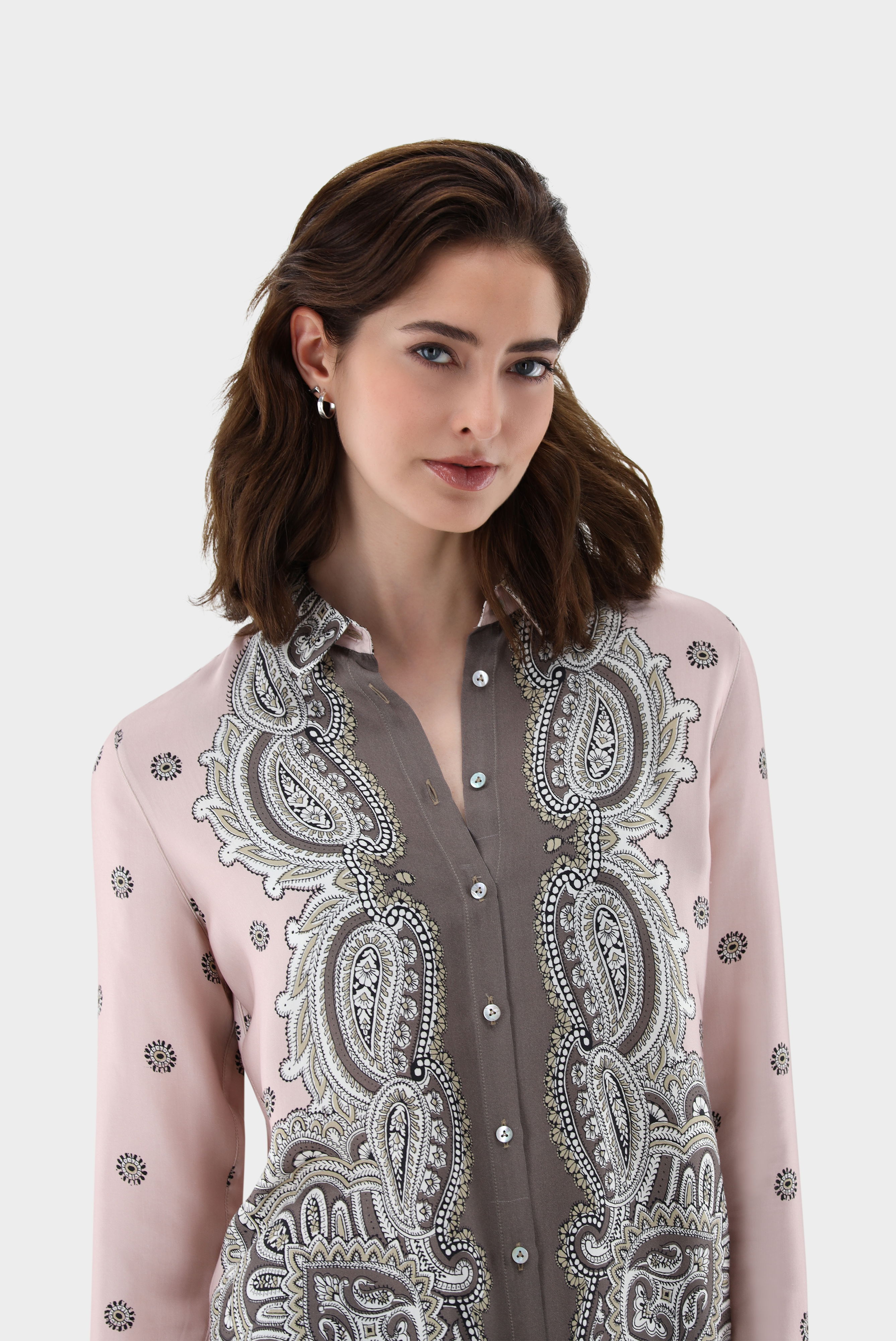 Locker geschnittene Hemdbluse mit langen Ärmeln und Seitenschlitzen. Hergestellt aus Viskose in Twill-Satin-Optik mit einem besonderen Druck, der bewusst auf jedem Schnittteil platziert wurde. Die Bluse ist vielseitig einsetzbar und kann je nach Anlass casual, business oder festlich kombiniert werden.